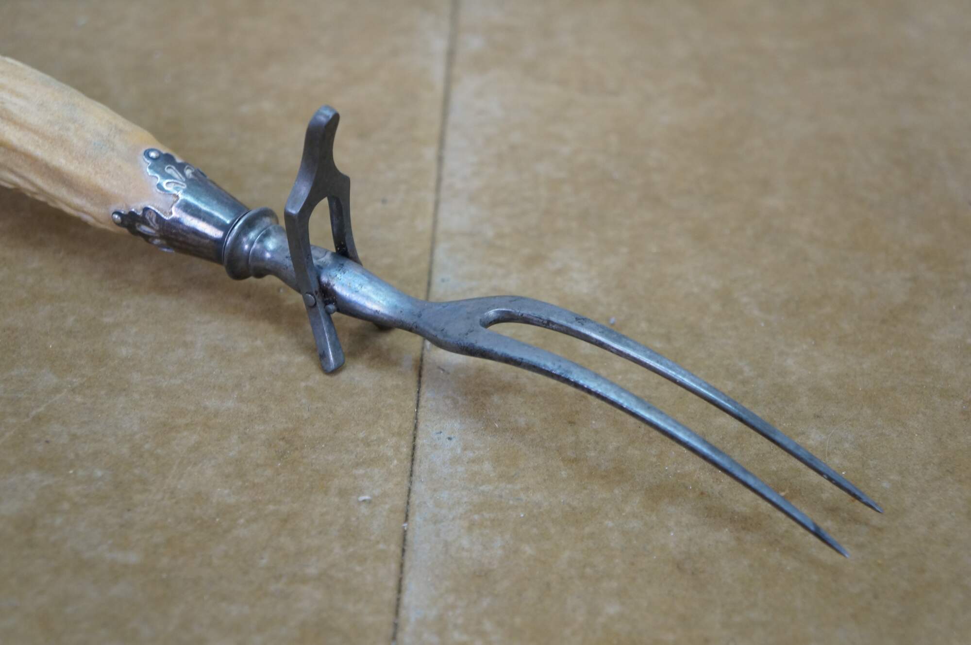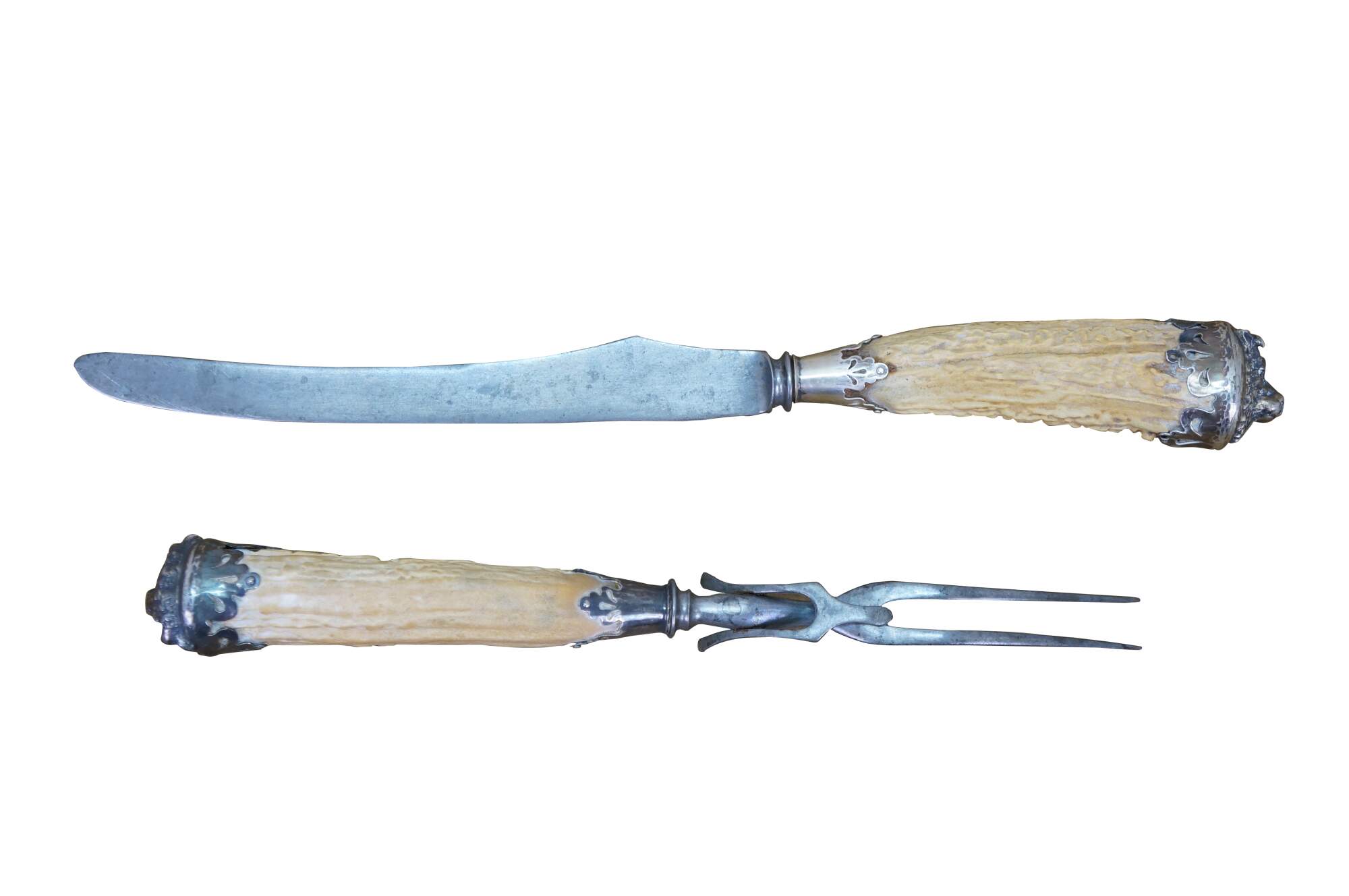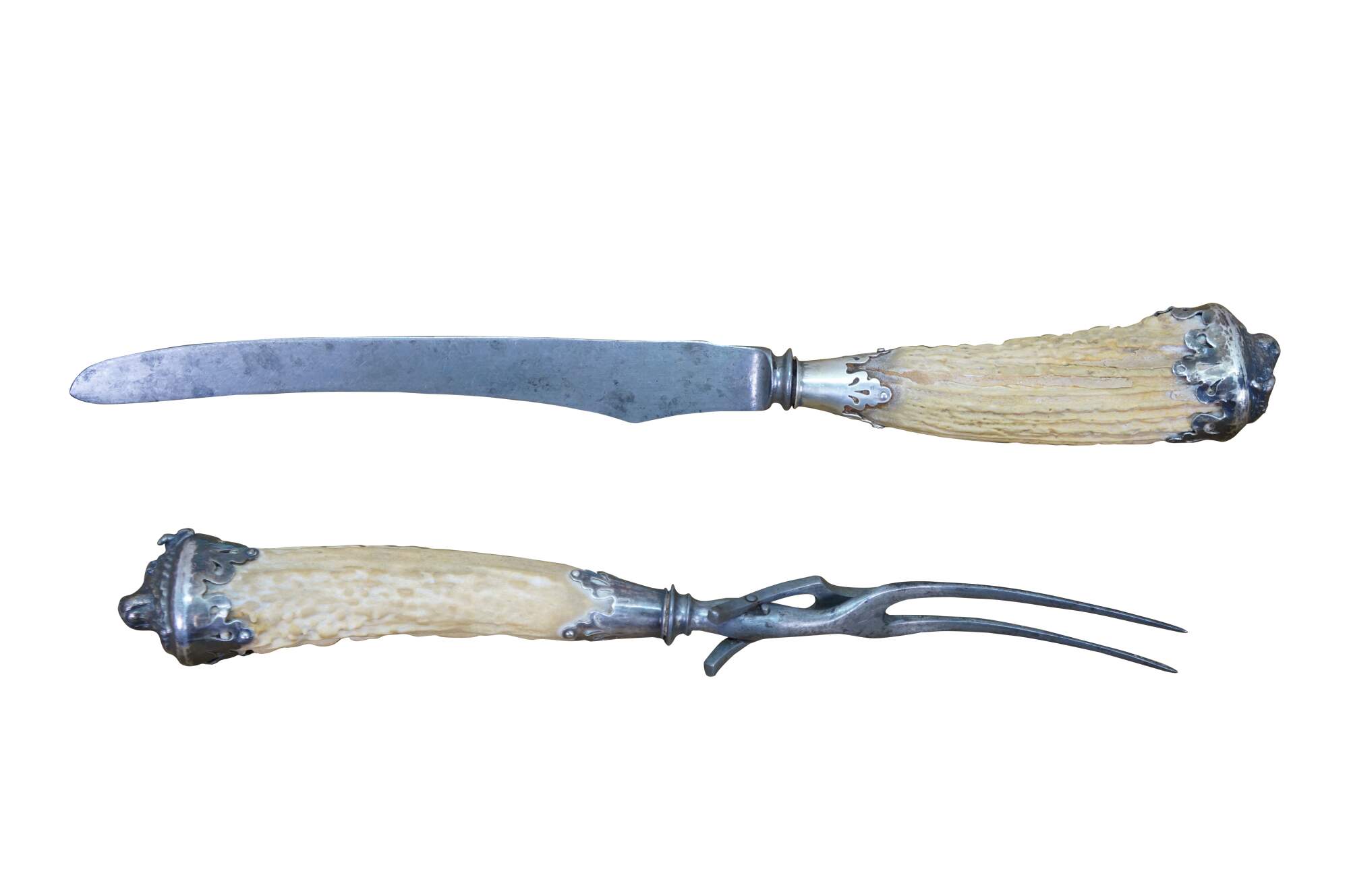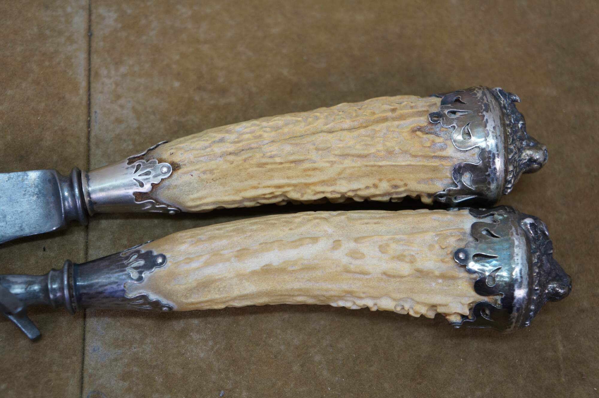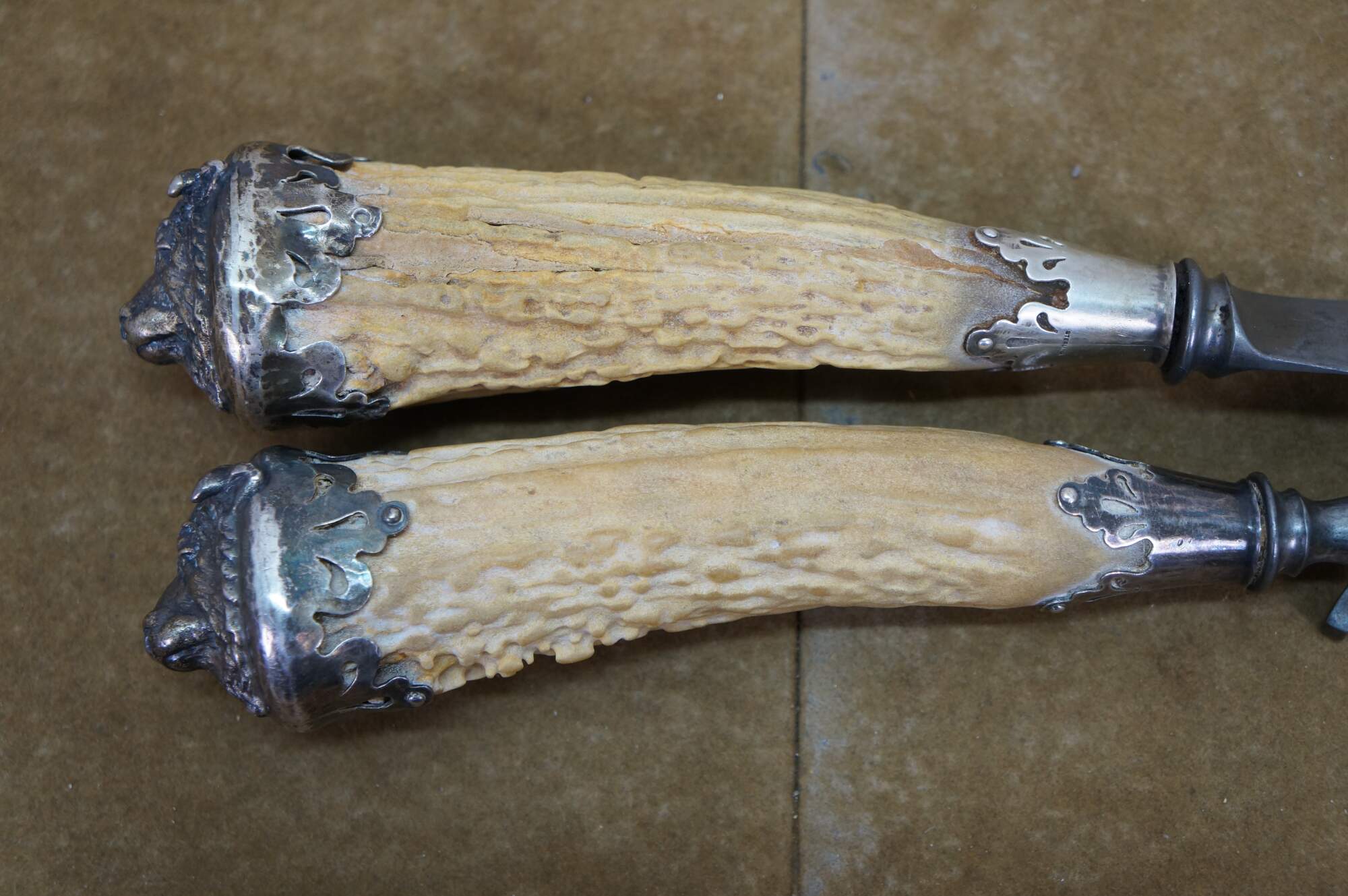 Antique German / Bavarian fork and knife carving set with antler / stag horn handles accompanied by sterling silver collars and bull / steer / bison head pommel caps.� The cutlery pieces feature forged steel blades and tines commonly used for serving and carving large roasts, turkeys, or hams.