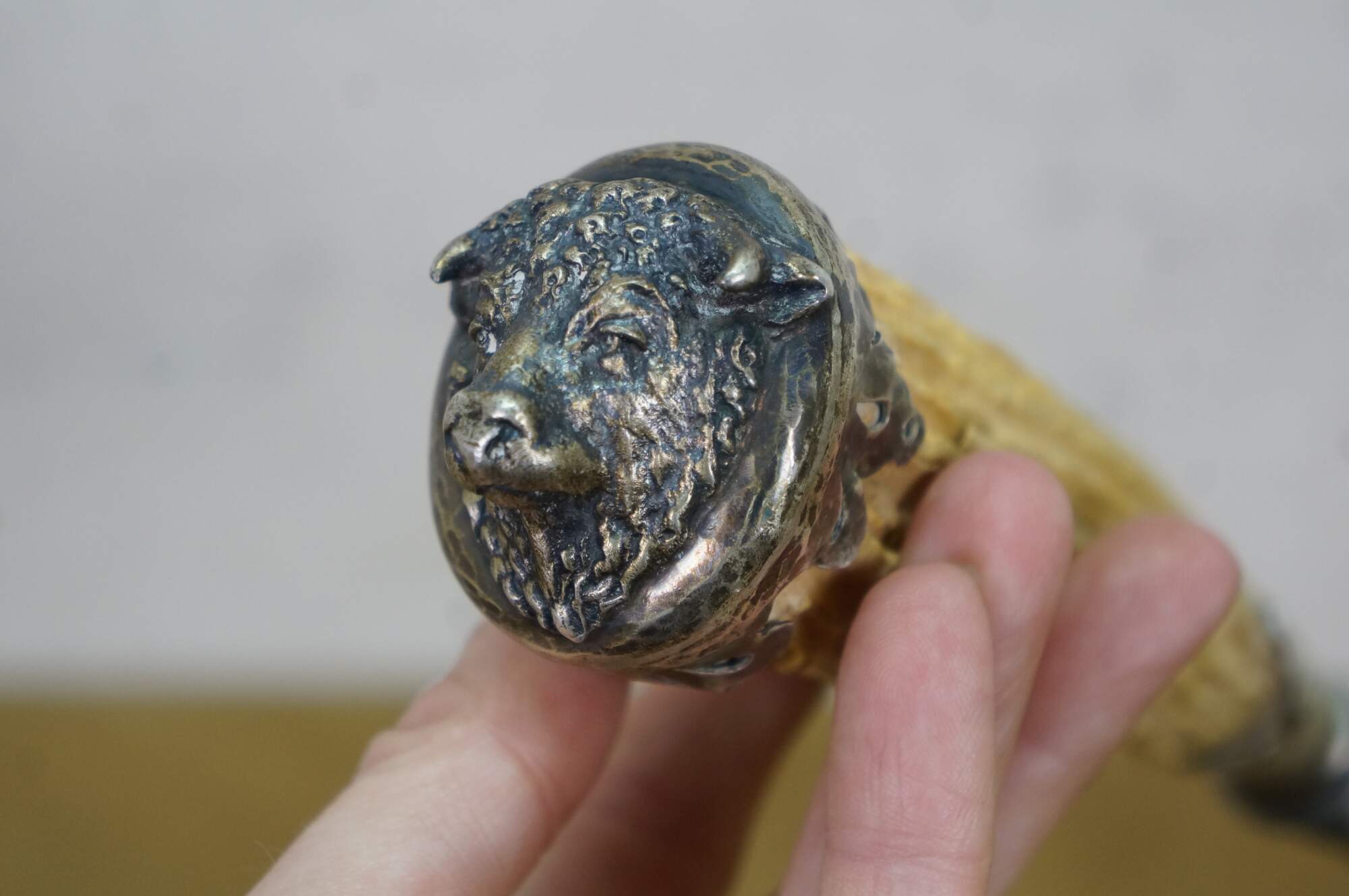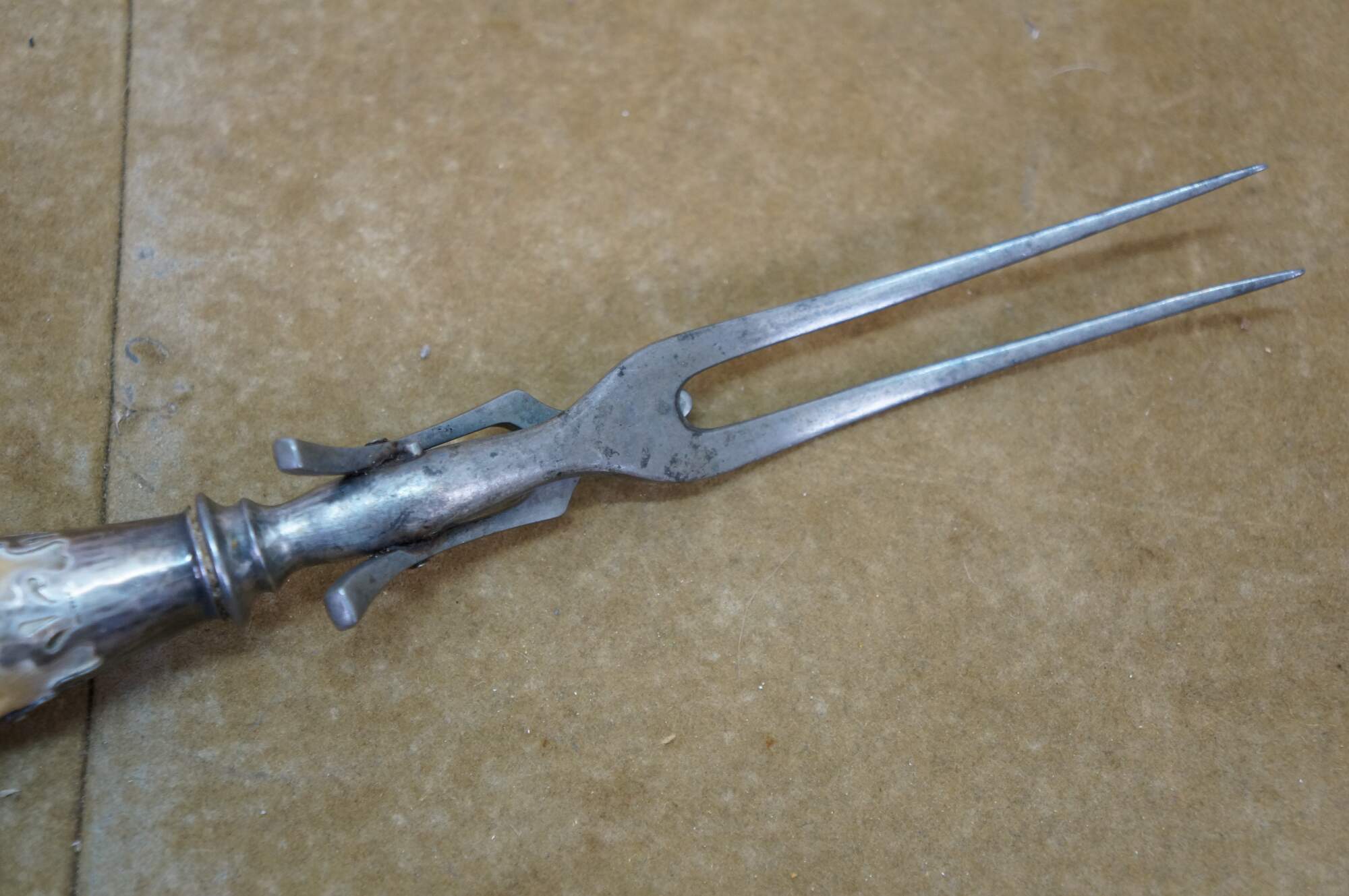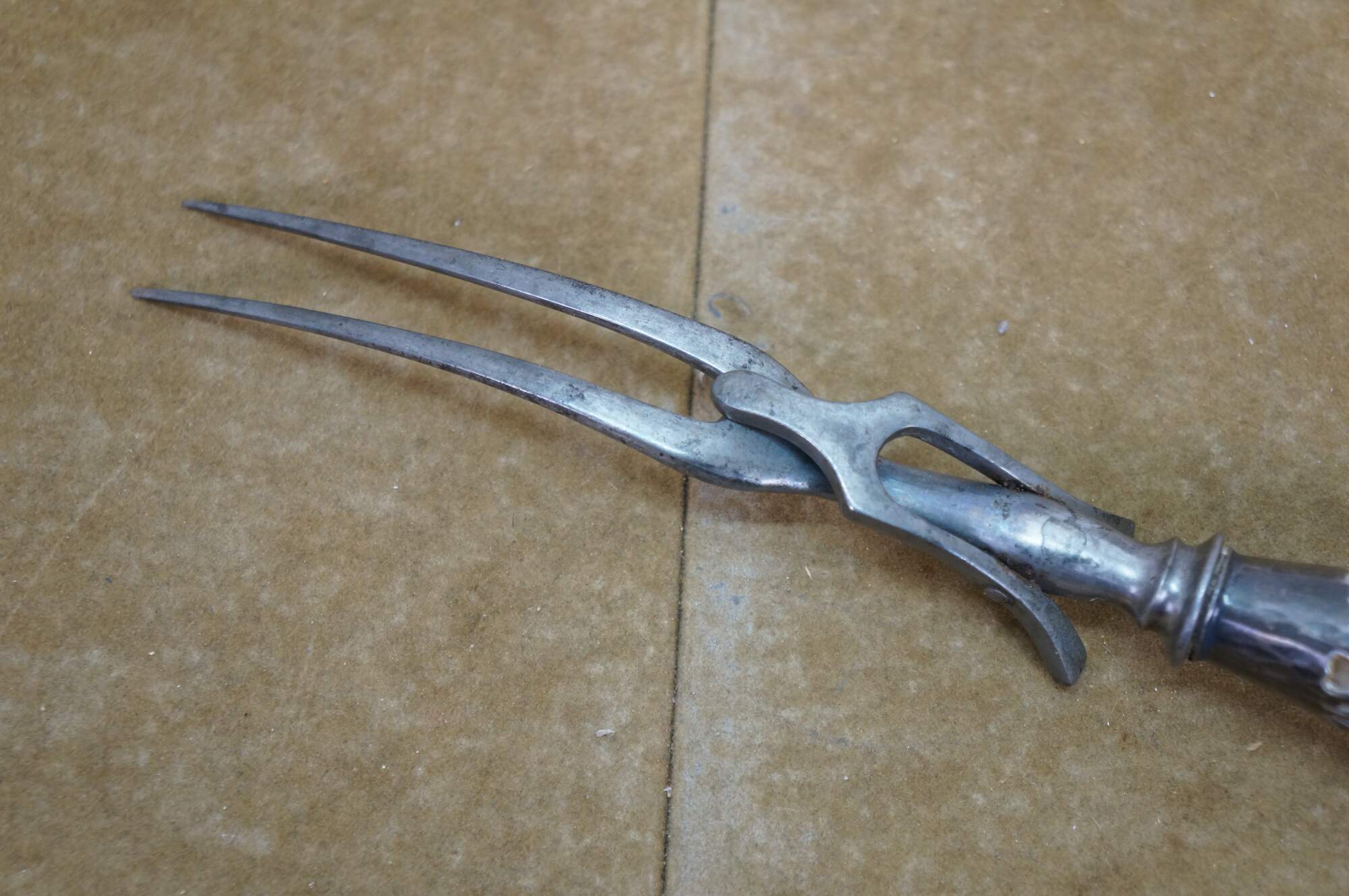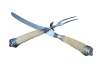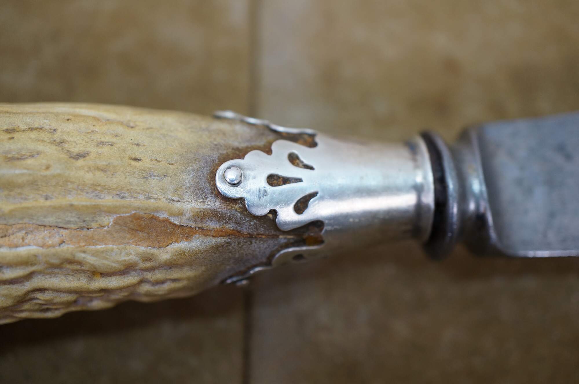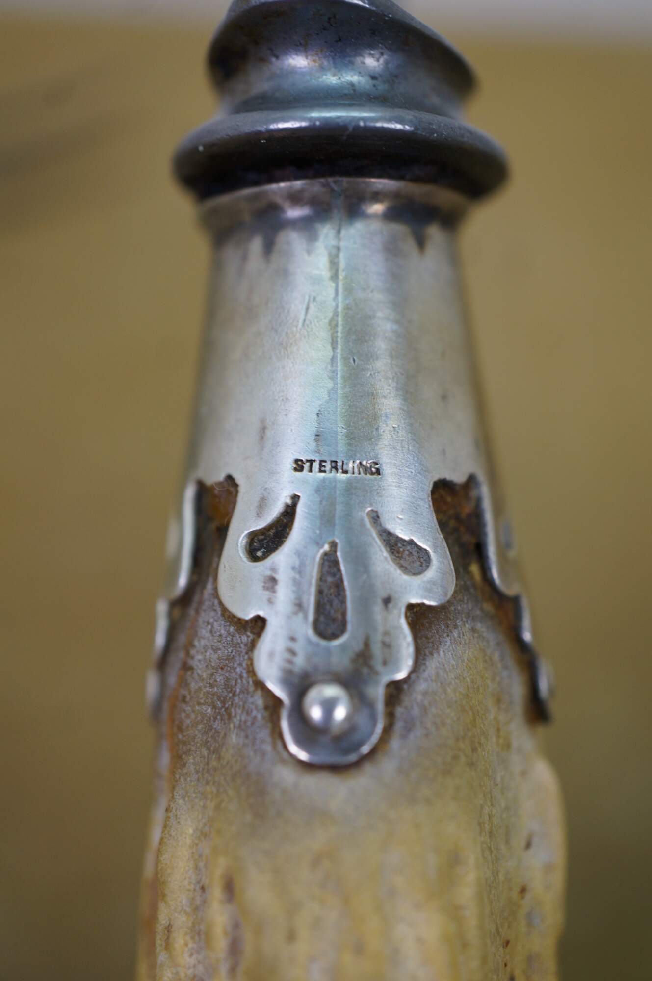 Antique German / Bavarian fork and knife carving set with antler / stag horn handles accompanied by sterling silver collars and bull / steer / bison head pommel caps.� The cutlery pieces feature forged steel blades and tines commonly used for serving and carving large roasts, turkeys, or hams.