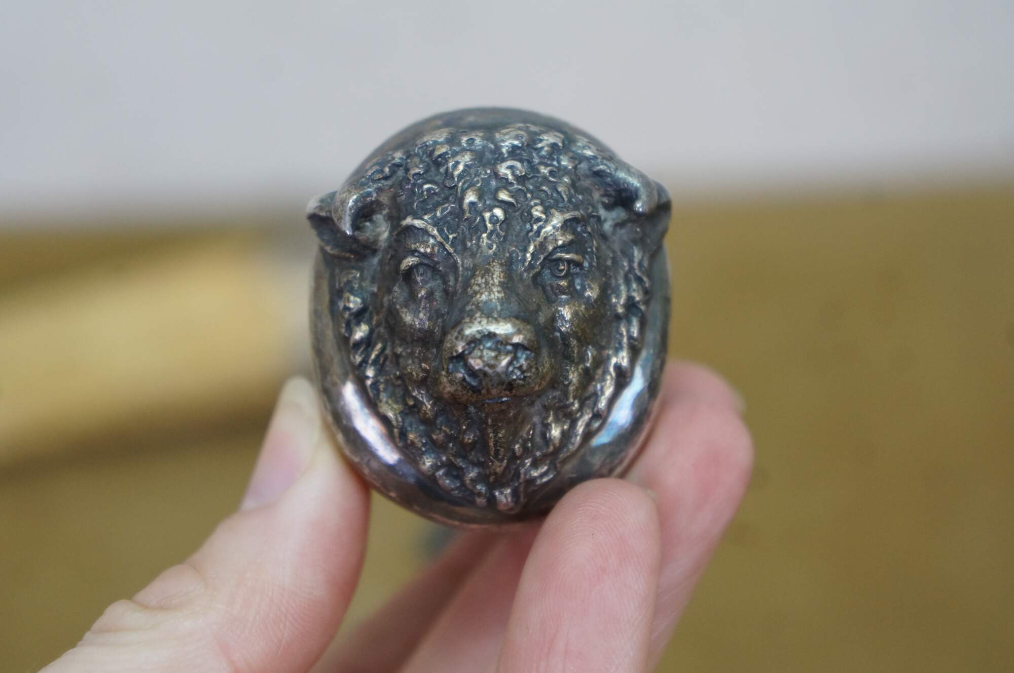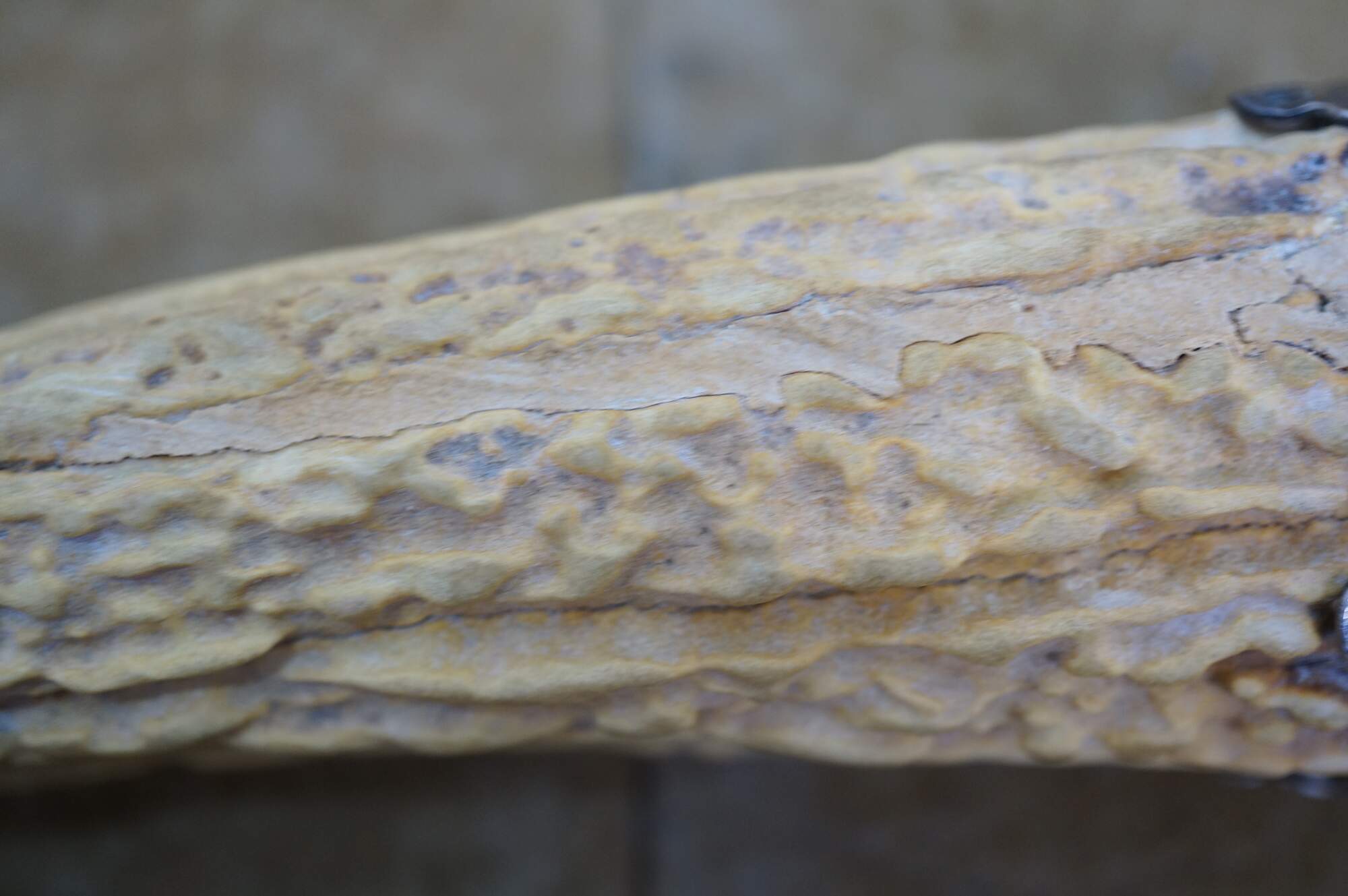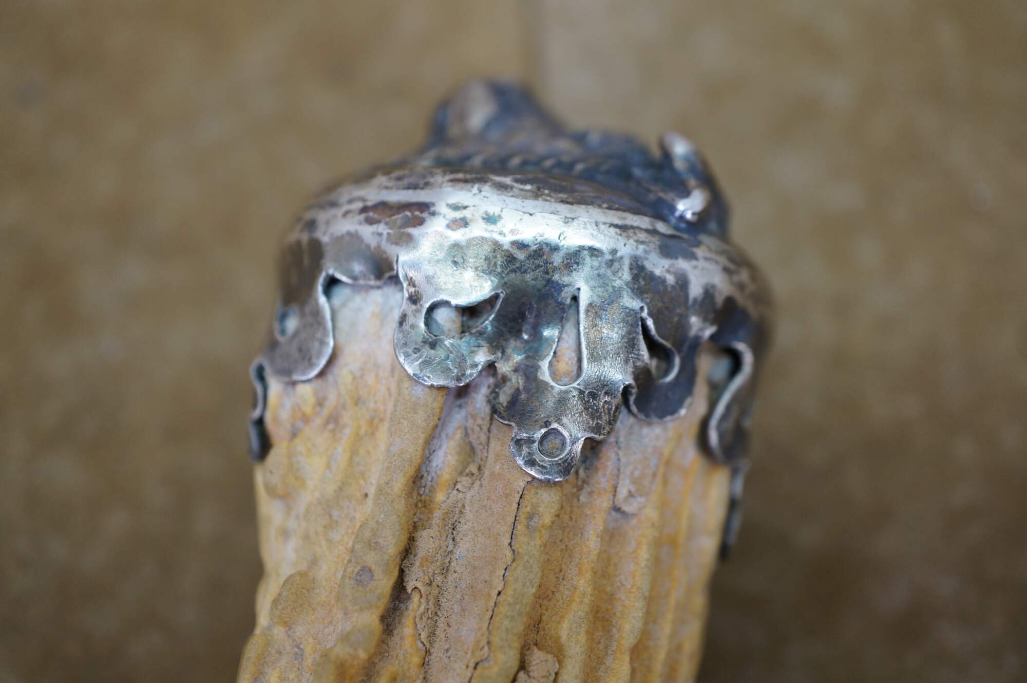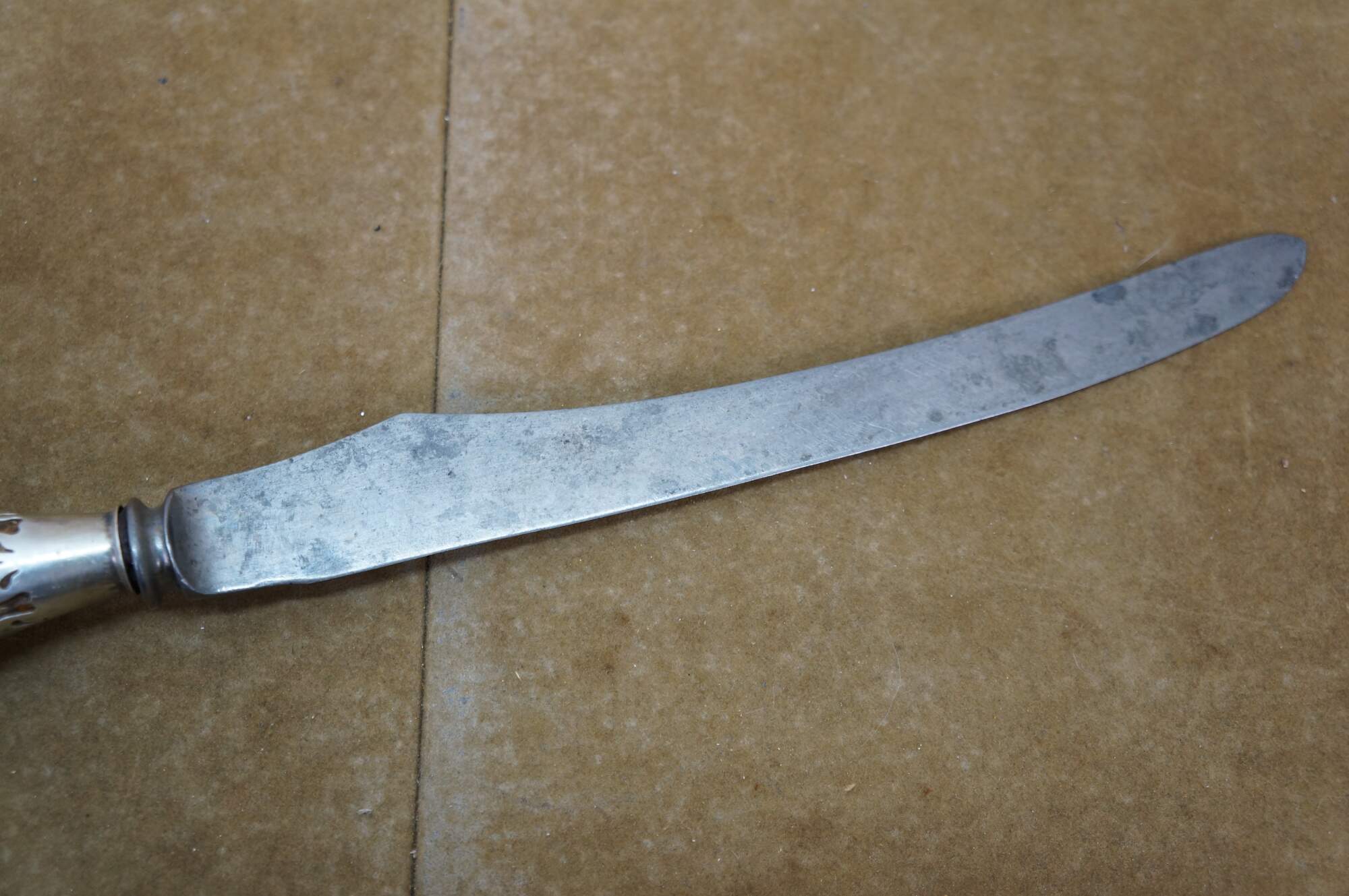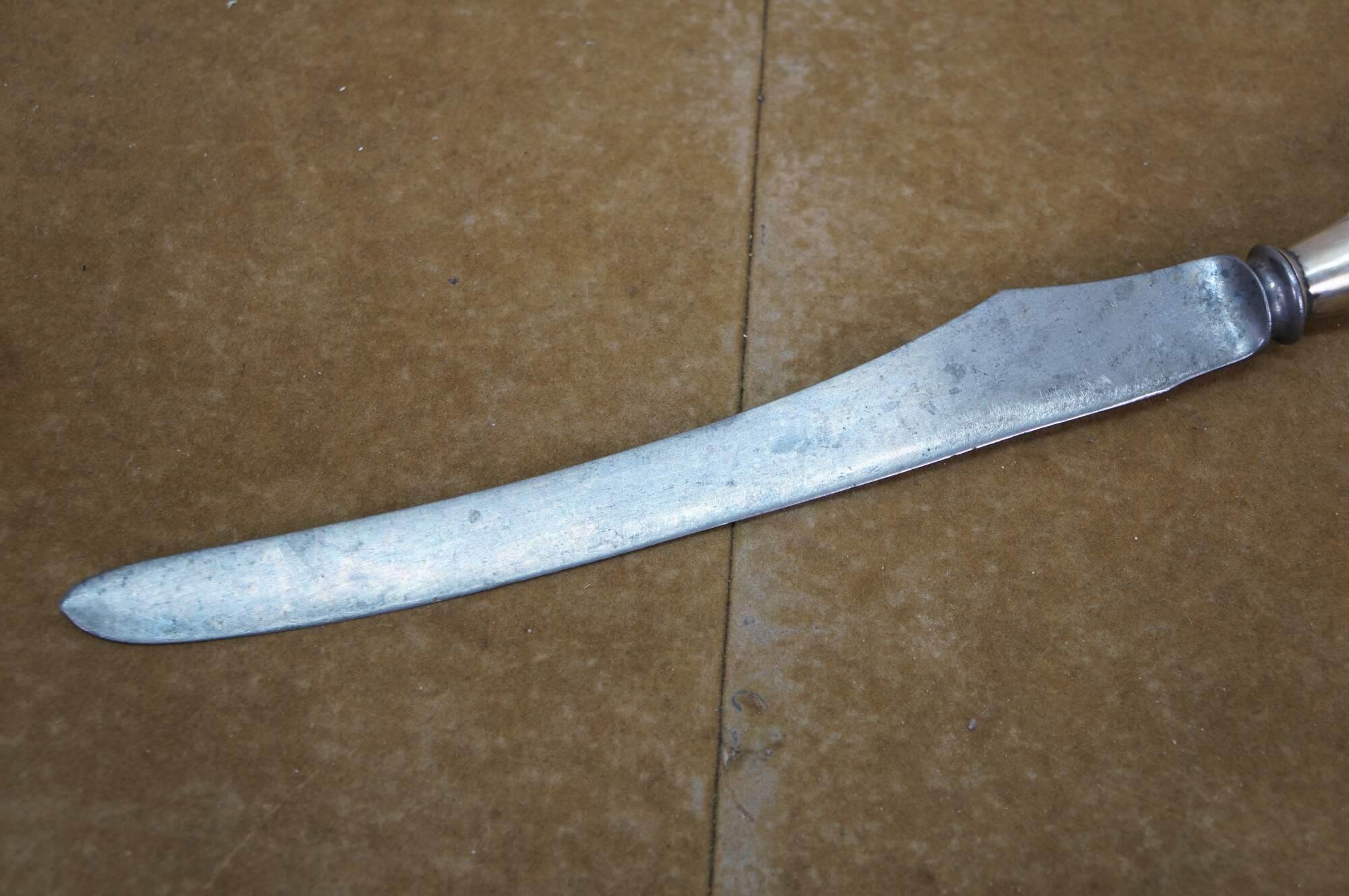 Antique German / Bavarian fork and knife carving set with antler / stag horn handles accompanied by sterling silver collars and bull / steer / bison head pommel caps.� The cutlery pieces feature forged steel blades and tines commonly used for serving and carving large roasts, turkeys, or hams.
