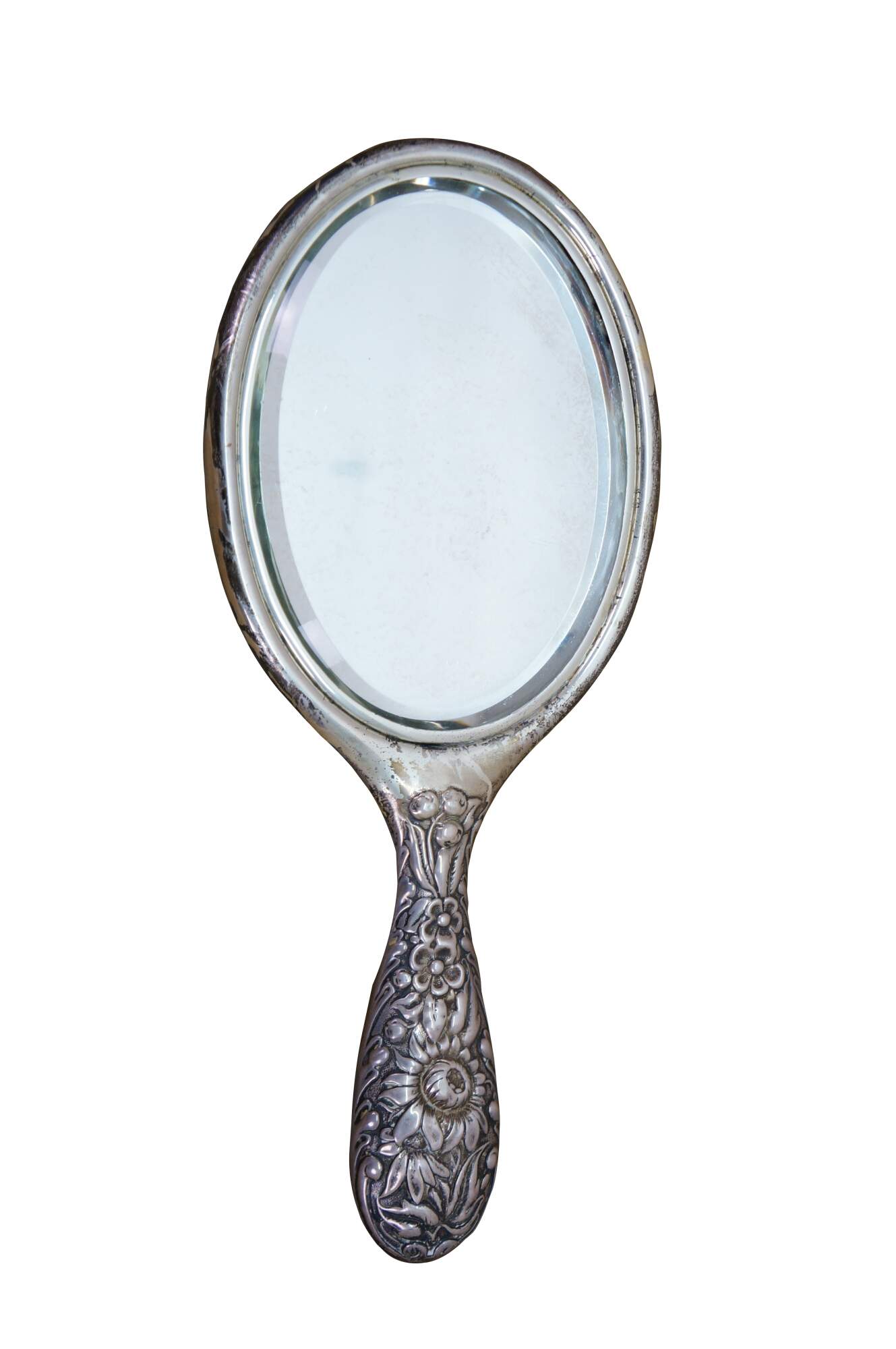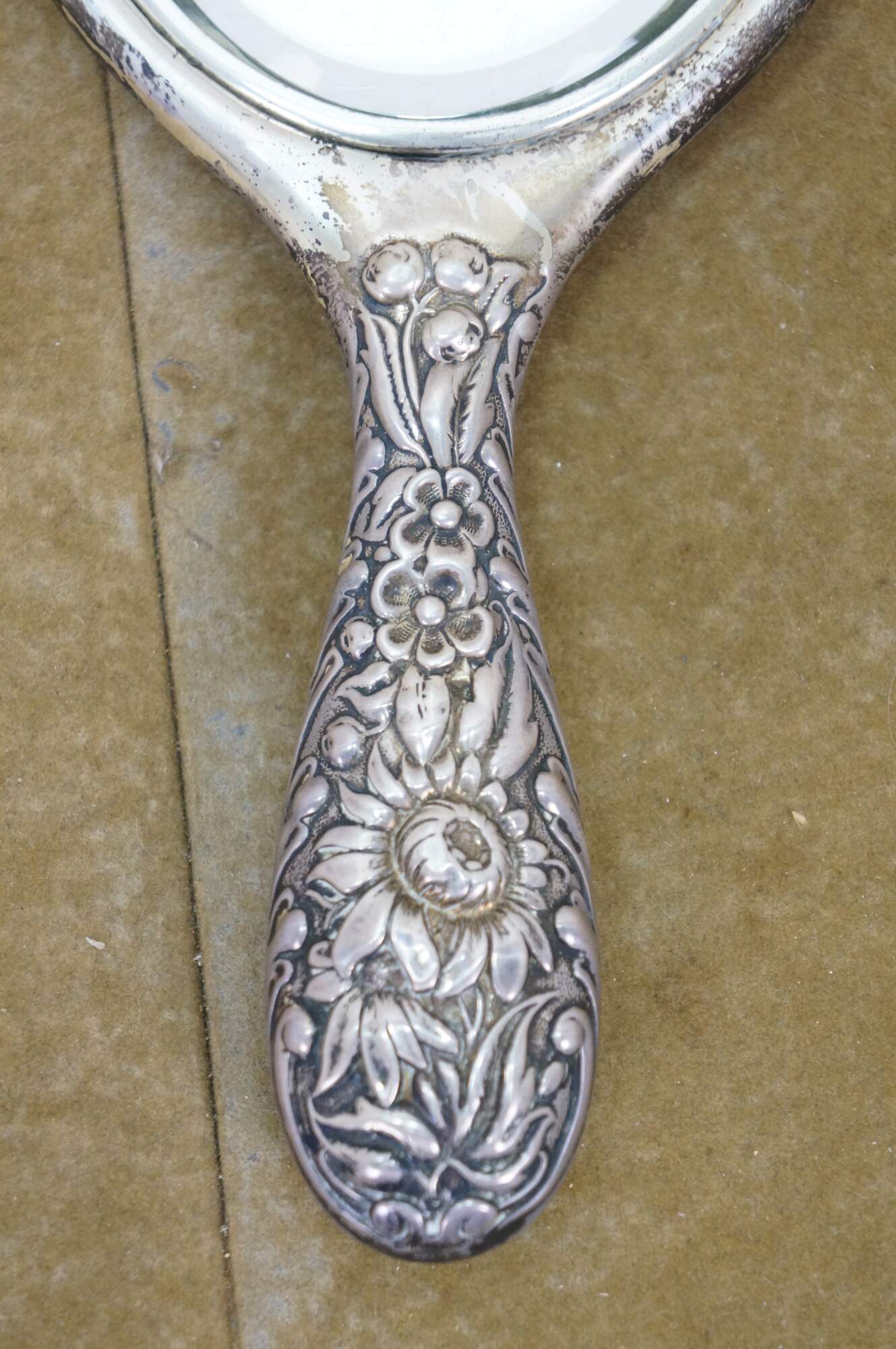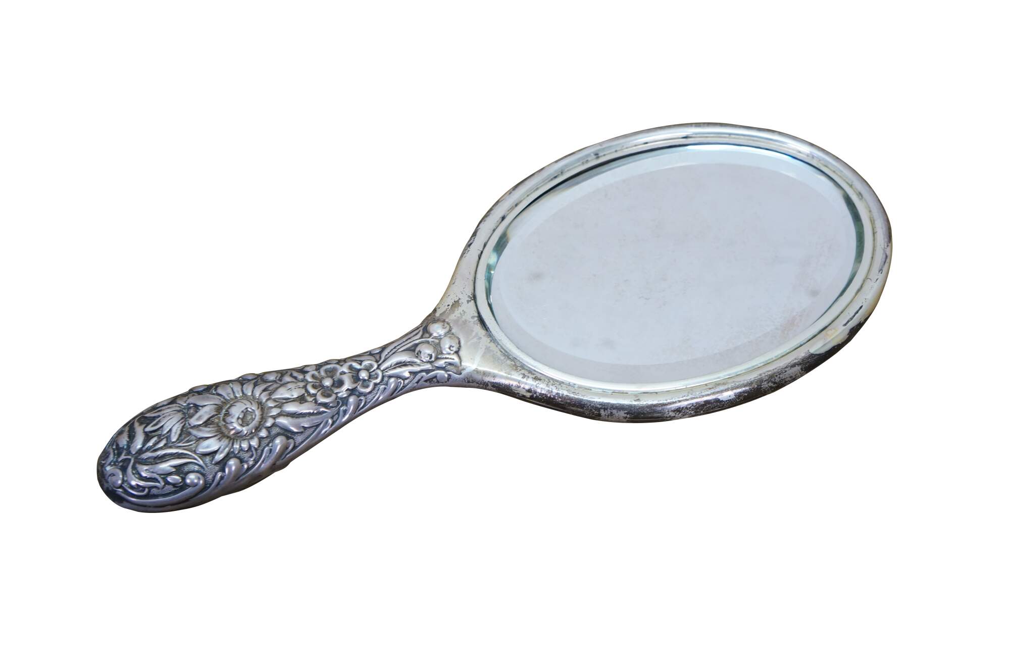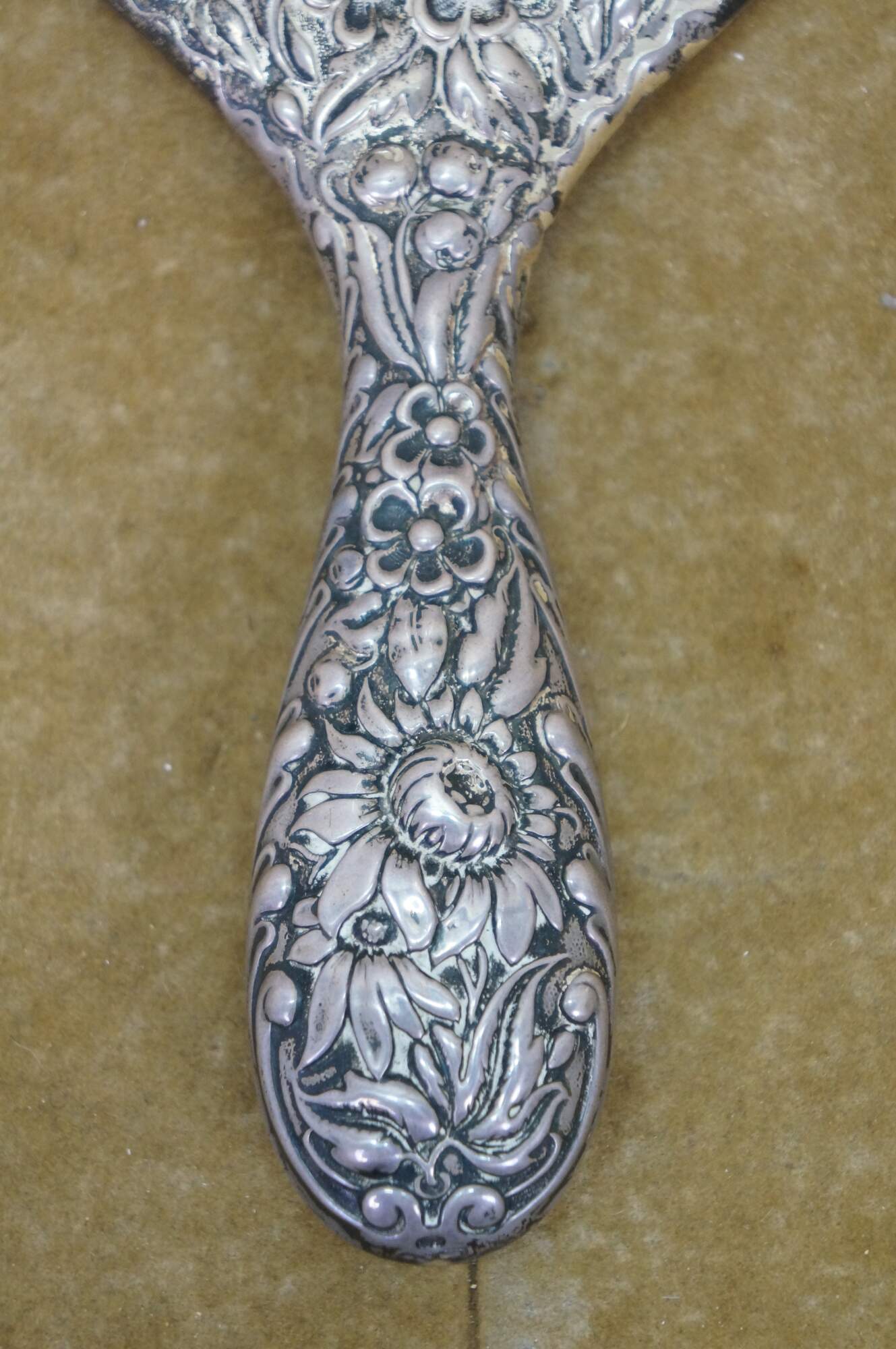 Antique Dominick & Haff sterling silver 925 beveled hand vanity mirror featuring repousse high relief floral sunflower / daisy design. Circa 1889.