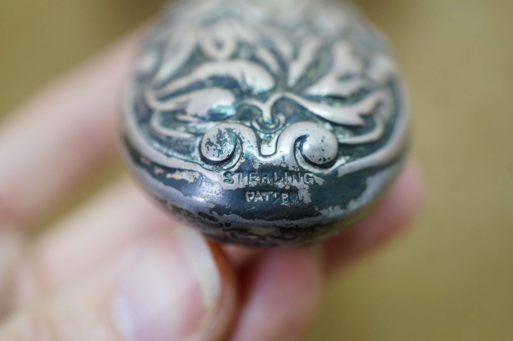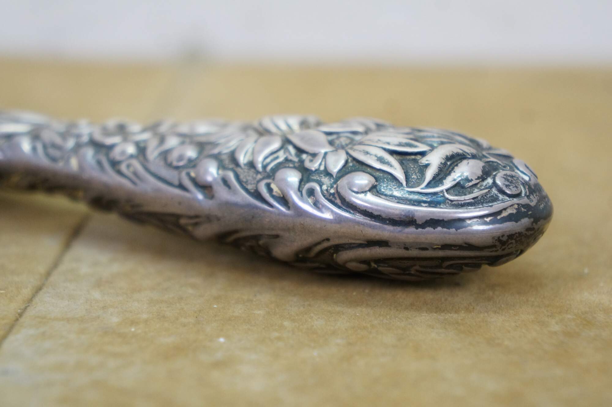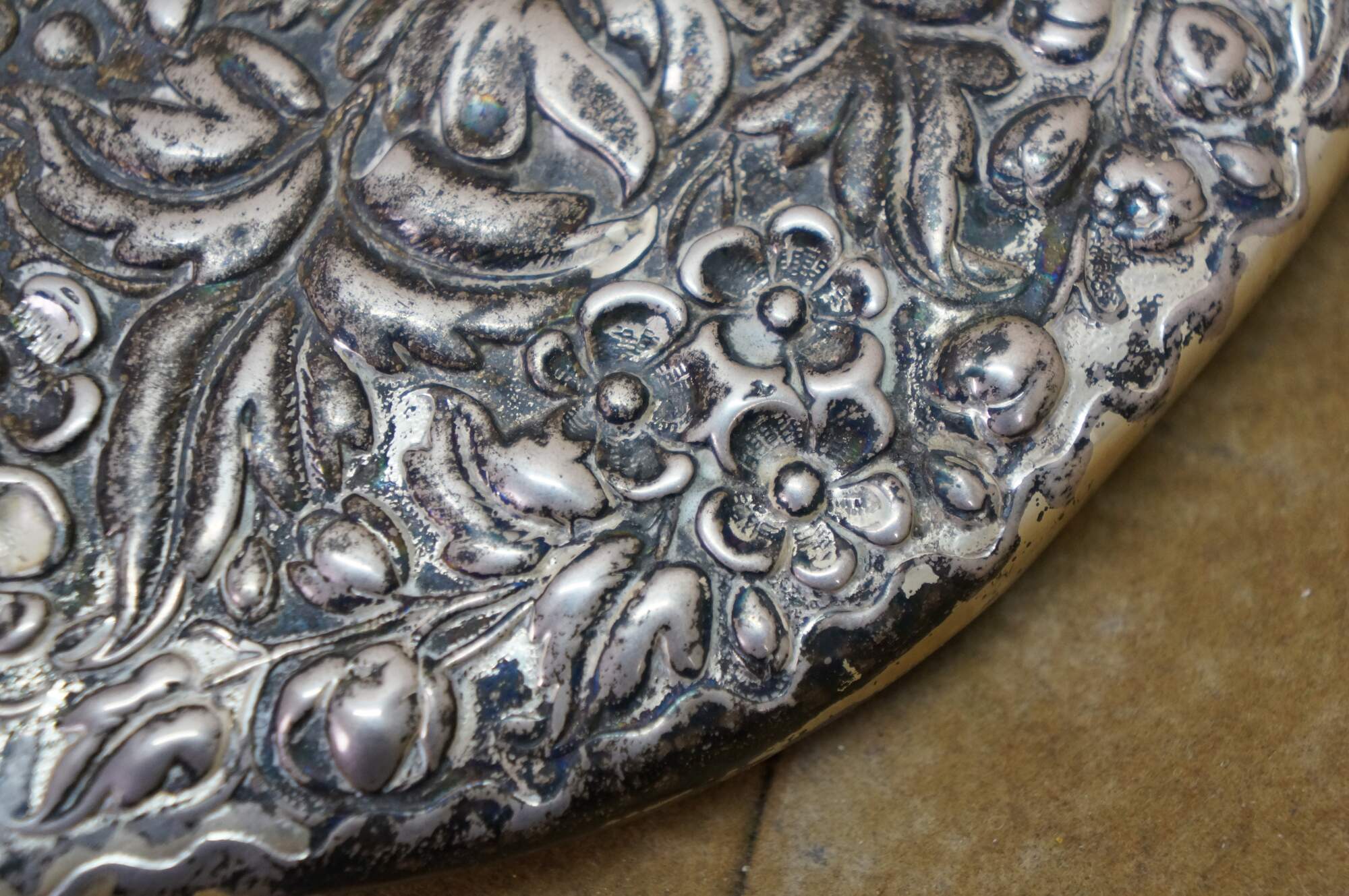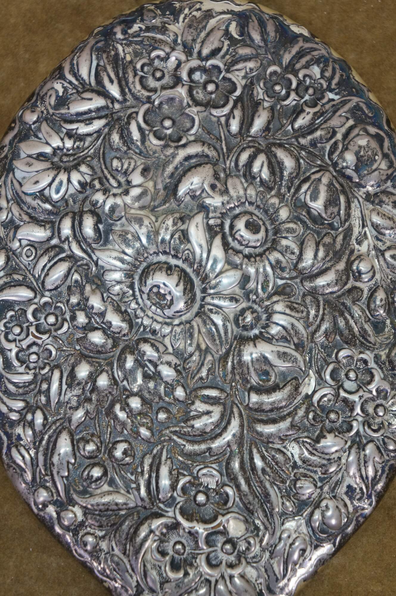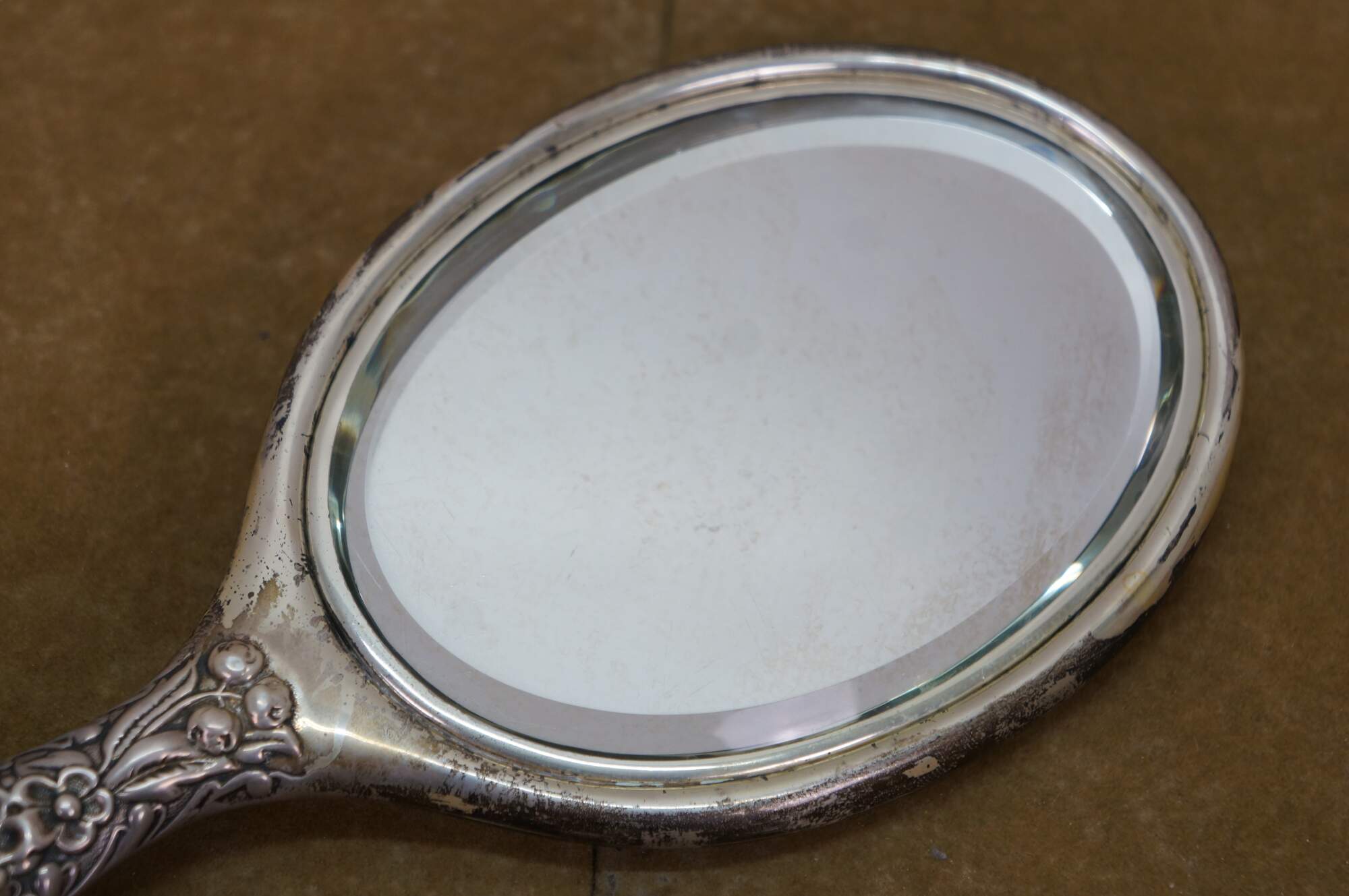 Antique Dominick & Haff sterling silver 925 beveled hand vanity mirror featuring repousse high relief floral sunflower / daisy design. Circa 1889.