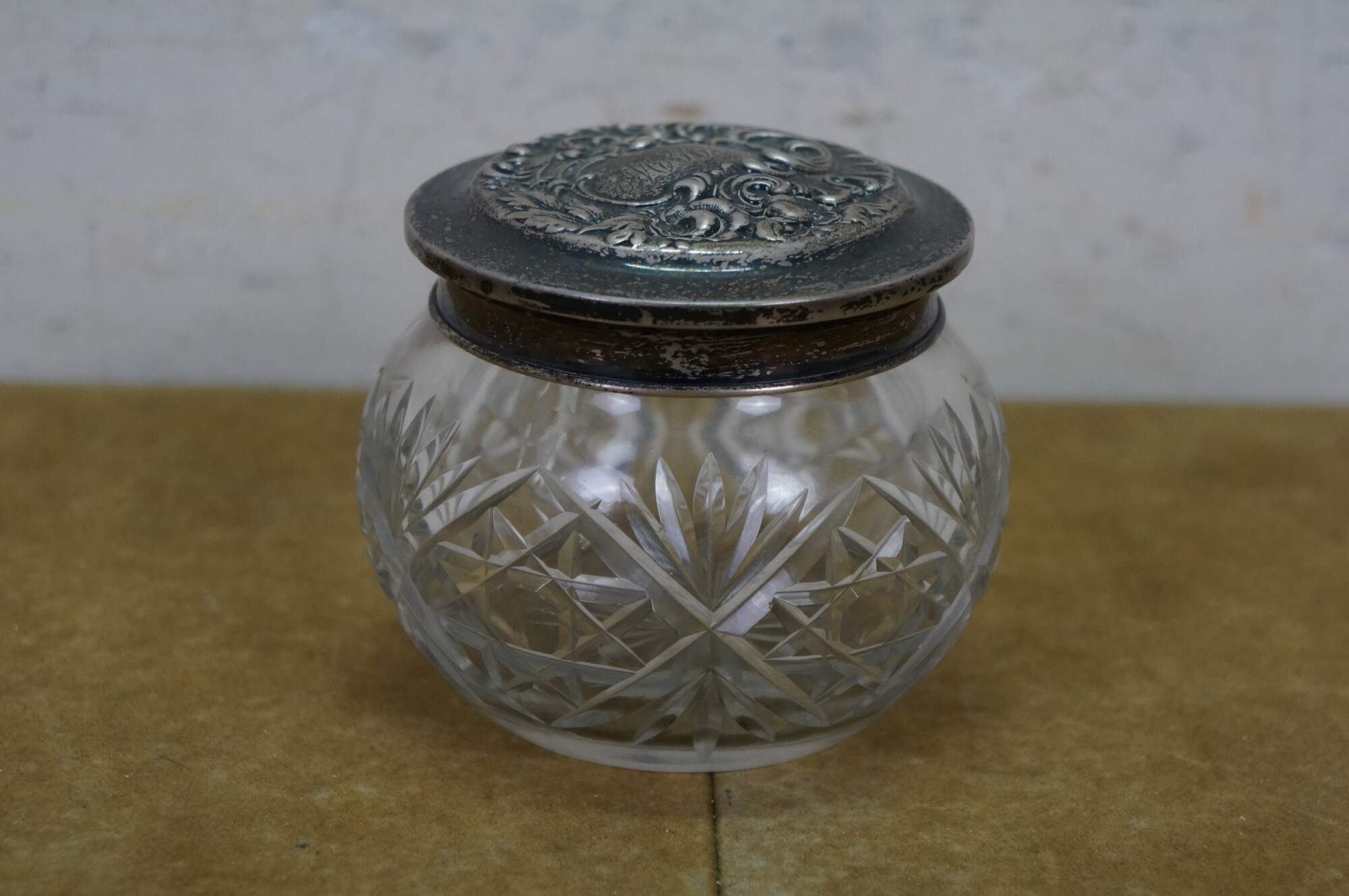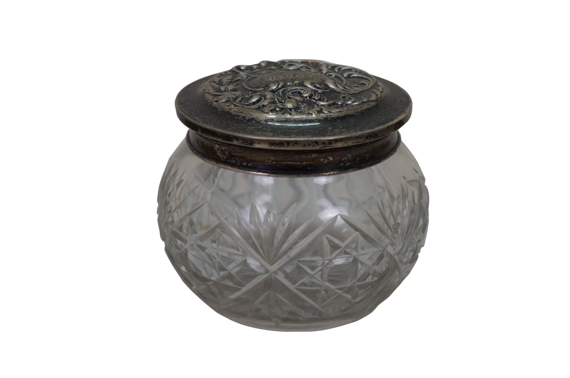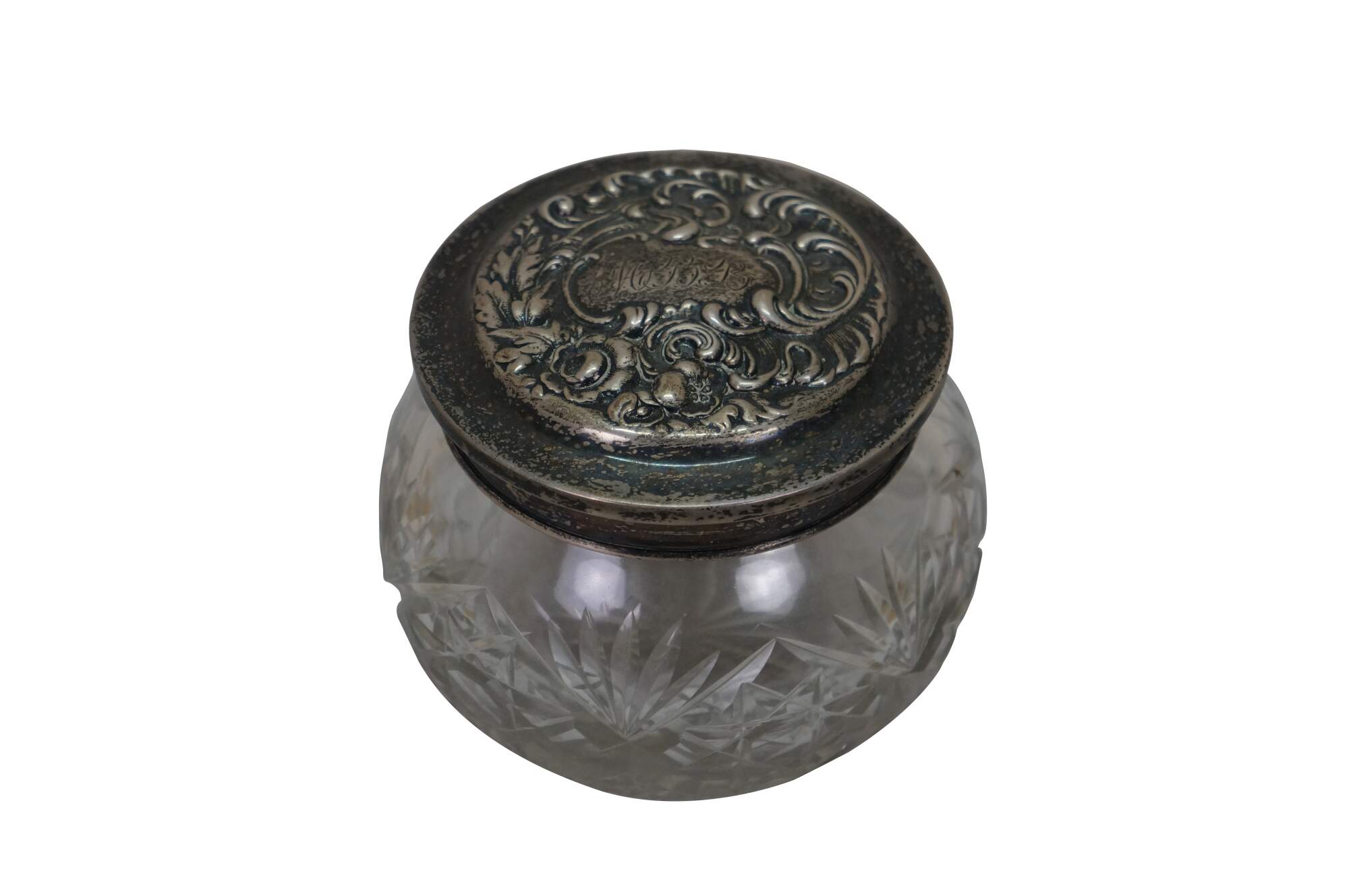 Antique Art Nouveau Simpson, Hall, Miller Co Repousse sterling silver 925/1000 lidded cut crystal / glass vanity / powder / dresser jar or pot.