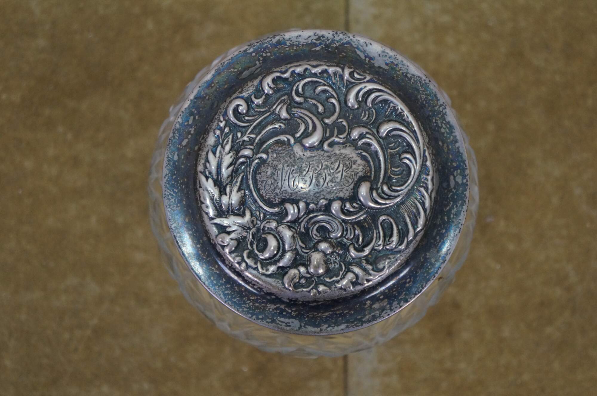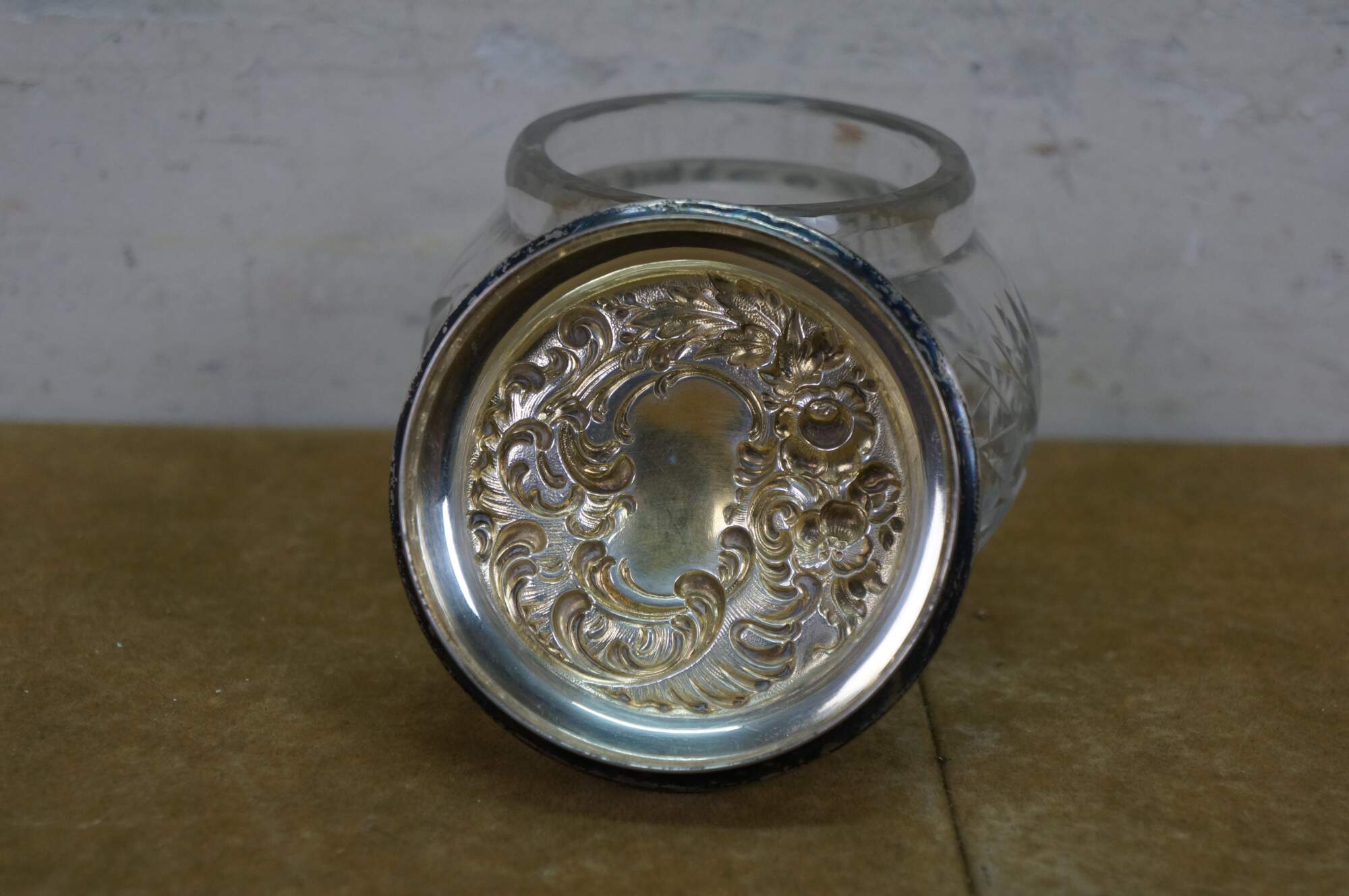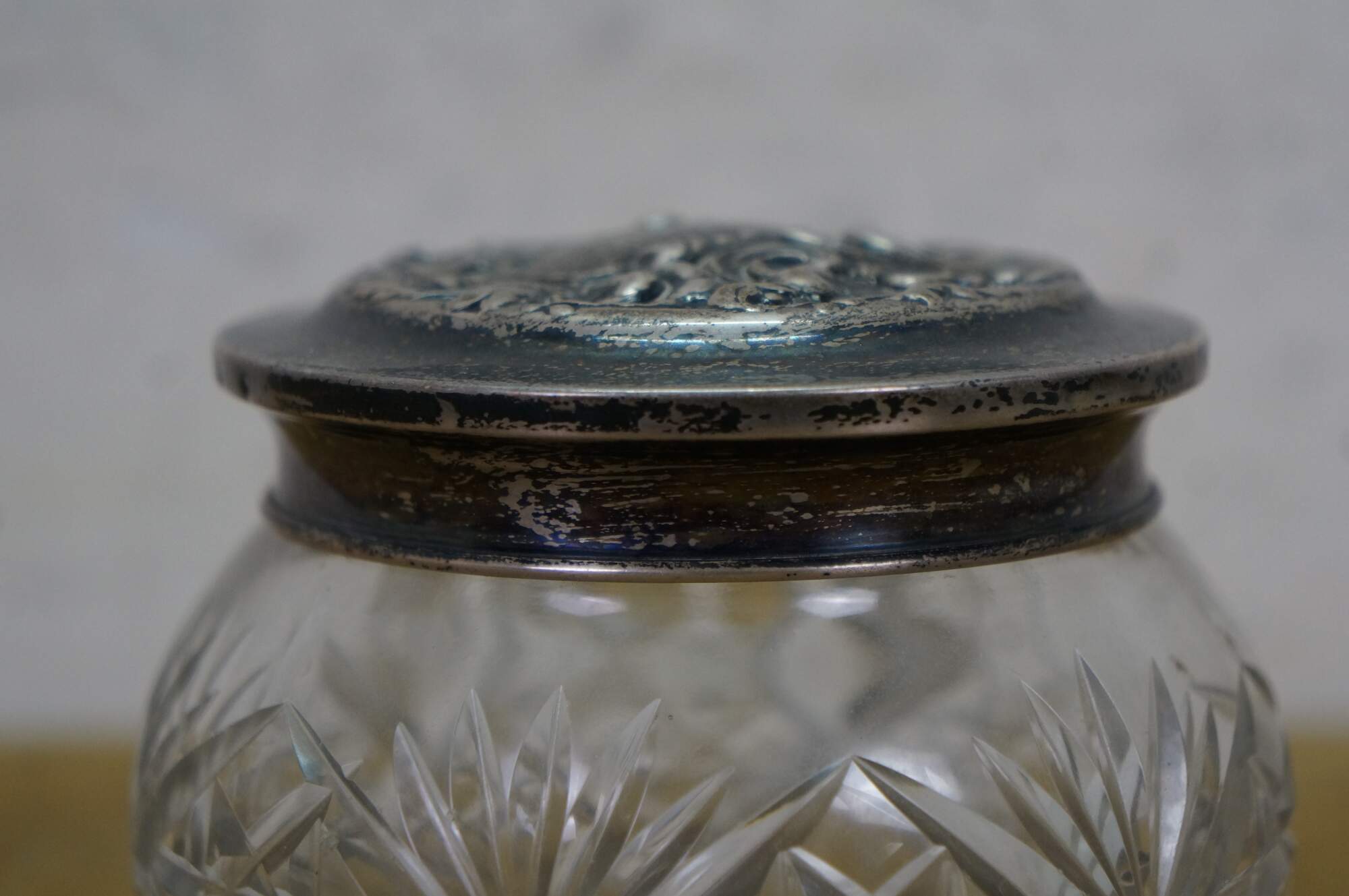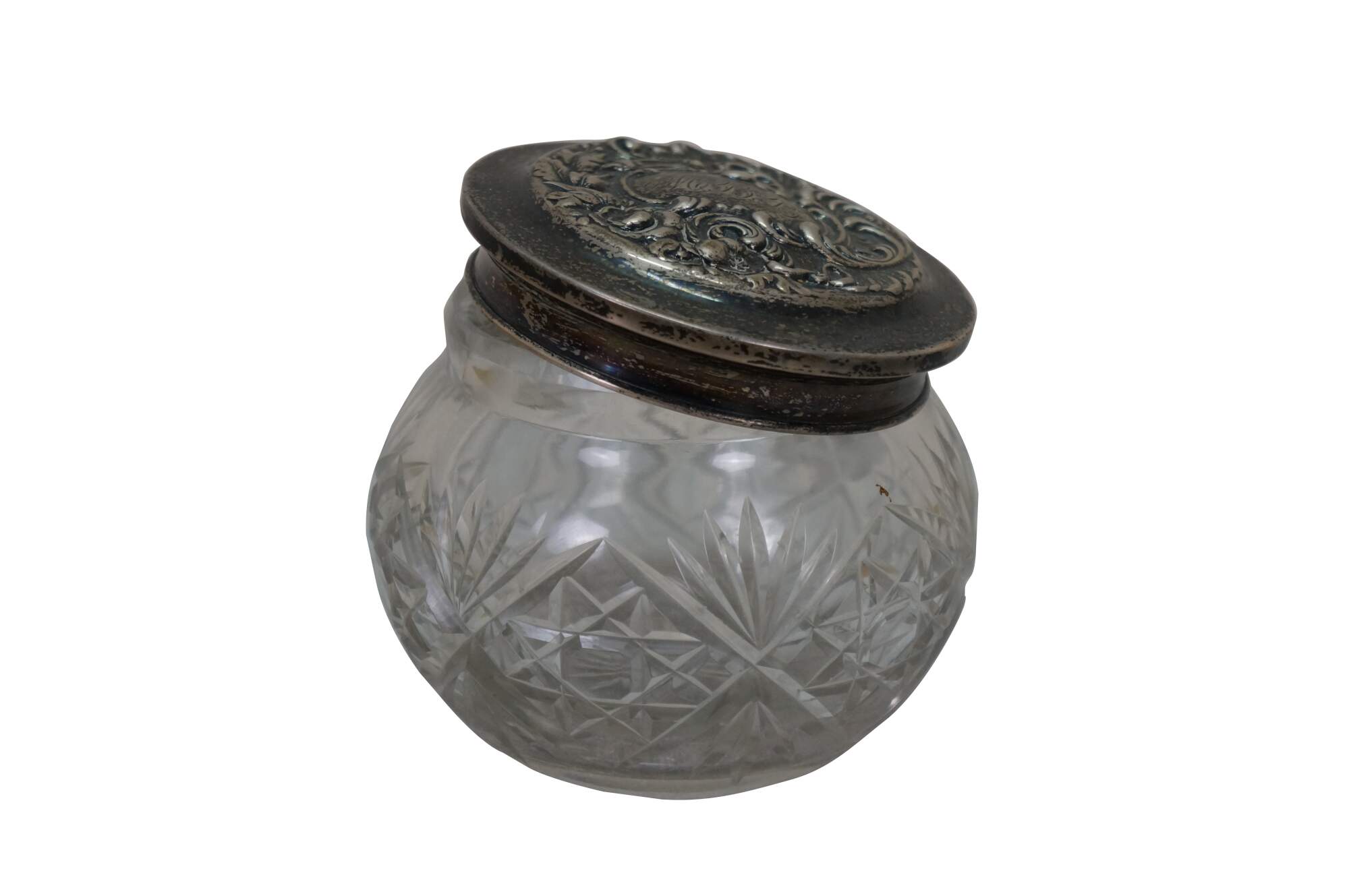 Antique Art Nouveau Simpson, Hall, Miller Co Repousse sterling silver 925/1000 lidded cut crystal / glass vanity / powder / dresser jar or pot.