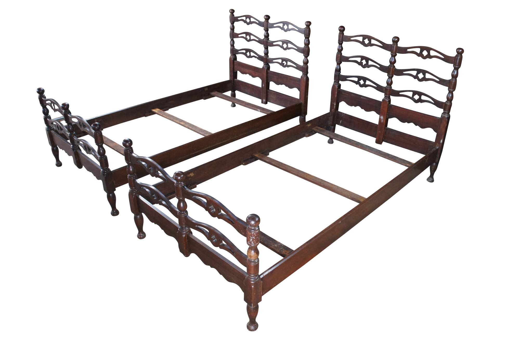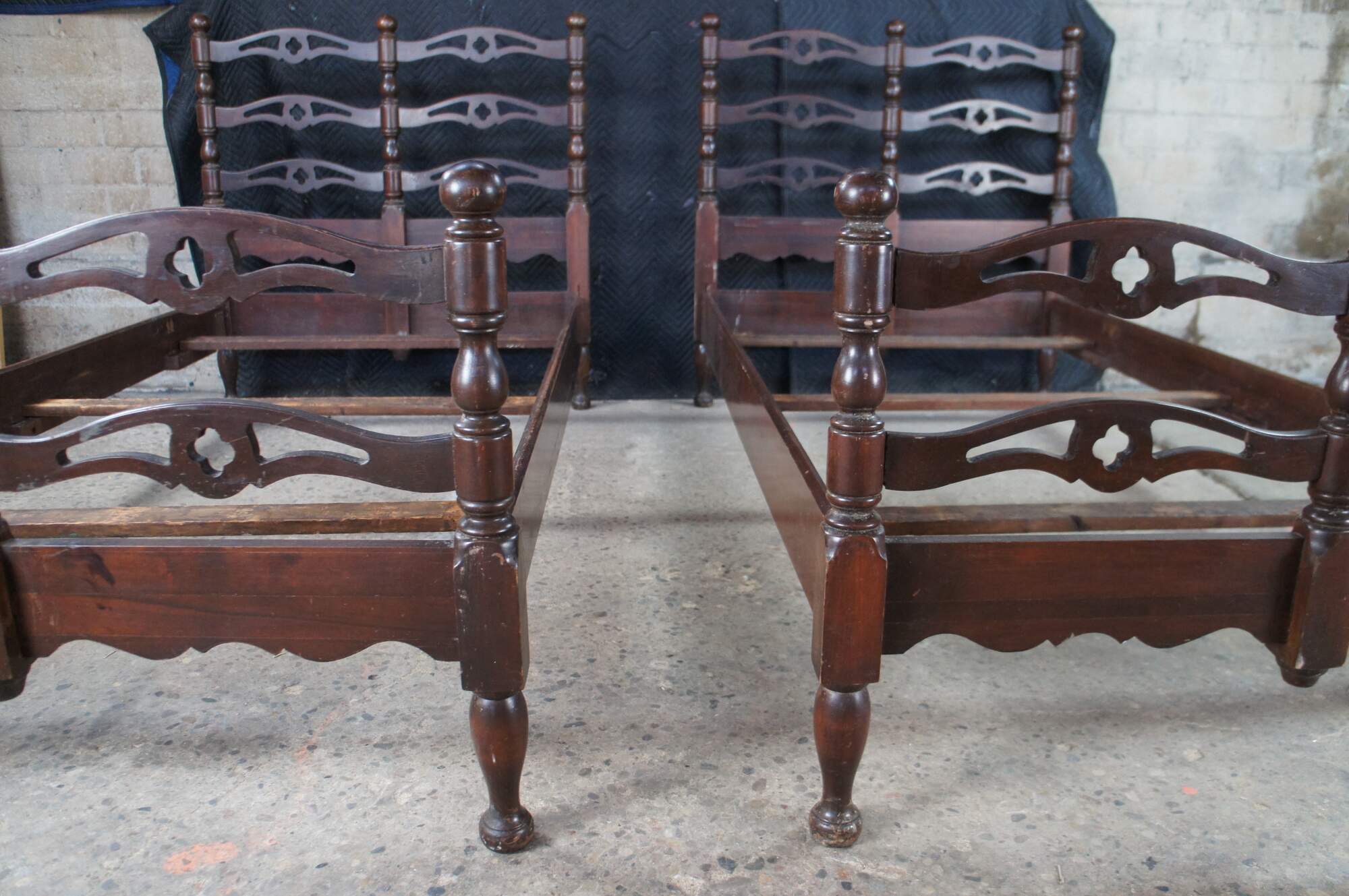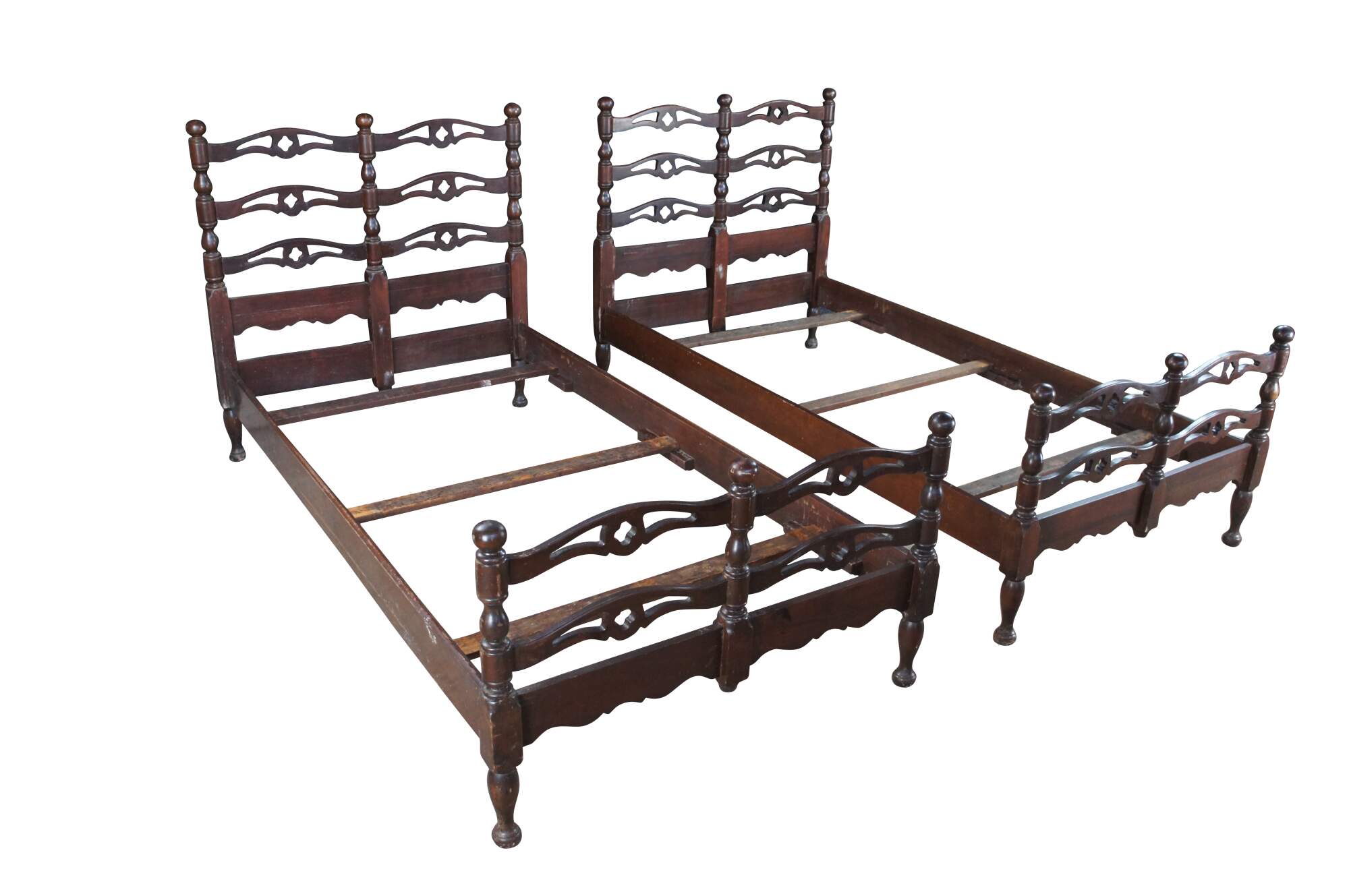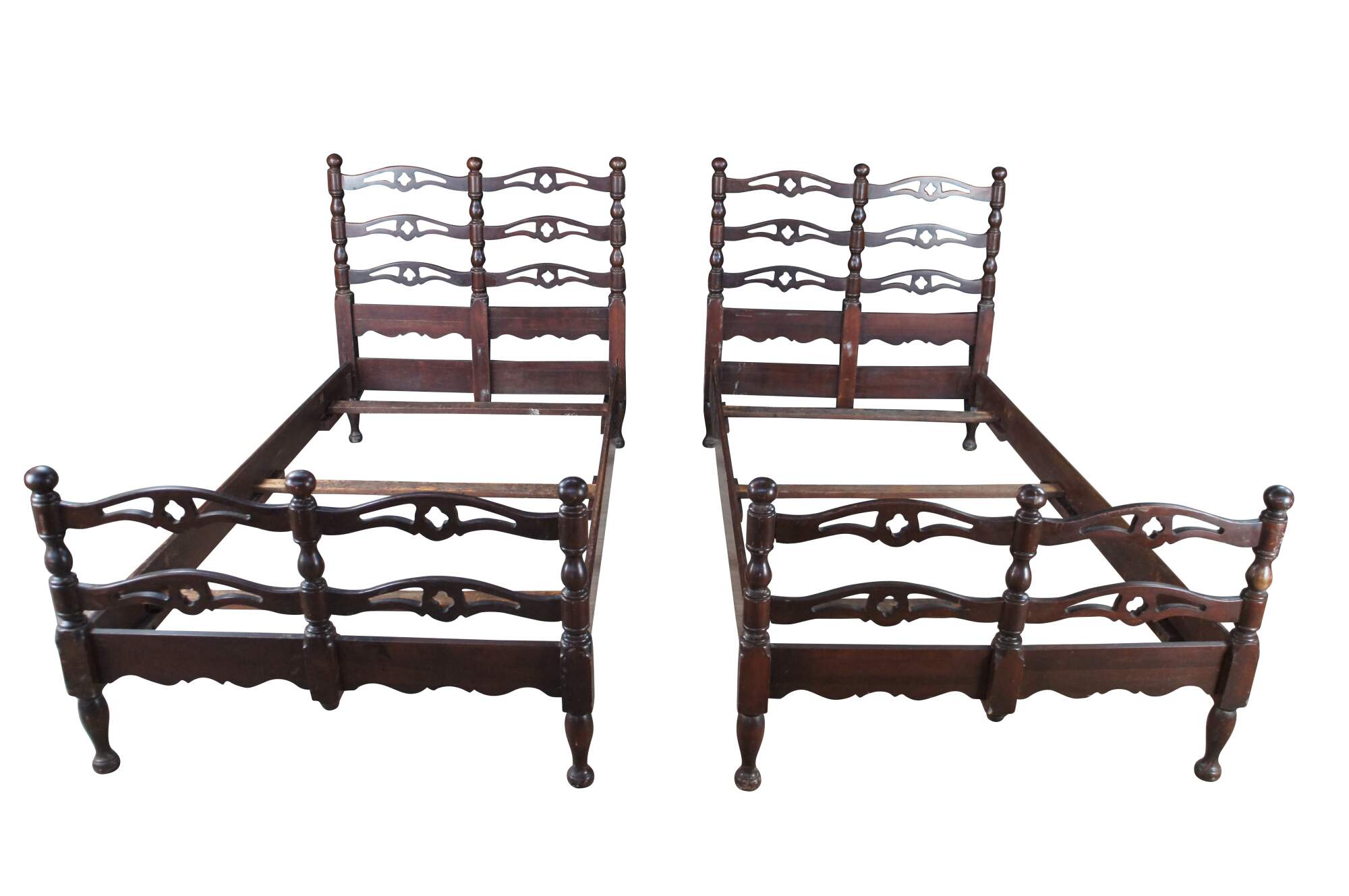 Mid Century American Colonial twin size beds. Made of oak featuring a reticulated ladderback design with pierced quatrefoil / four leaf clover accents.