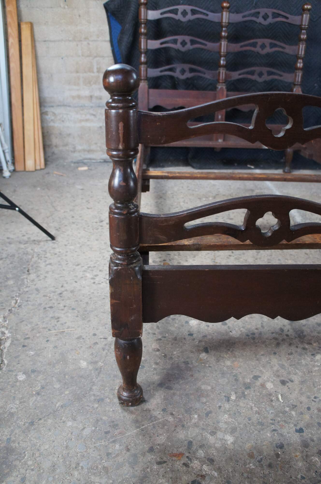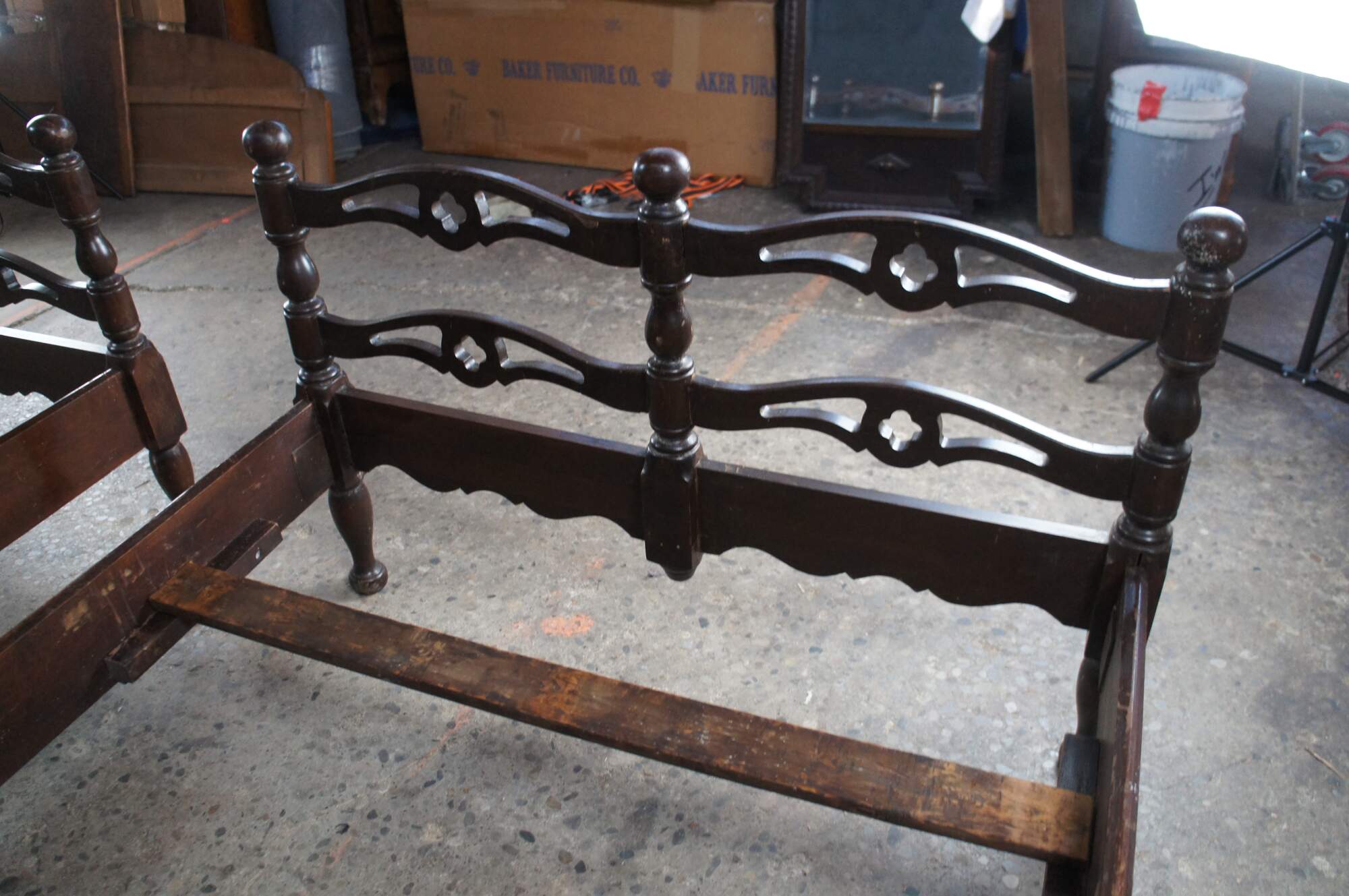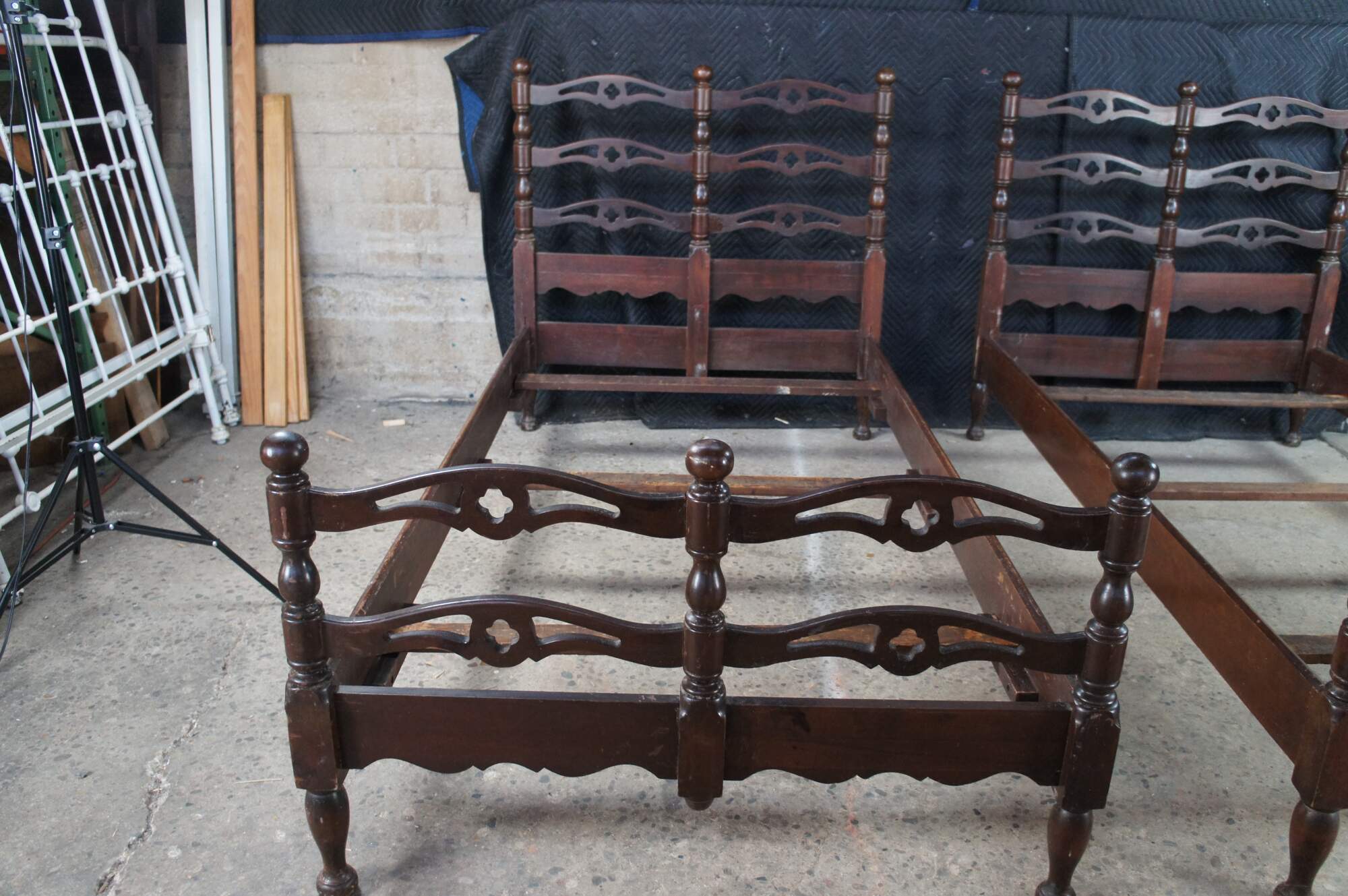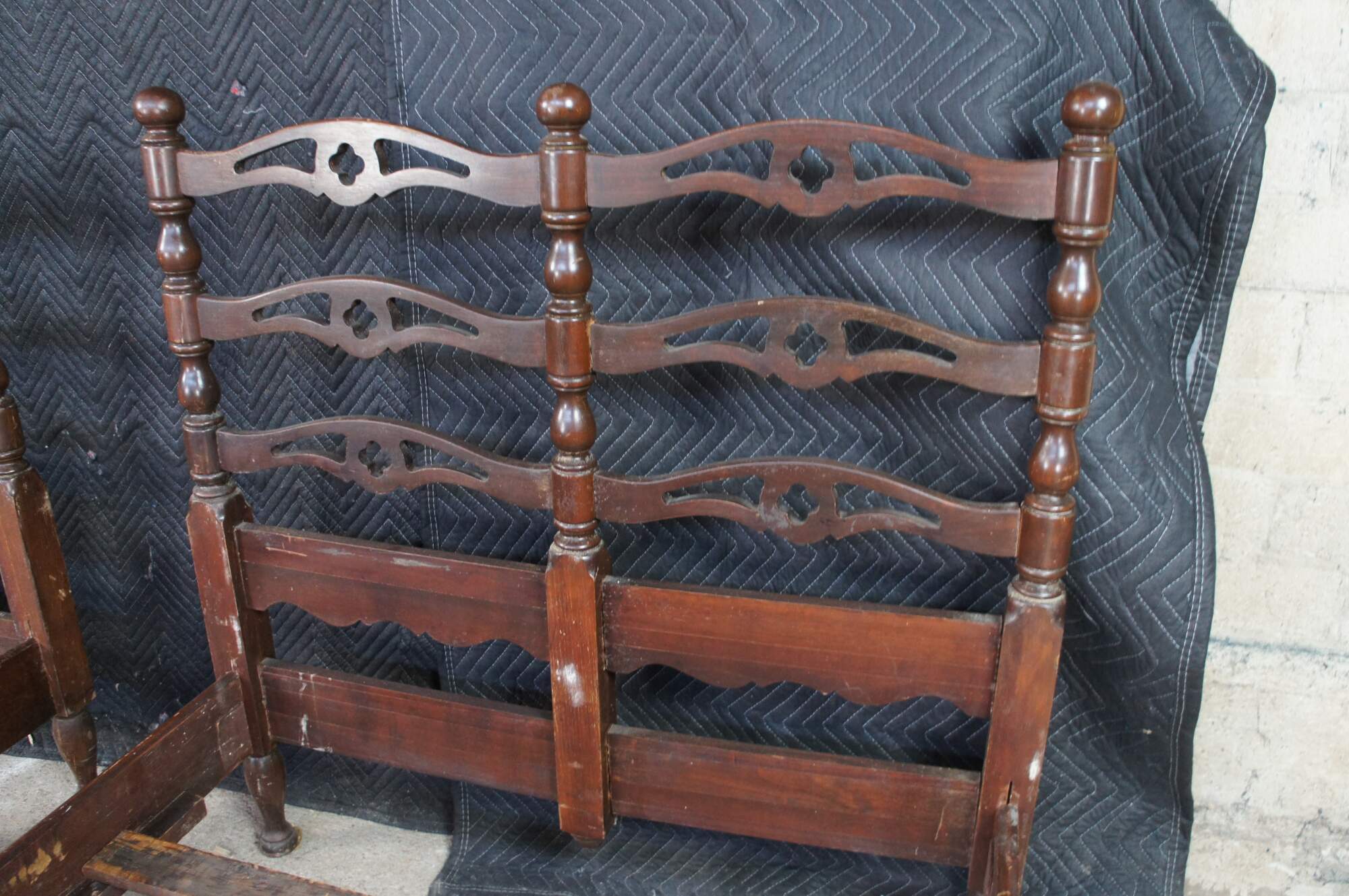 Mid Century American Colonial twin size beds. Made of oak featuring a reticulated ladderback design with pierced quatrefoil / four leaf clover accents.