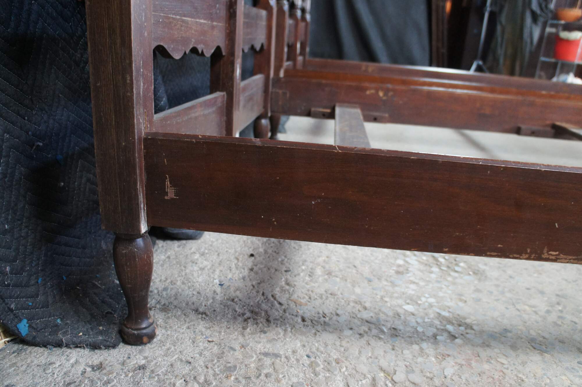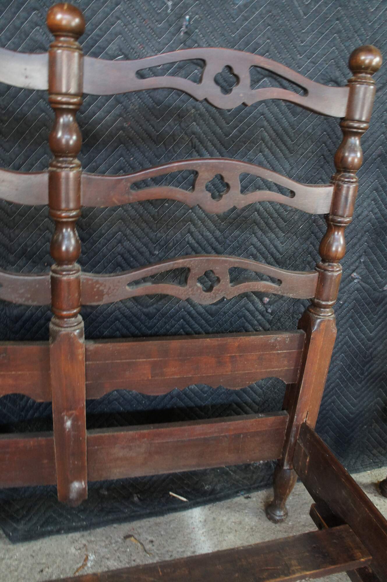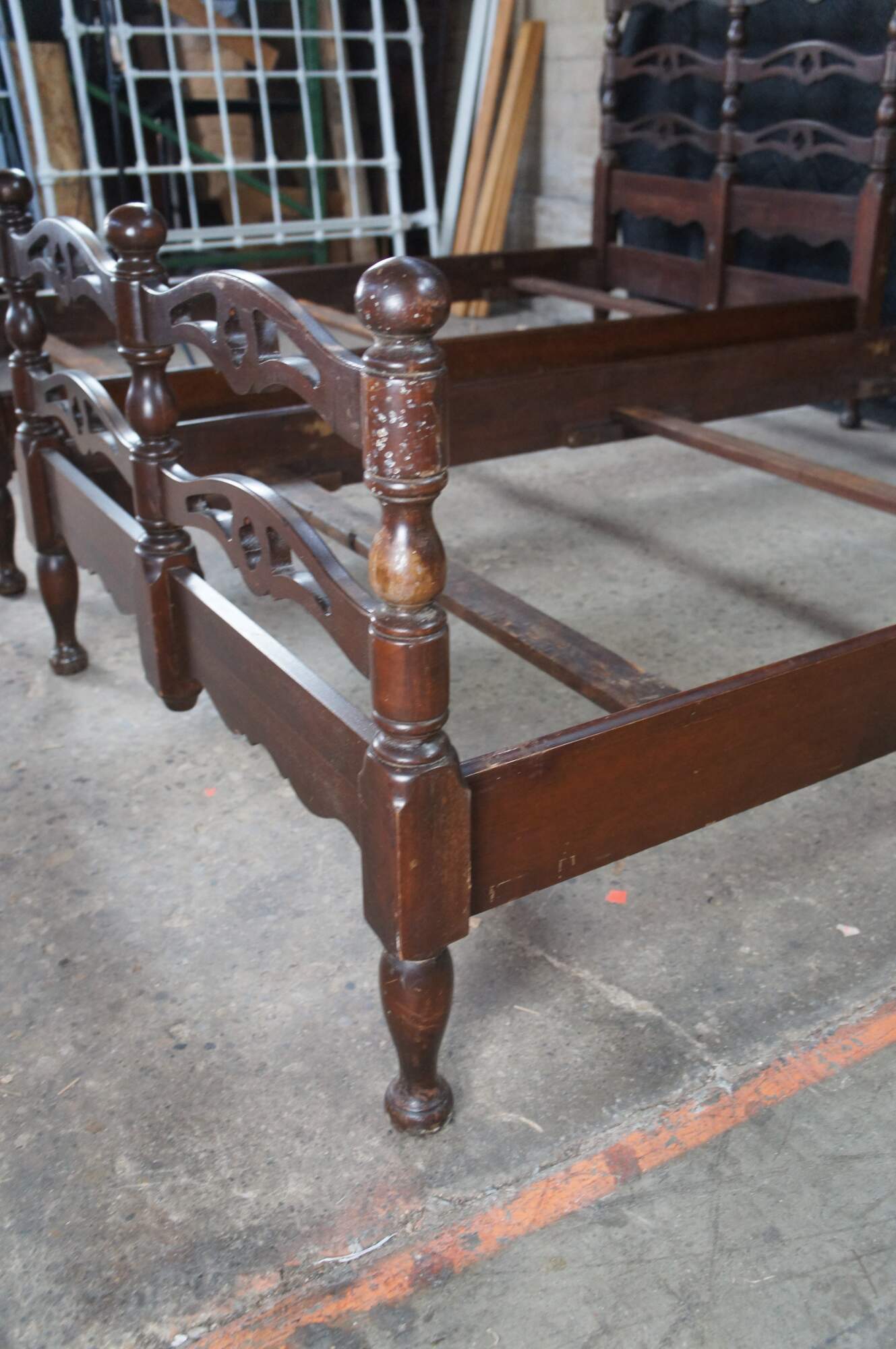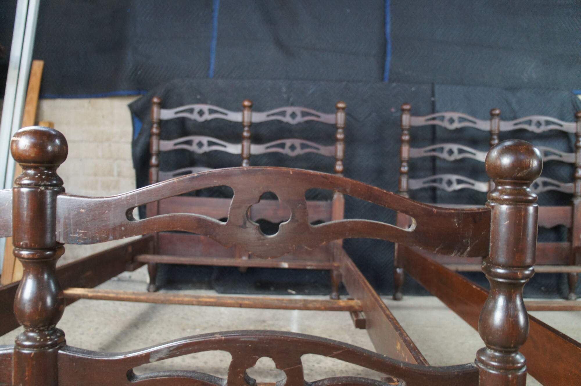Mid Century American Colonial twin size beds. Made of oak featuring a reticulated ladderback design with pierced quatrefoil / four leaf clover accents.