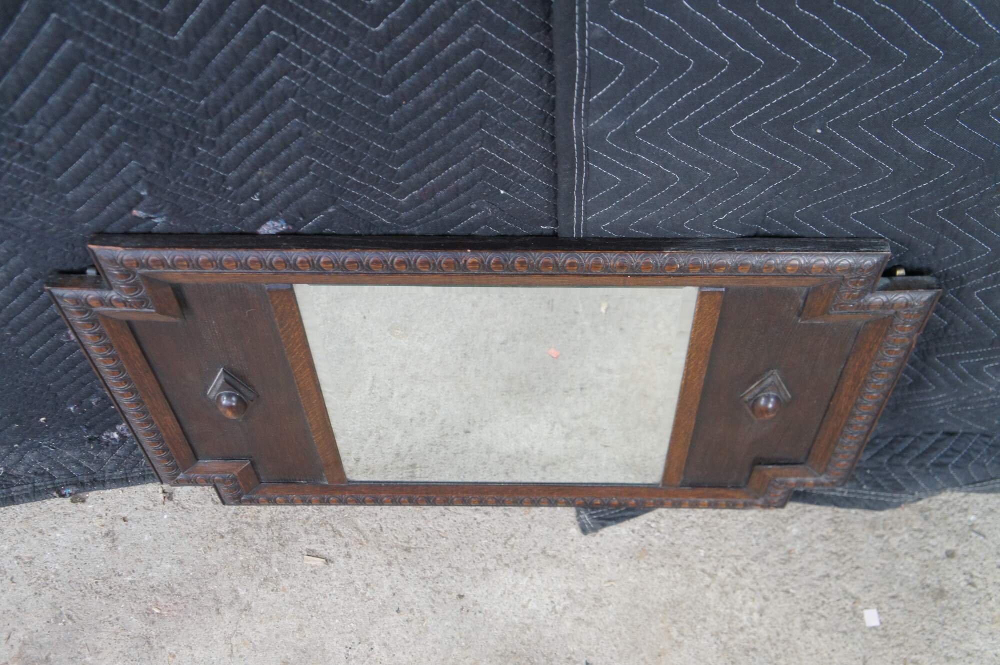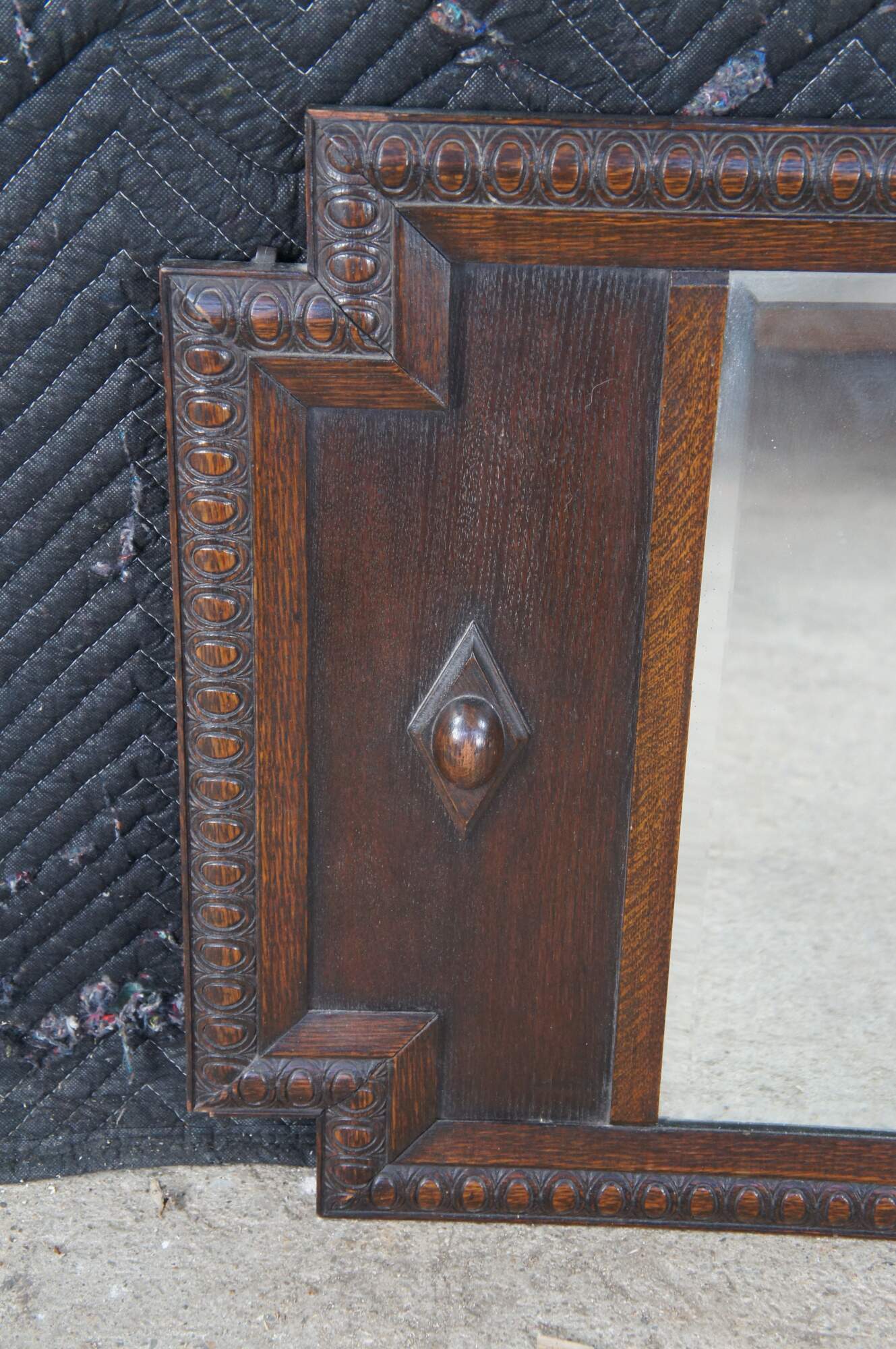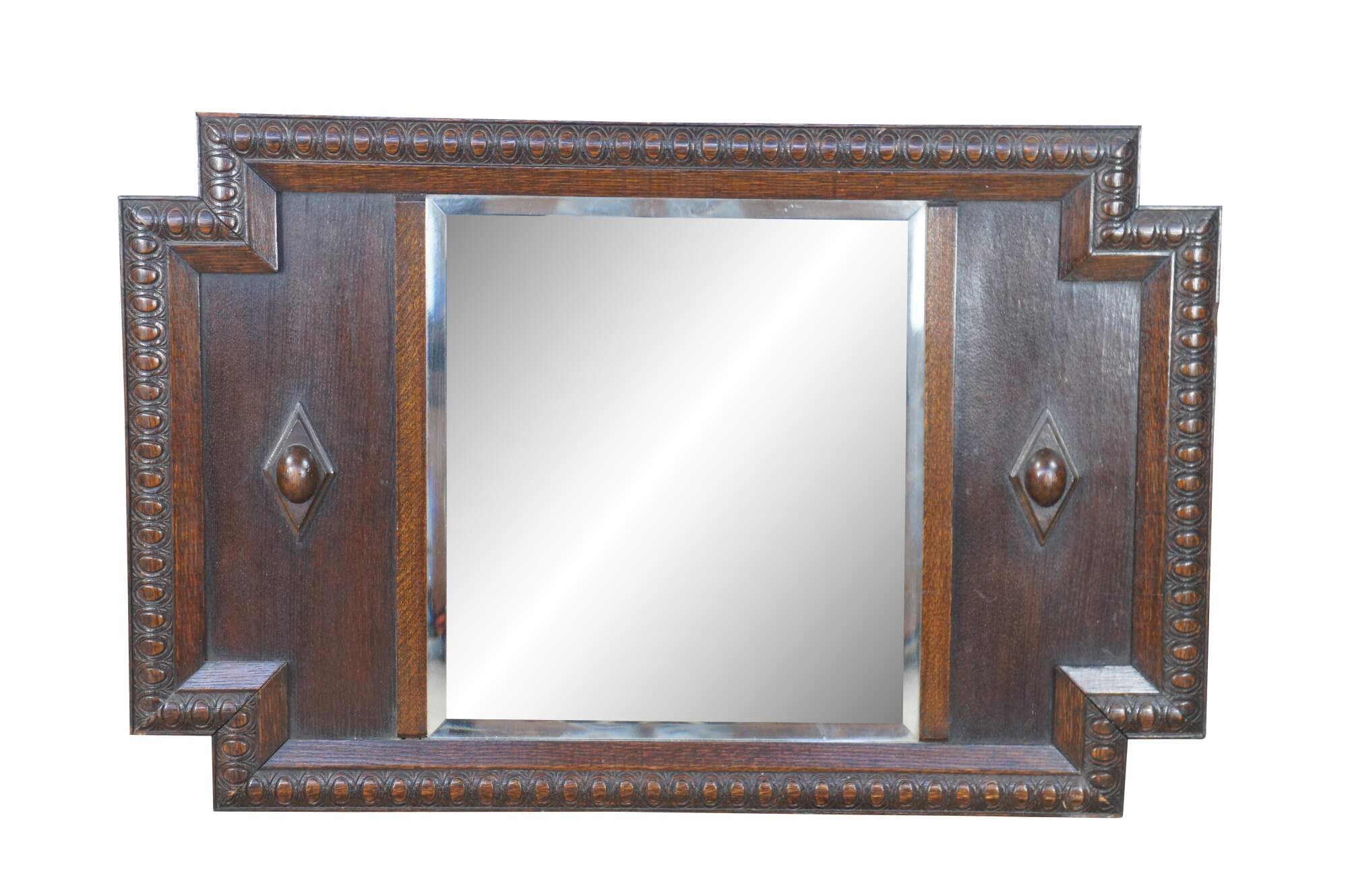 Very impressive Antique Victorian wall mirror. Made of quartersawn oak featuring notched corners with egg and dart molding, and a beveled mirror flanked by diamond medallions.