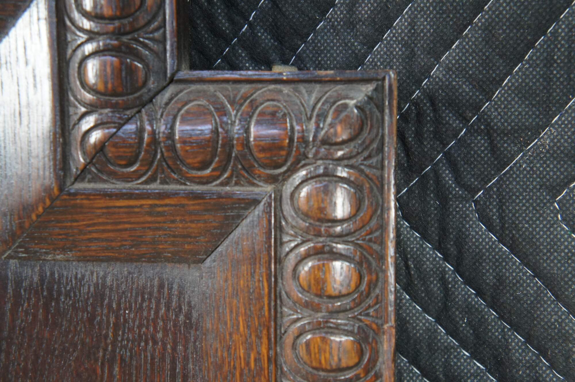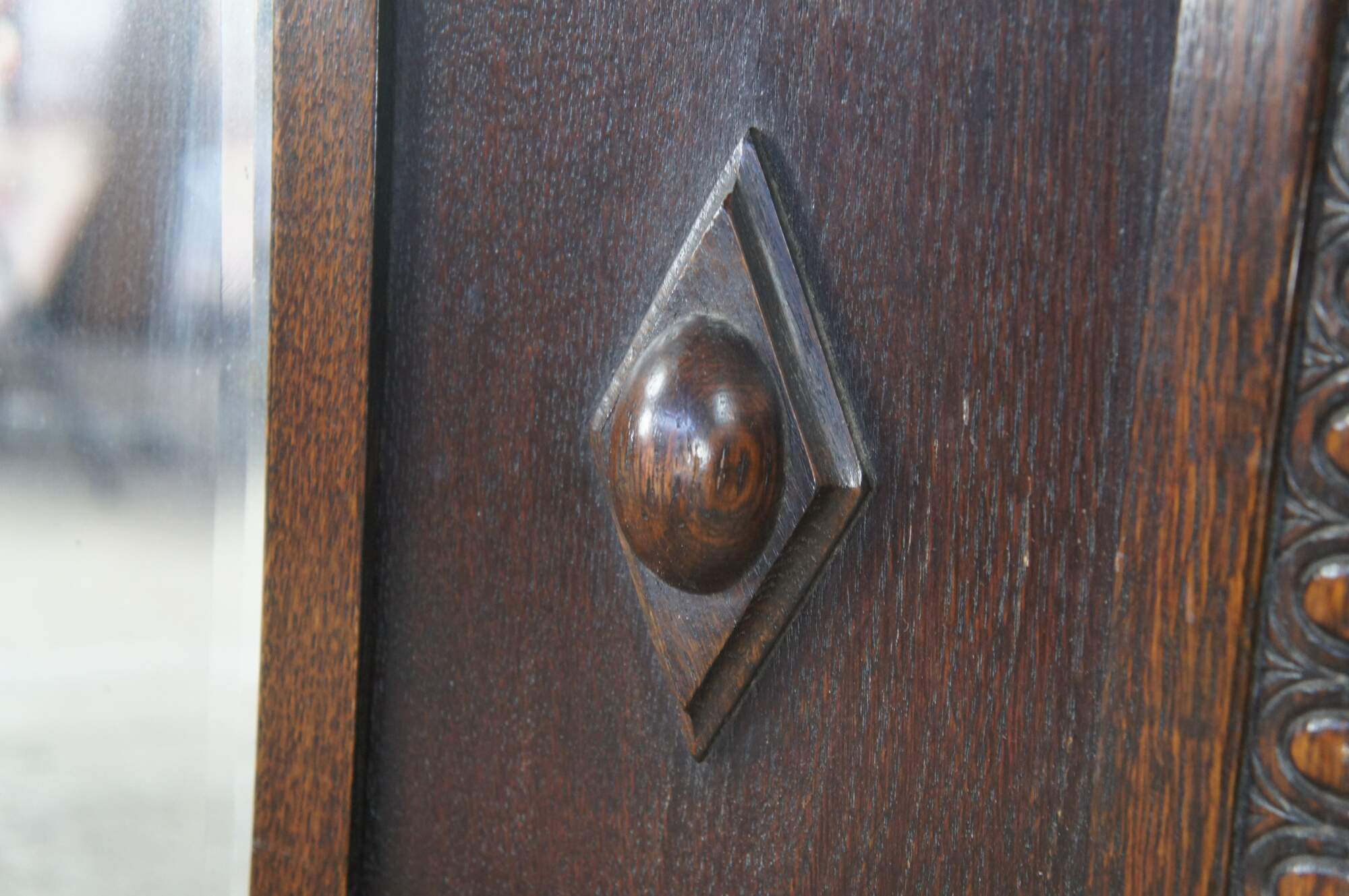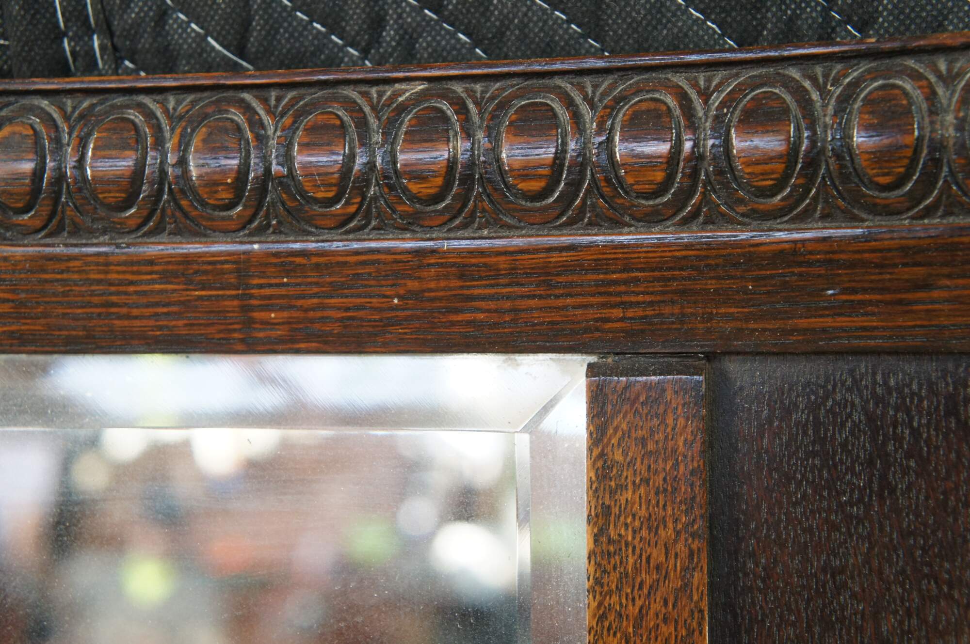 Very impressive Antique Victorian wall mirror. Made of quartersawn oak featuring notched corners with egg and dart molding, and a beveled mirror flanked by diamond medallions.