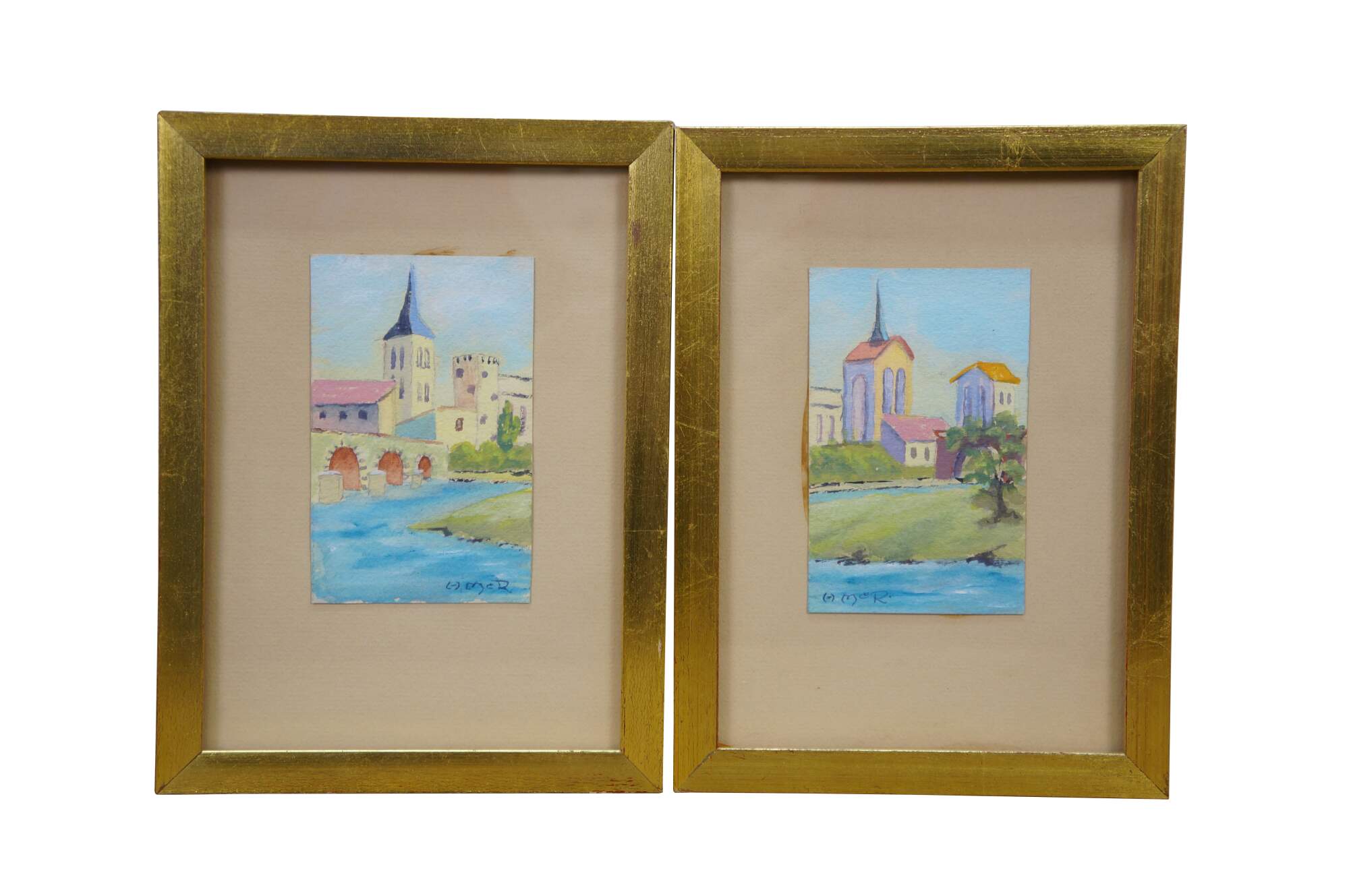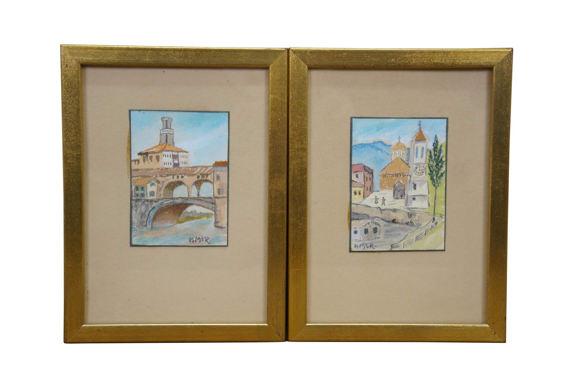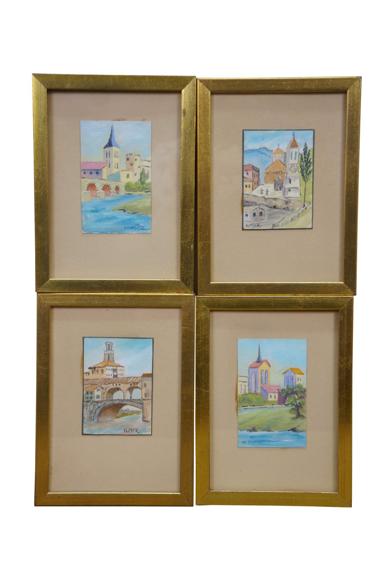 4 Mid Century European Architectural Watercolor Landscape Paintings by Helen J. McRae of New York. Circa mid-20th Century. Helen had masters in Fine Art. The four paintings showcase European cityscapes with water, bridges, steeples and various buildings. Neatly framed on a beige mat with gold finished frame.