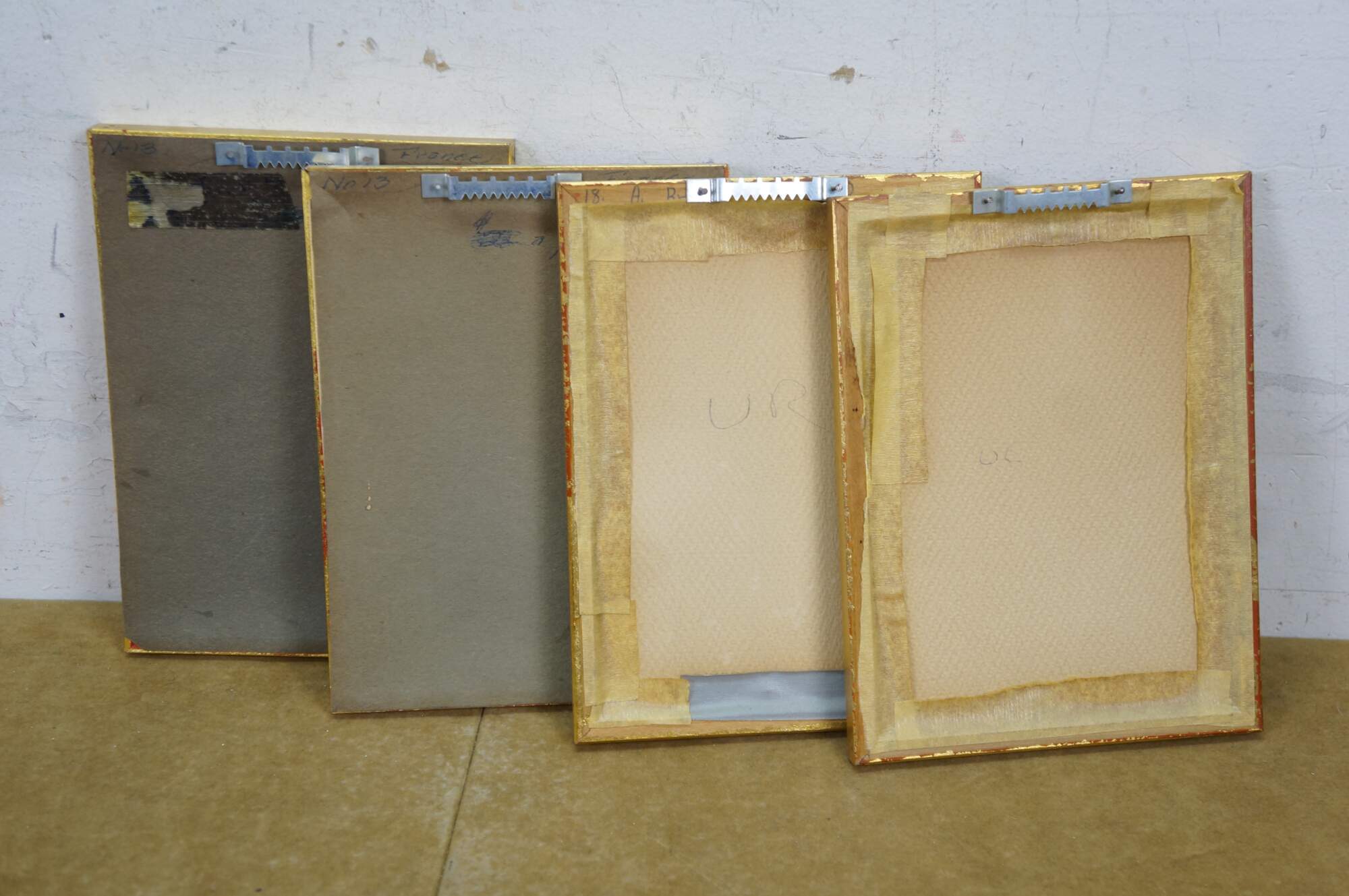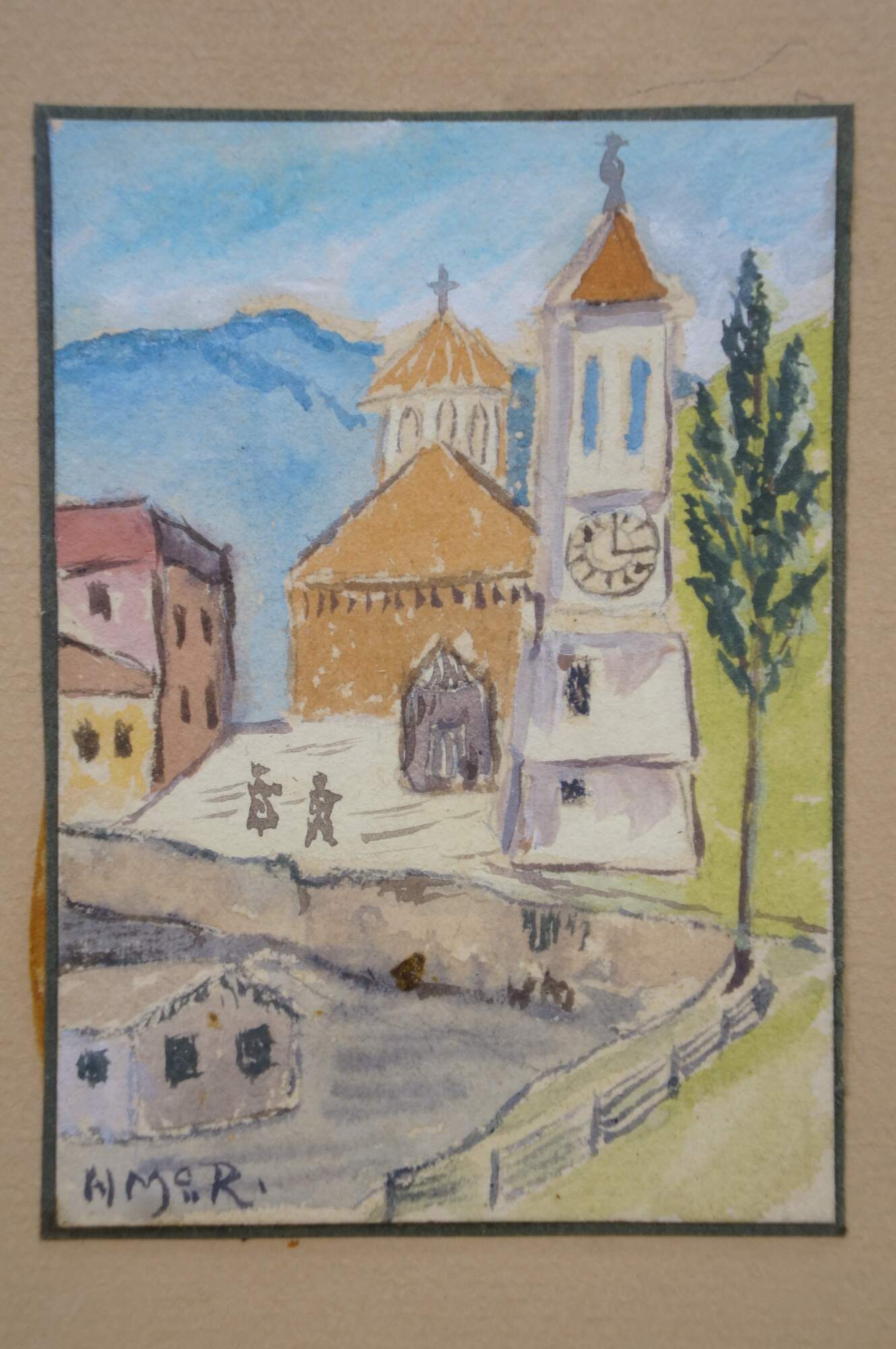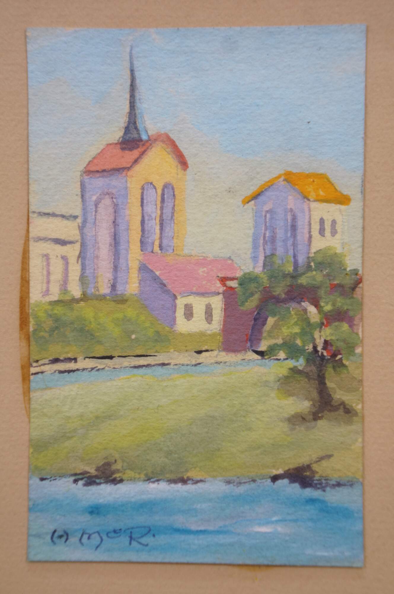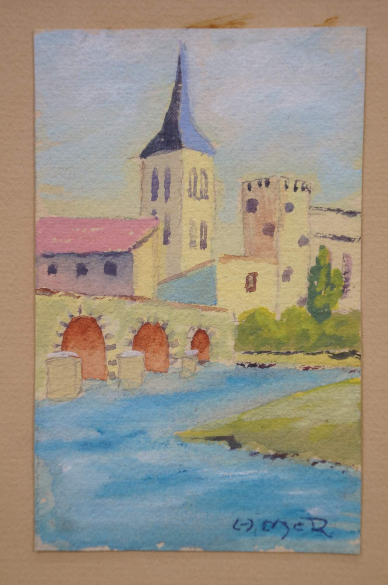 4 Mid Century European Architectural Watercolor Landscape Paintings by Helen J. McRae of New York. Circa mid-20th Century. Helen had masters in Fine Art. The four paintings showcase European cityscapes with water, bridges, steeples and various buildings. Neatly framed on a beige mat with gold finished frame.