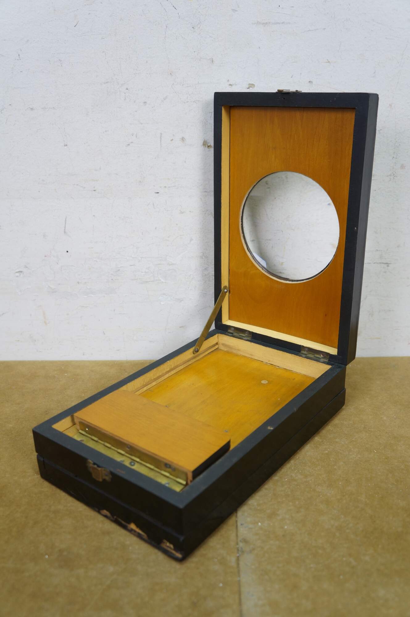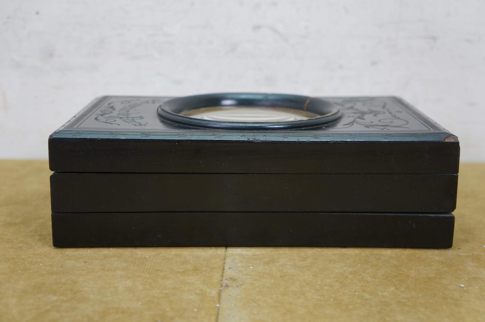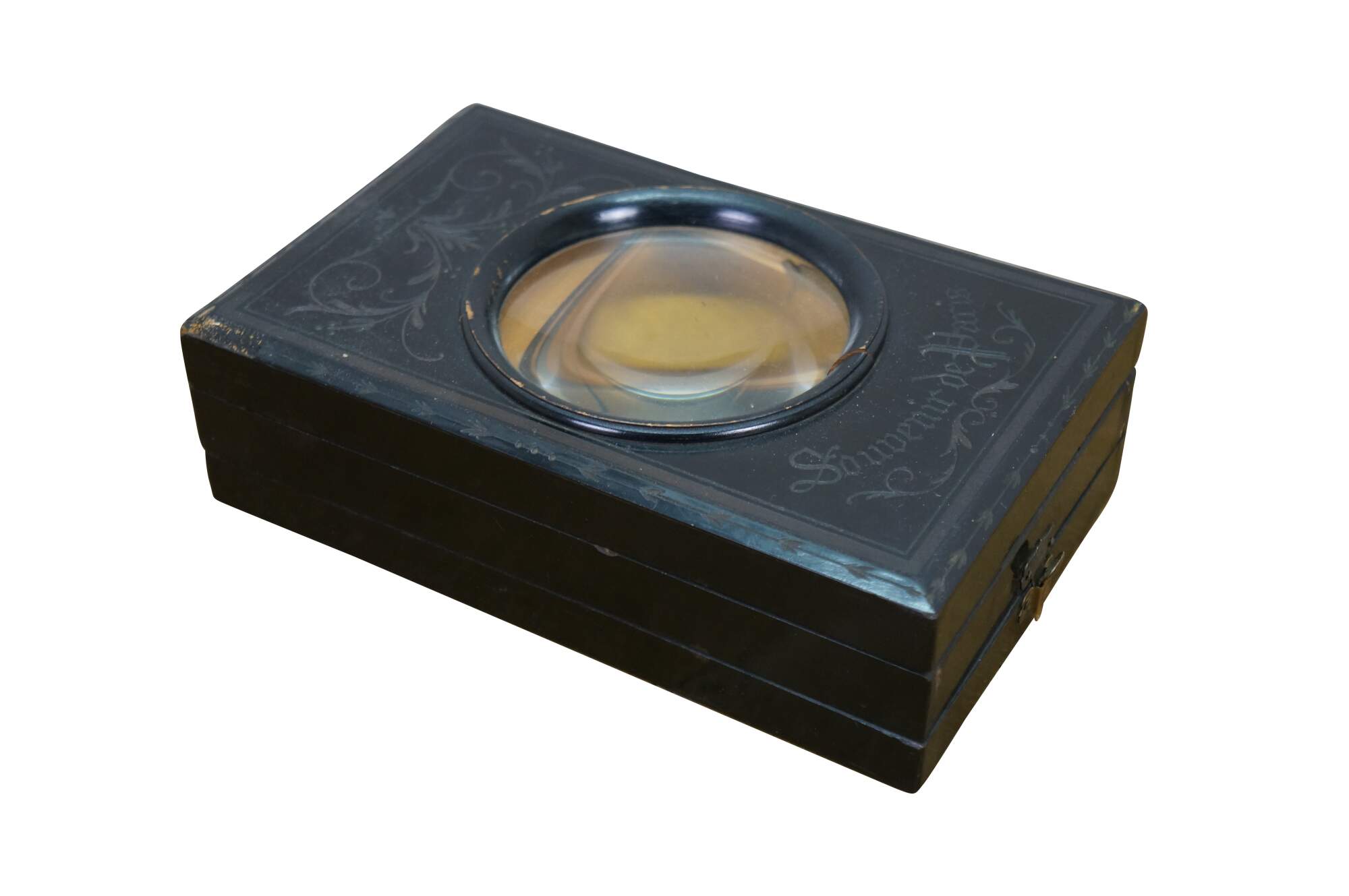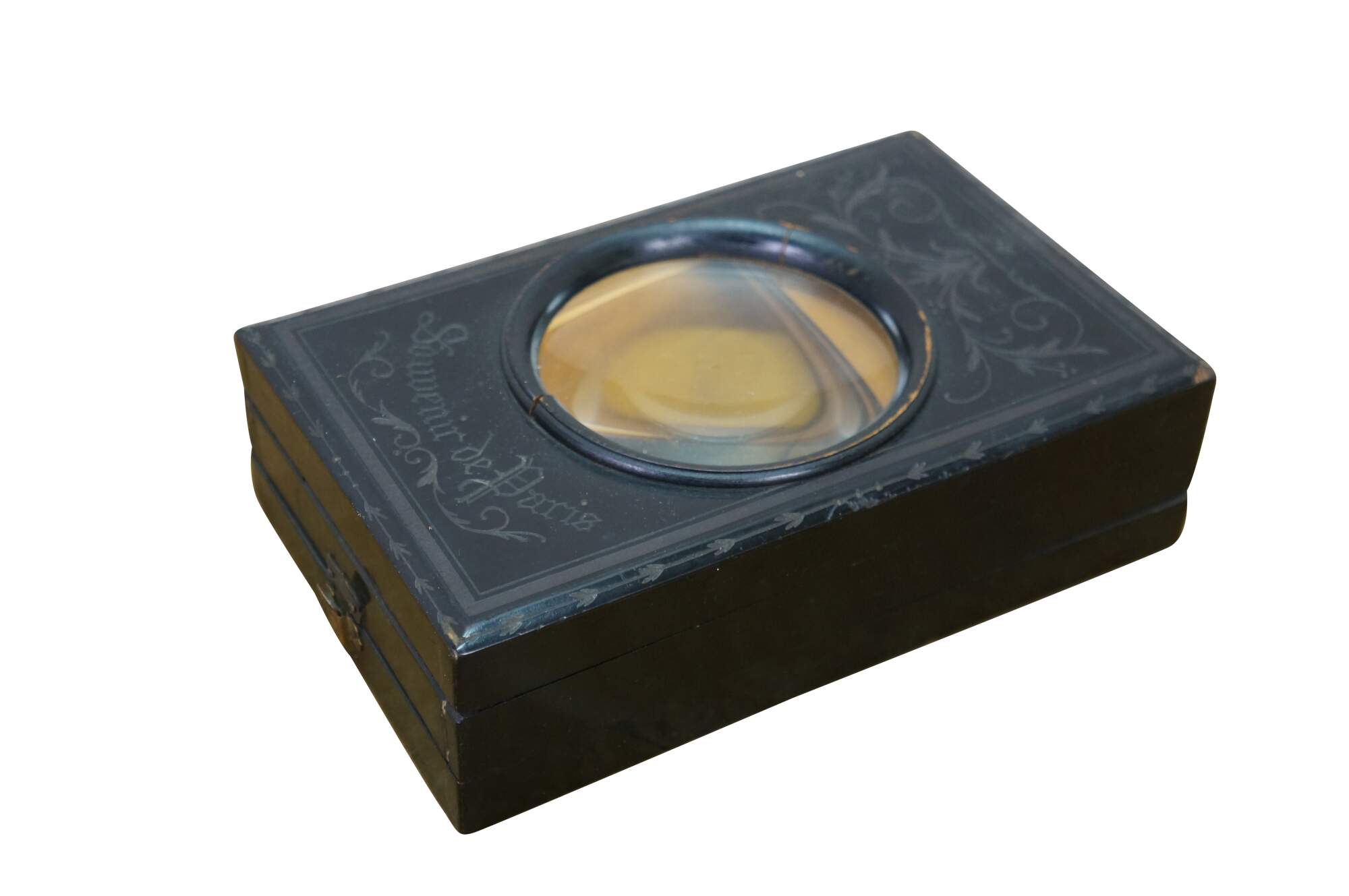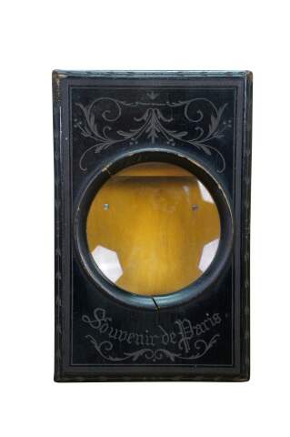 This exquisite Napoleon III period graphoscope is a beautifully crafted magnifying device from the mid-to-late 19th century, designed for viewing stereoscopic images and postcards with enhanced clarity. The black lacquered wood frame is adorned with delicate floral and ribbon motifs, showcasing the fine craftsmanship characteristic of the era. The graphoscope features a large central magnifying lens and an adjustable stand, which allows for easy viewing of images, such as the stereoscopic cards. Its foldable design with a compartment for storing cards adds both functionality and elegance, making this piece a fine example of 19th-century optical instruments and decorative art. Perfect for collectors of early photography or antique curiosities, this graphoscope combines both historical value and artistic appeal.