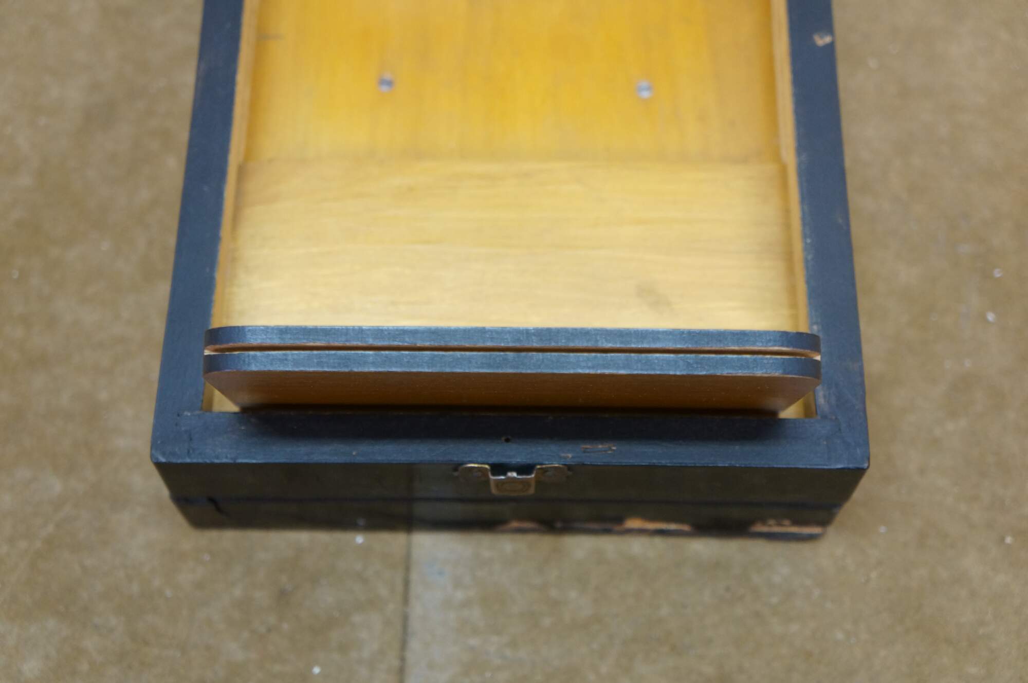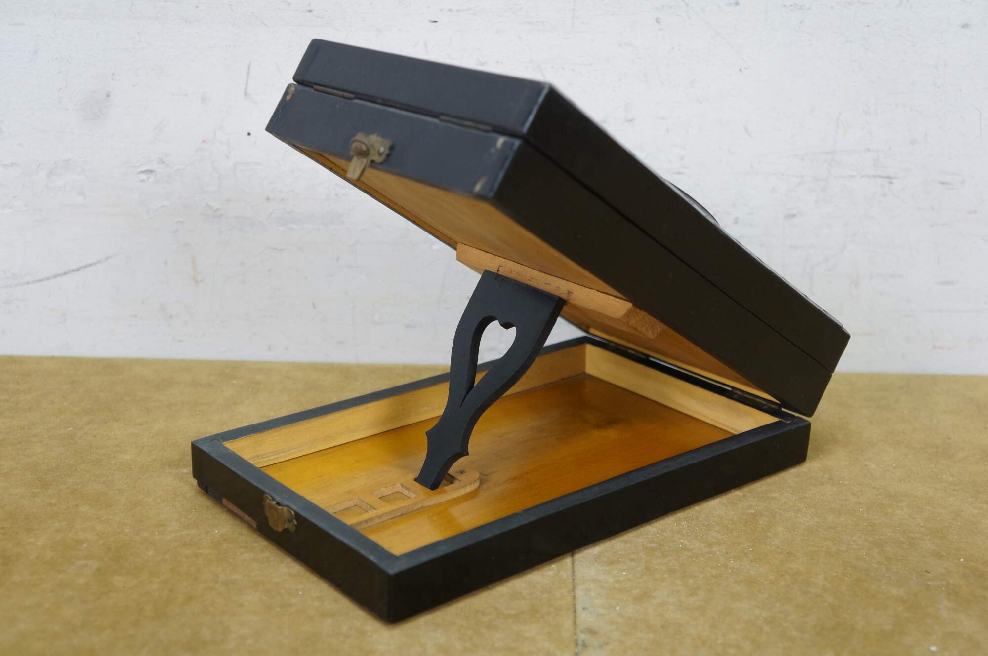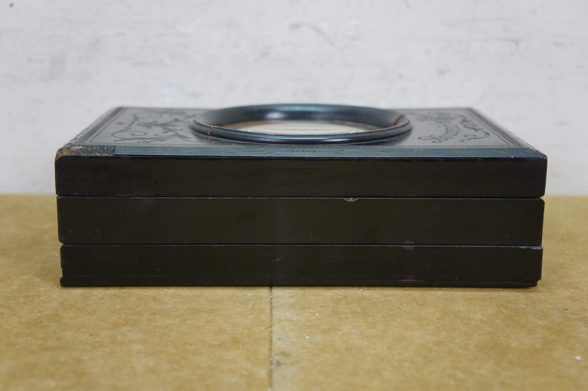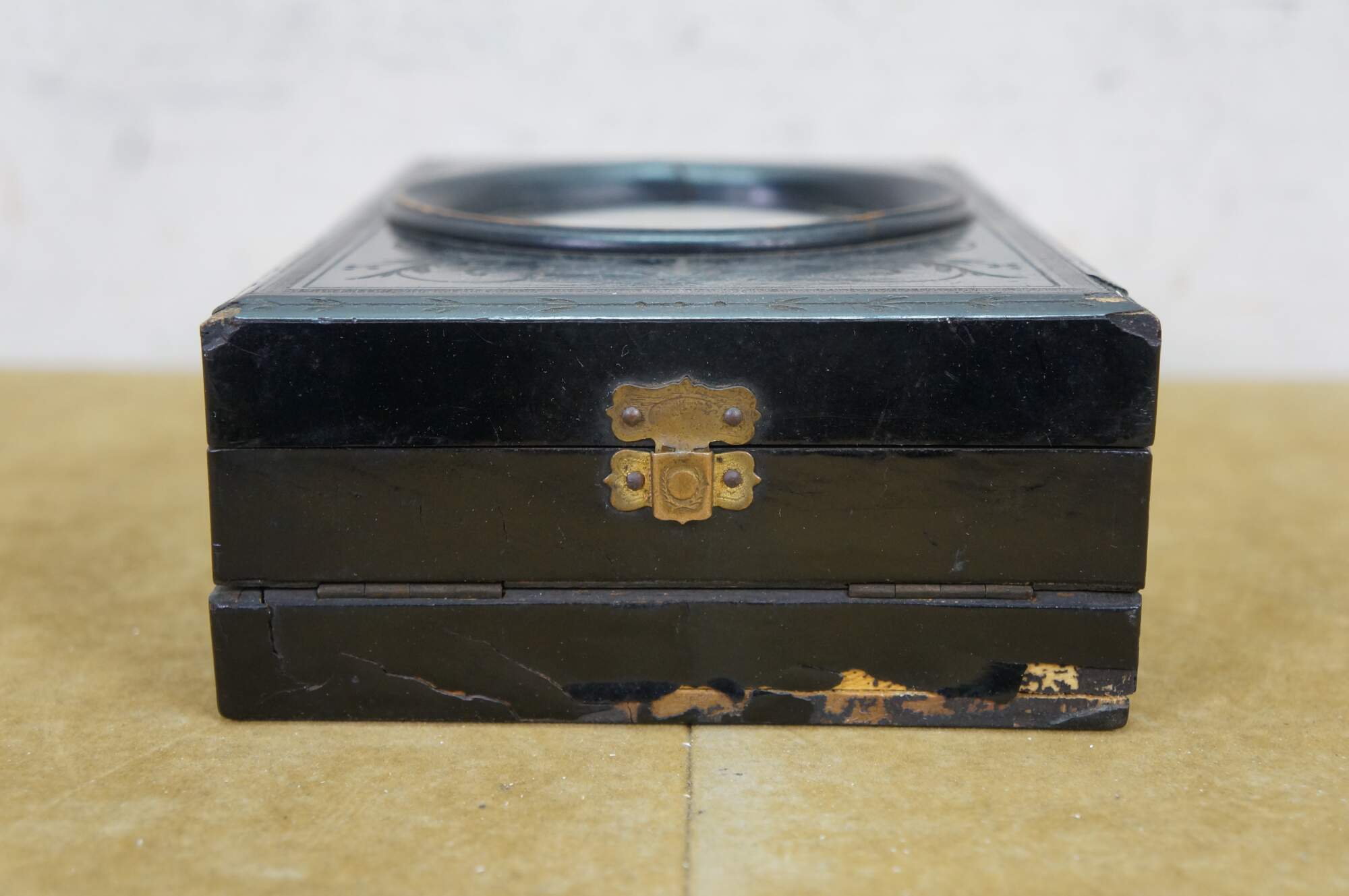 This exquisite Napoleon III period graphoscope is a beautifully crafted magnifying device from the mid-to-late 19th century, designed for viewing stereoscopic images and postcards with enhanced clarity. The black lacquered wood frame is adorned with delicate floral and ribbon motifs, showcasing the fine craftsmanship characteristic of the era. The graphoscope features a large central magnifying lens and an adjustable stand, which allows for easy viewing of images, such as the stereoscopic cards. Its foldable design with a compartment for storing cards adds both functionality and elegance, making this piece a fine example of 19th-century optical instruments and decorative art. Perfect for collectors of early photography or antique curiosities, this graphoscope combines both historical value and artistic appeal.