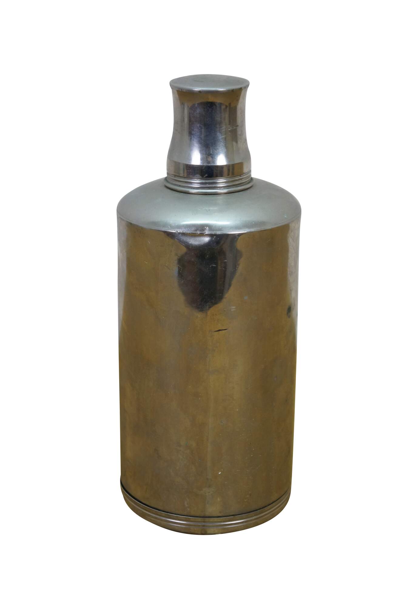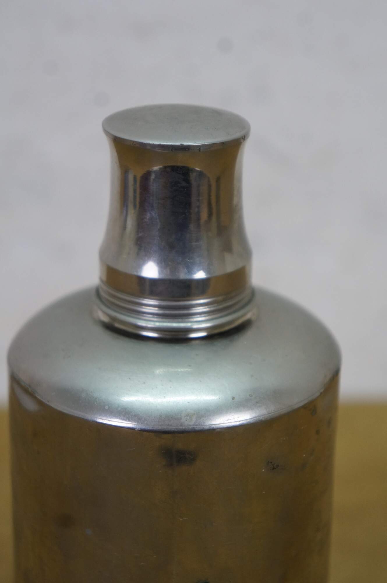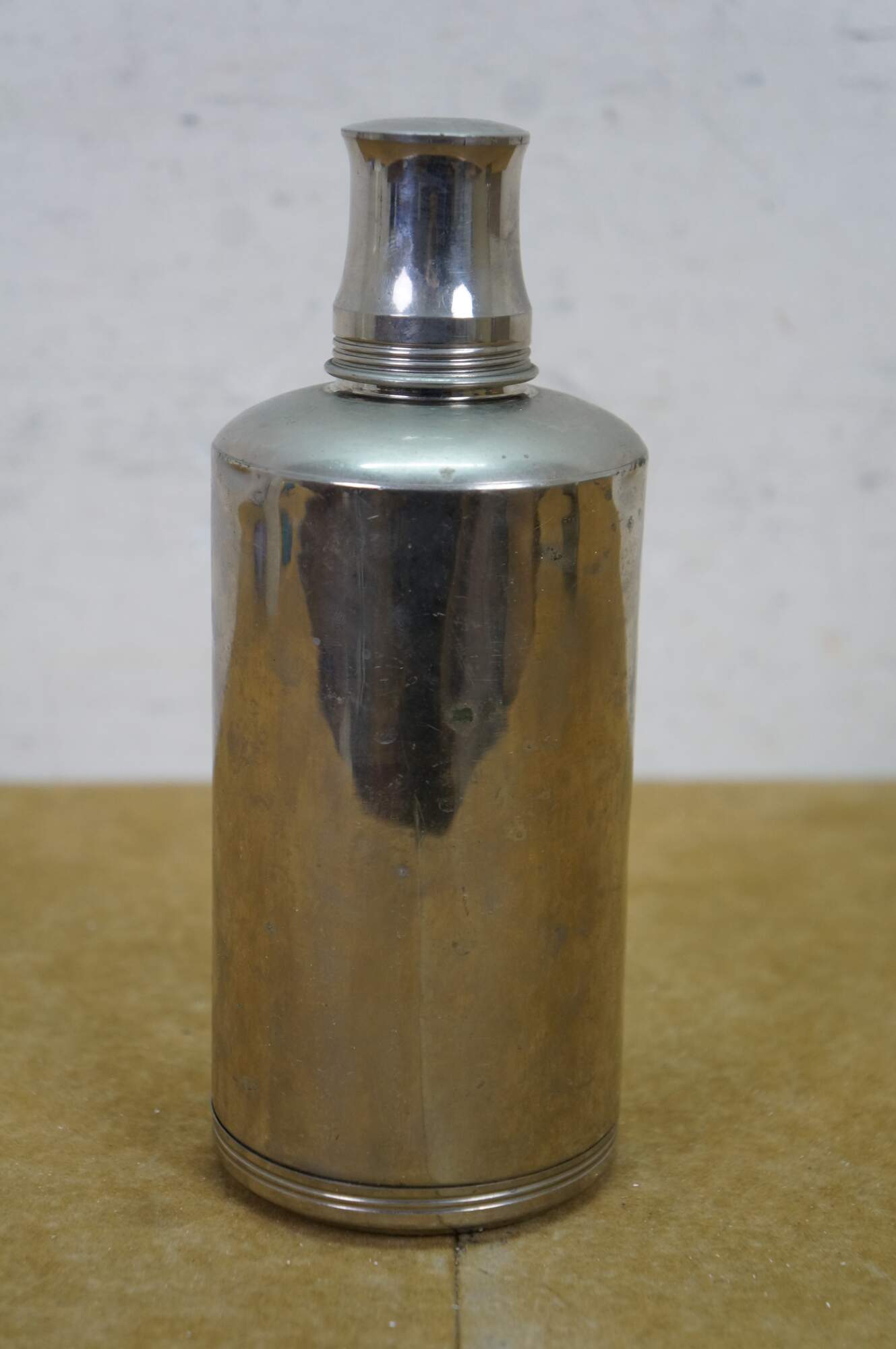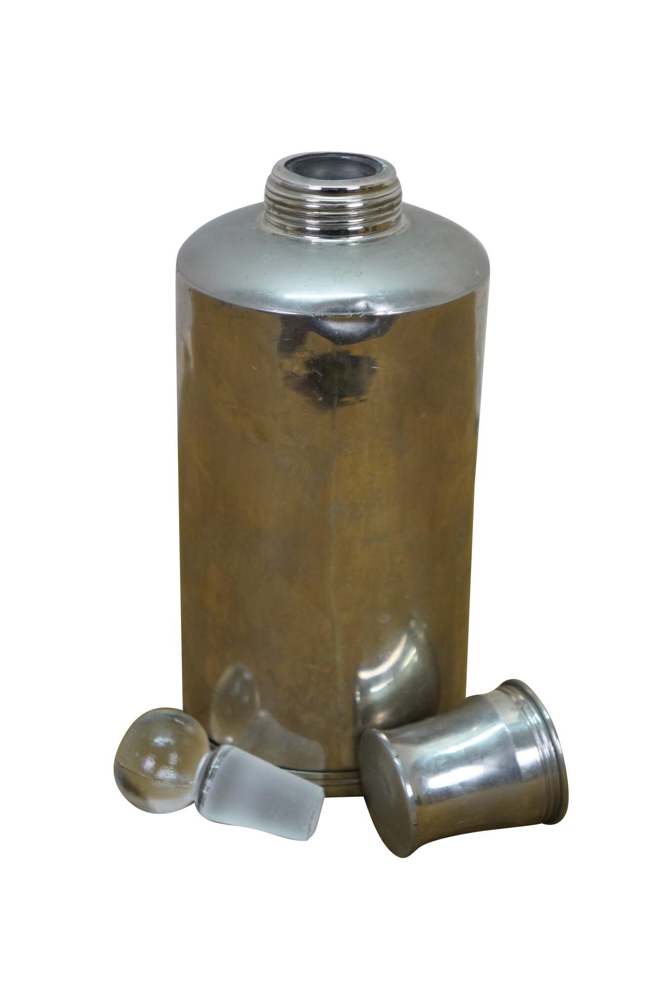 A unique early 20th Century silver plate liquor flask. Features a glass ground stopper and screw on lid / shot glass. Great for use on the go or display at your bar.