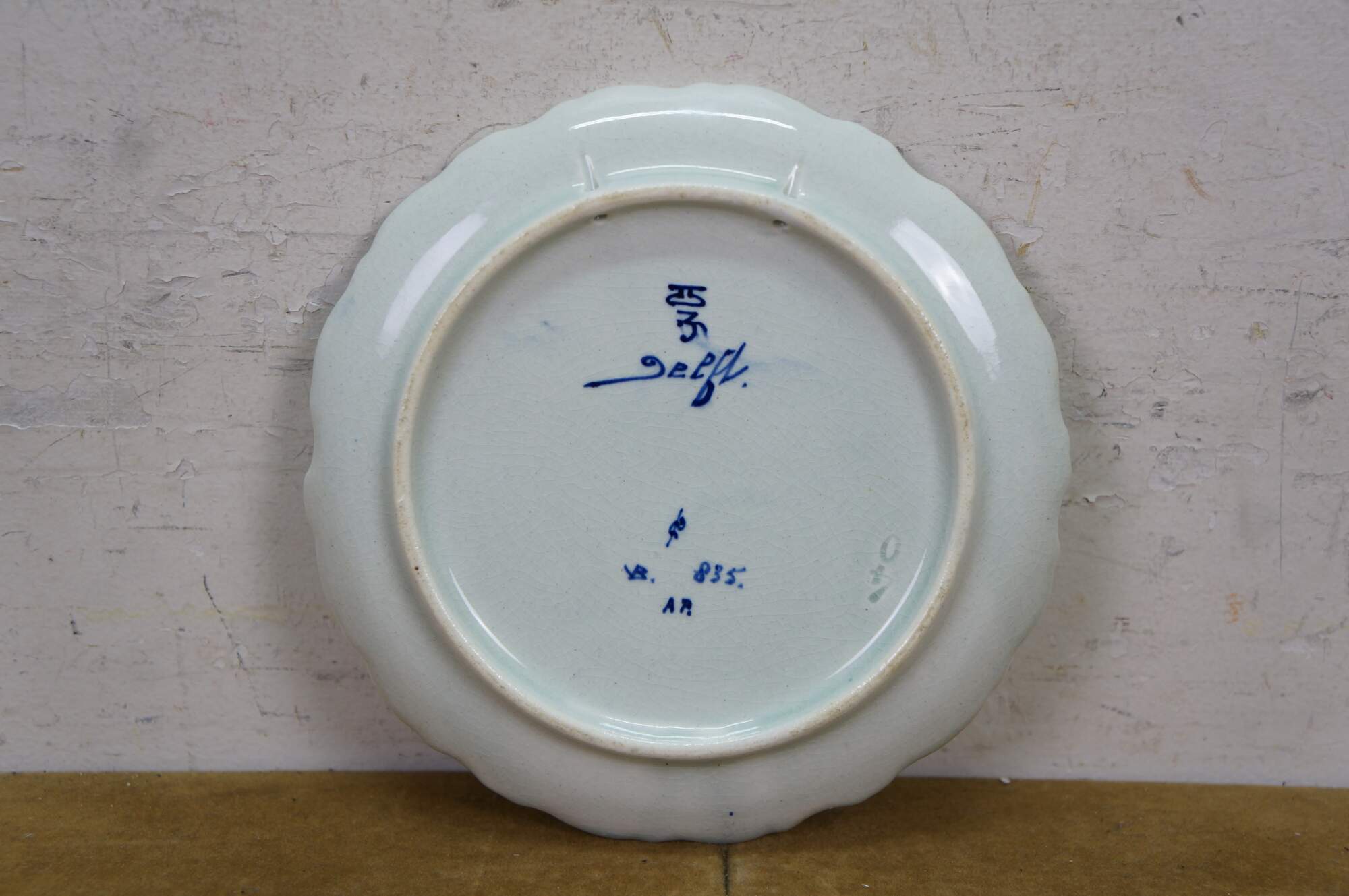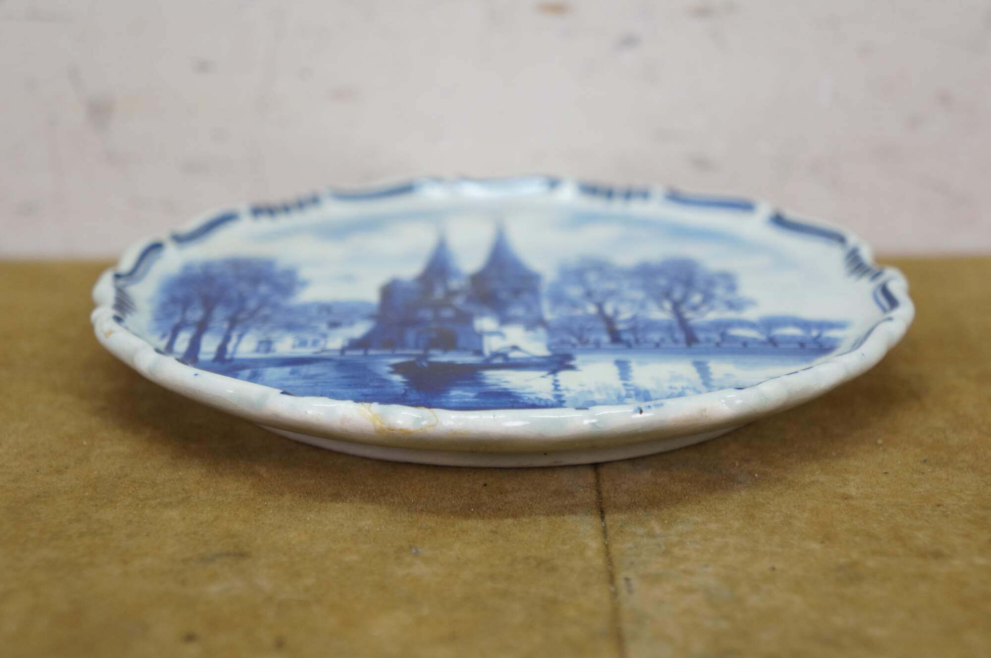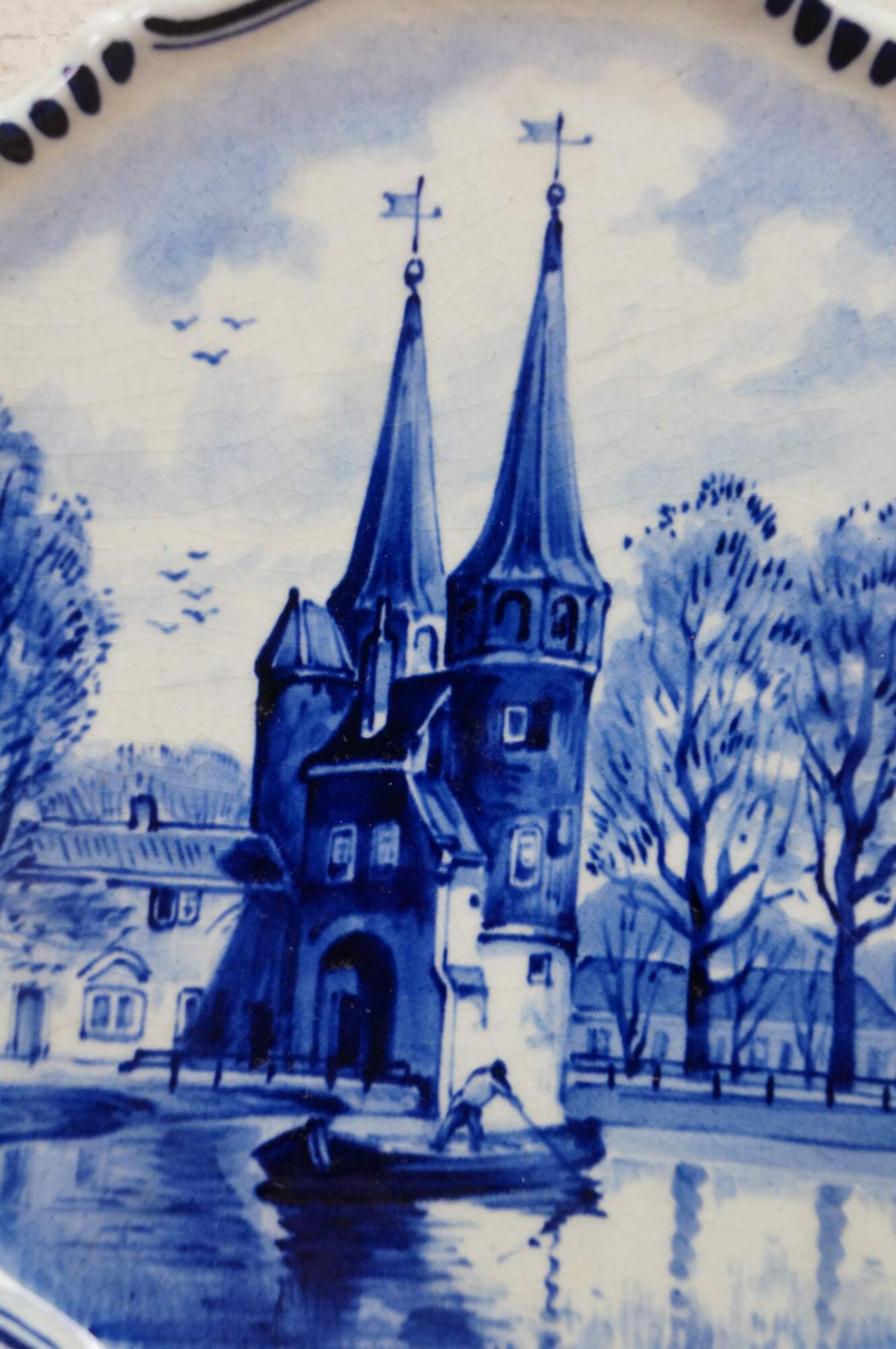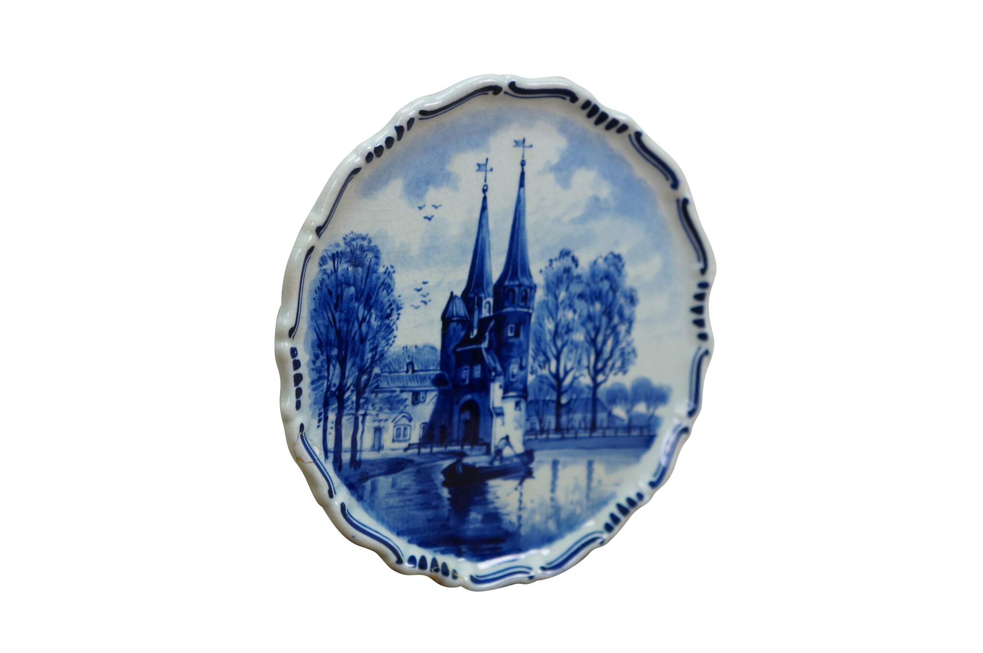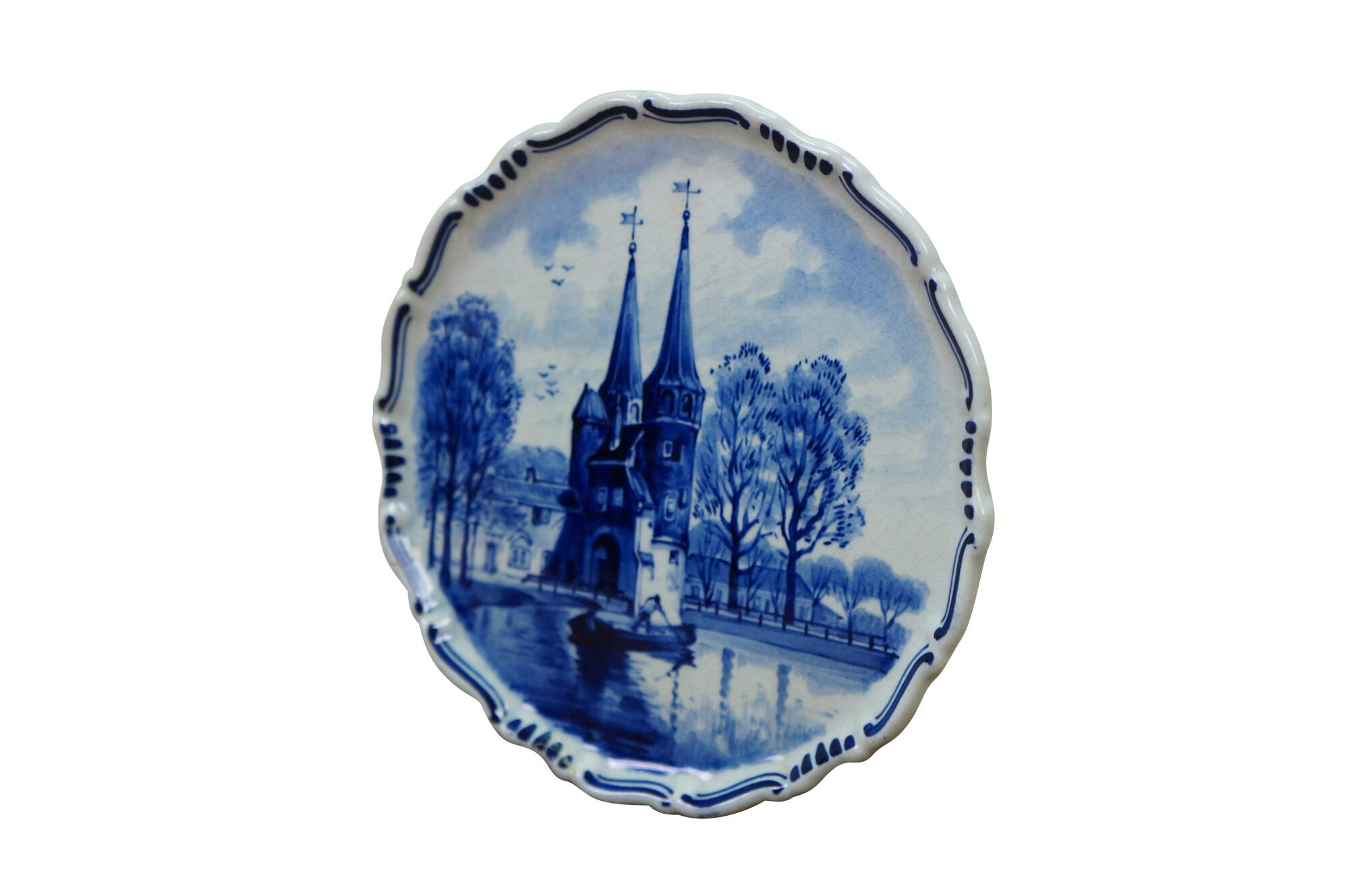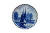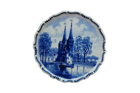 An early 20th Hand Painted Delft Wall Hanging Plate. Features a river scene in Delft, South Hollands showcasing the Oostpoort. The Oostpoort is a historic 15th-century fortified city gate built in the Brick Gothic style. Located at the eastern end of the old town, it is a prominent, photogenic landmark featuring two towers and an old bridge. It is part of the former defense system. The plate is blue and white with a scalloped edge. It is signed along the back side and dates to 1922.