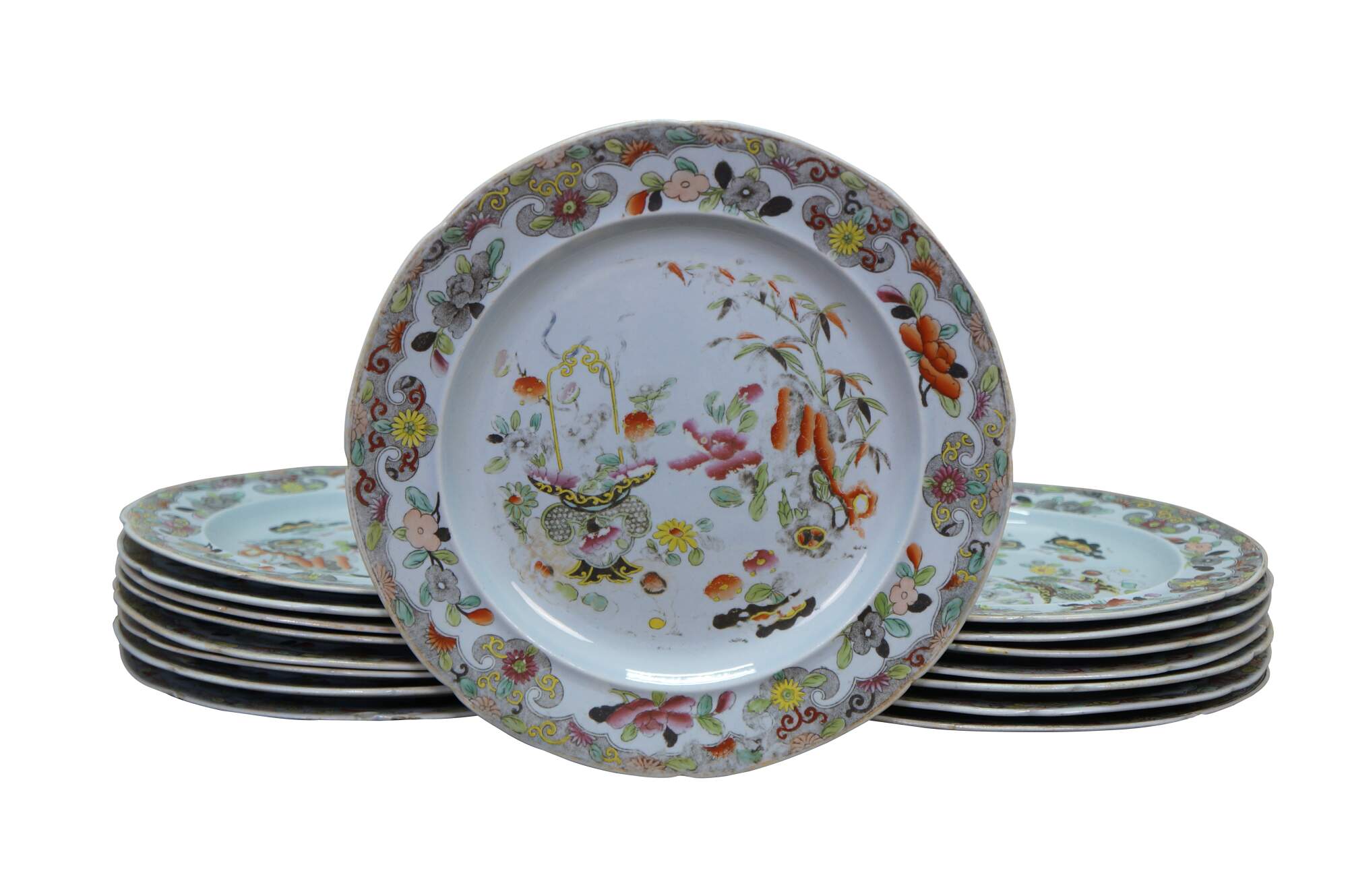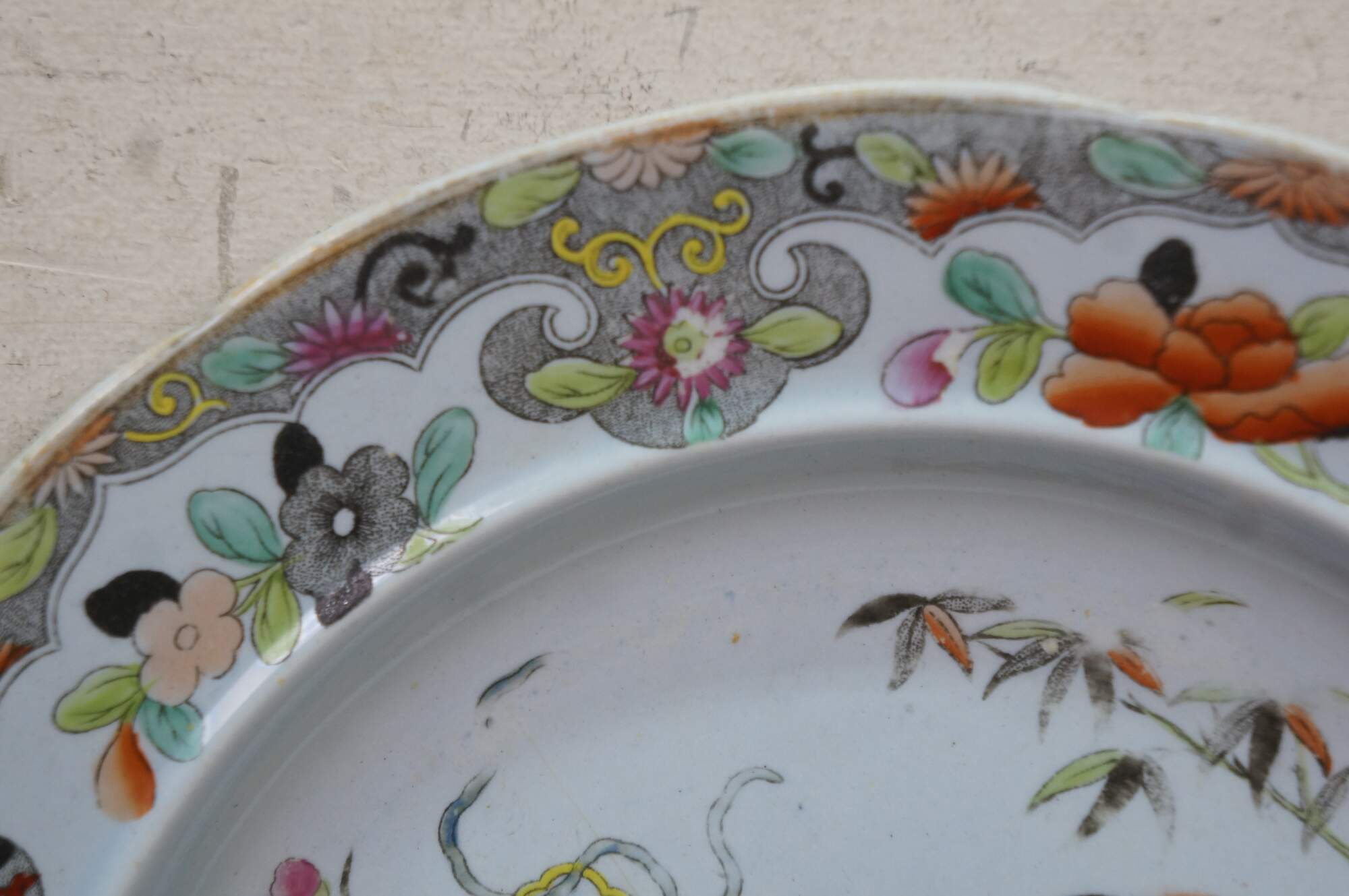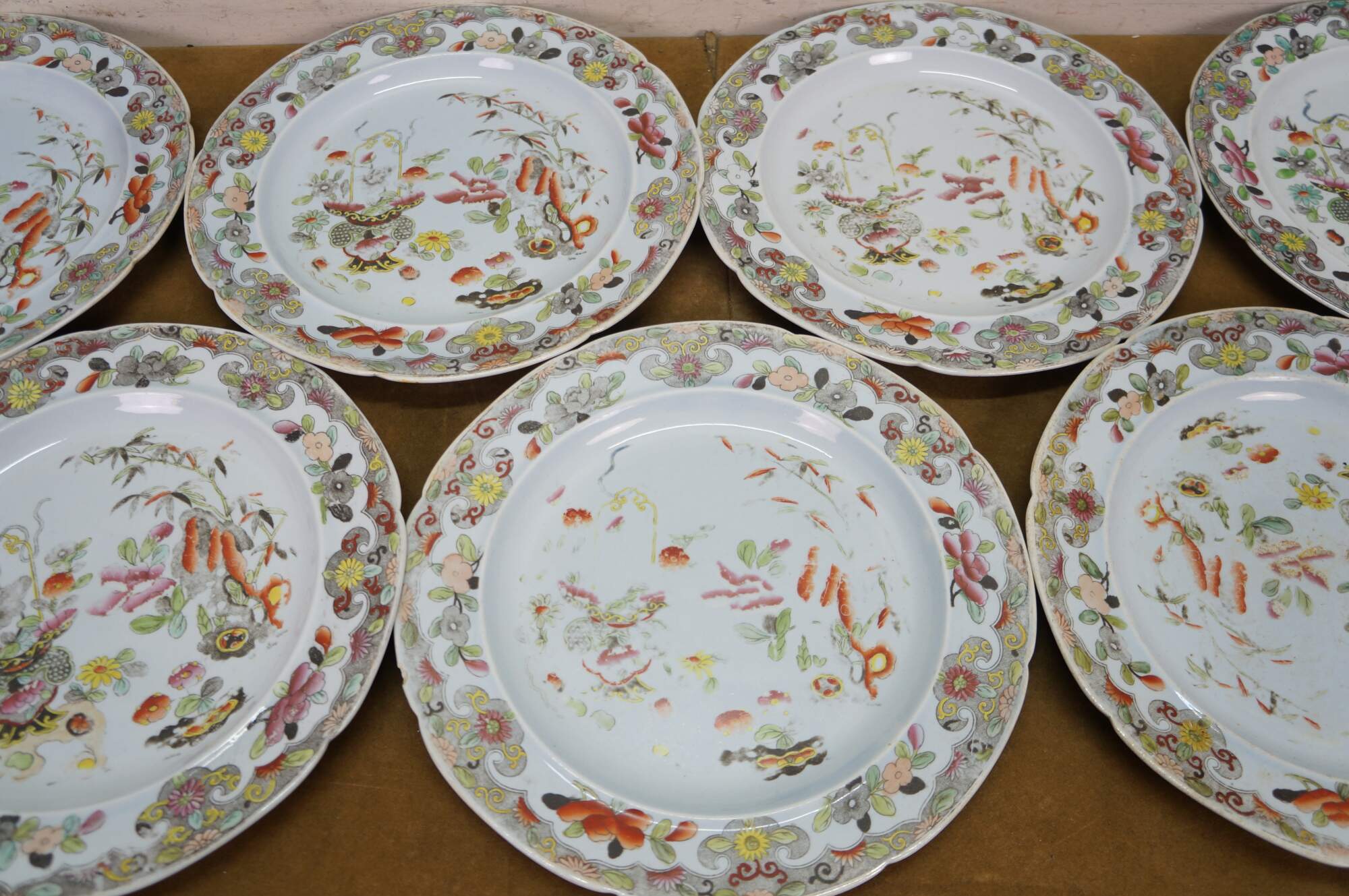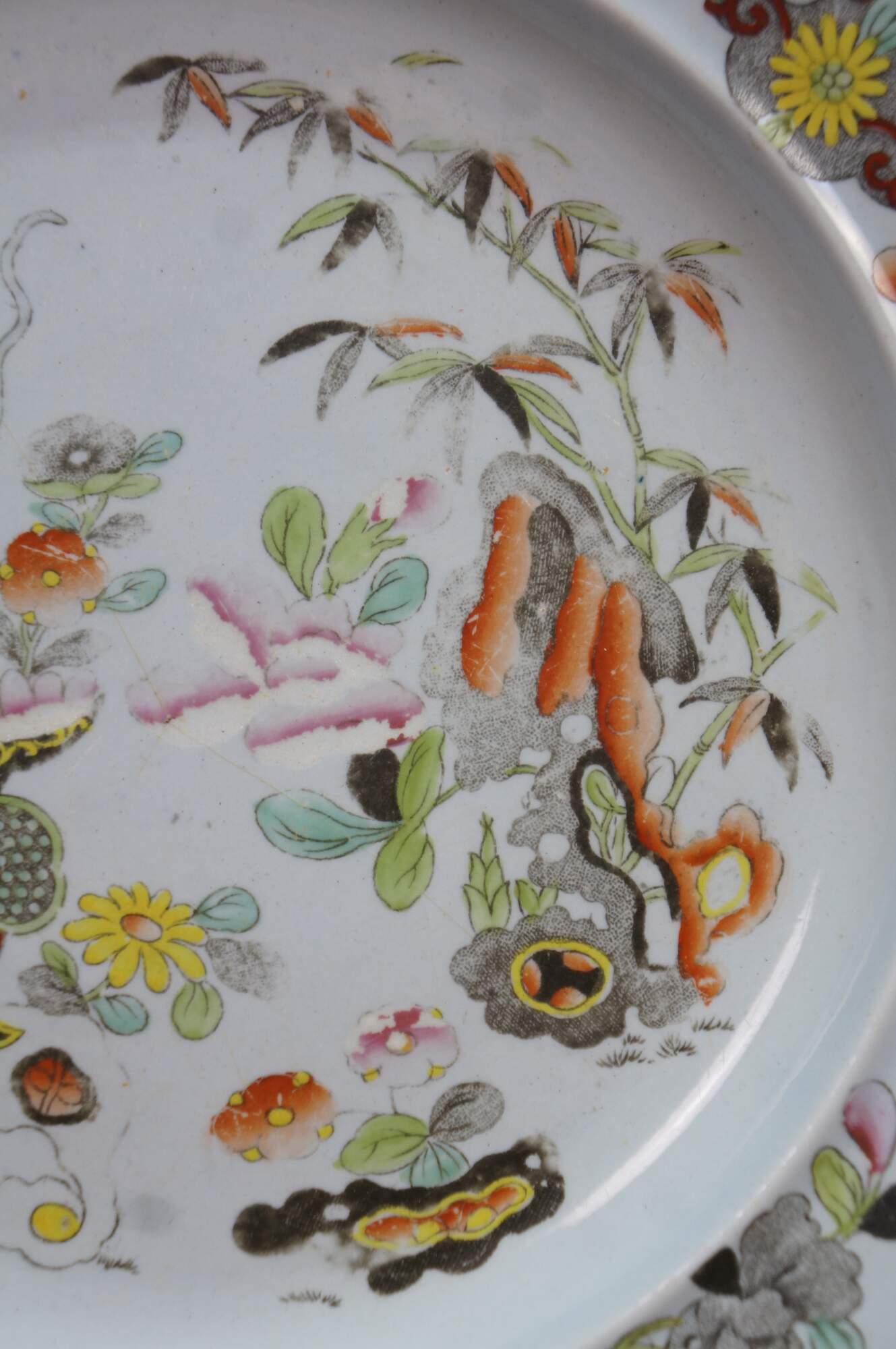 16 antique English Stephen Folch Chinoiserie Serving platters / trays in the Ironstone Imari style Bamboo & Basket pattern with Royal Arms mark, Circa 1825