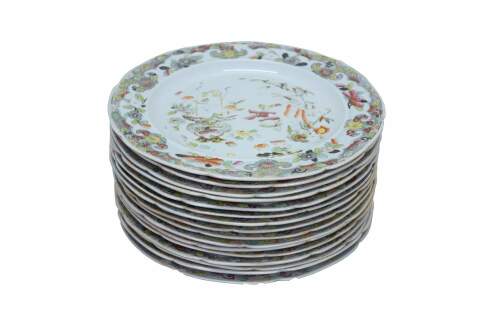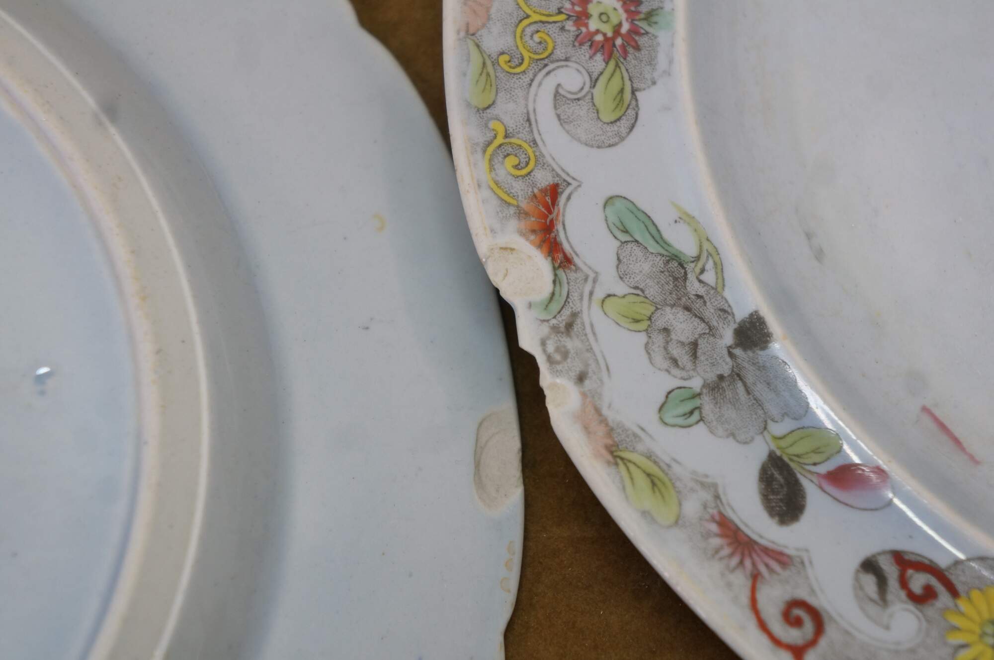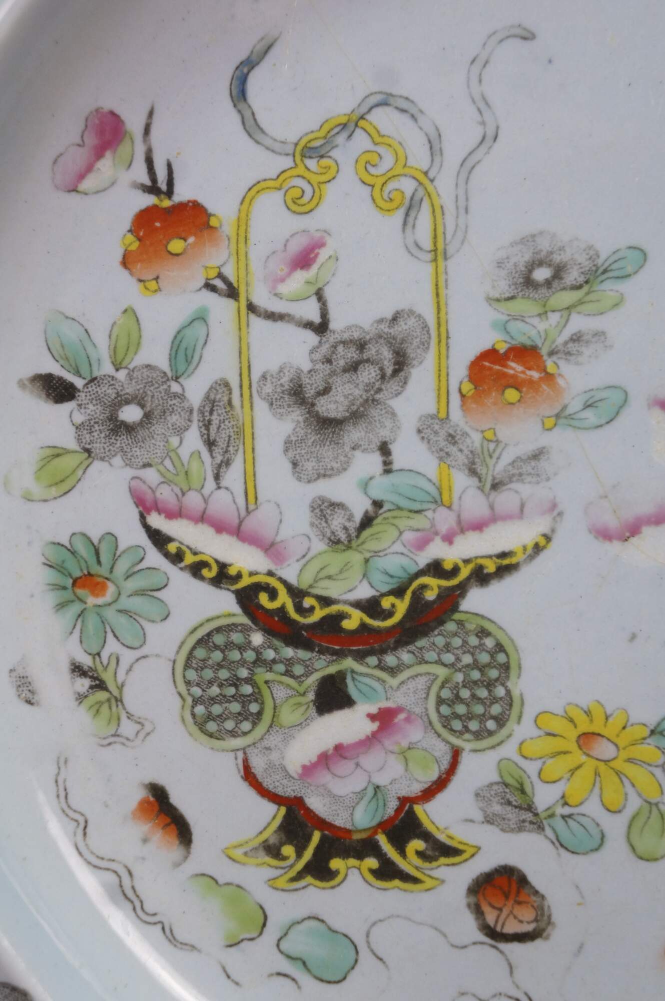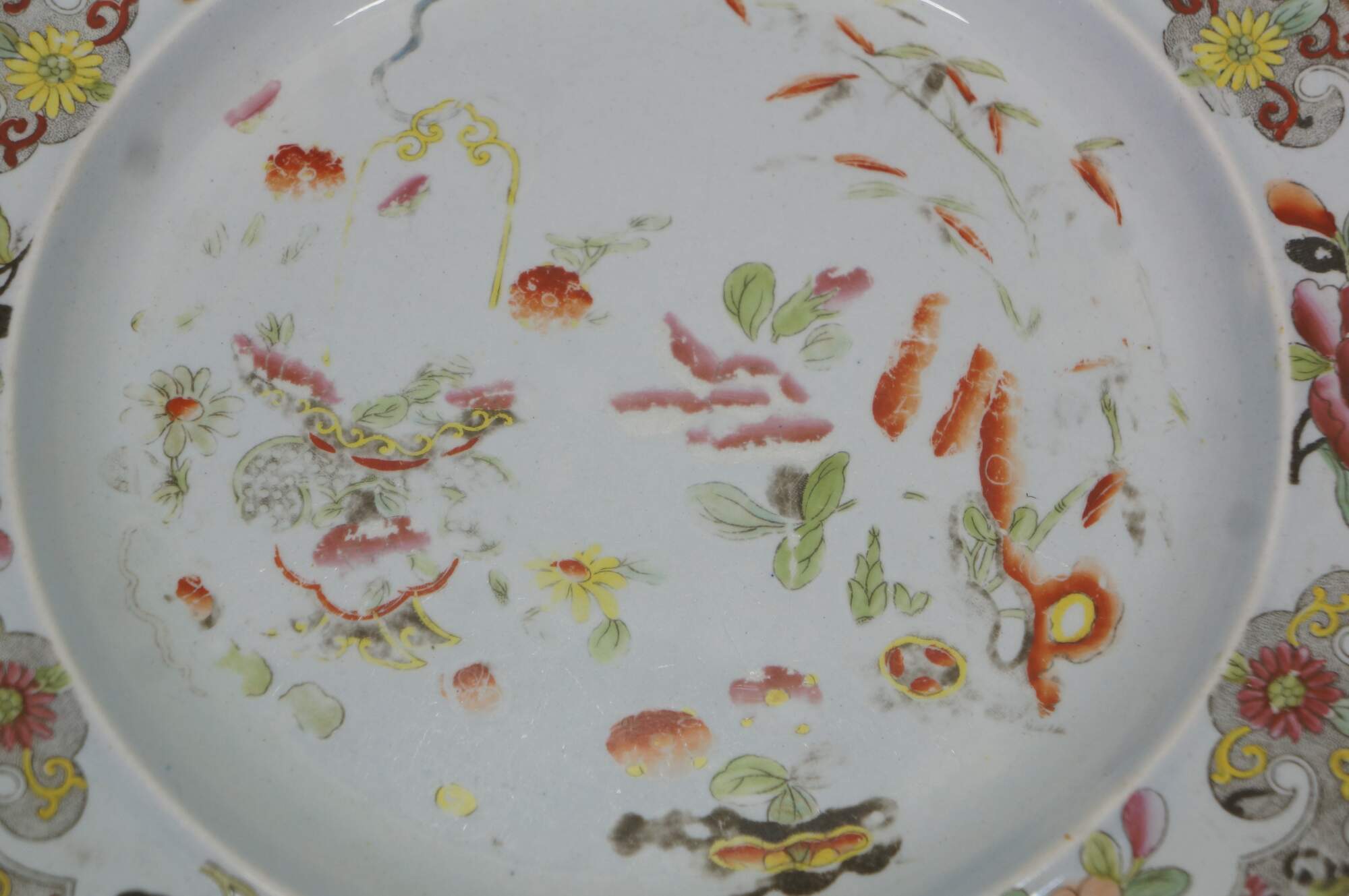 16 antique English Stephen Folch Chinoiserie Serving platters / trays in the Ironstone Imari style Bamboo & Basket pattern with Royal Arms mark, Circa 1825