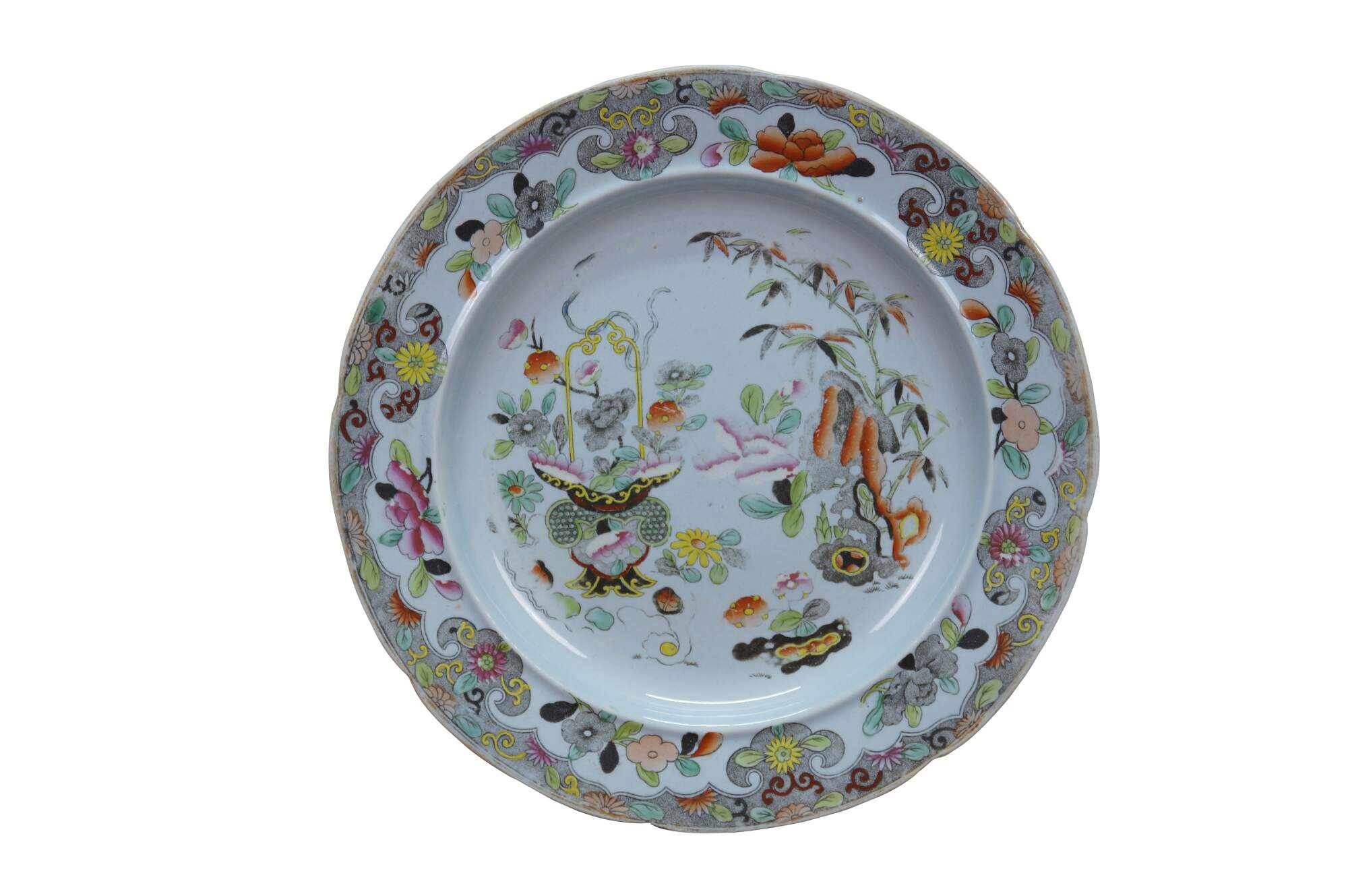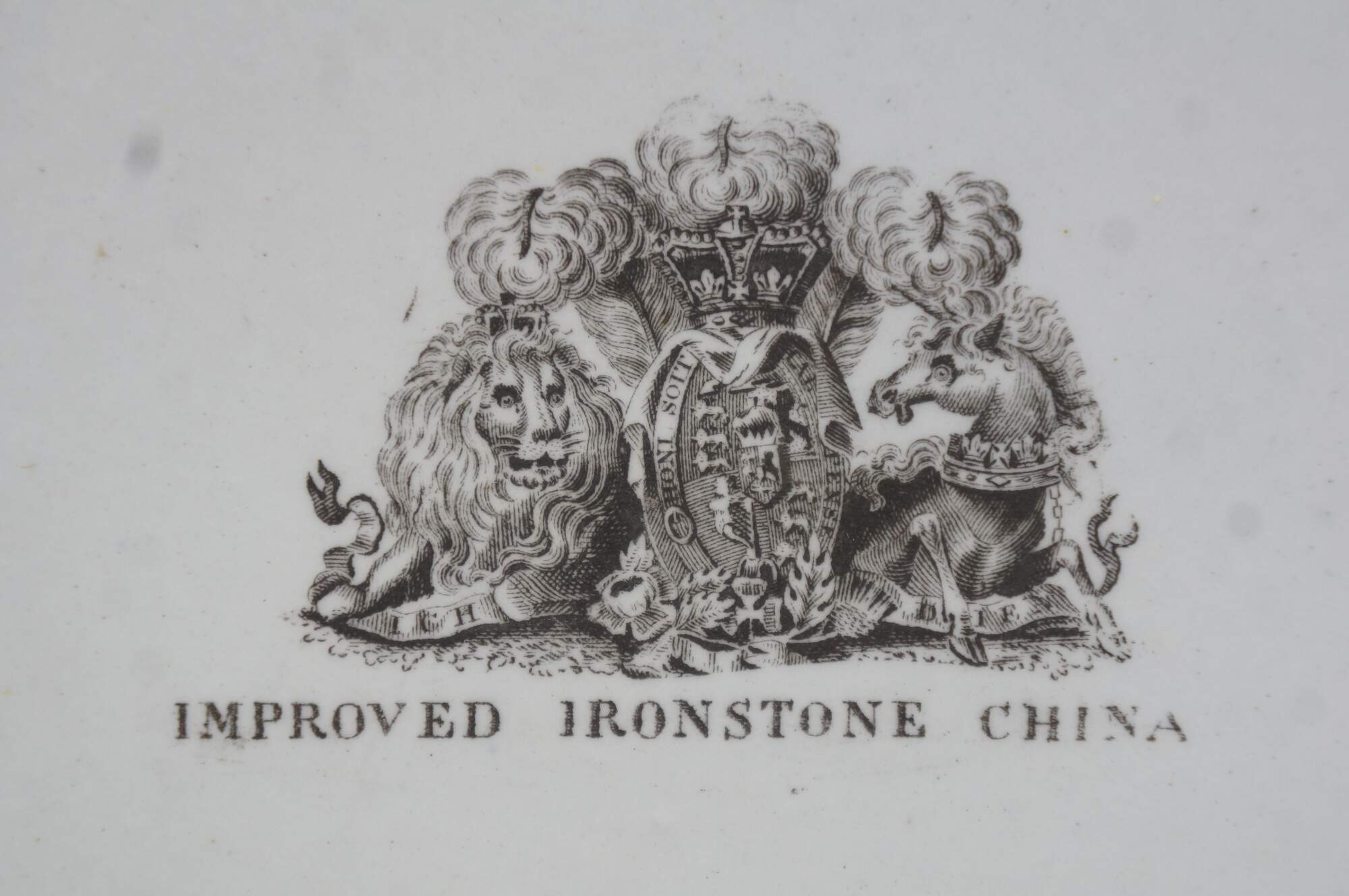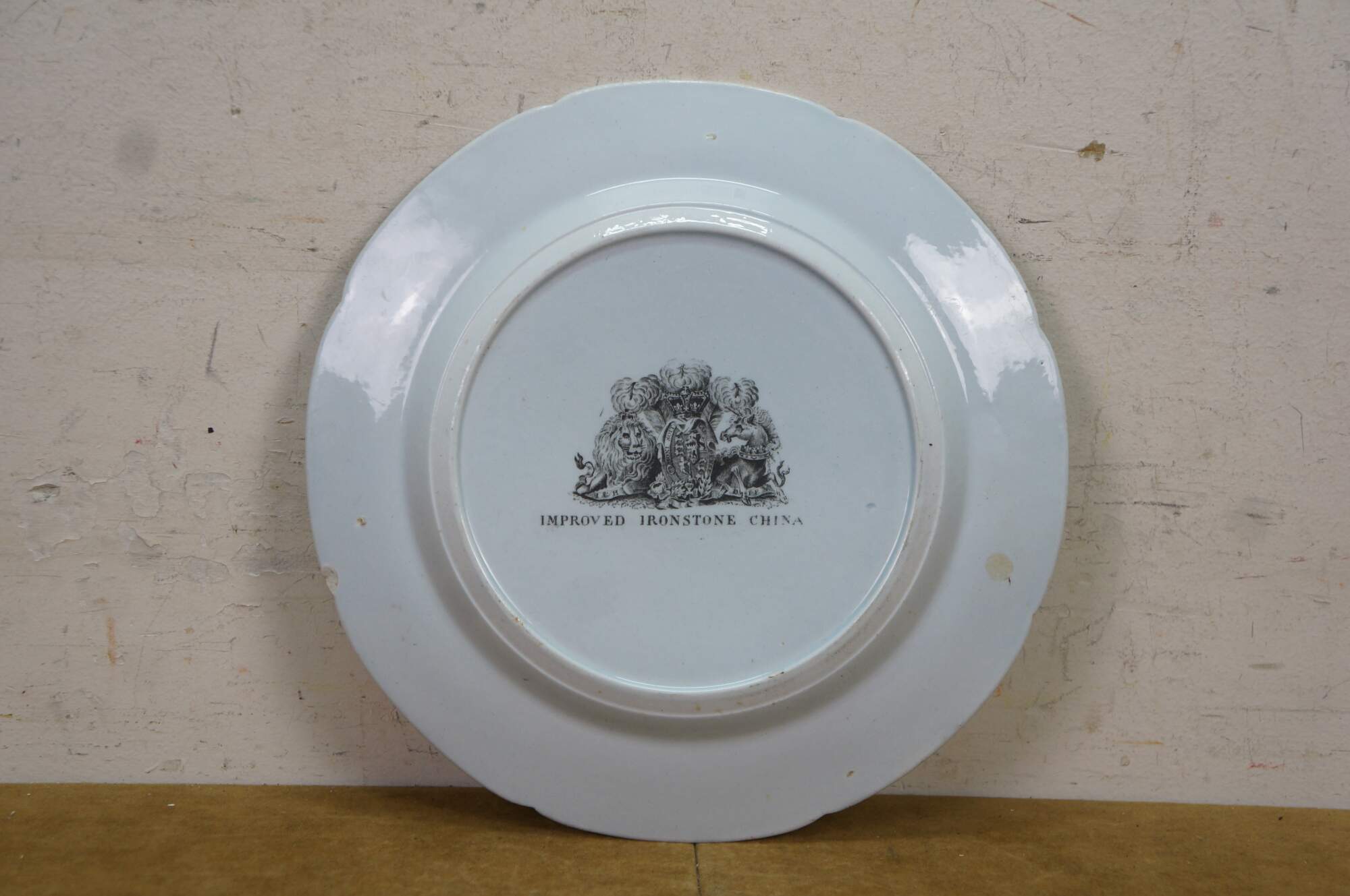 The plate is fully marked on the base with a Royal Arms mark having the Prince of Wales feathers behind and improved ironstone China below, all printed in black. A Plate in this pattern with the same back mark is illustrated on Page 243, plates 186 a & b, of Godden's Guide to Ironstone, by Geoffrey A Godden, published by The Antique Collectors' Club.