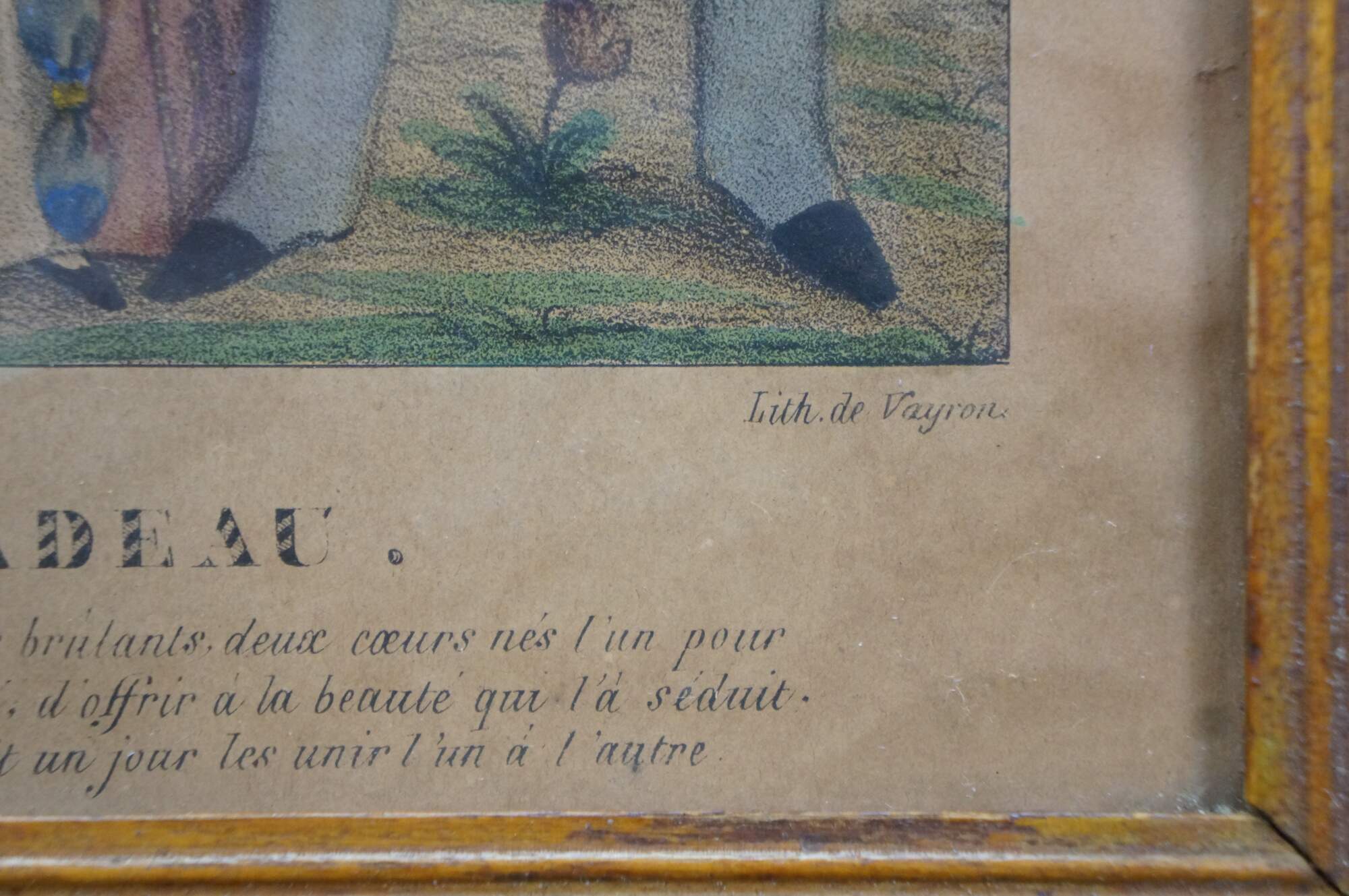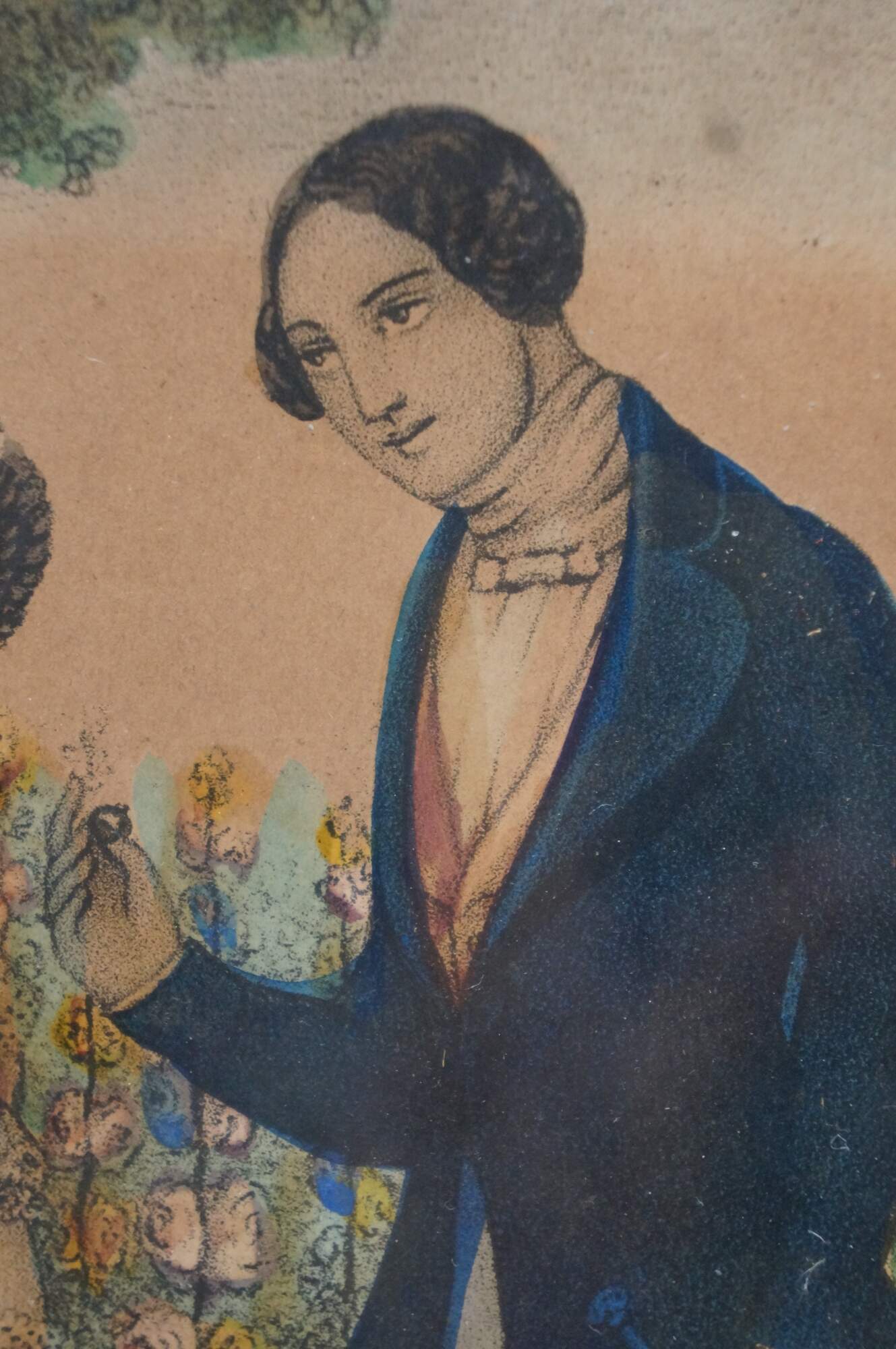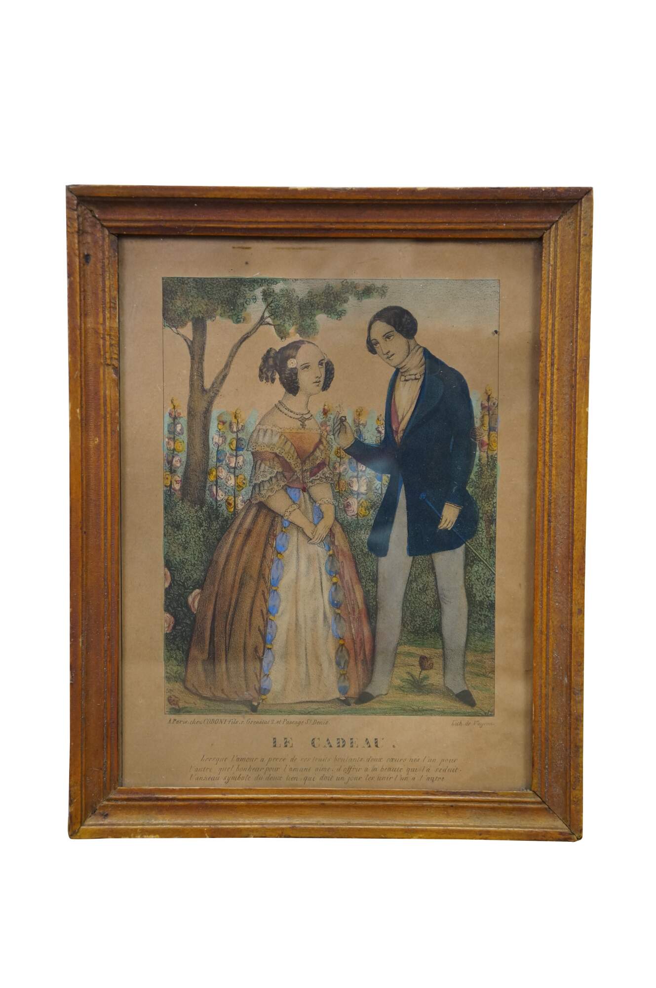 Mid 19th Century Hand Colored Lithograph. Titled Le Cadeau which translated to gift. The artwork shows a well dressed couple in a park surrounded by flowers. The man is proposing to the woman and presenting a ring in his right hand. This lithograph comes from a prominent printing house Led by François-Benjamin Vayron.