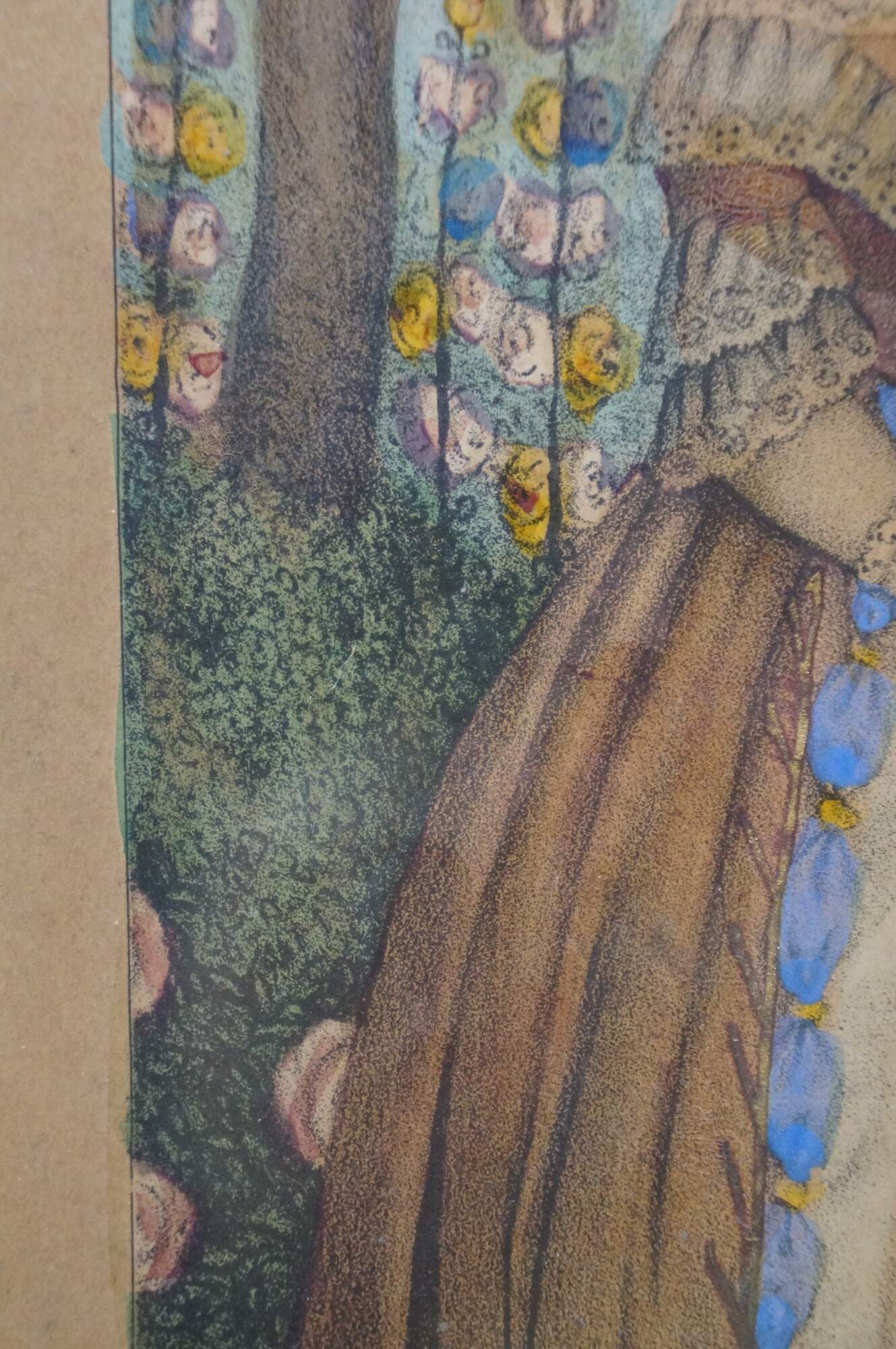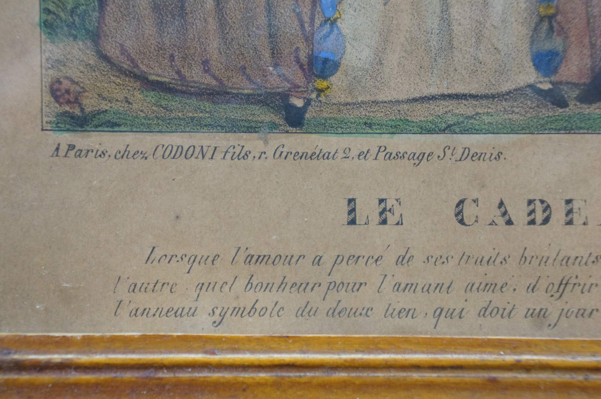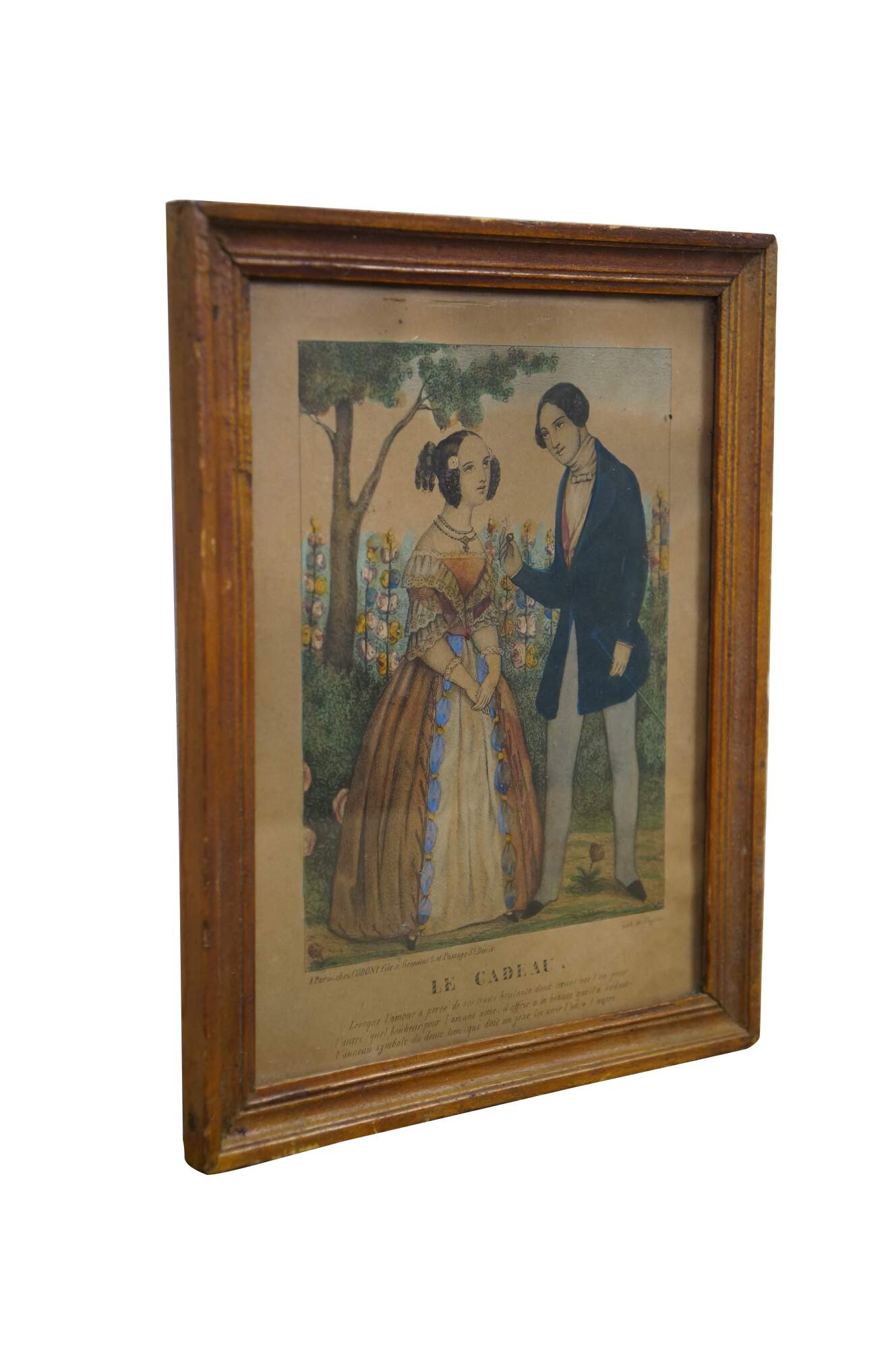 Mid 19th Century Hand Colored Lithograph. Titled Le Cadeau which translated to gift. The artwork shows a well dressed couple in a park surrounded by flowers. The man is proposing to the woman and presenting a ring in his right hand. This lithograph comes from a prominent printing house Led by François-Benjamin Vayron.