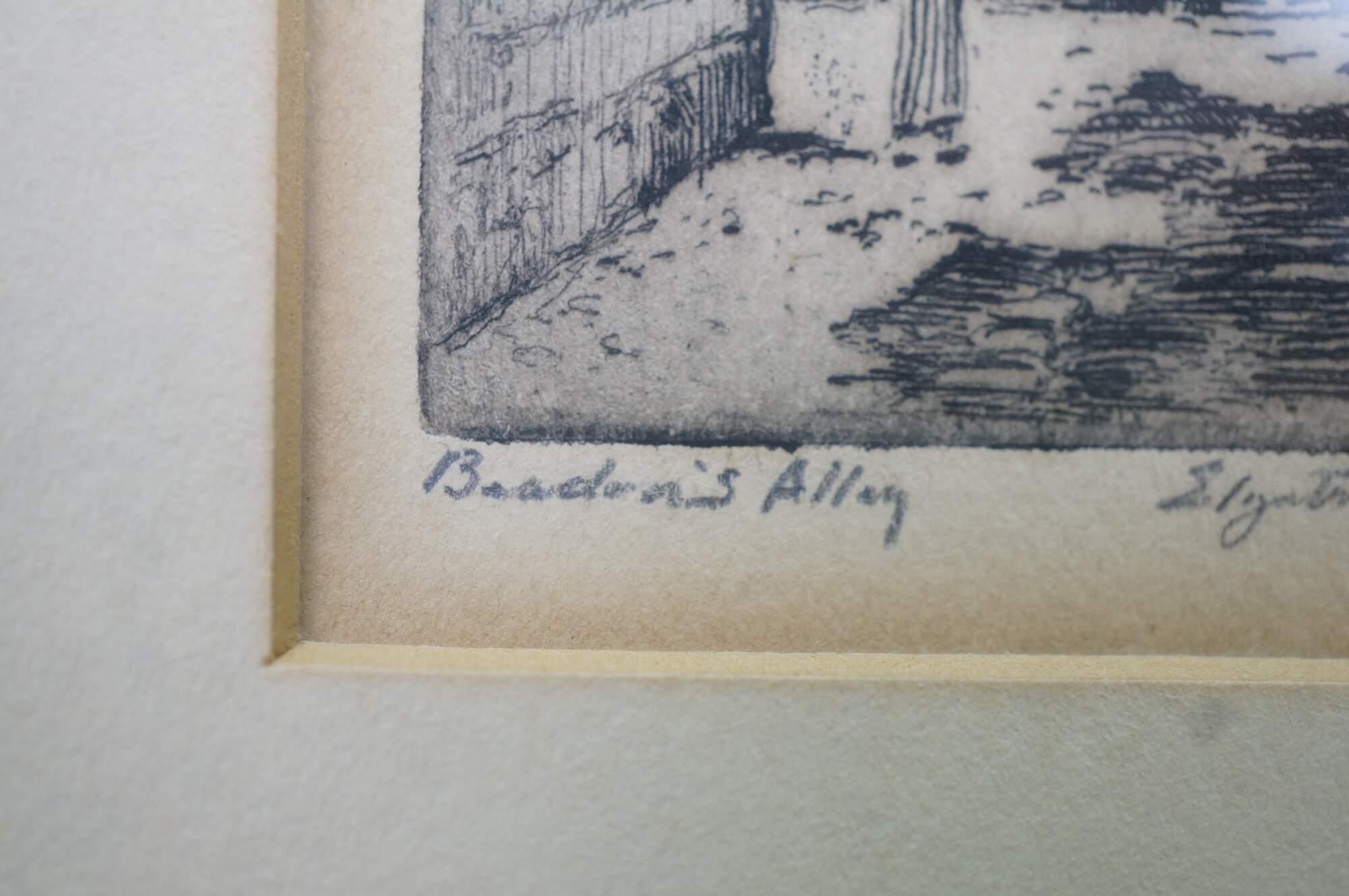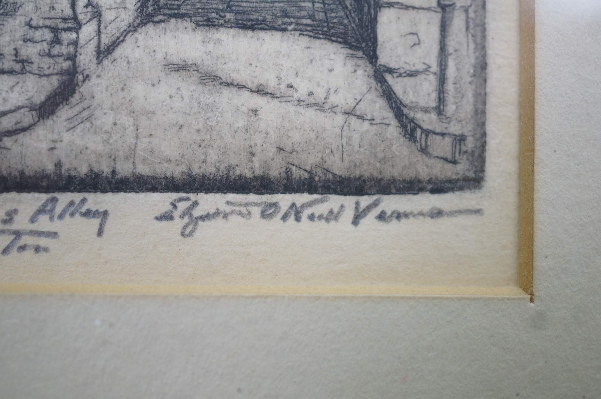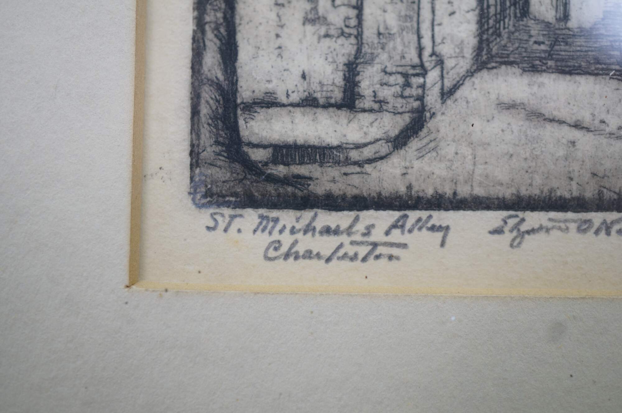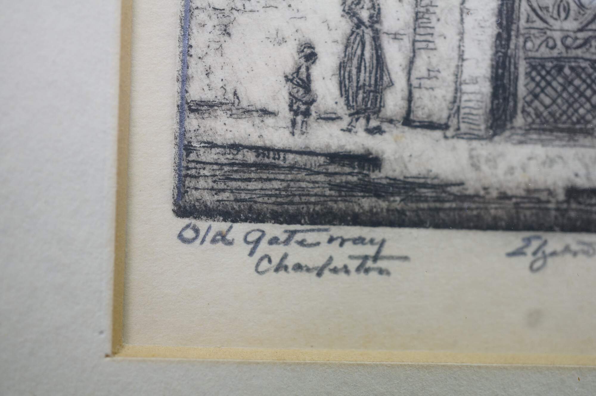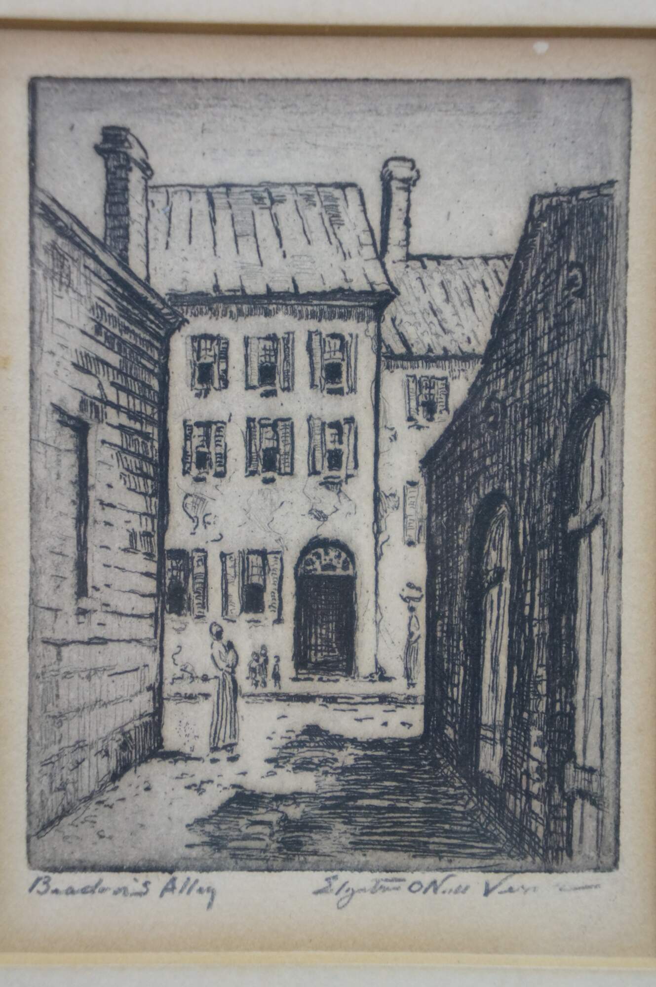 4 Rare Antique Elizabeth O'Neill Verner Miniature Etchings. Features St. Michaels Alley, Old Gateway, In Old Charleston and Beadons Alley. Each etching is hand signed and preserved under glass.