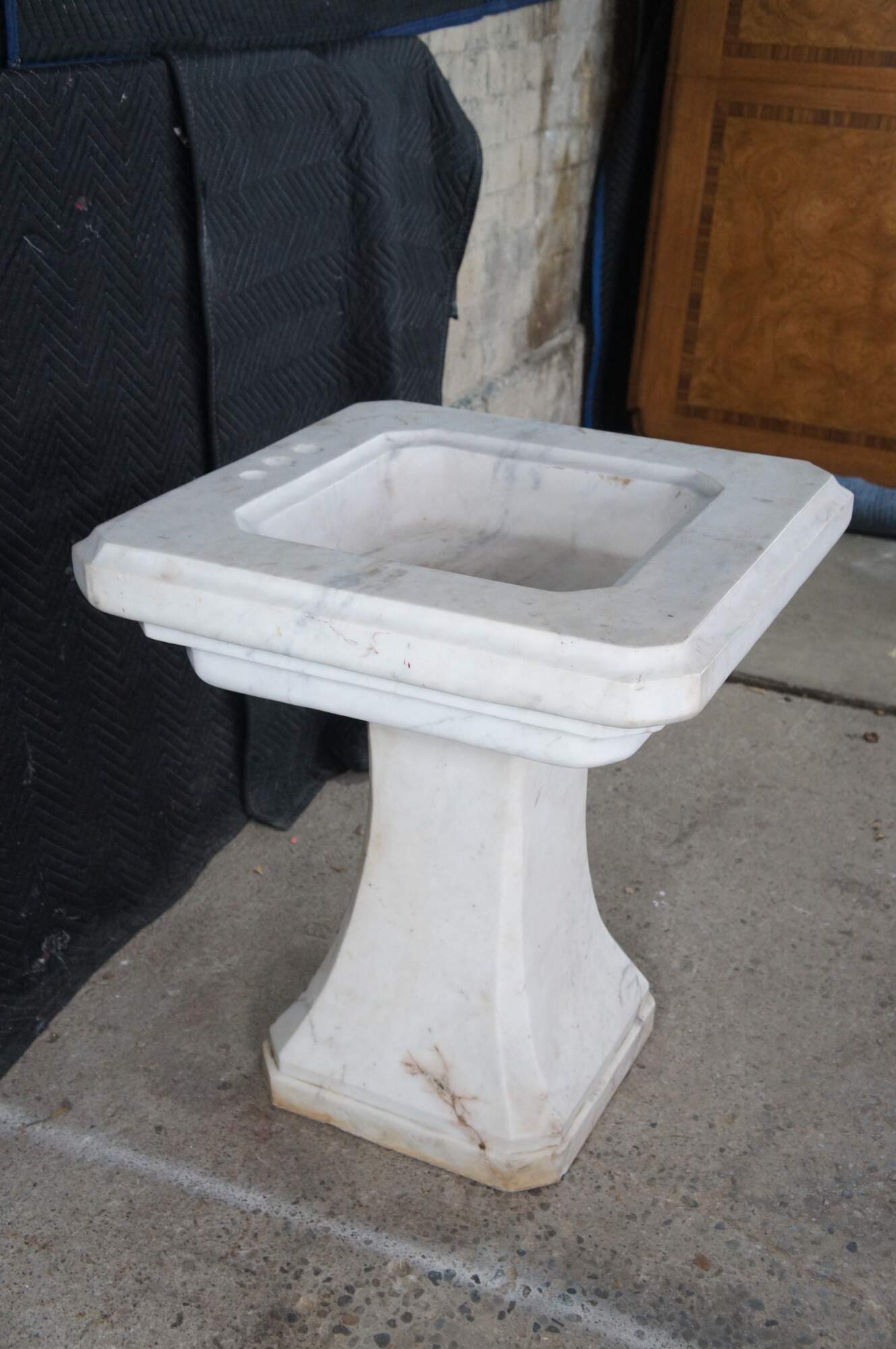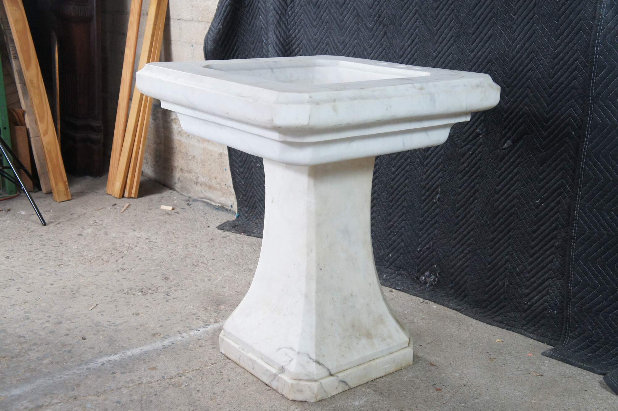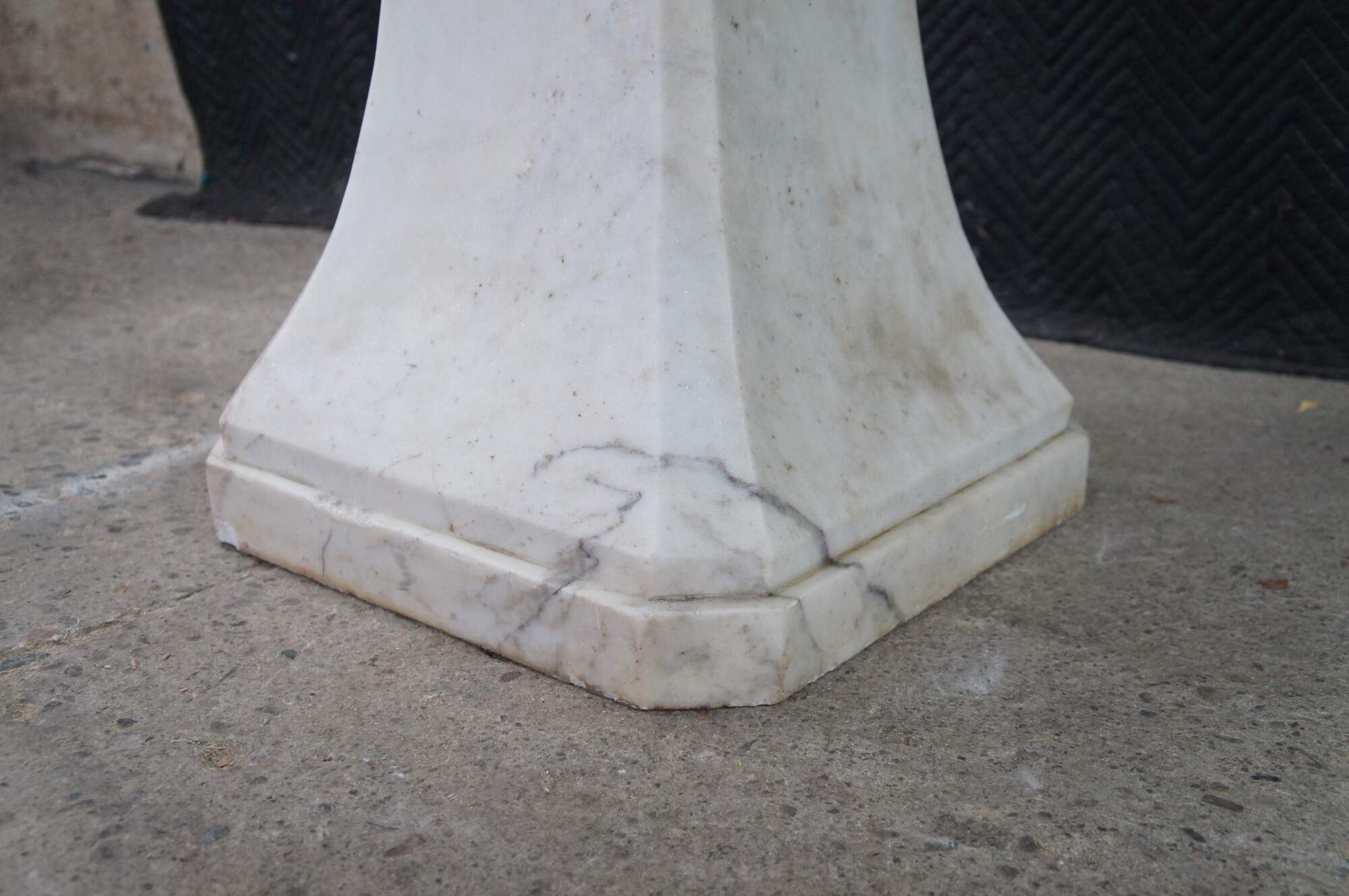 Monumental mid century Italian white Carrara marble bathroom sink. A tapered rectangular plith column supports a square form sink with a beveled and notched design.