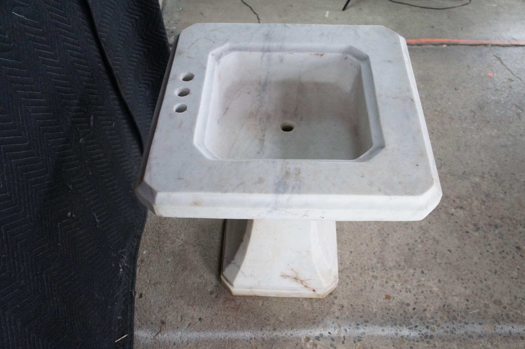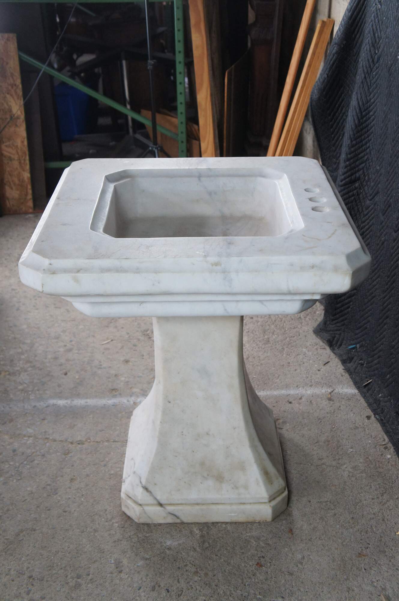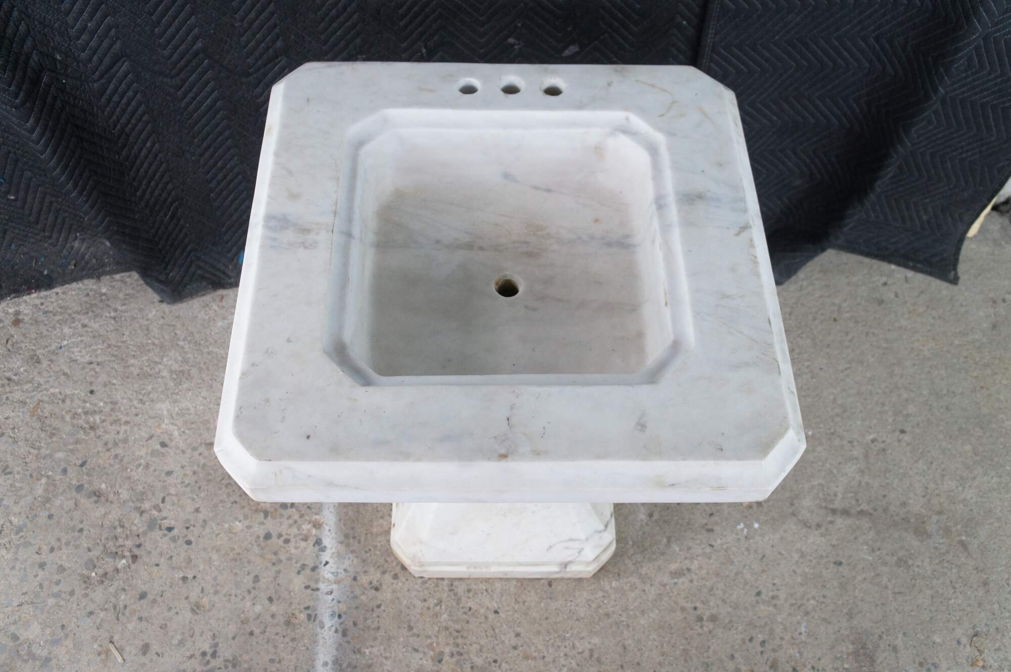 Monumental mid century Italian white Carrara marble bathroom sink. A tapered rectangular plith column supports a square form sink with a beveled and notched design.