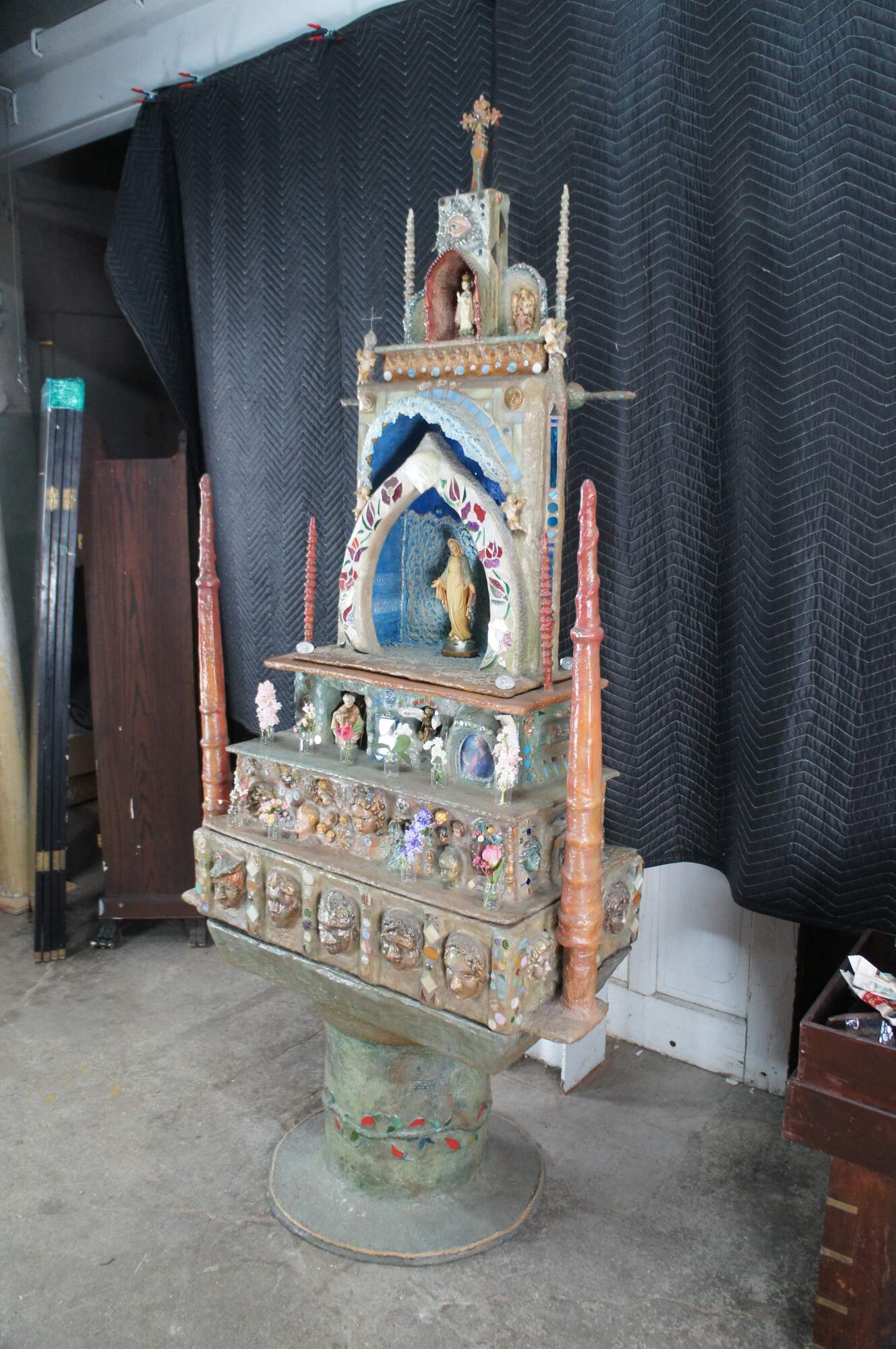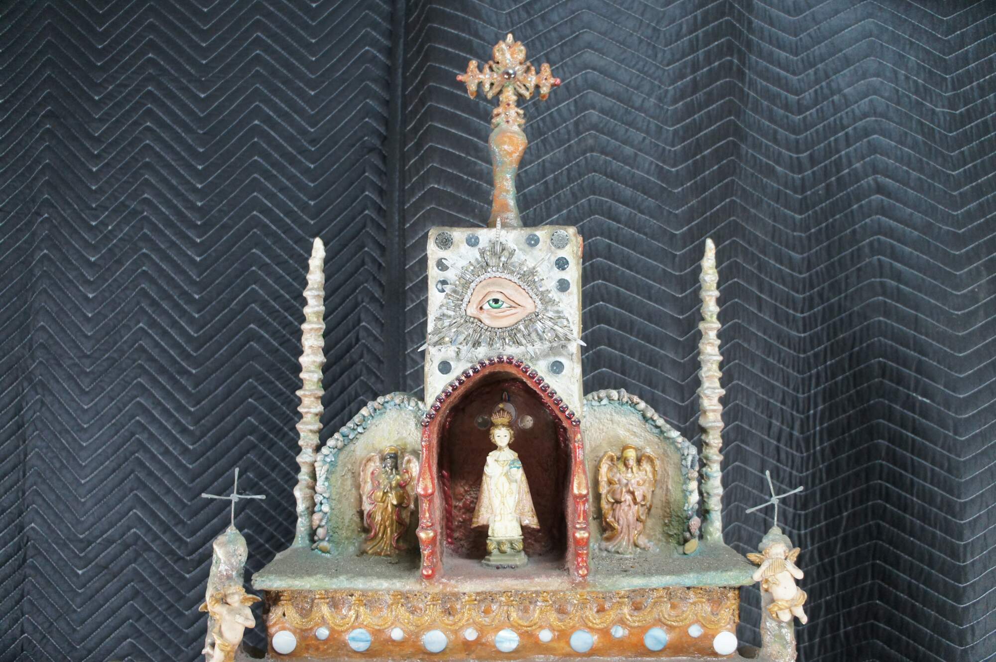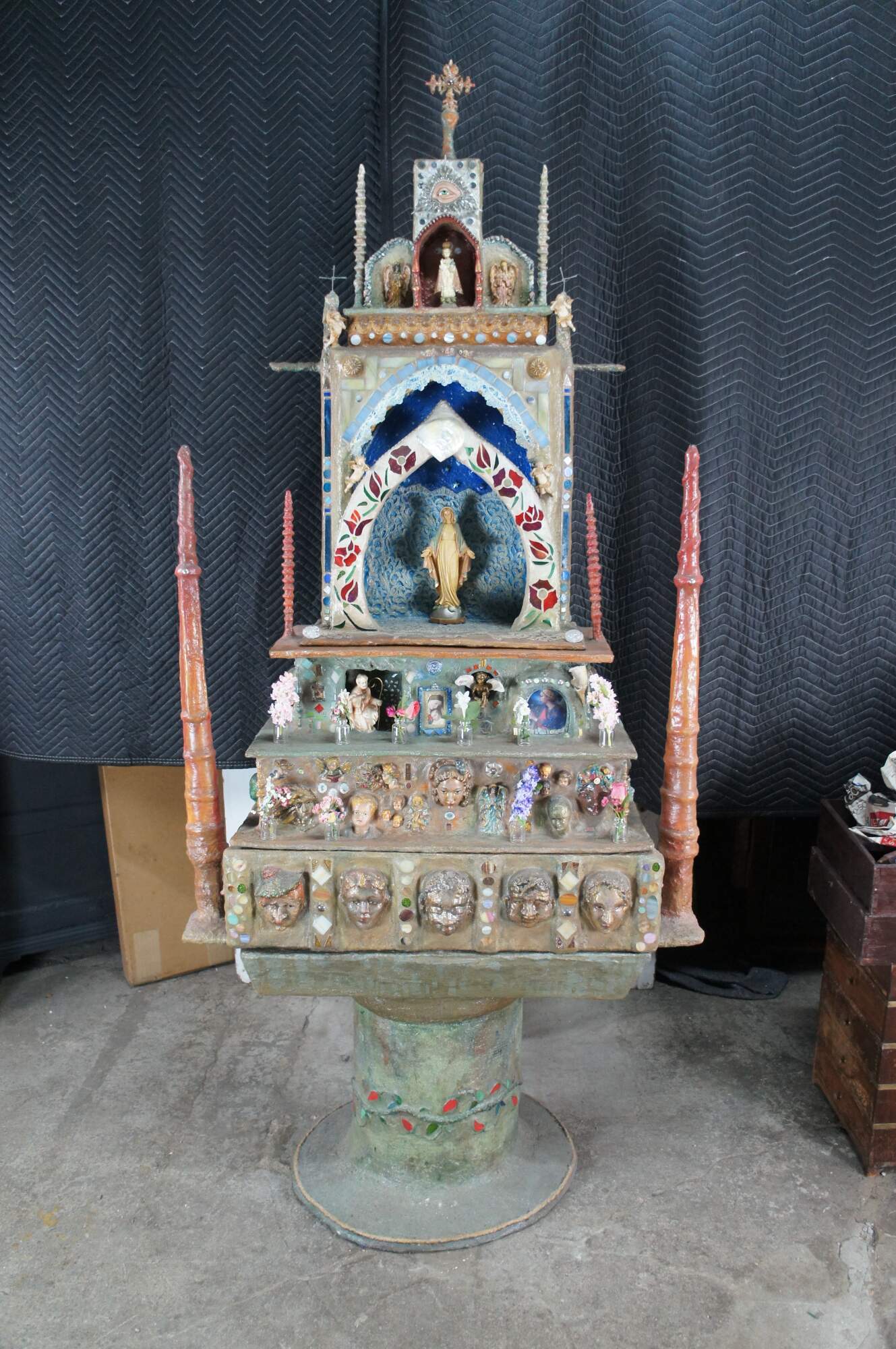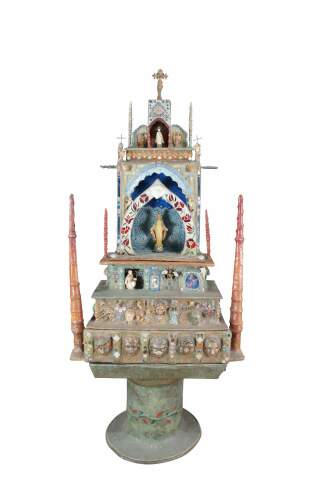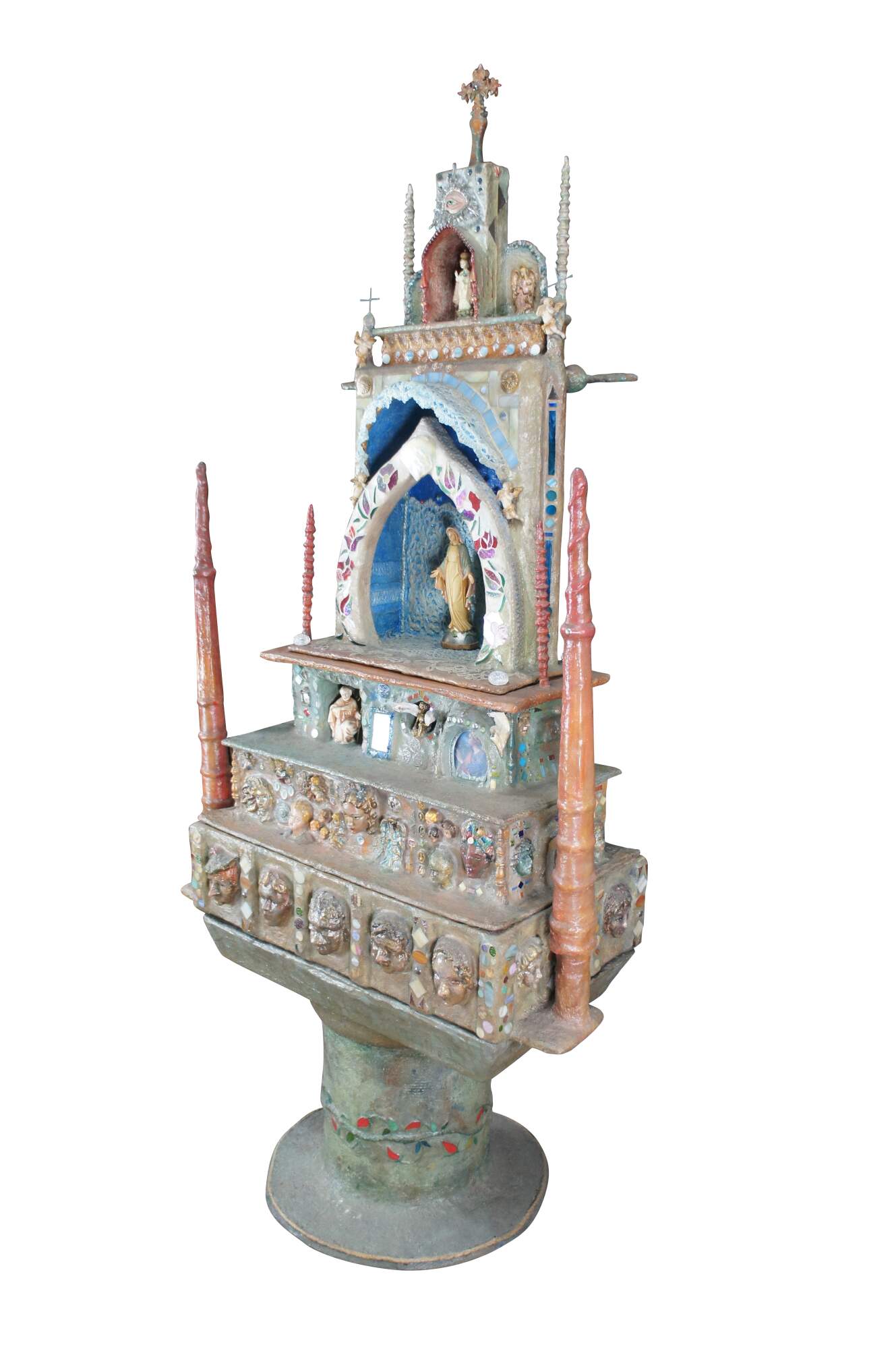 multi-tiered assemblage art shrine or altar. It incorporates a wide variety of religious and symbolic elements, characteristic of visionary art pieces. Prominently features a central figure resembling the Virgin Mary within a decorated niche. Includes religious figures, tiled inlay, the All seeing eye along the top beneath a cross along the top and other creative depictions.