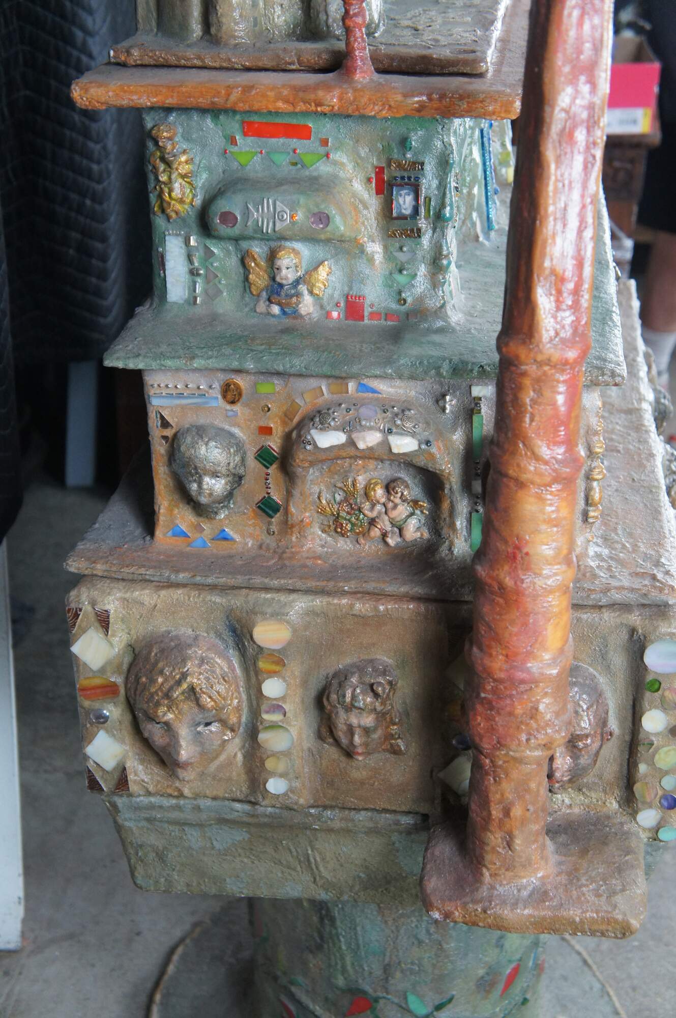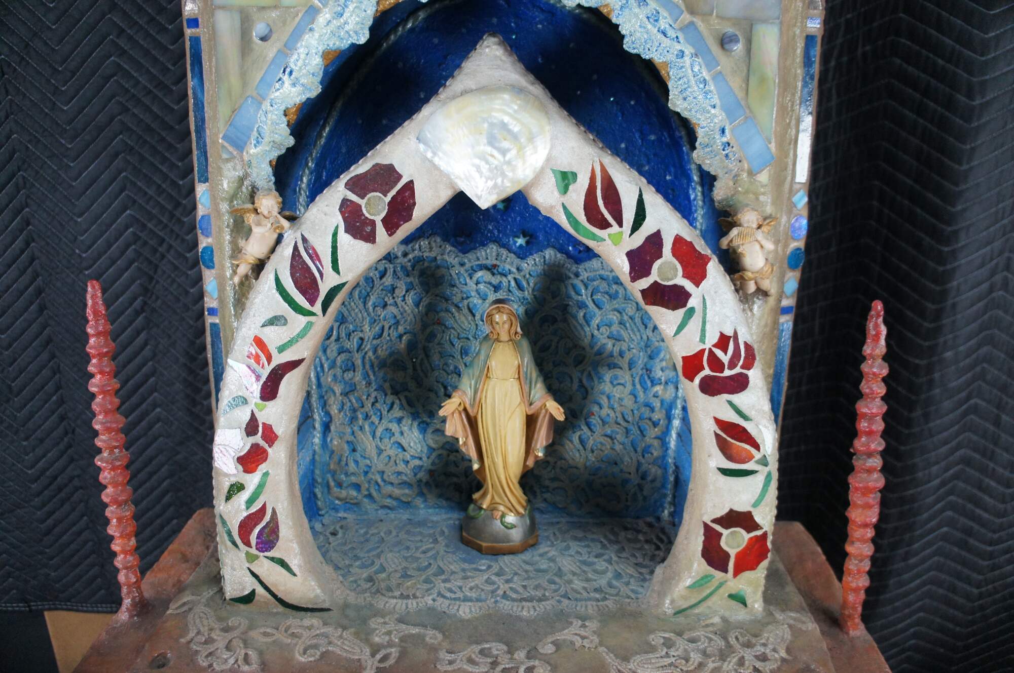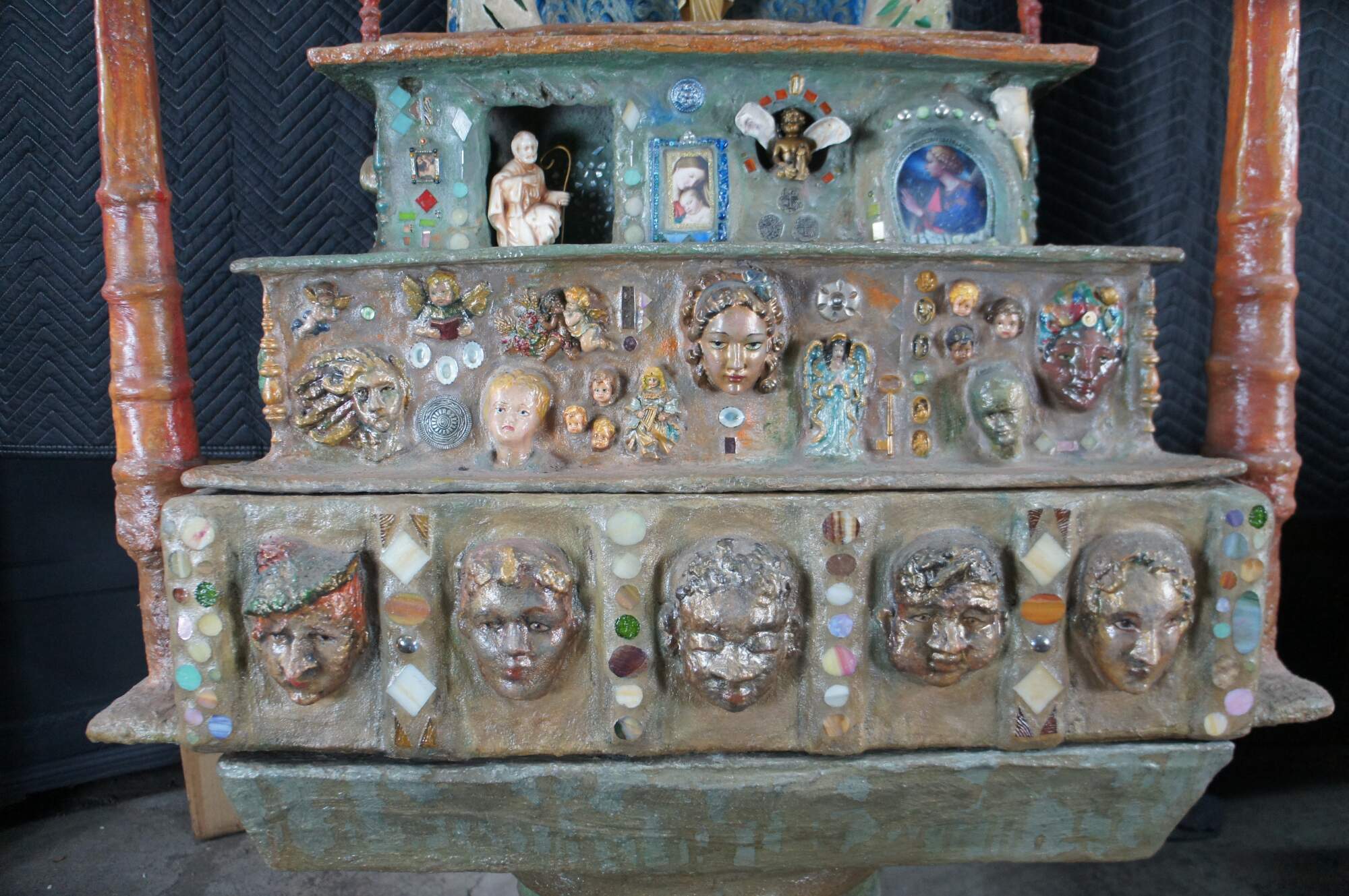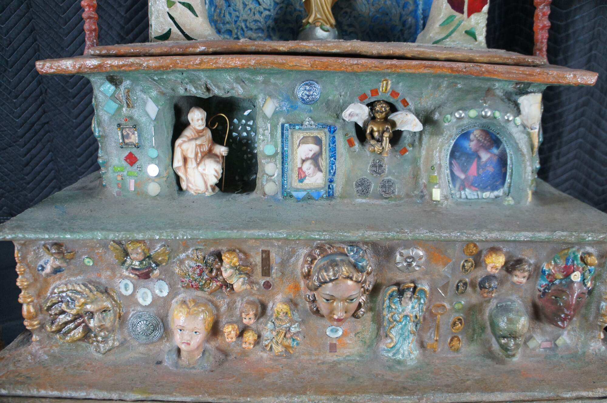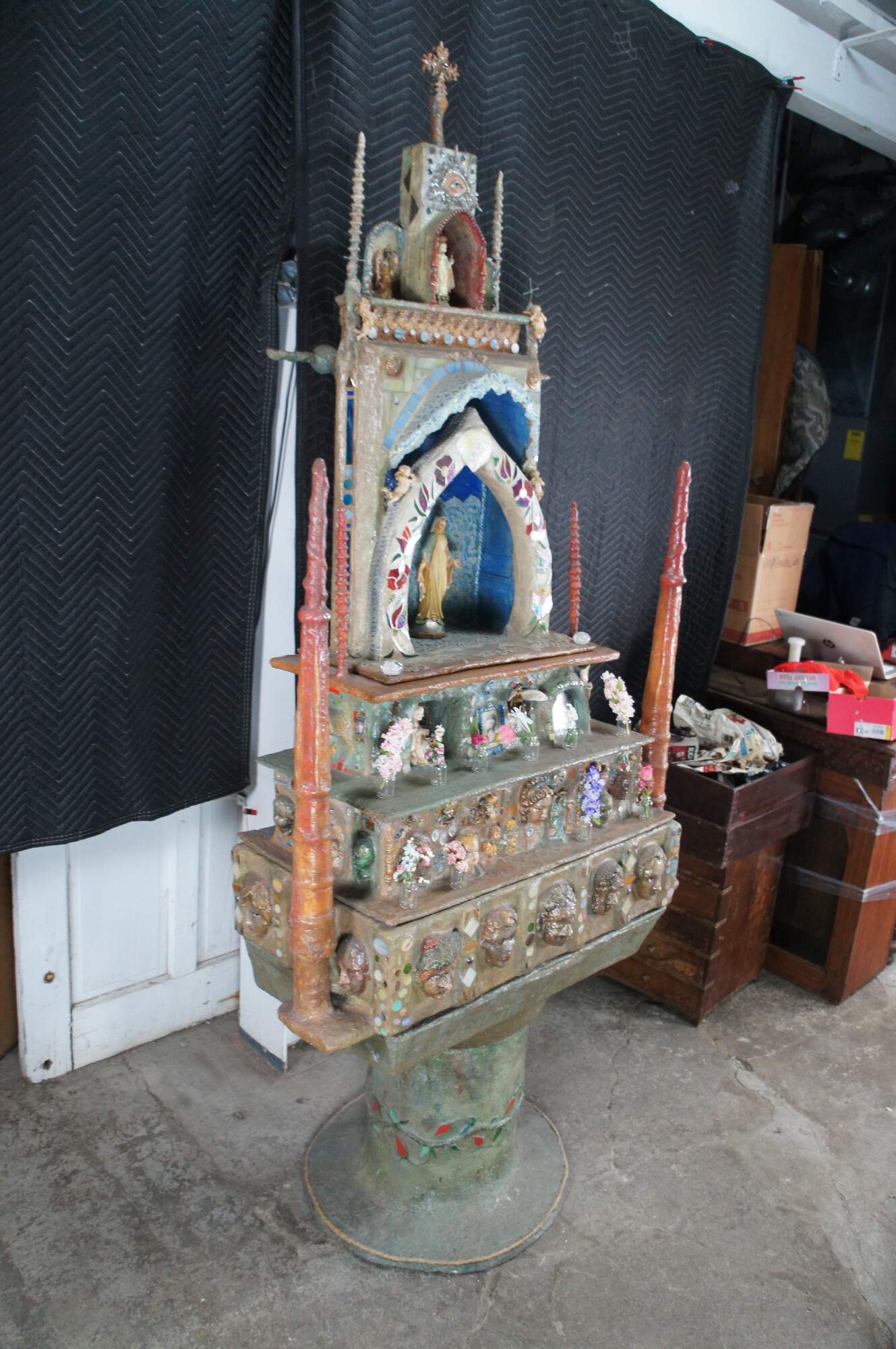 multi-tiered assemblage art shrine or altar. It incorporates a wide variety of religious and symbolic elements, characteristic of visionary art pieces. Prominently features a central figure resembling the Virgin Mary within a decorated niche. Includes religious figures, tiled inlay, the All seeing eye along the top beneath a cross along the top and other creative depictions.
