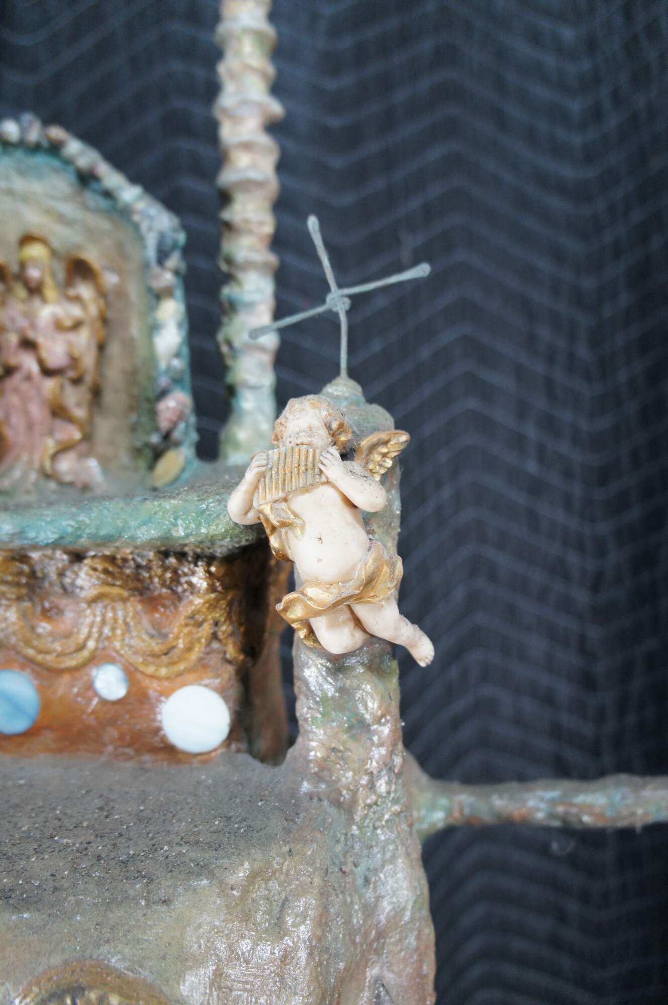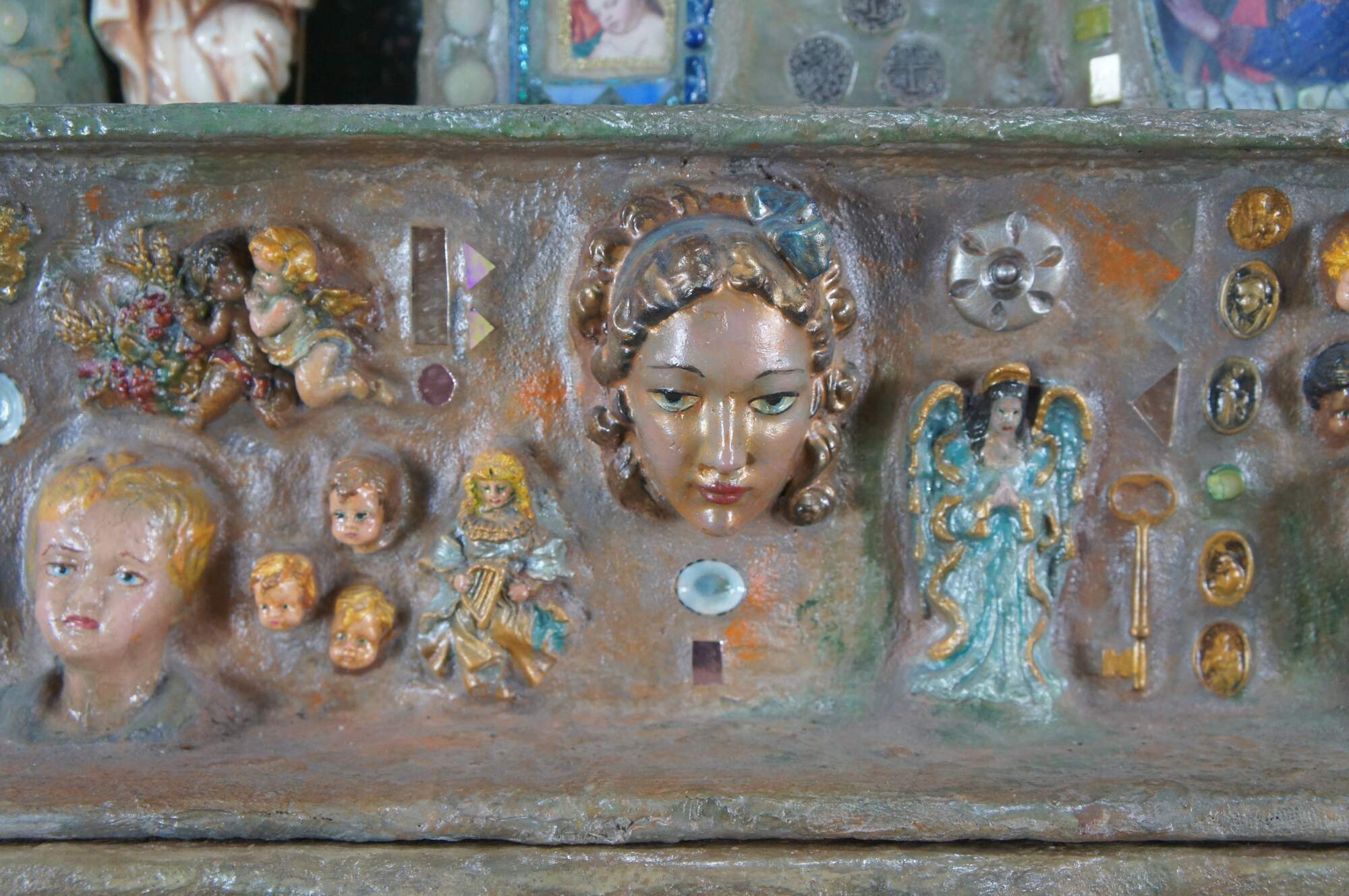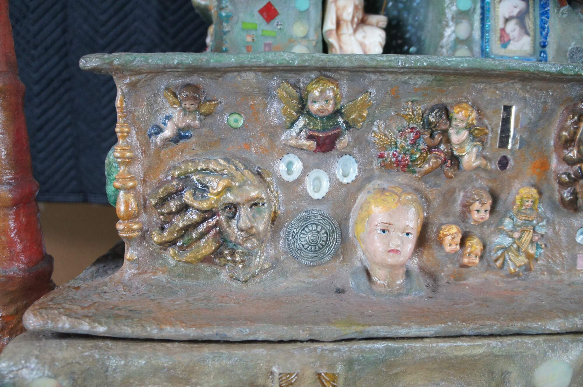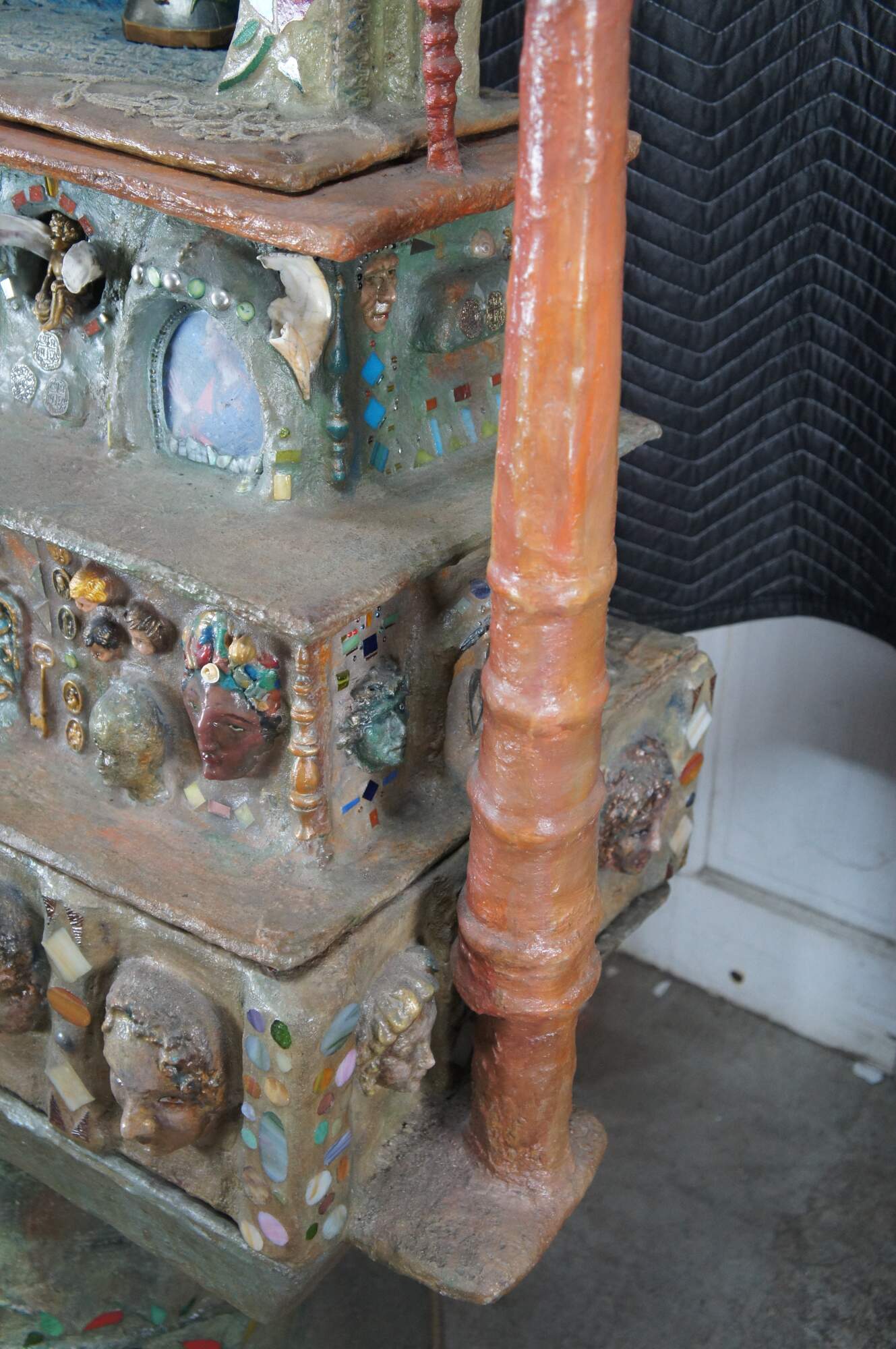 multi-tiered assemblage art shrine or altar. It incorporates a wide variety of religious and symbolic elements, characteristic of visionary art pieces. Prominently features a central figure resembling the Virgin Mary within a decorated niche. Includes religious figures, tiled inlay, the All seeing eye along the top beneath a cross along the top and other creative depictions.