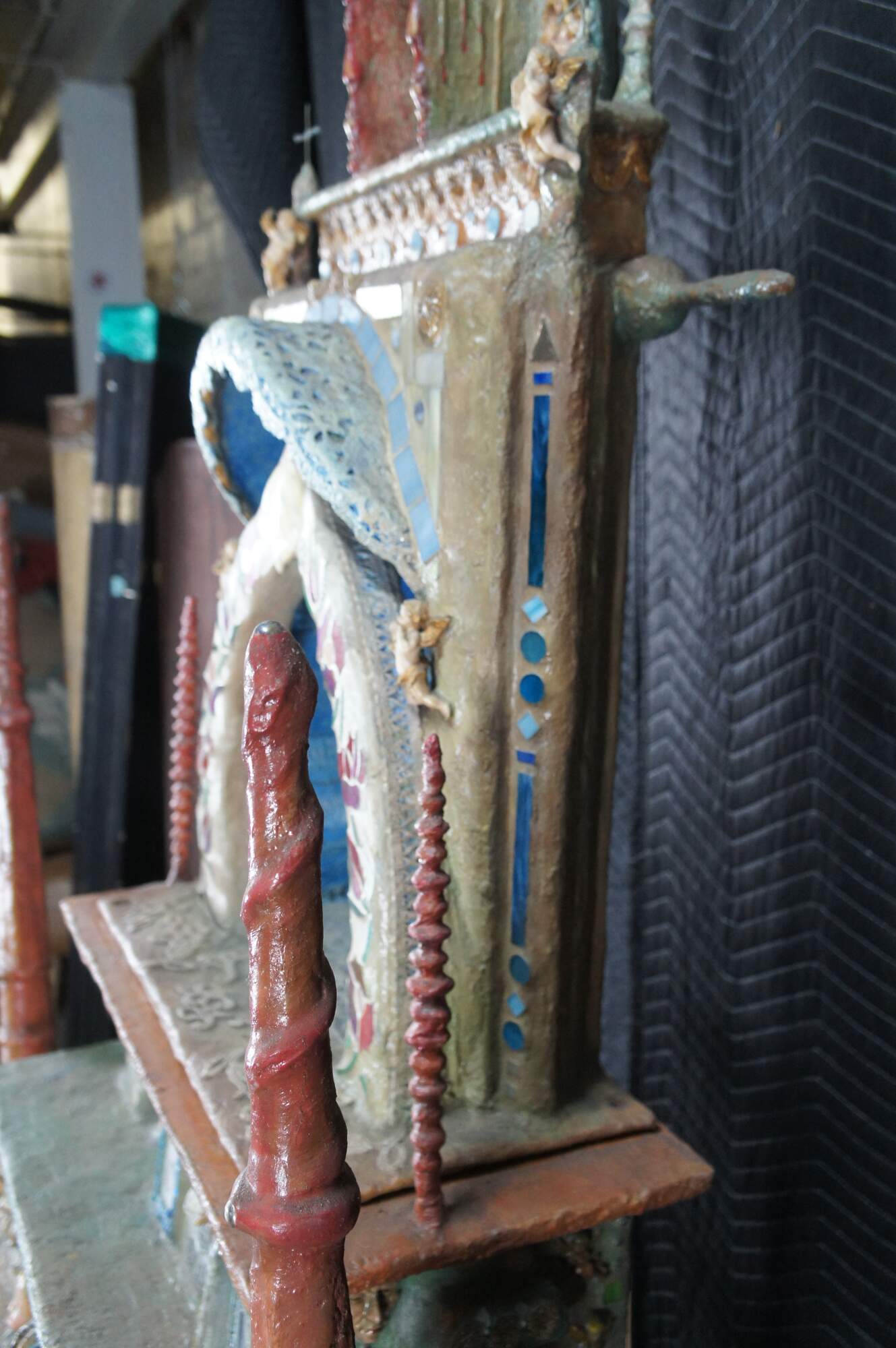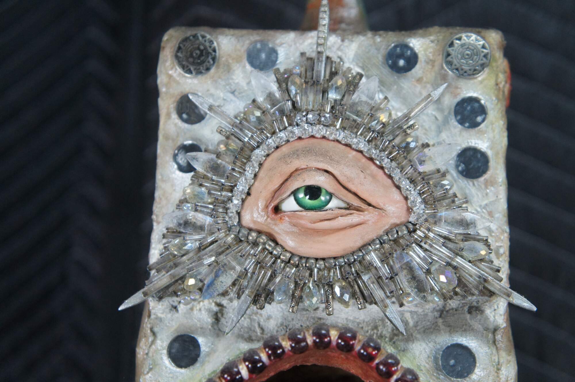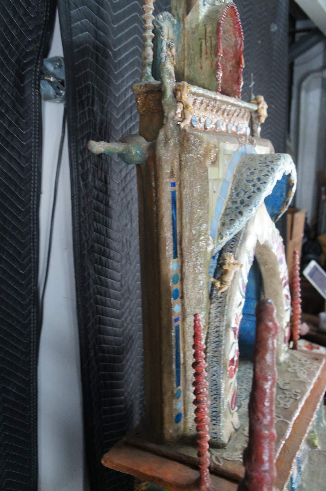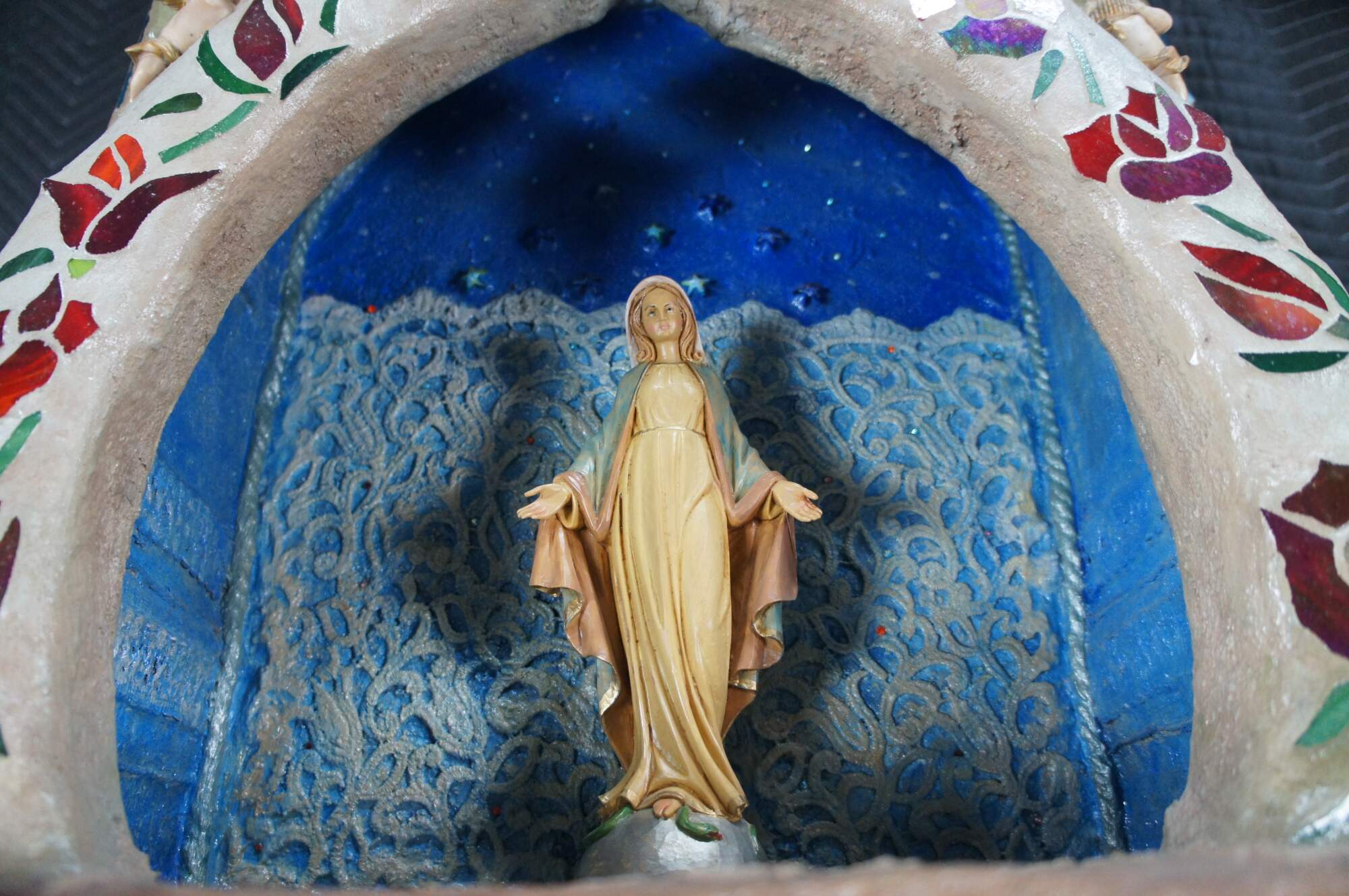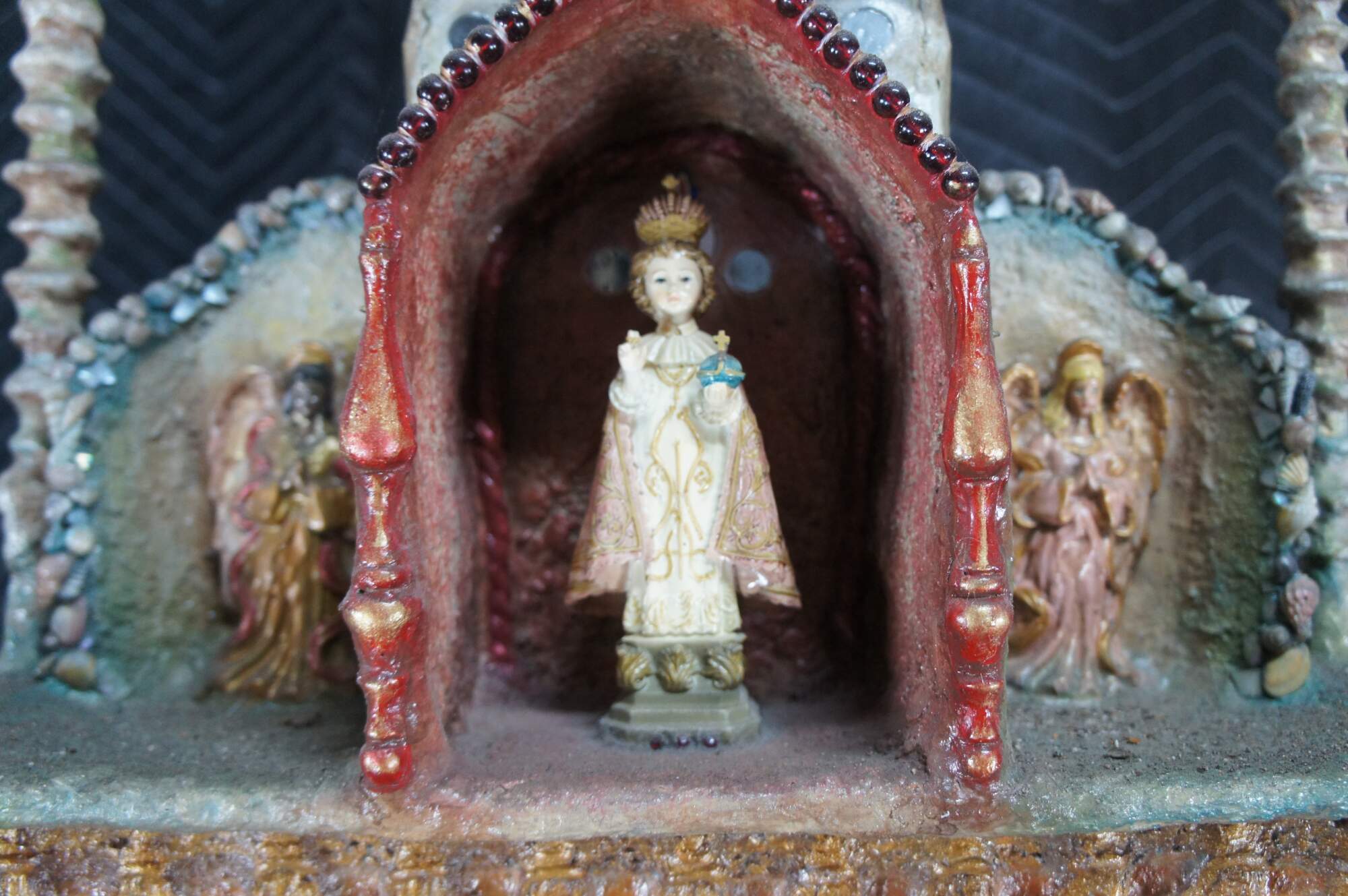 multi-tiered assemblage art shrine or altar. It incorporates a wide variety of religious and symbolic elements, characteristic of visionary art pieces. Prominently features a central figure resembling the Virgin Mary within a decorated niche. Includes religious figures, tiled inlay, the All seeing eye along the top beneath a cross along the top and other creative depictions.