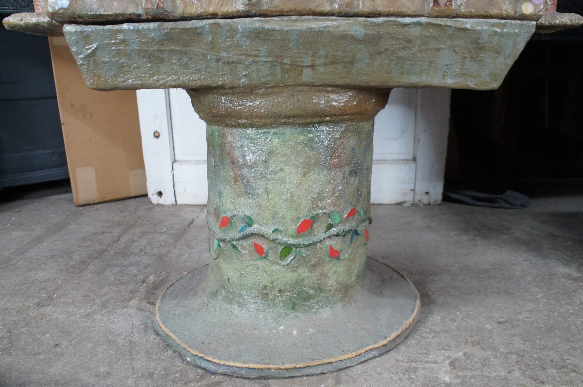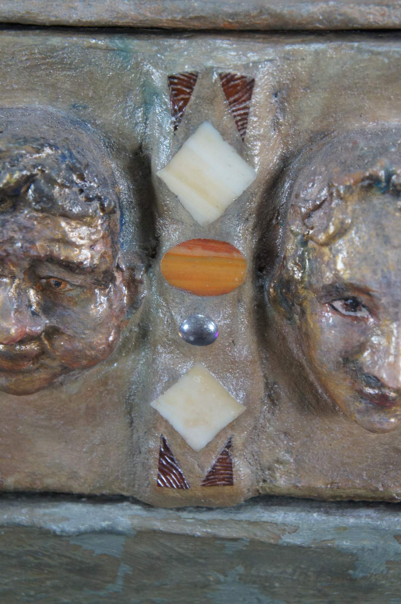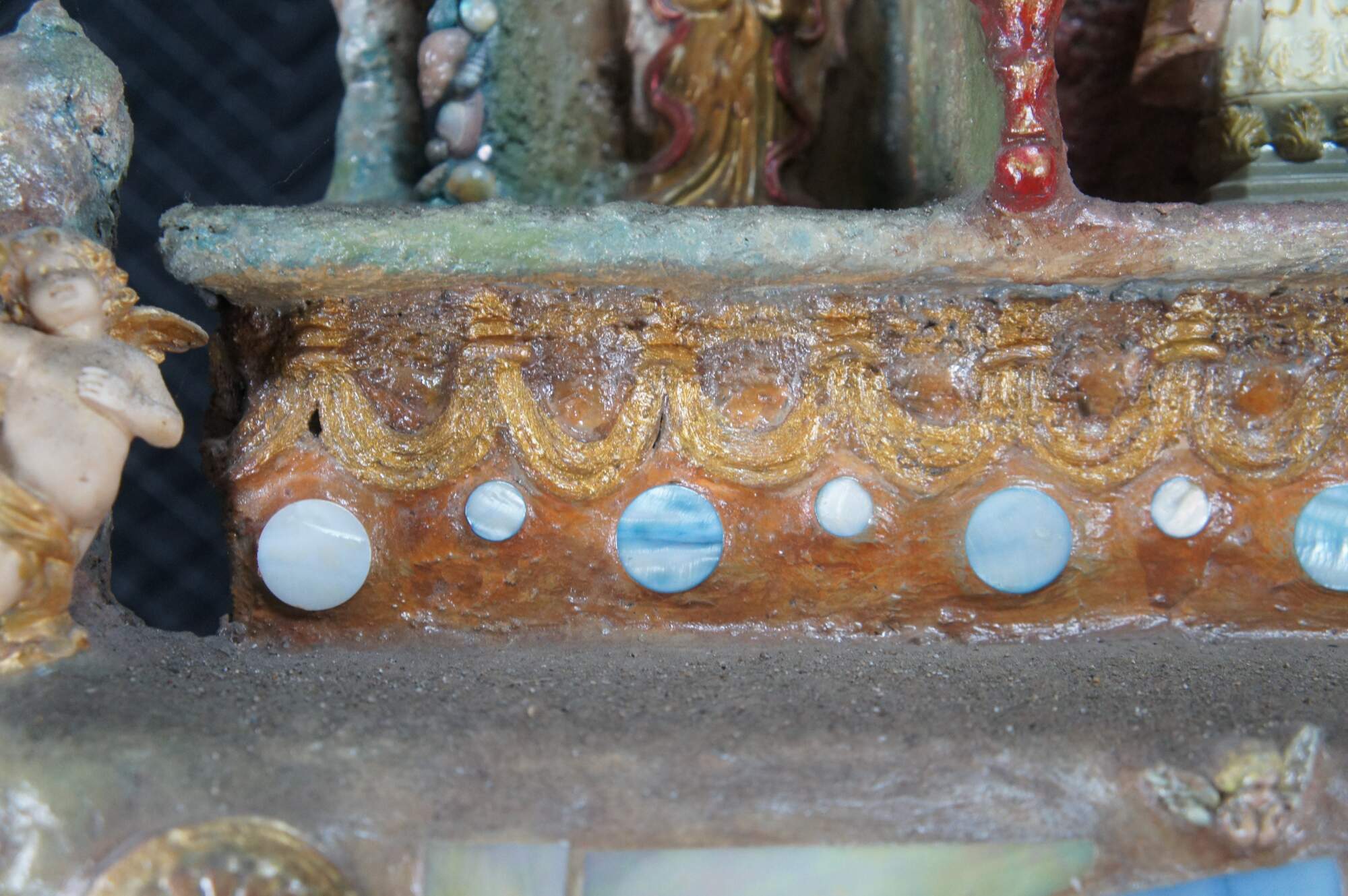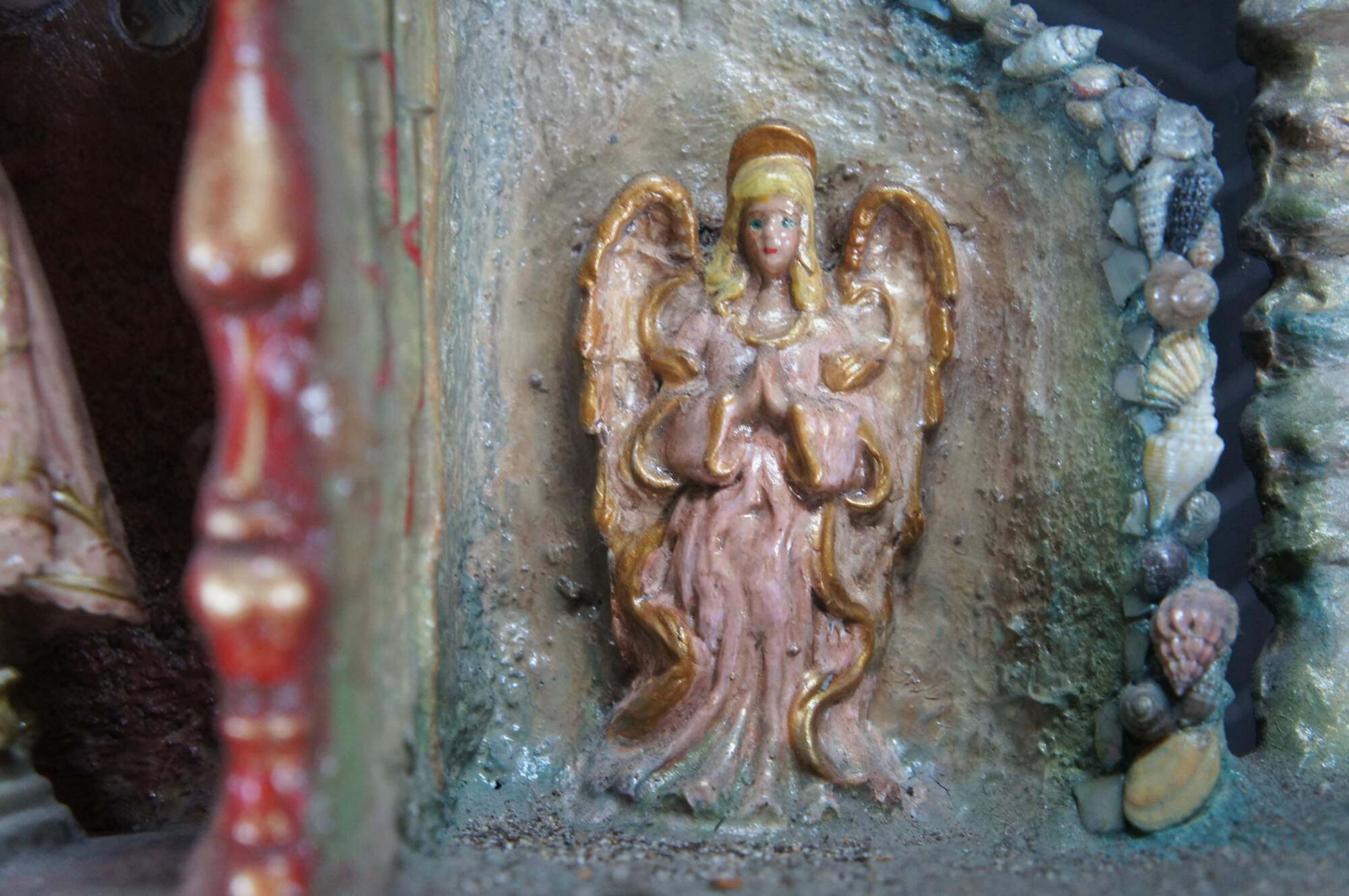 multi-tiered assemblage art shrine or altar. It incorporates a wide variety of religious and symbolic elements, characteristic of visionary art pieces. Prominently features a central figure resembling the Virgin Mary within a decorated niche. Includes religious figures, tiled inlay, the All seeing eye along the top beneath a cross along the top and other creative depictions.