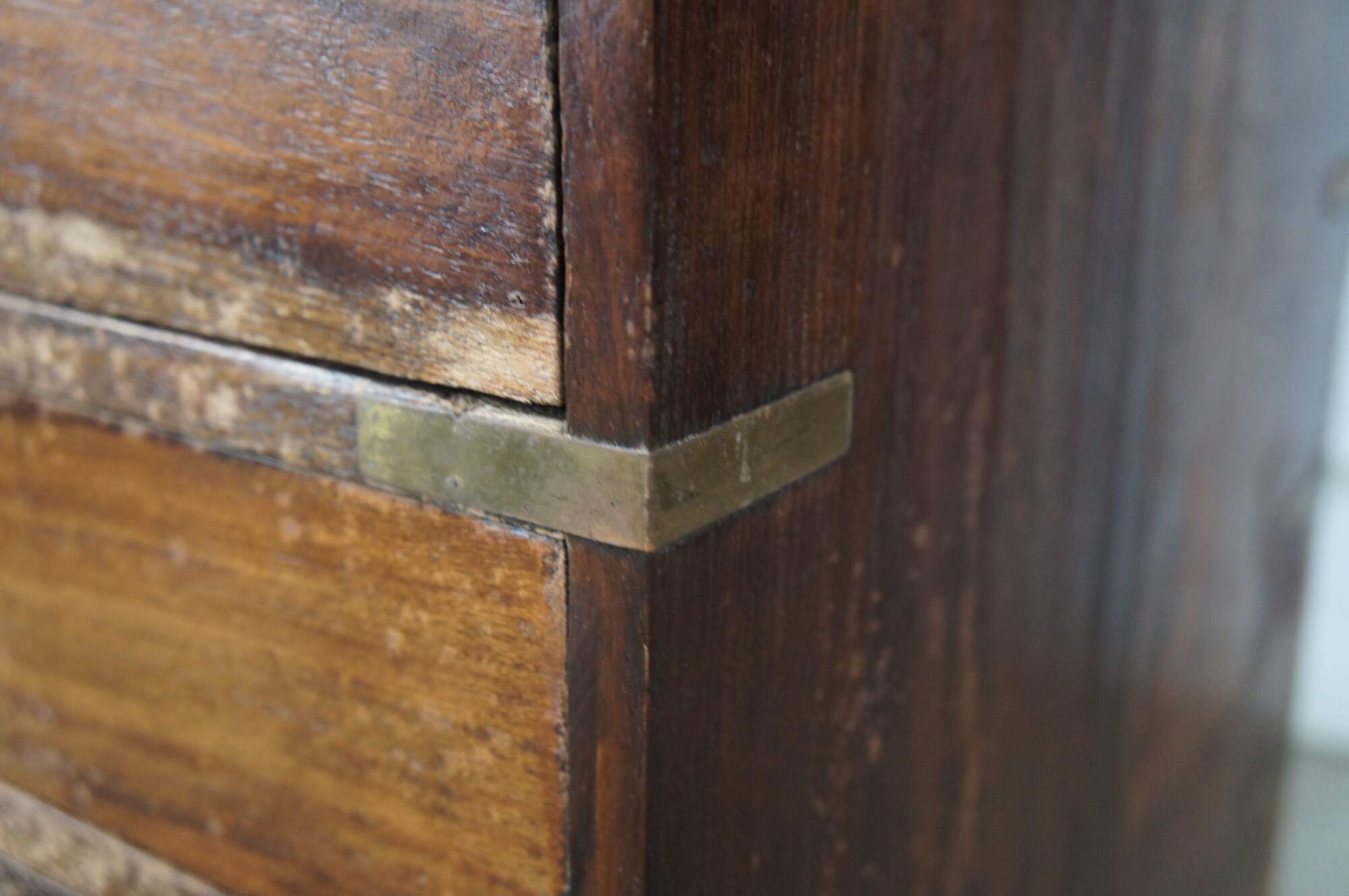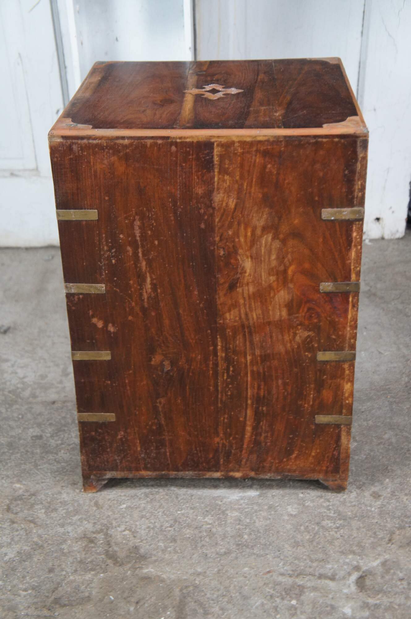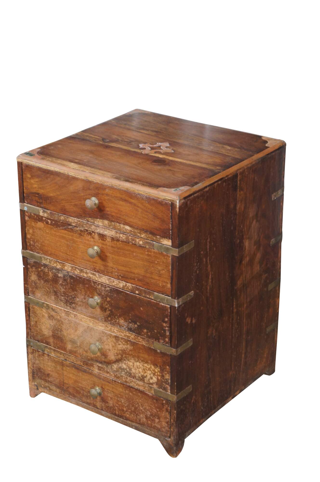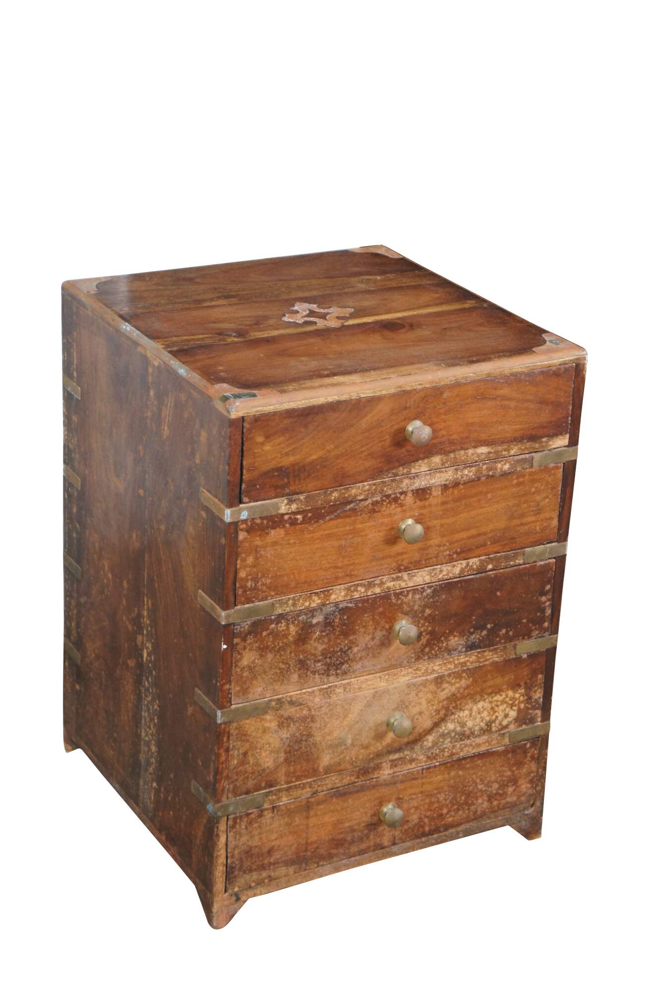 Antique Anglo Indian / English Campaign Military Officers Chest. Made from teak with brass inlay along the top, hand dovetailed drawers, brass banded corners and brass drawer pulls. These smaller chests were easier for officers and military men to travel with due to their smaller size.