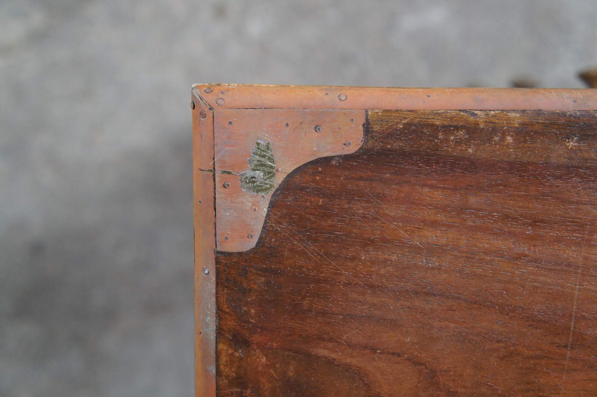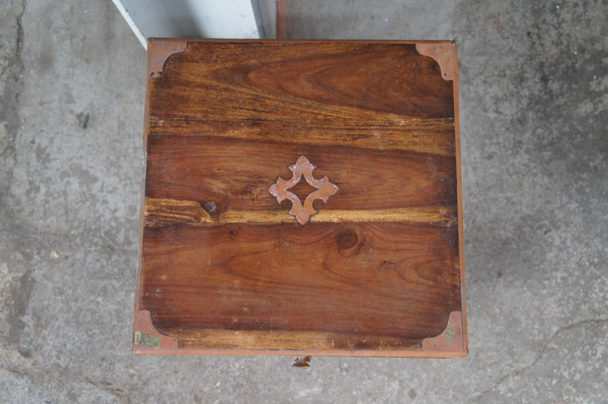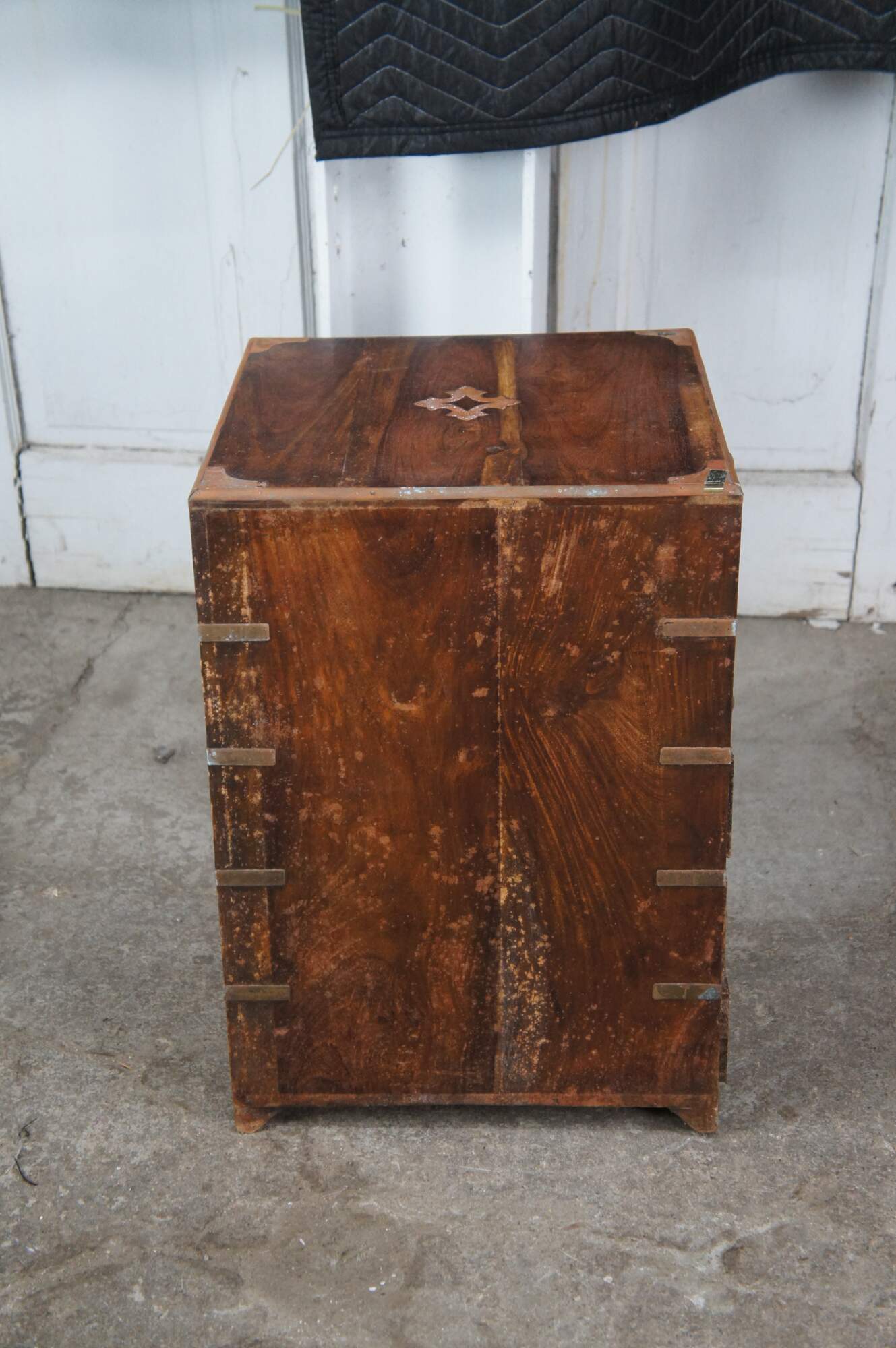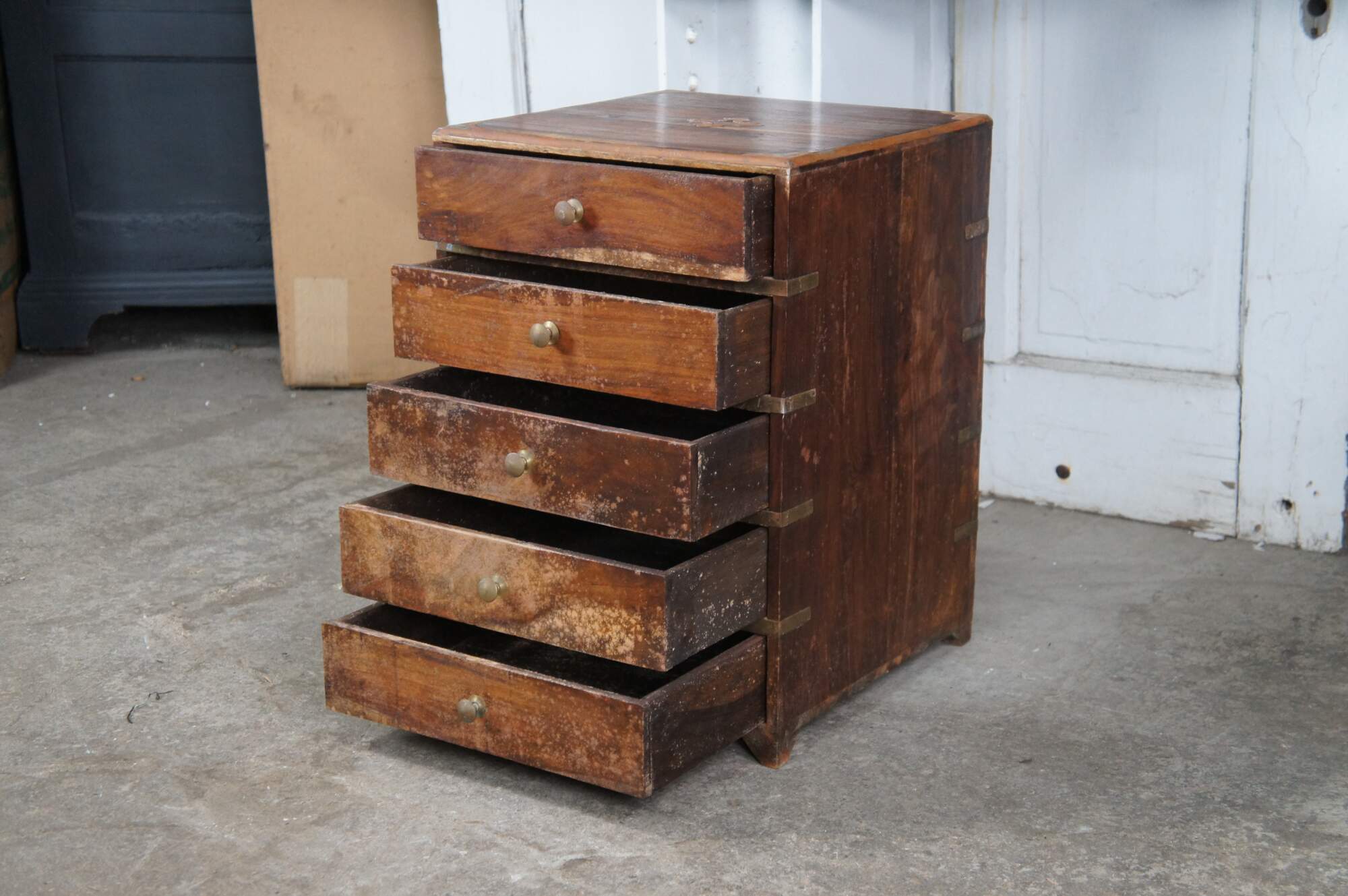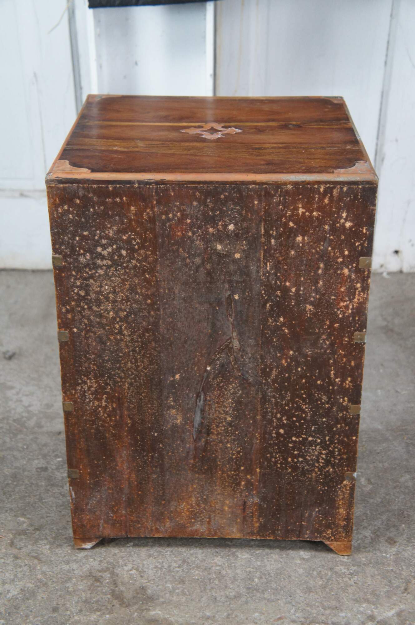 Antique Anglo Indian / English Campaign Military Officers Chest. Made from teak with brass inlay along the top, hand dovetailed drawers, brass banded corners and brass drawer pulls. These smaller chests were easier for officers and military men to travel with due to their smaller size.