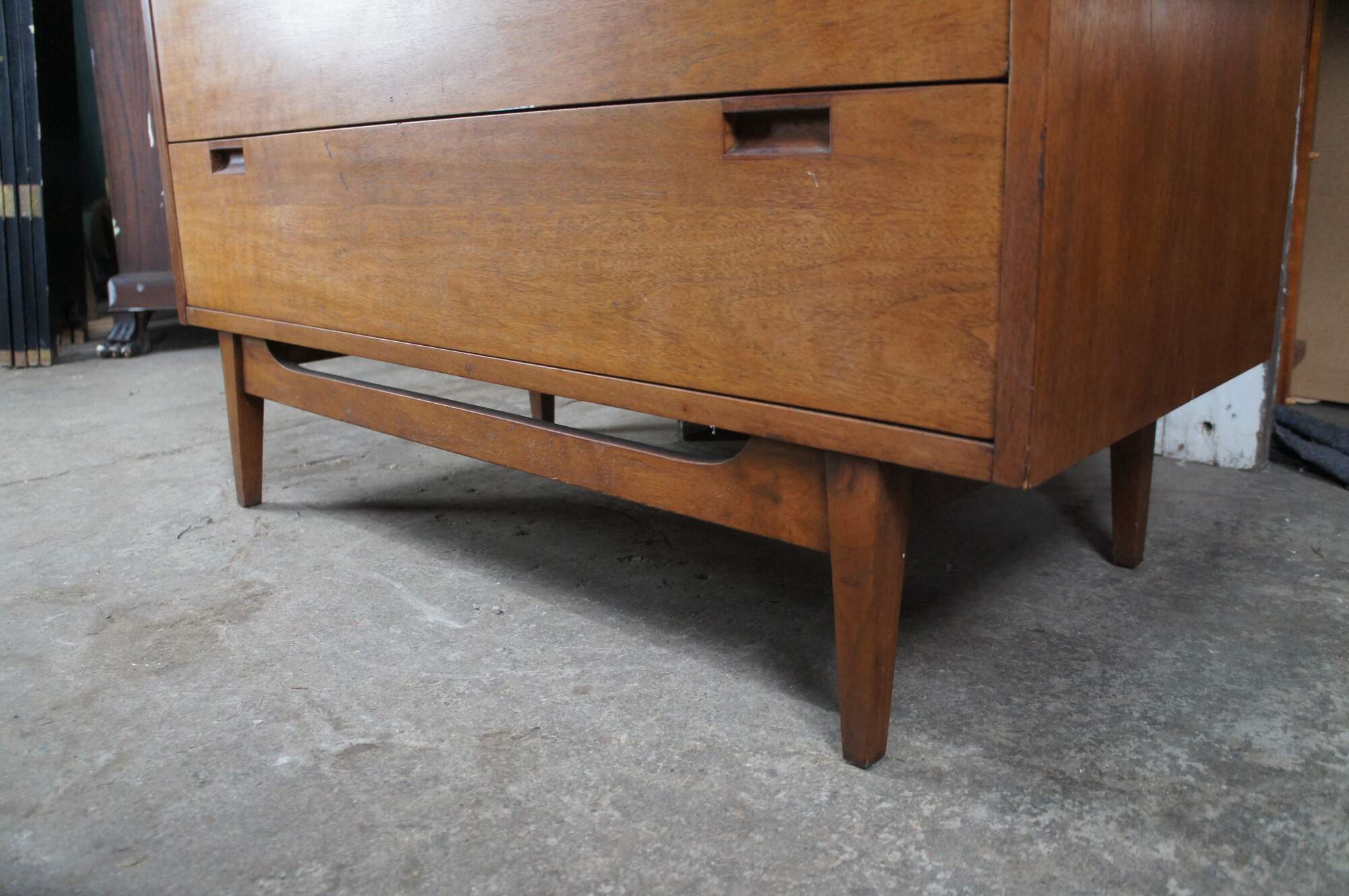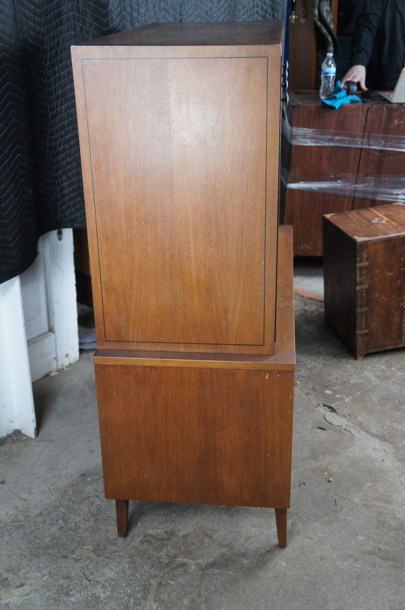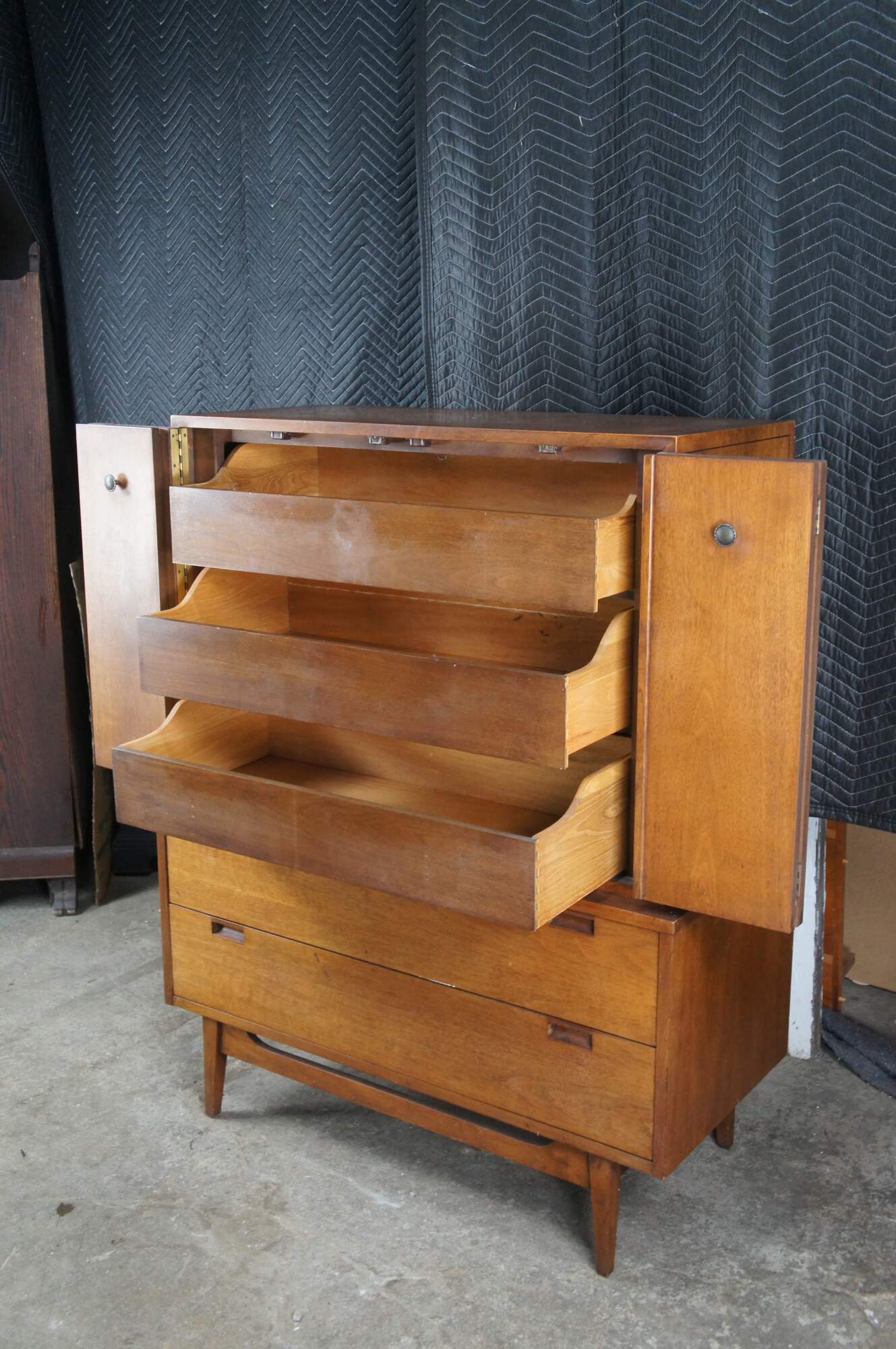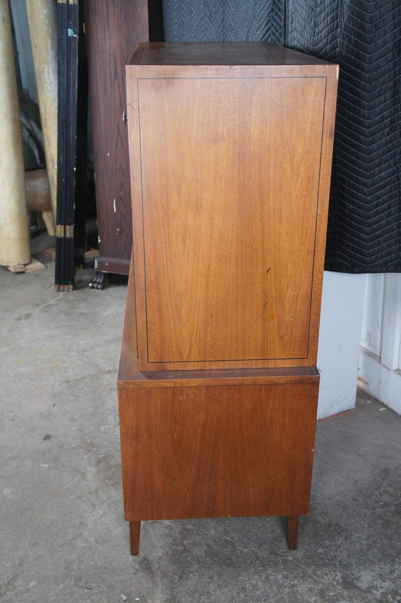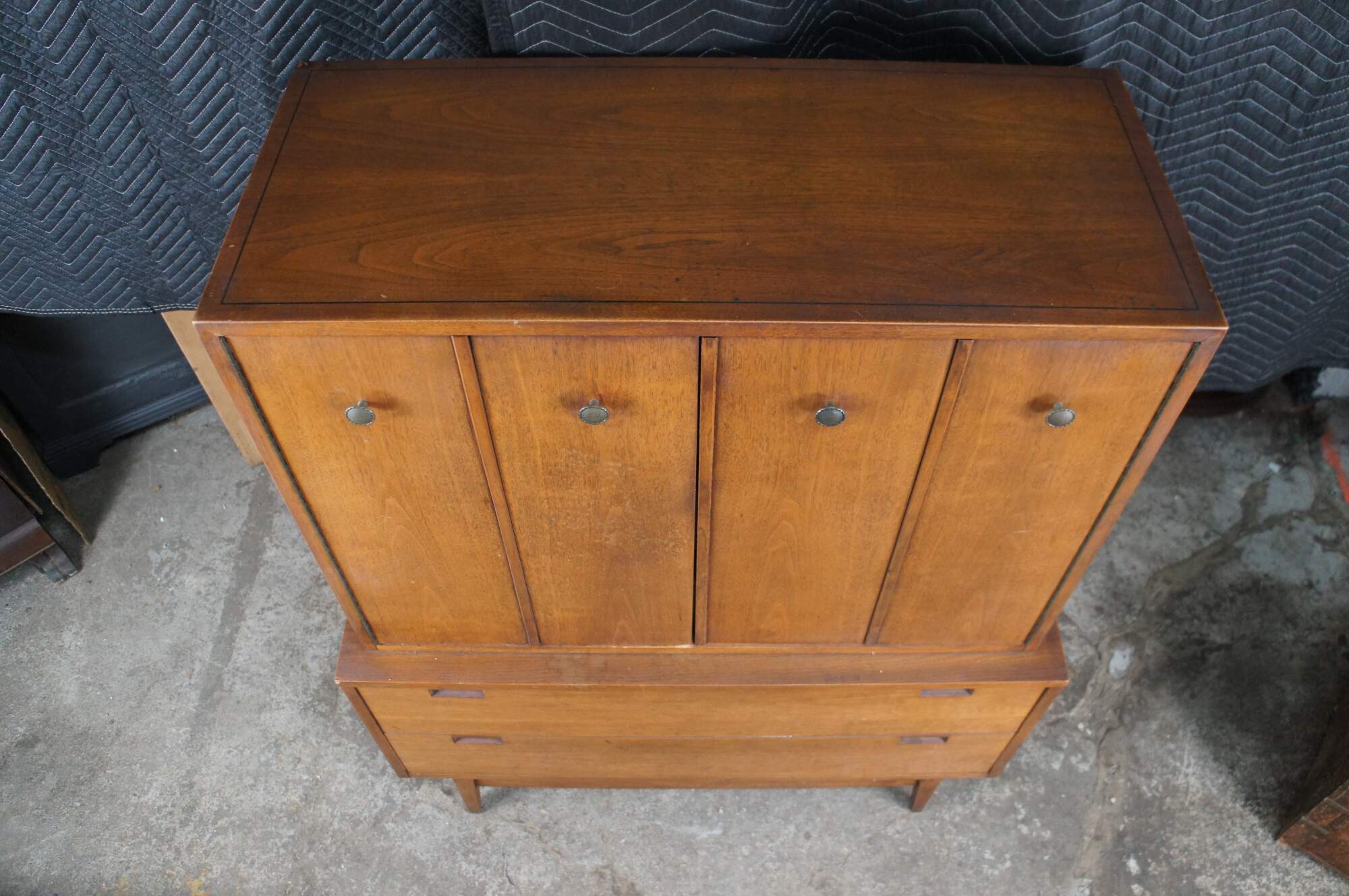 1960s American of Martinsville MCM Chest of Drawers. Features a walnut frame with bifold doors that open to three dovetailed drawers over two larger lower drawers. Drawers open via brass hardware. The dresser is supported by square tapered jointed legs. The top of the dresser showcased ebony inlay framing the top.