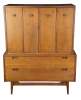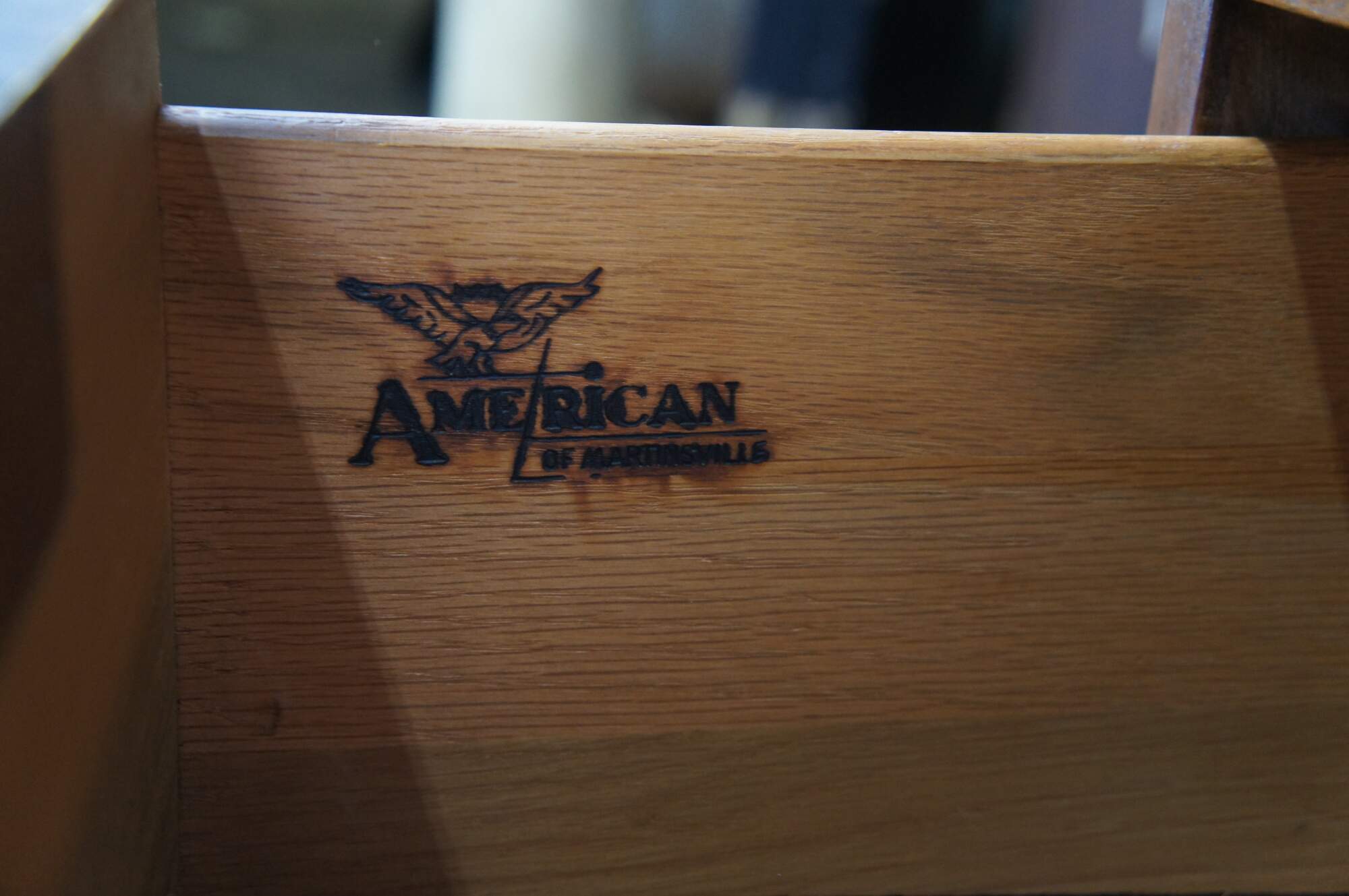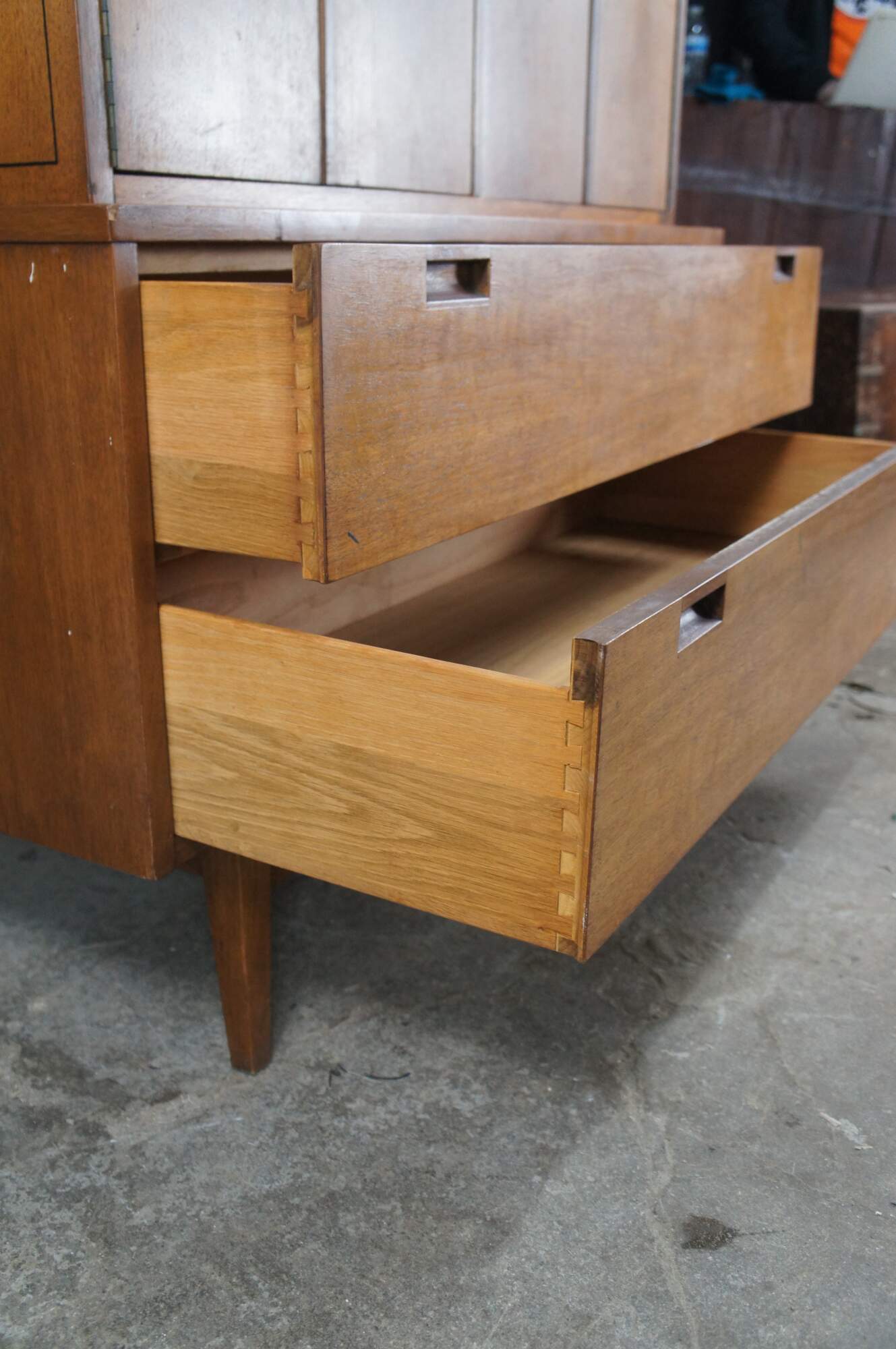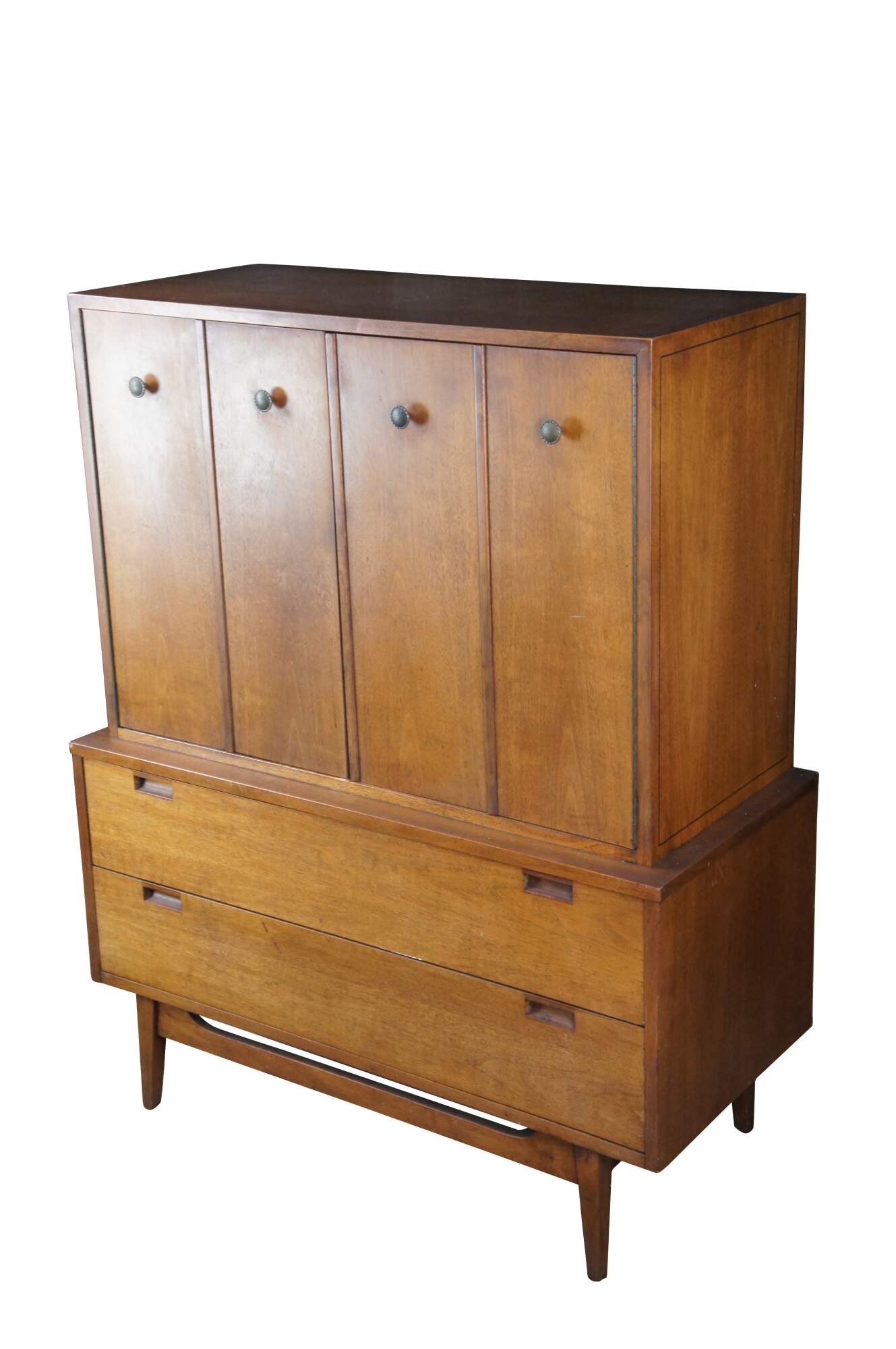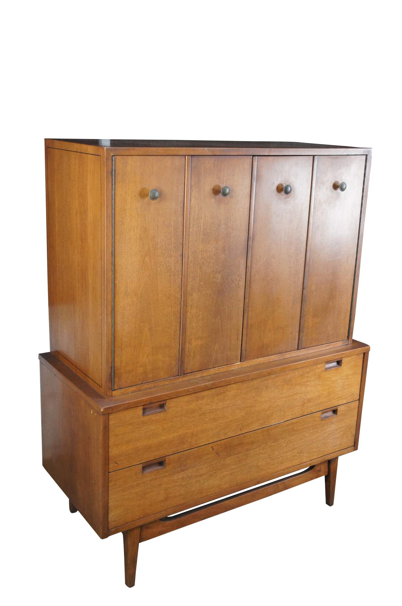 1960s American of Martinsville MCM Chest of Drawers. Features a walnut frame with bifold doors that open to three dovetailed drawers over two larger lower drawers. Drawers open via brass hardware. The dresser is supported by square tapered jointed legs. The top of the dresser showcased ebony inlay framing the top.