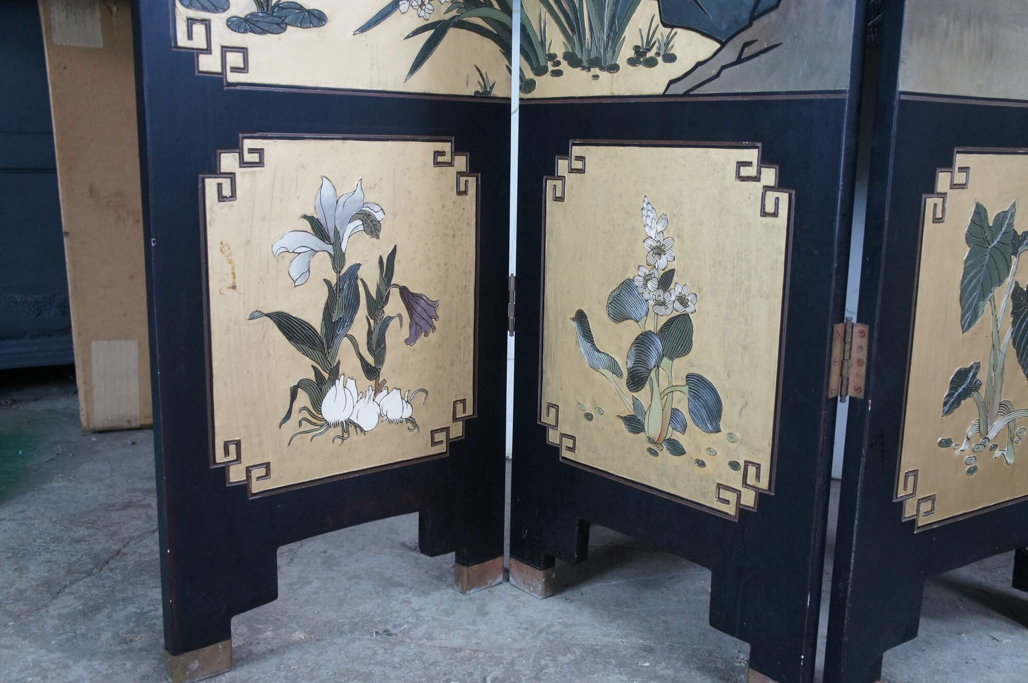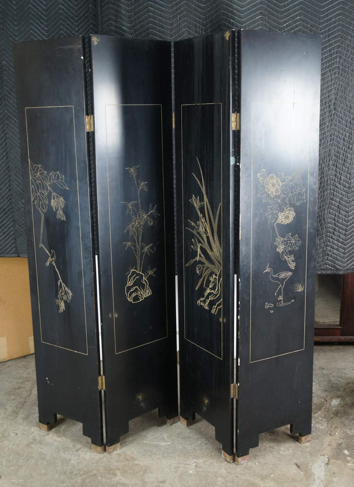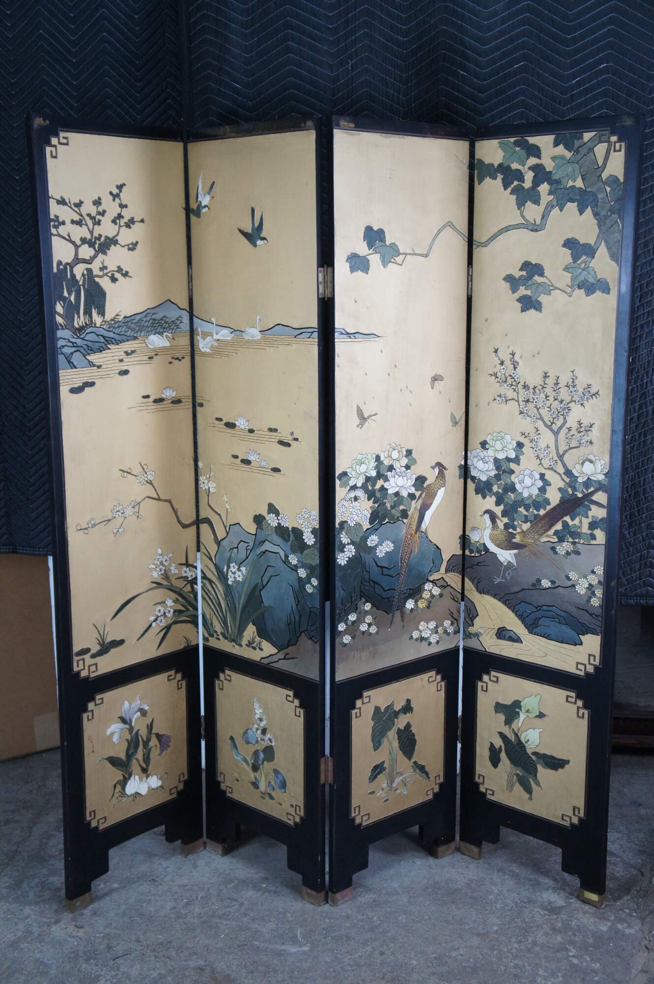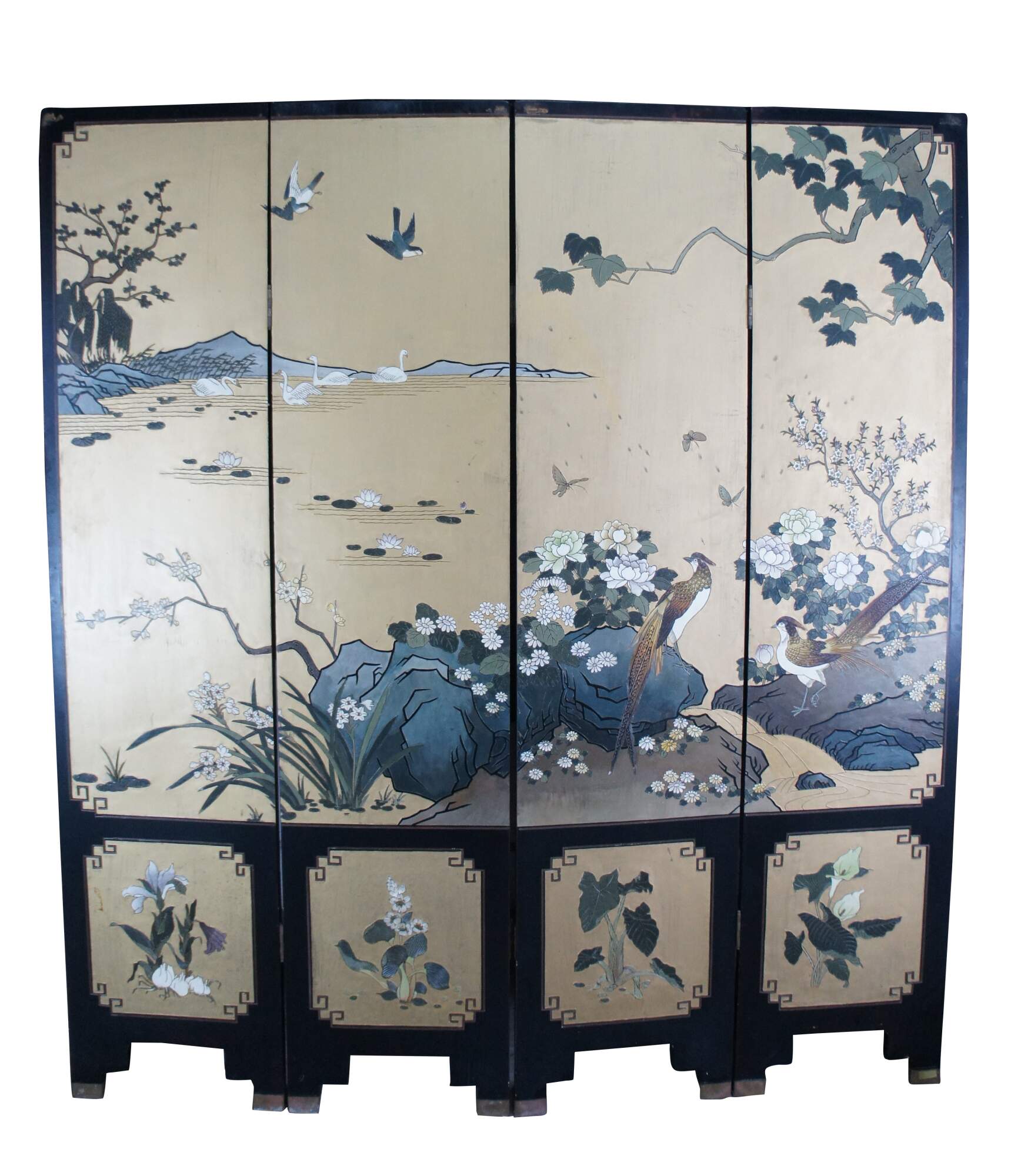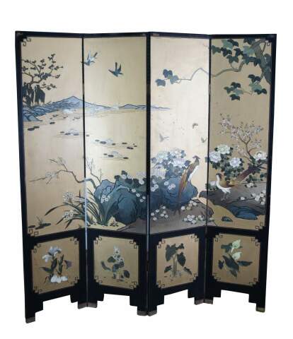 Late 20th Century Chinoiserie Four Panel Folding Screen / Room Divider. Features a black lacquer frame with a painted landscape showcasing a mountainous backdrop with flowers and birds. Verso is black and gold with separate floral framed designs. The base / feet are metal wrapped with a gold finish.