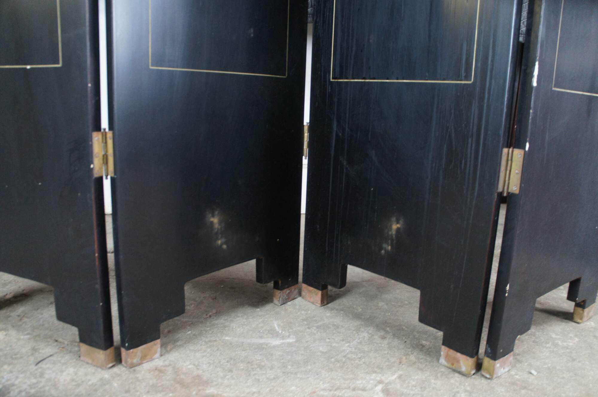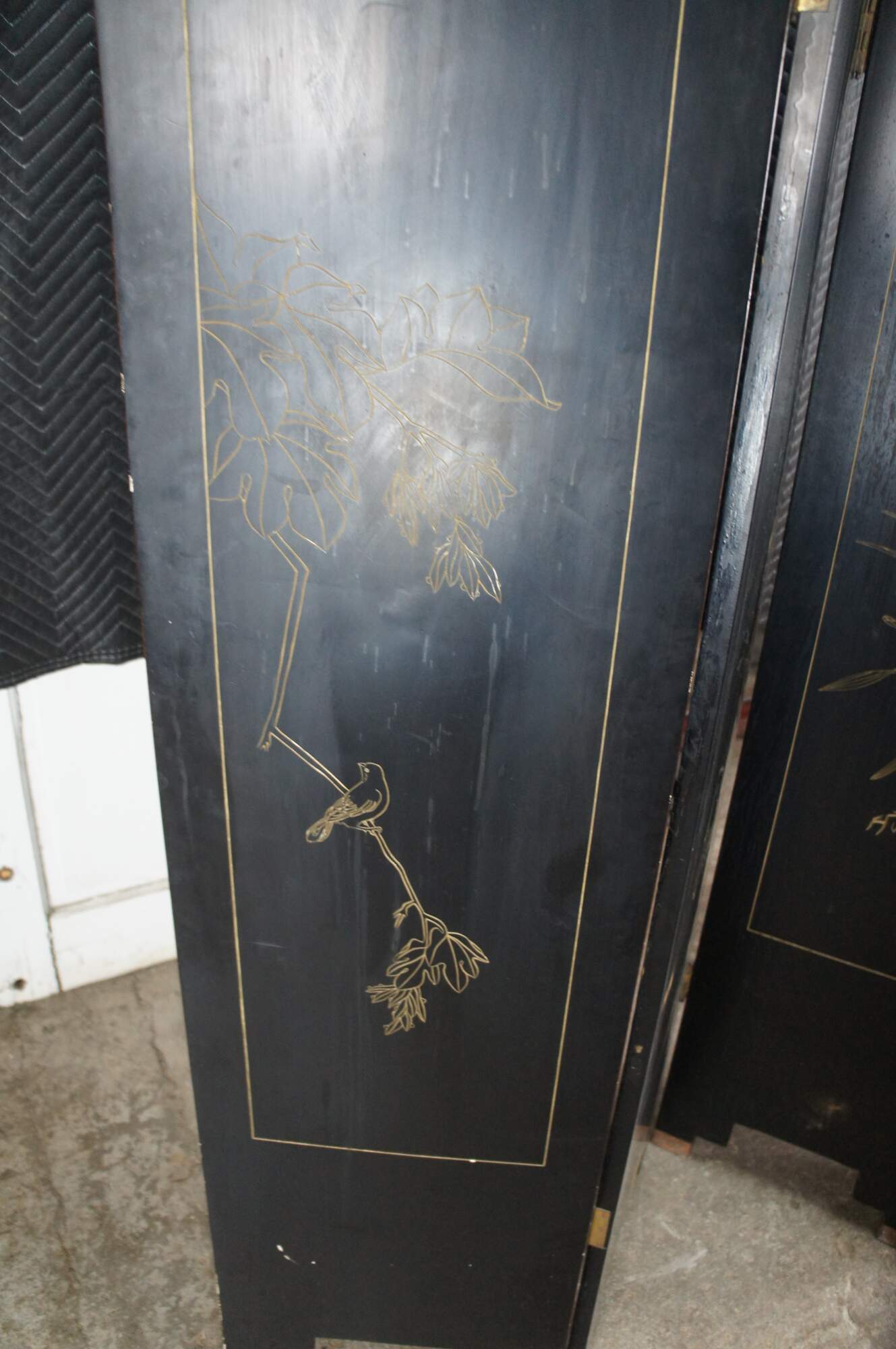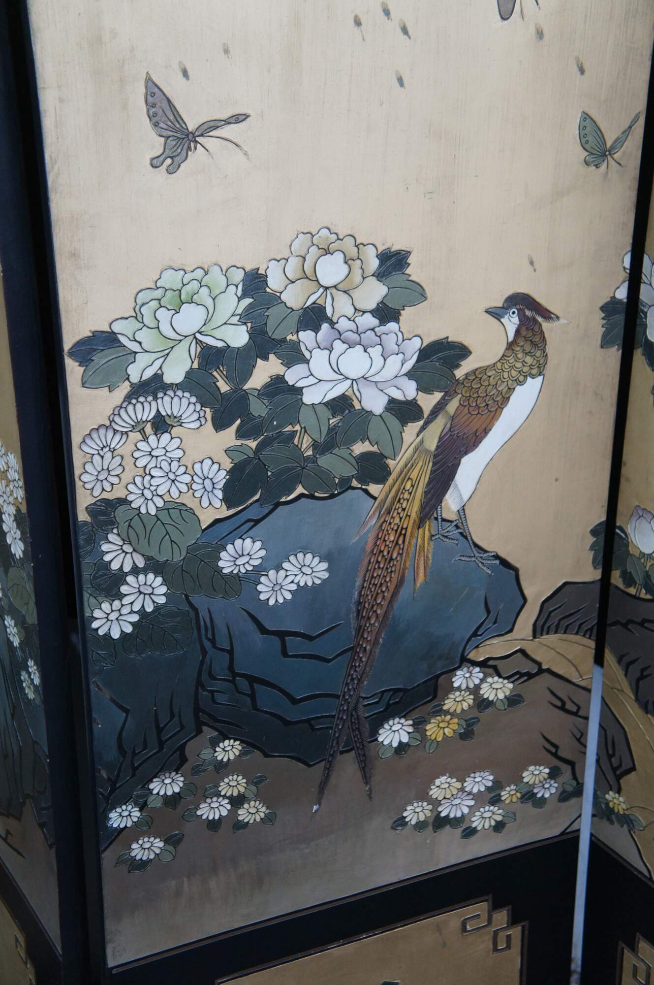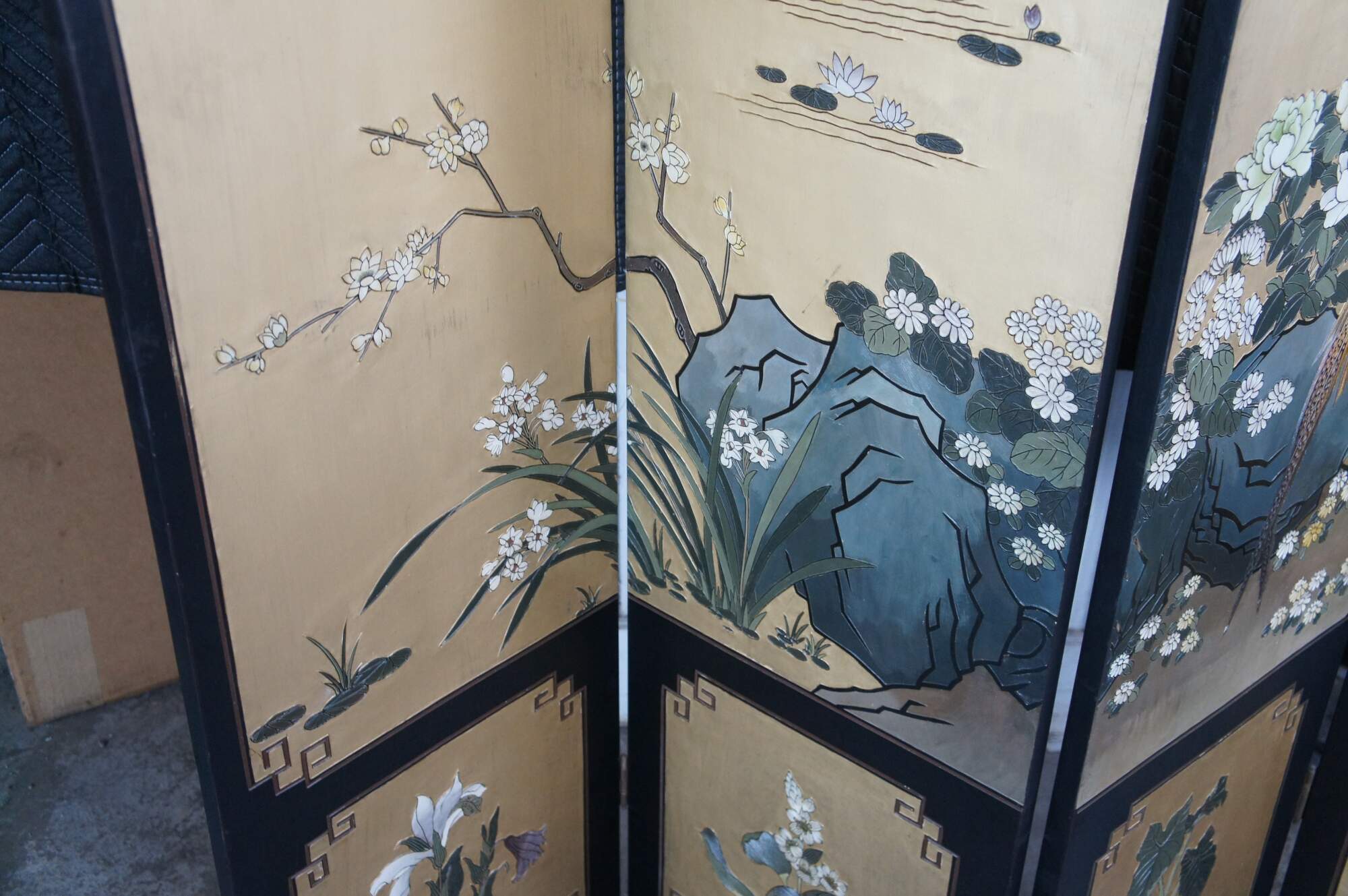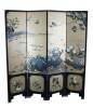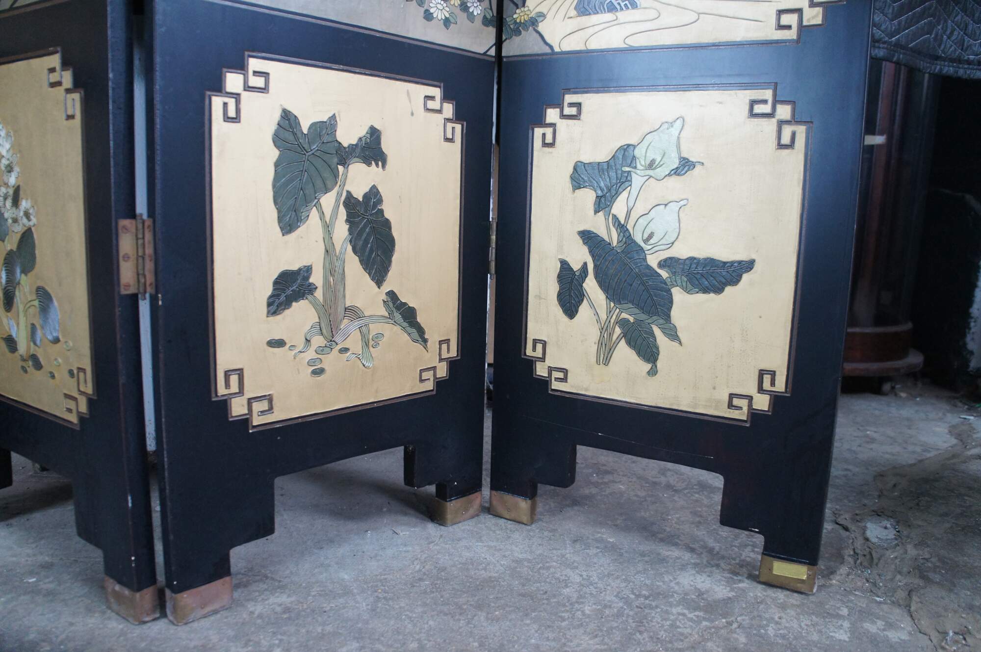 Late 20th Century Chinoiserie Four Panel Folding Screen / Room Divider. Features a black lacquer frame with a painted landscape showcasing a mountainous backdrop with flowers and birds. Verso is black and gold with separate floral framed designs. The base / feet are metal wrapped with a gold finish.