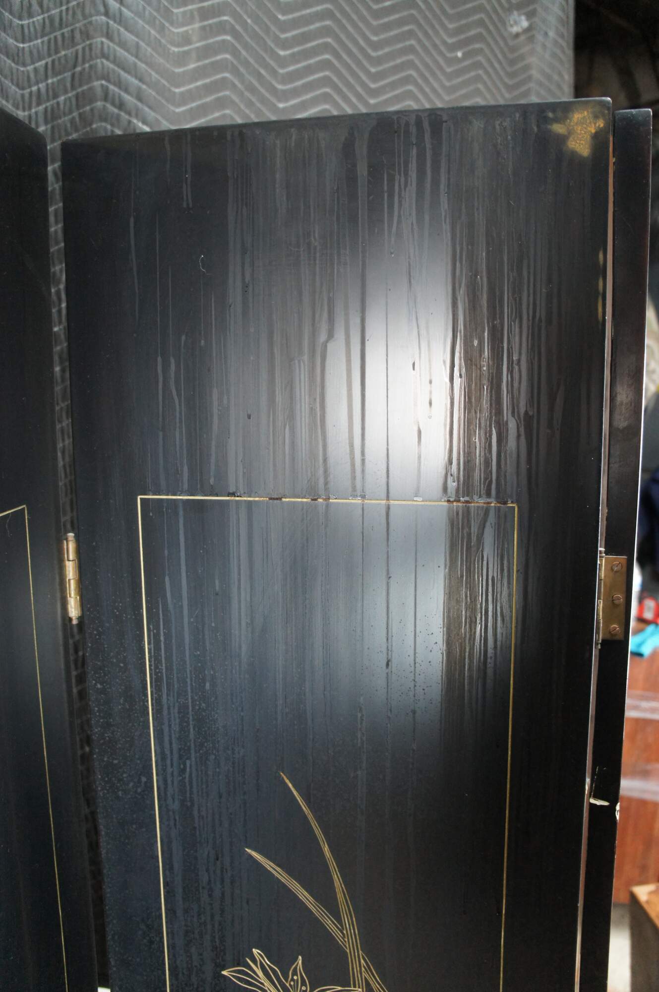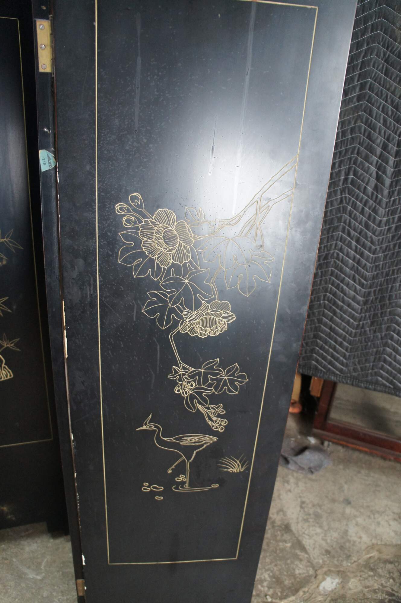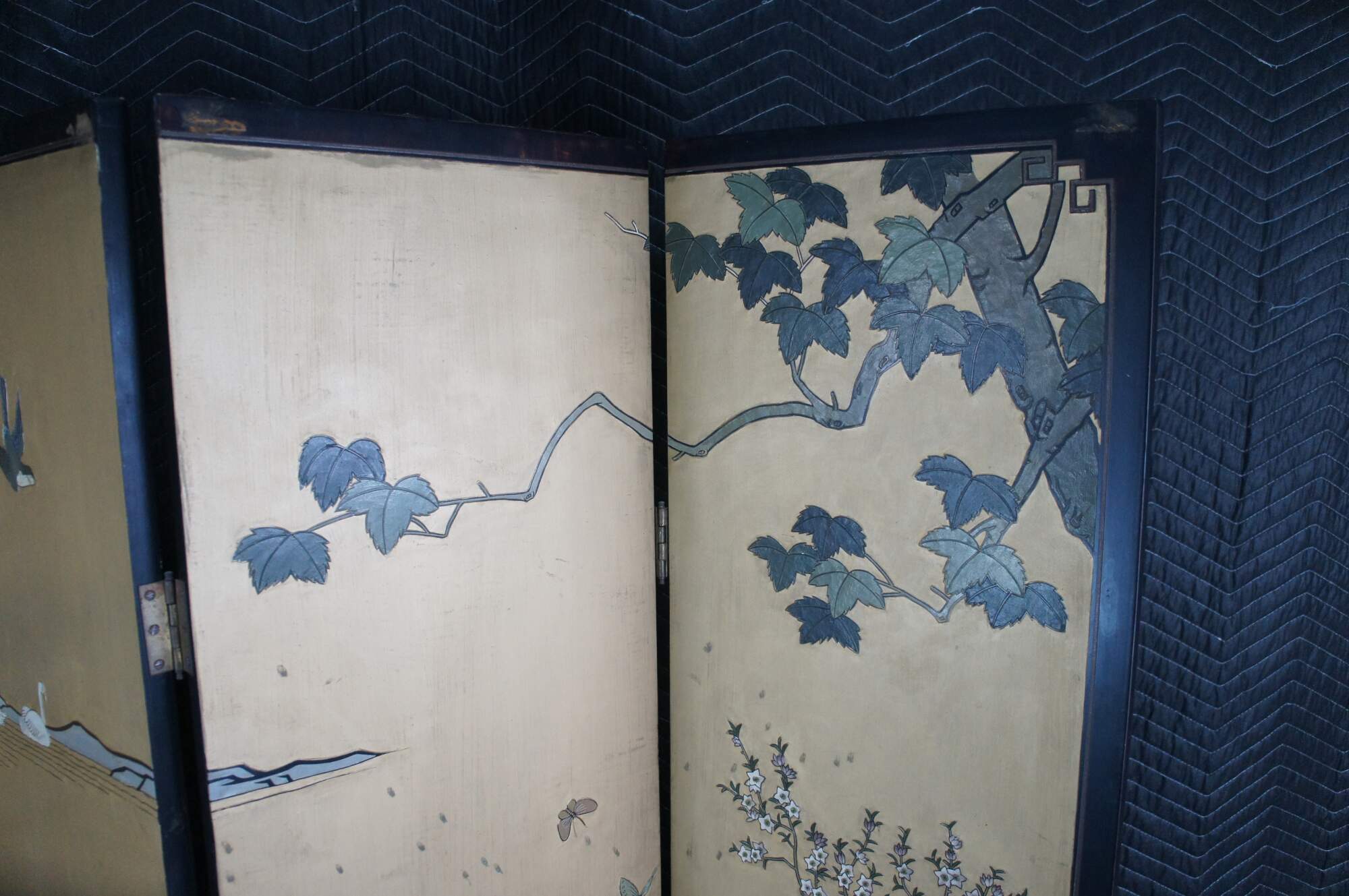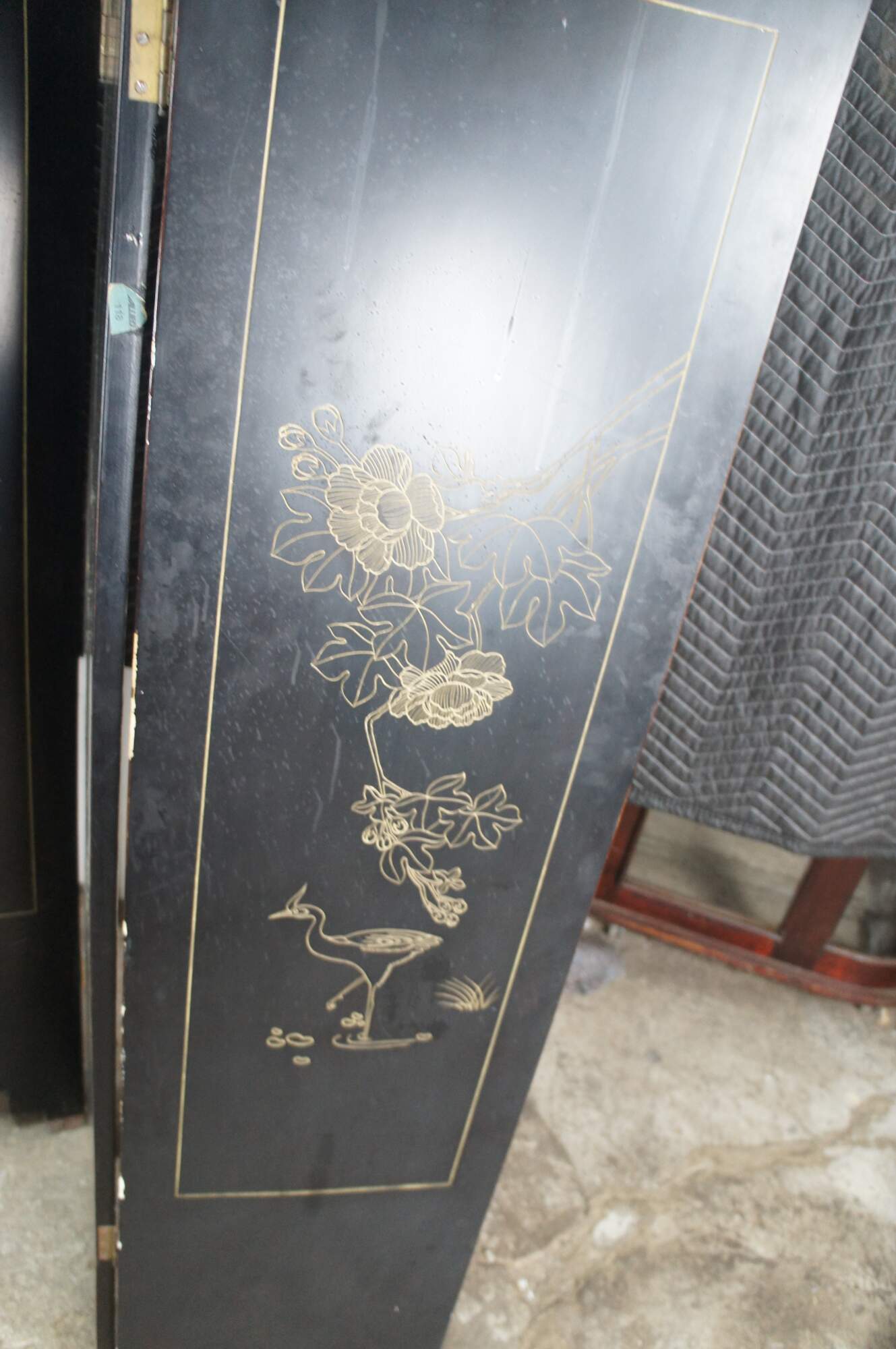 Late 20th Century Chinoiserie Four Panel Folding Screen / Room Divider. Features a black lacquer frame with a painted landscape showcasing a mountainous backdrop with flowers and birds. Verso is black and gold with separate floral framed designs. The base / feet are metal wrapped with a gold finish.