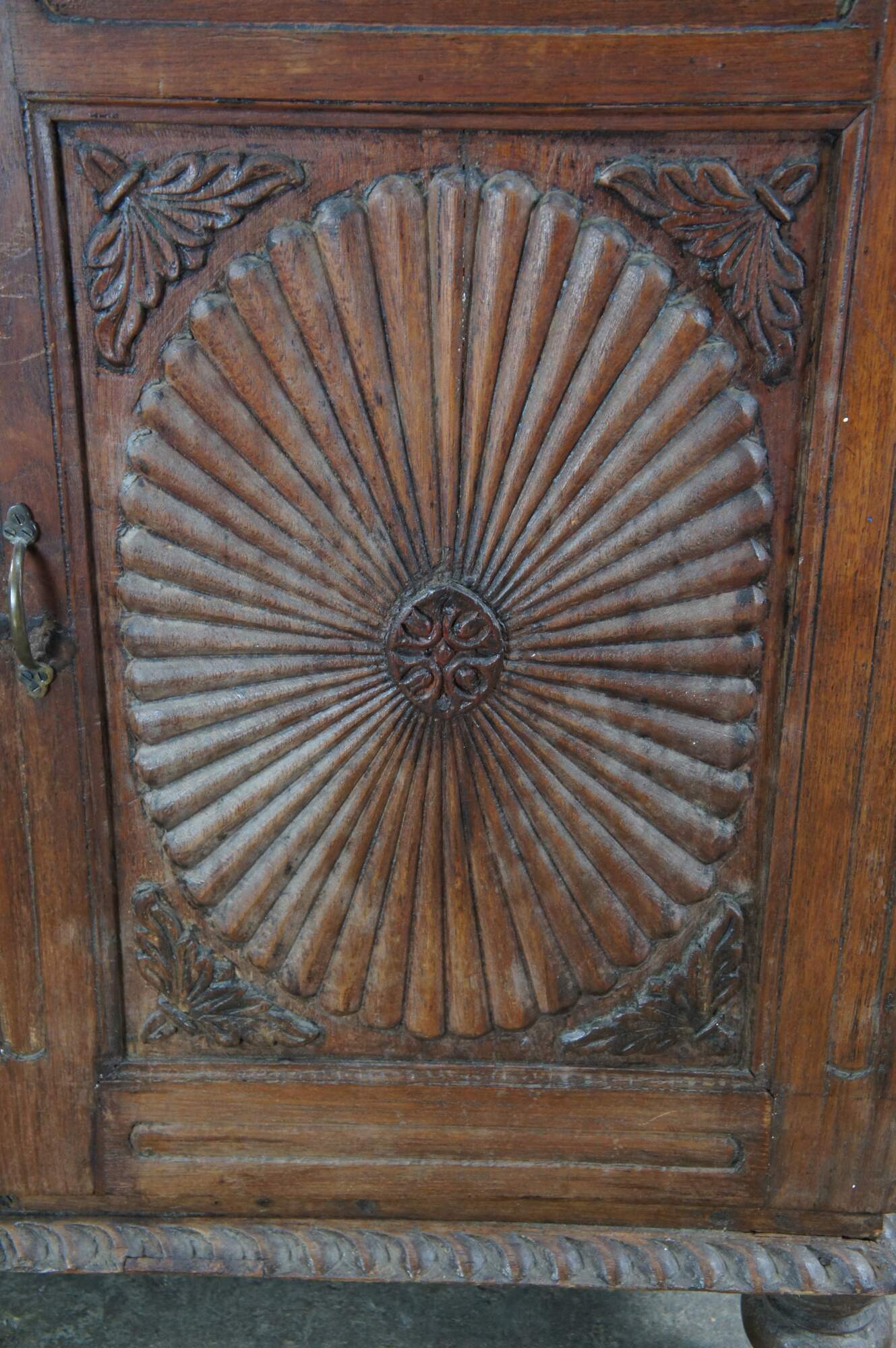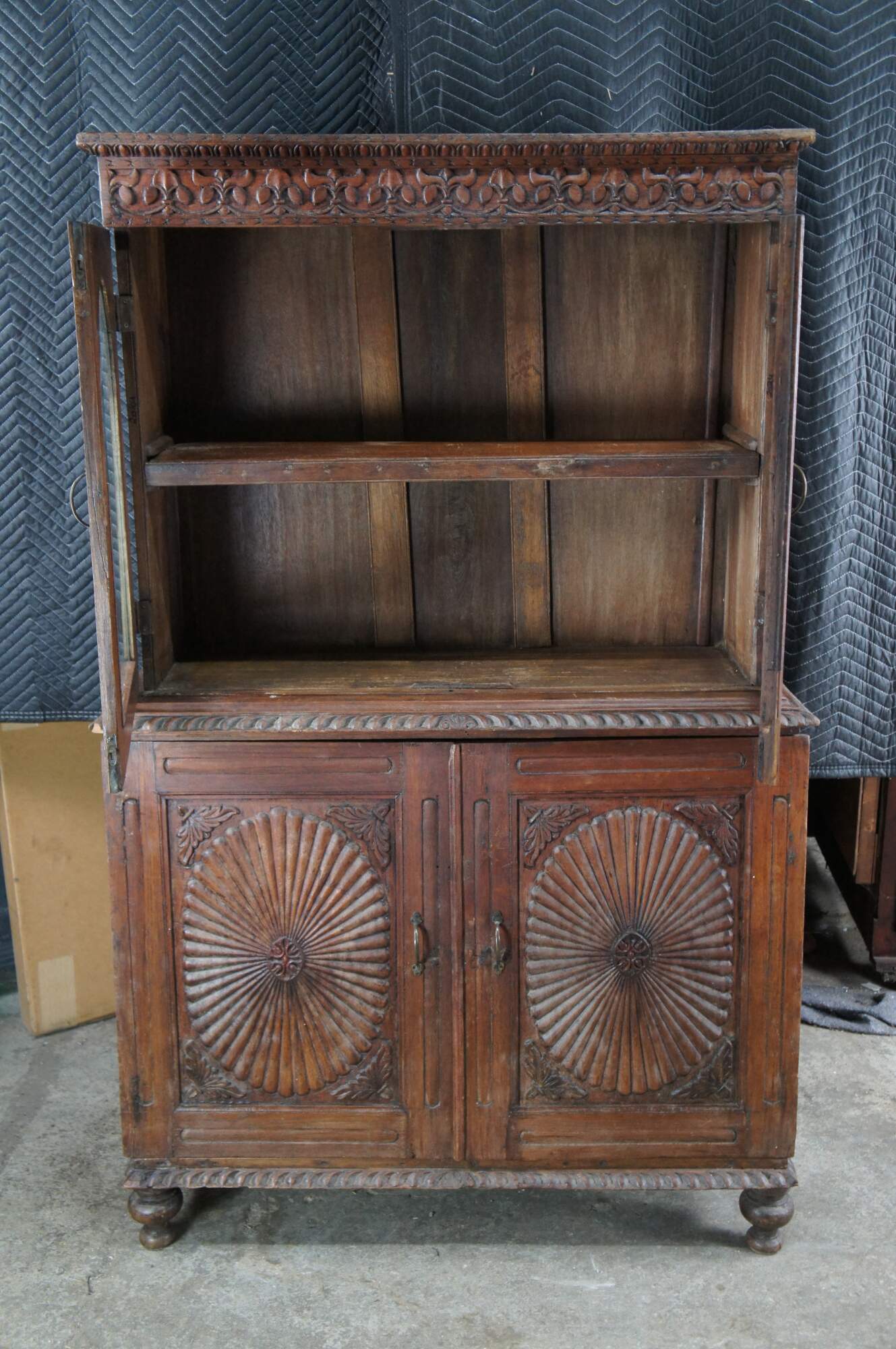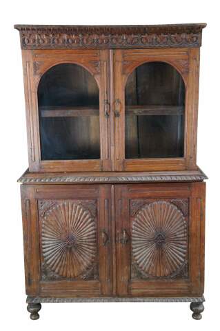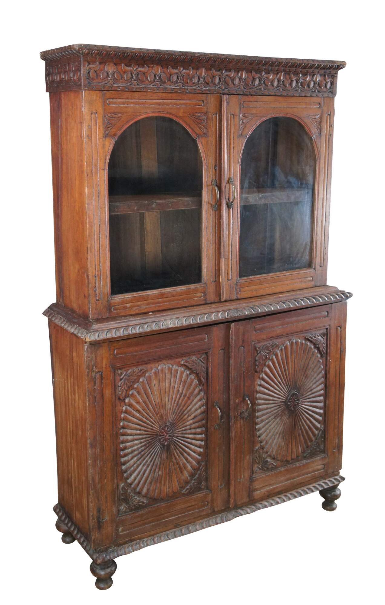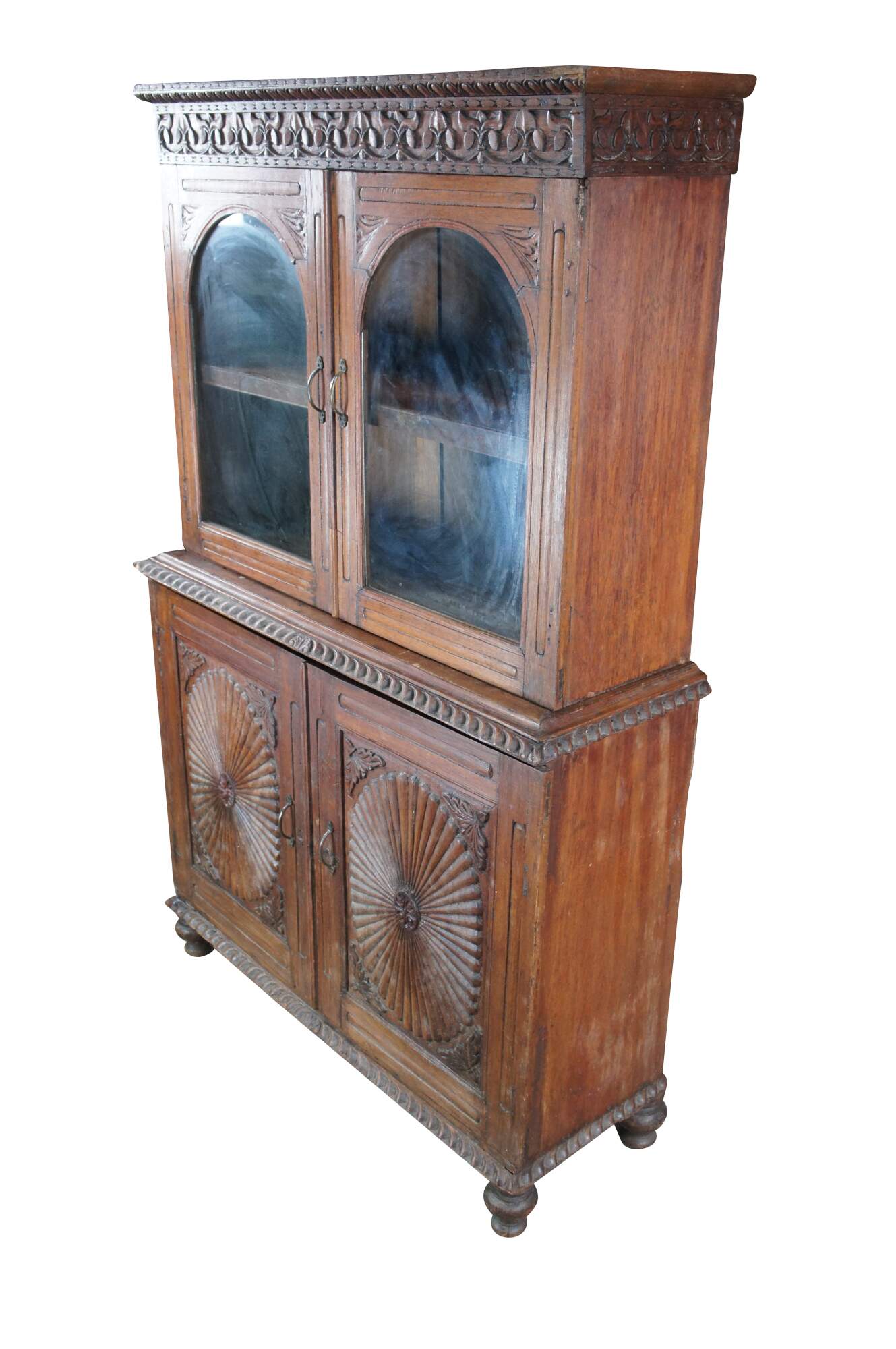 An exceptional antique 19th century Anglo-Indian British Colonial Bookcase, China Cabinet or linen press. Made from teak with an Egg and Dart Foliate carved and molded top, featuring arcaded glass front doors opening to a central shelf over a large base with sunburst style carved doors opening to one shelf. The case is supported by turned toupie bun feet.