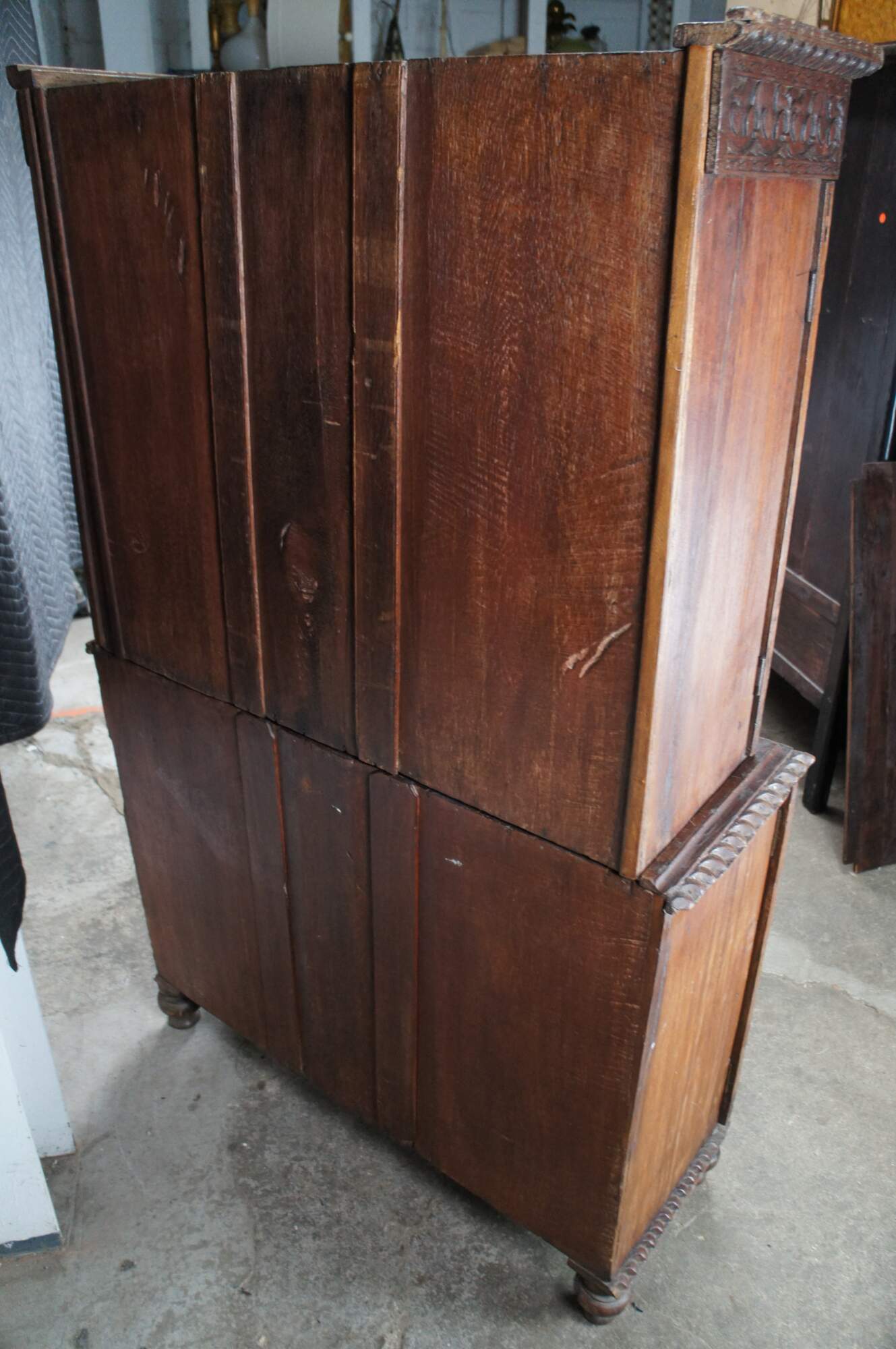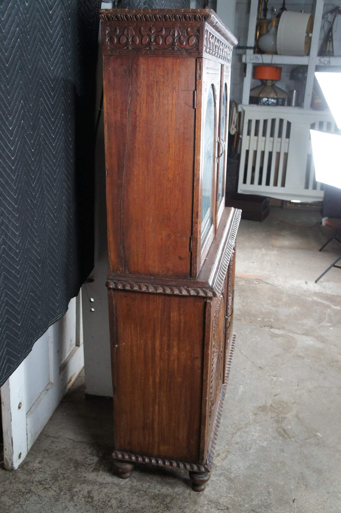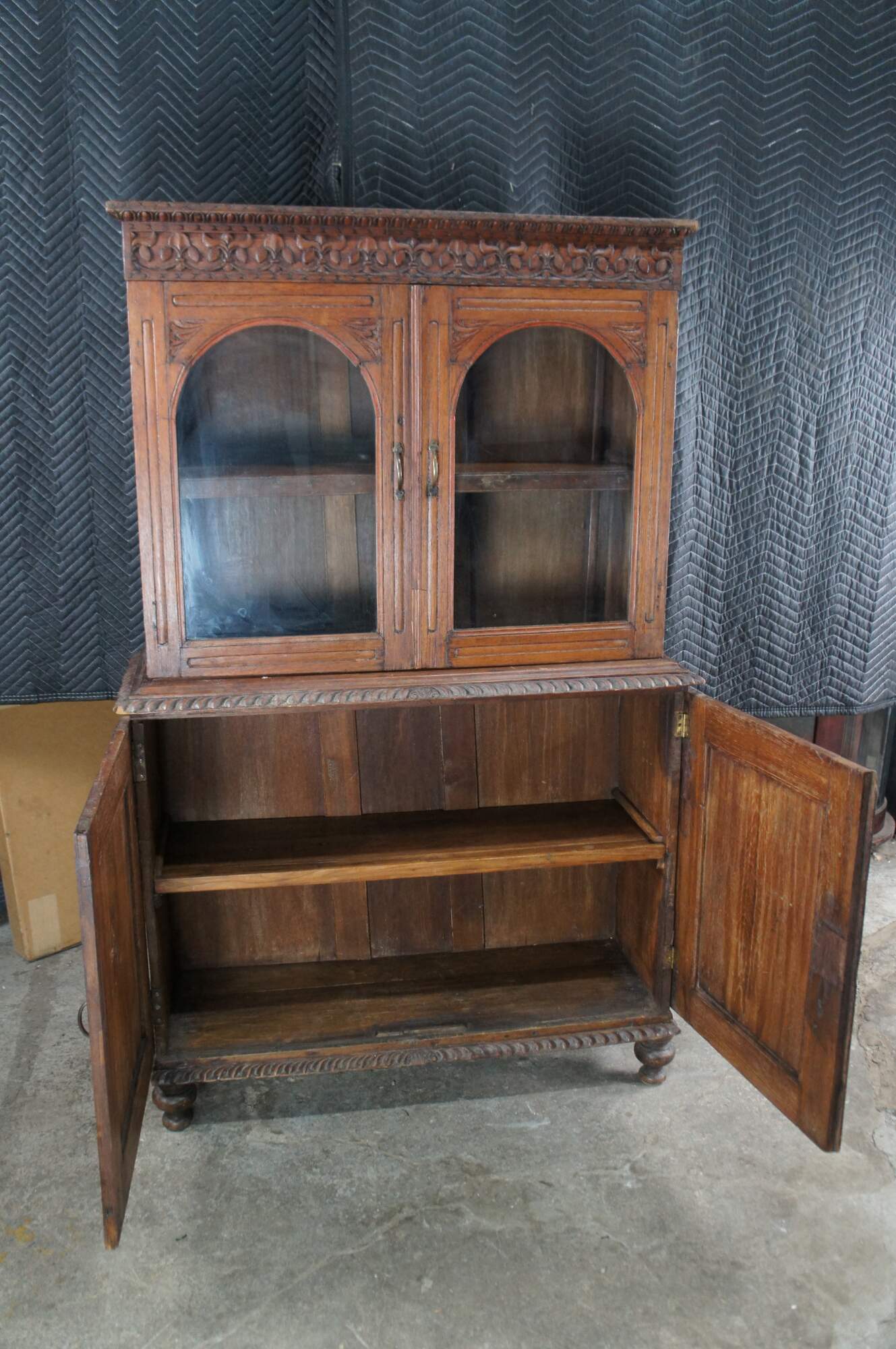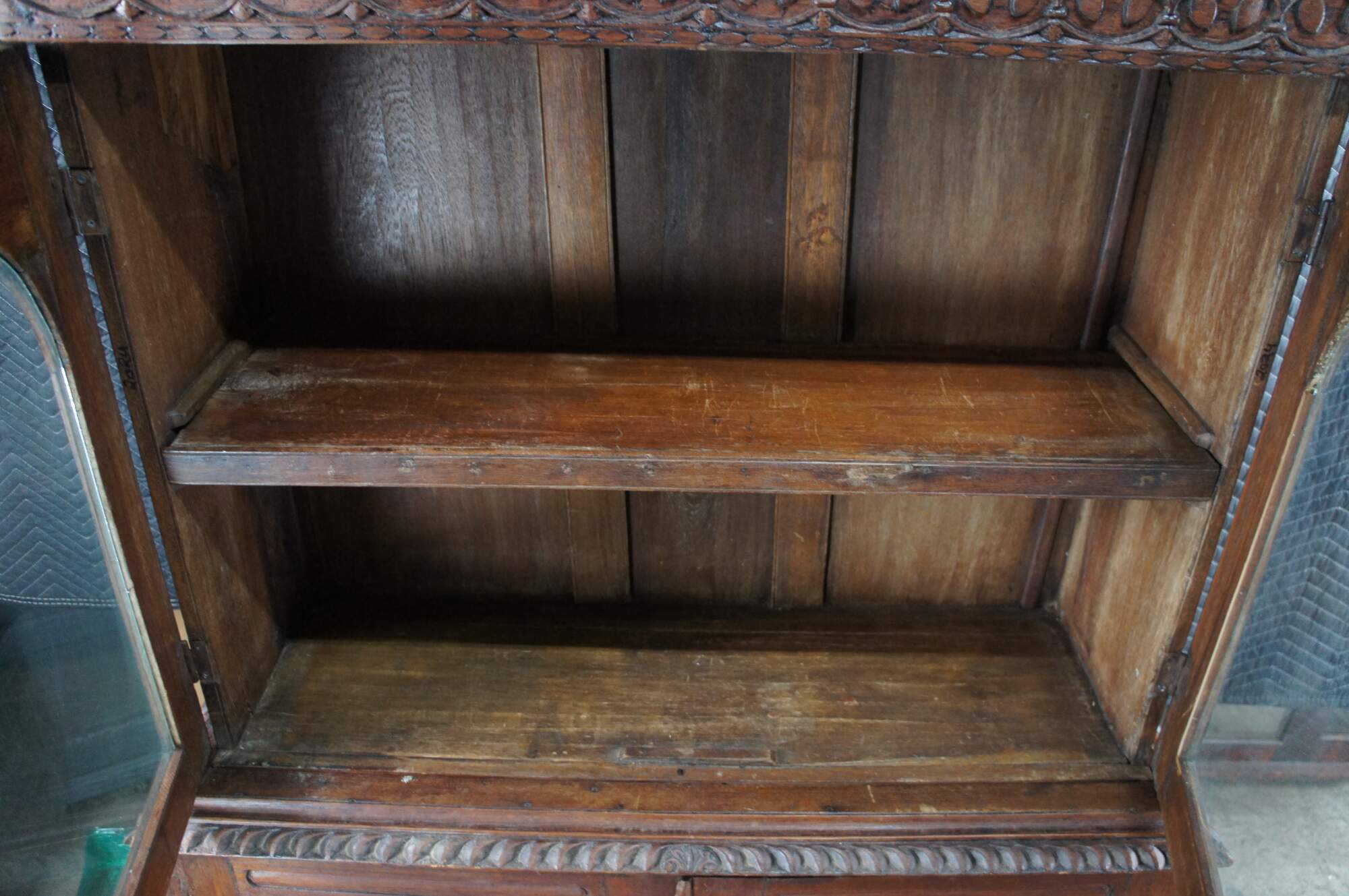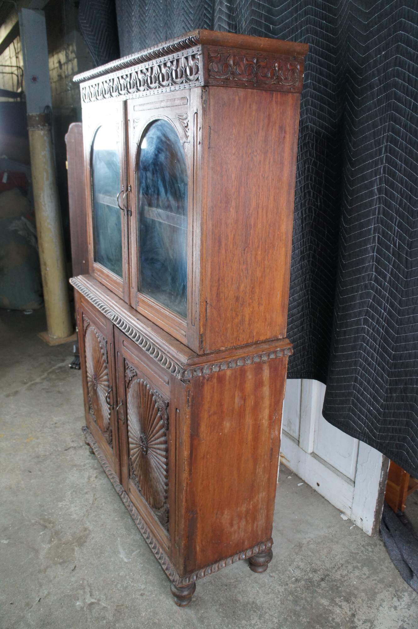An exceptional antique 19th century Anglo-Indian British Colonial Bookcase, China Cabinet or linen press. Made from teak with an Egg and Dart Foliate carved and molded top, featuring arcaded glass front doors opening to a central shelf over a large base with sunburst style carved doors opening to one shelf. The case is supported by turned toupie bun feet.