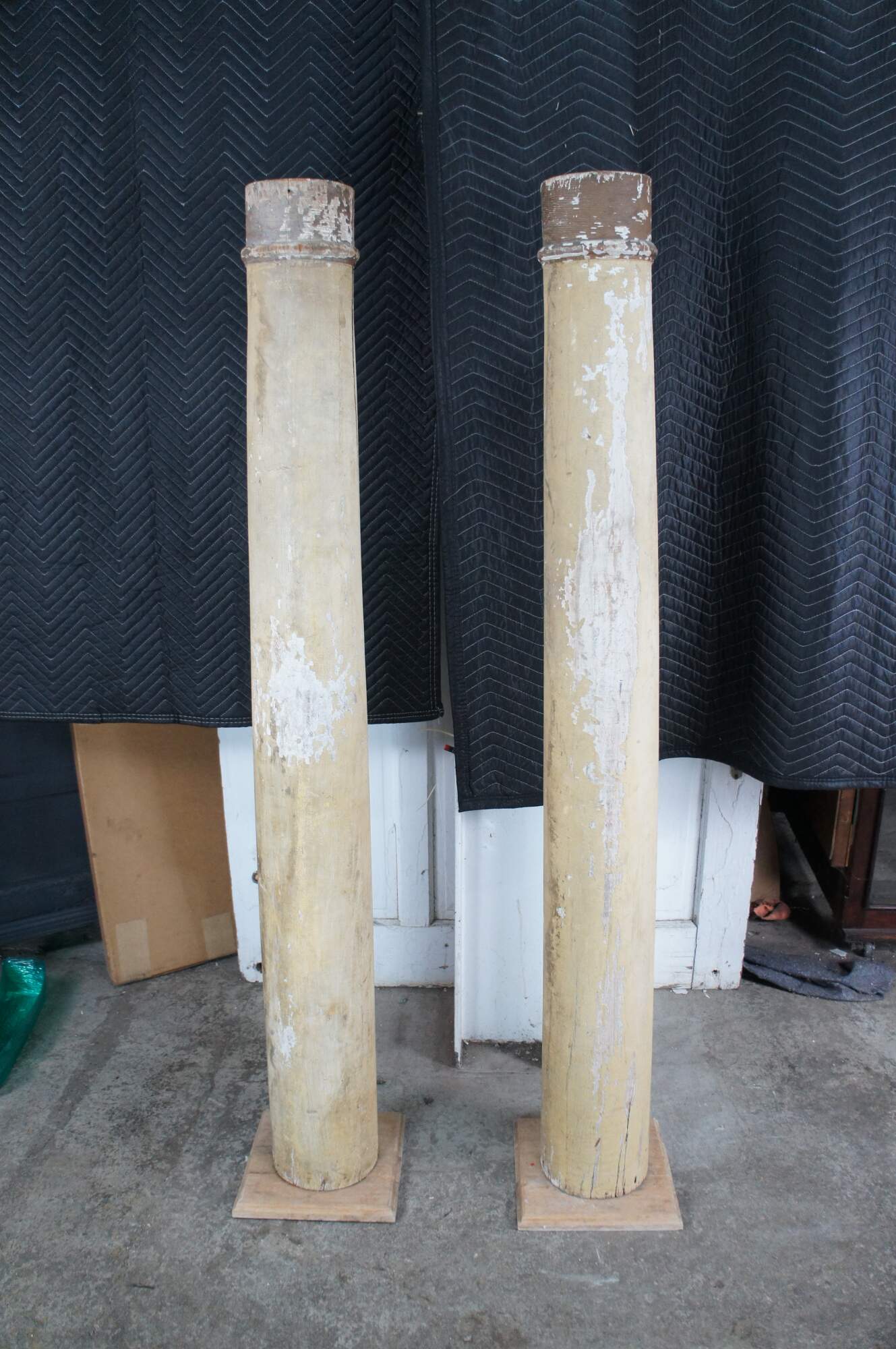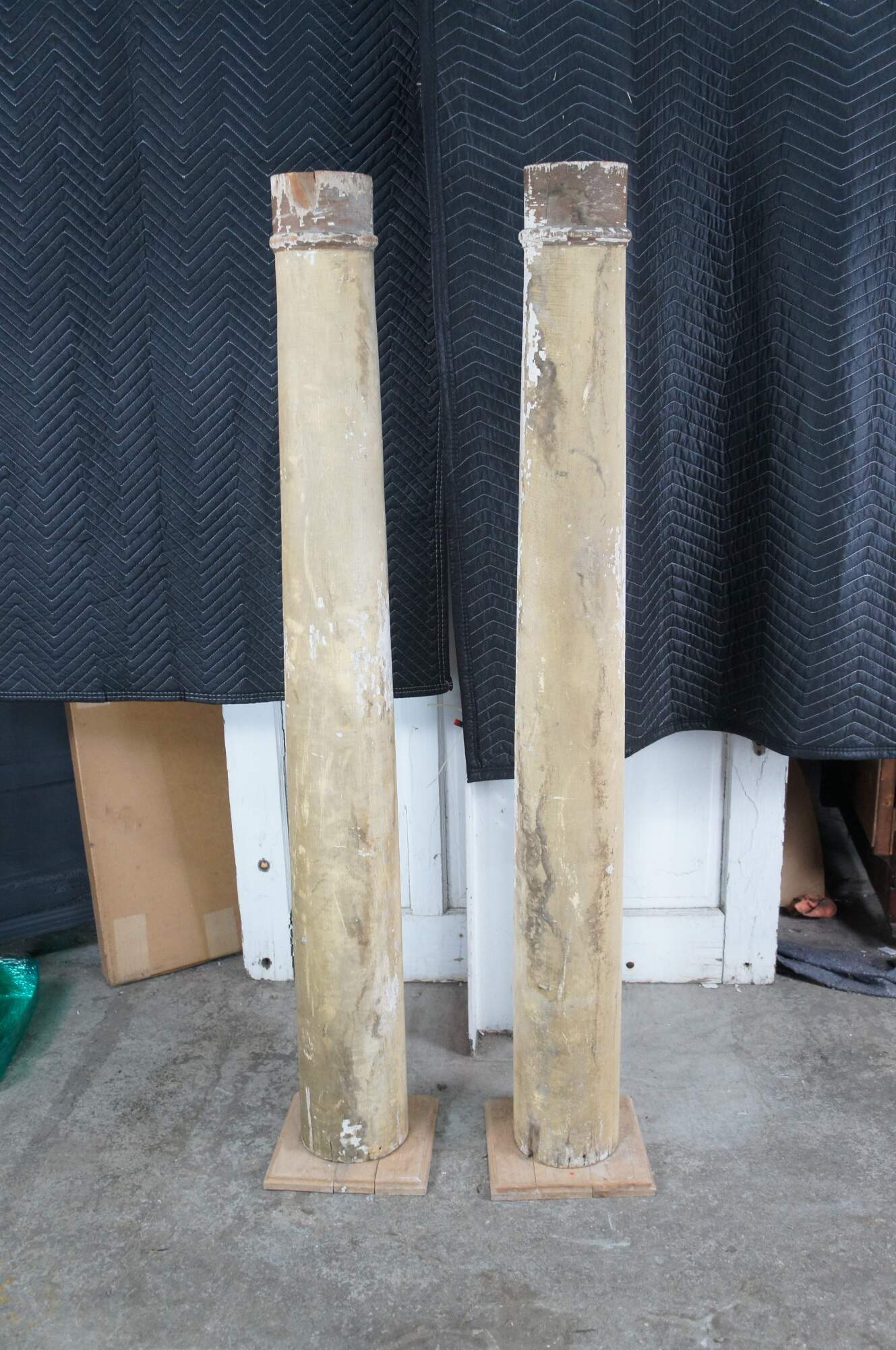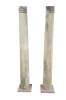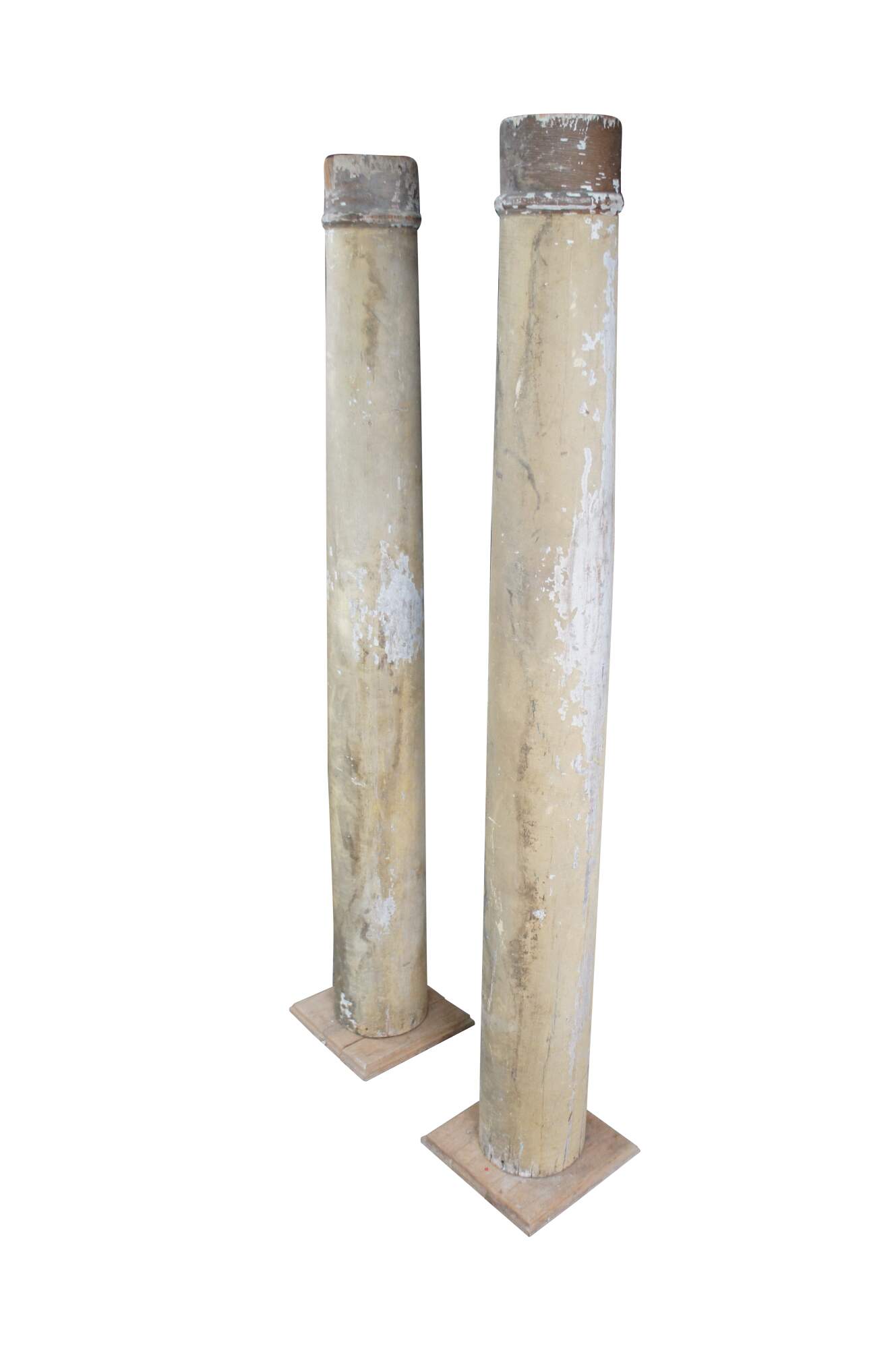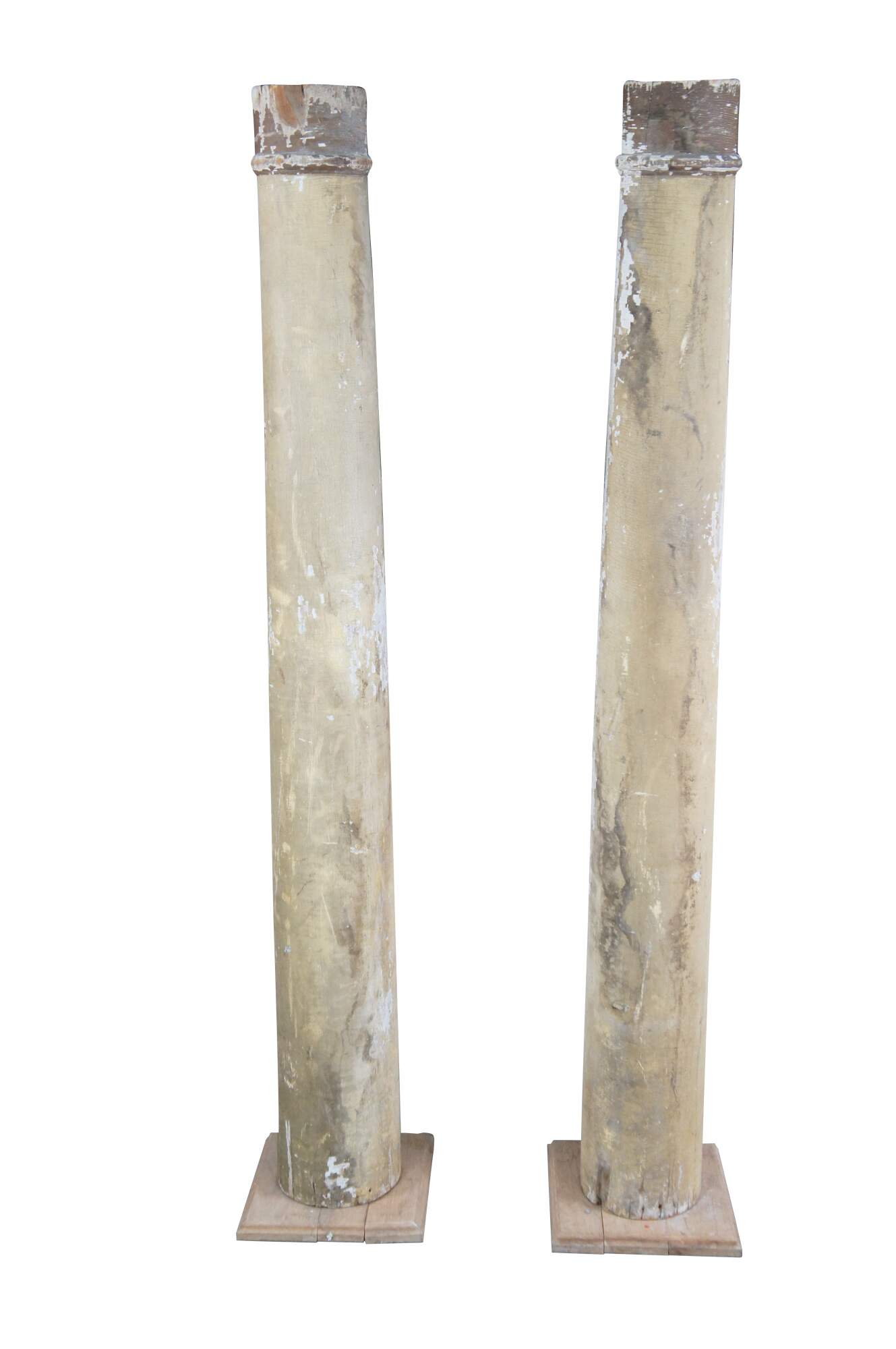 Pair of decorative reclaimed columns on plinth bases. Made from hardwood with a naturally aged painted patina showing crazing and finish loss. Great for display in any space.