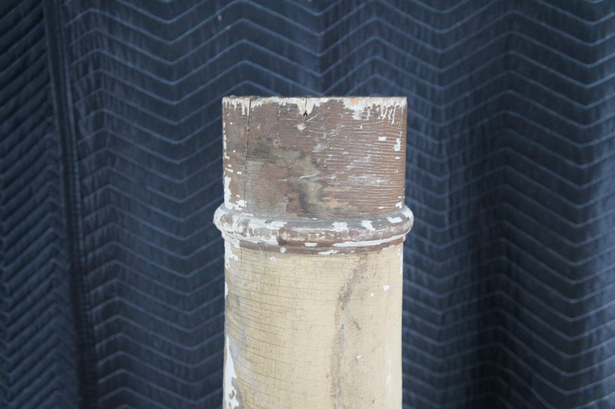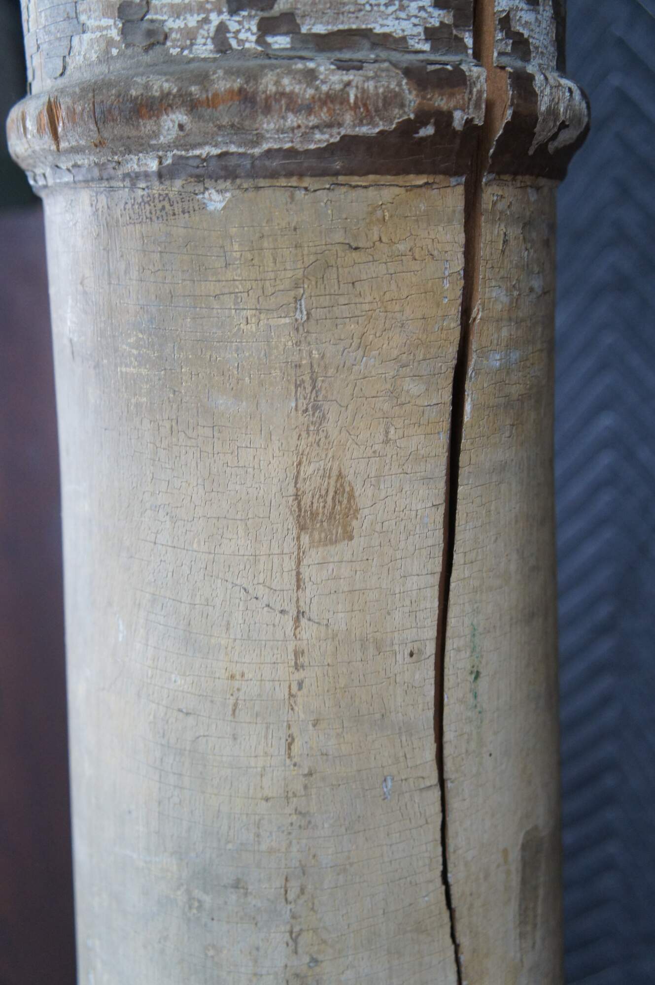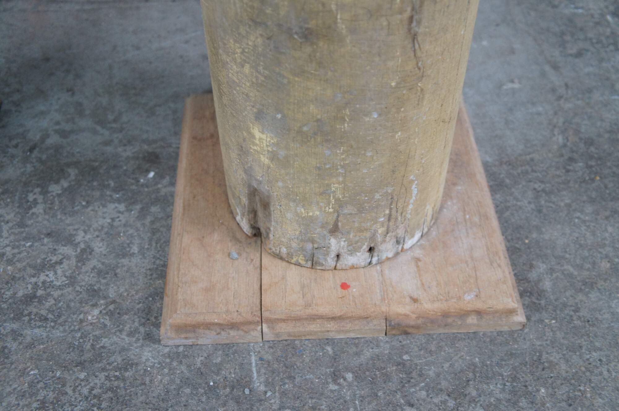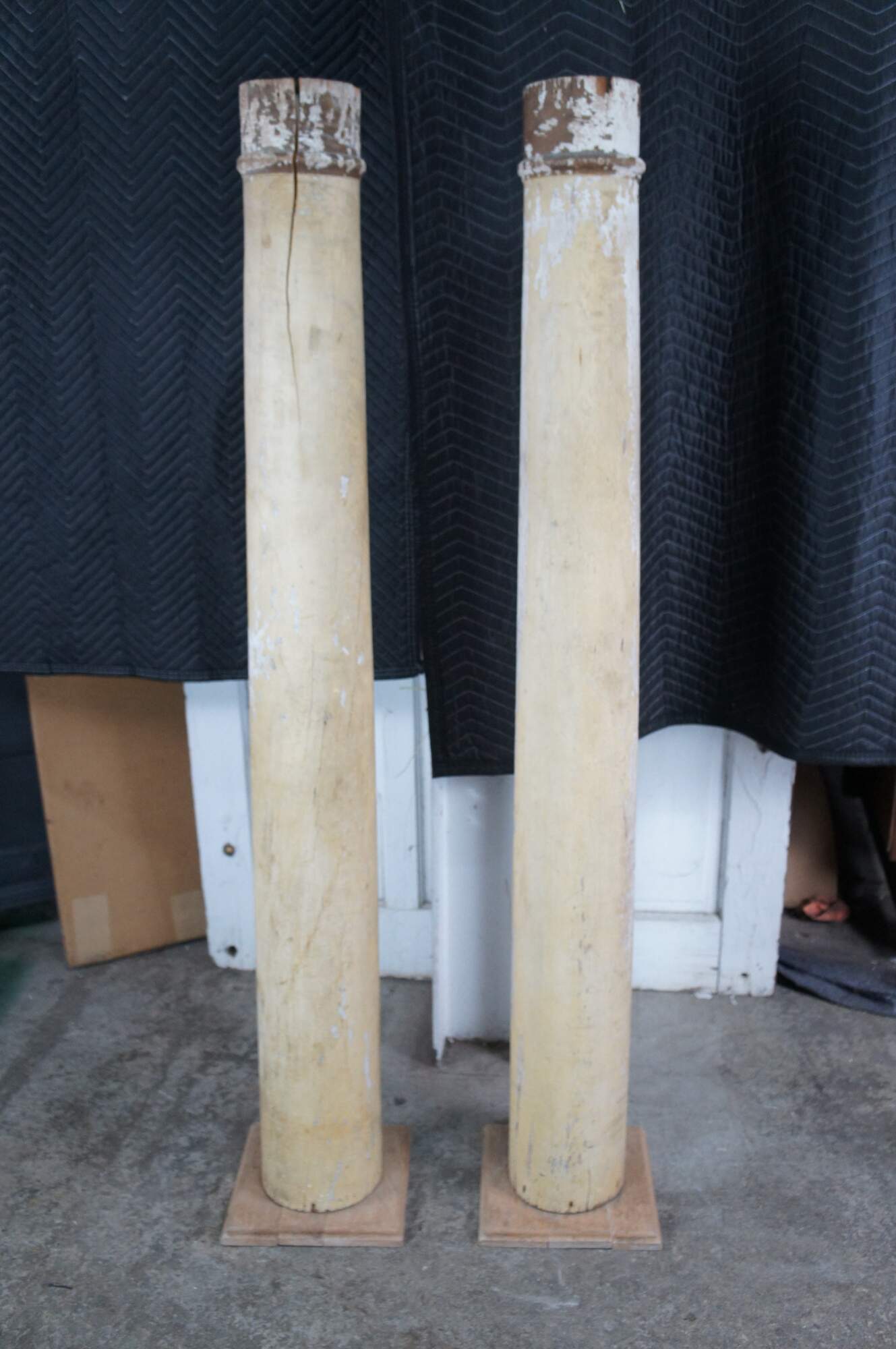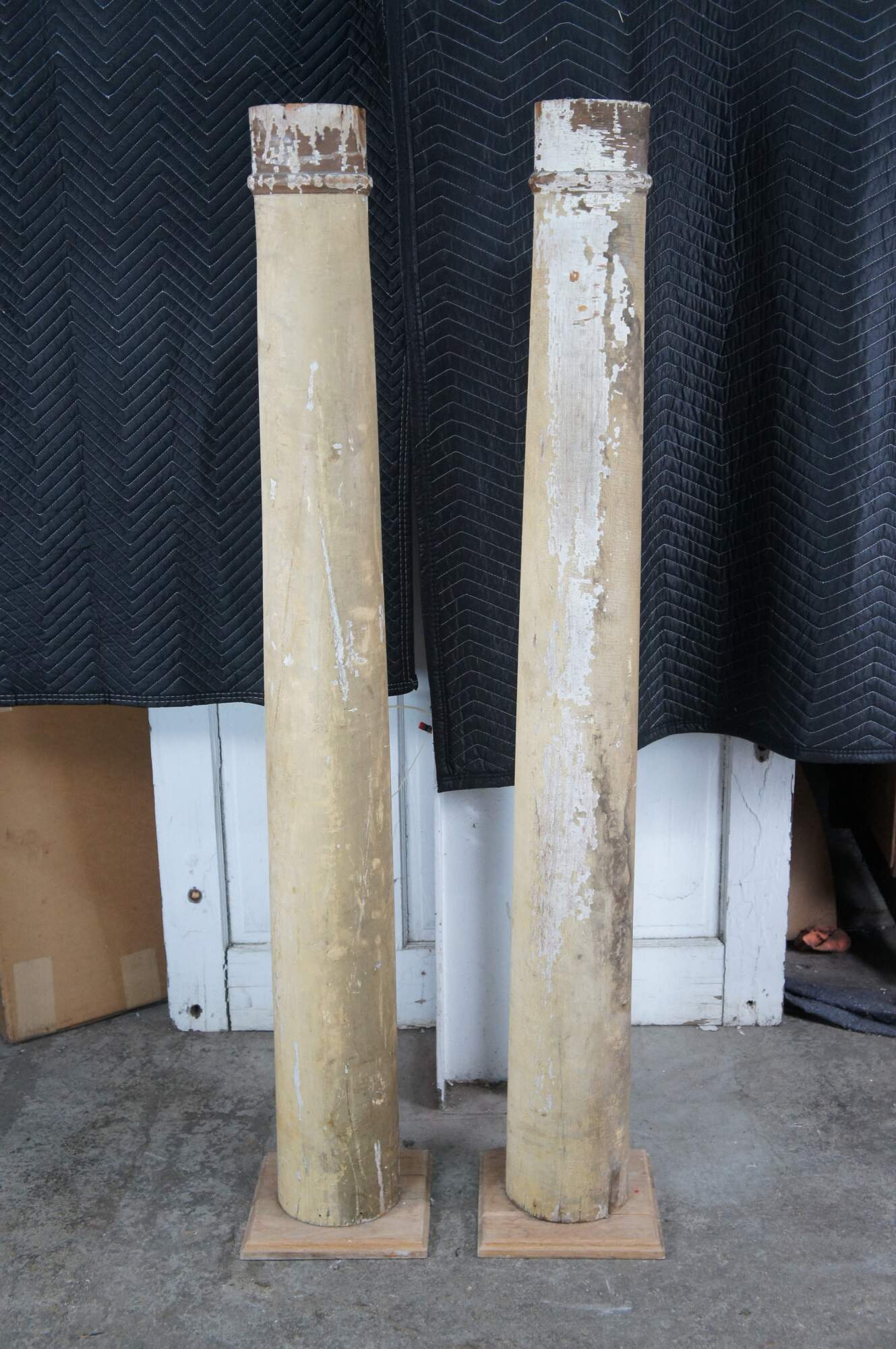 Pair of decorative reclaimed columns on plinth bases. Made from hardwood with a naturally aged painted patina showing crazing and finish loss. Great for display in any space.