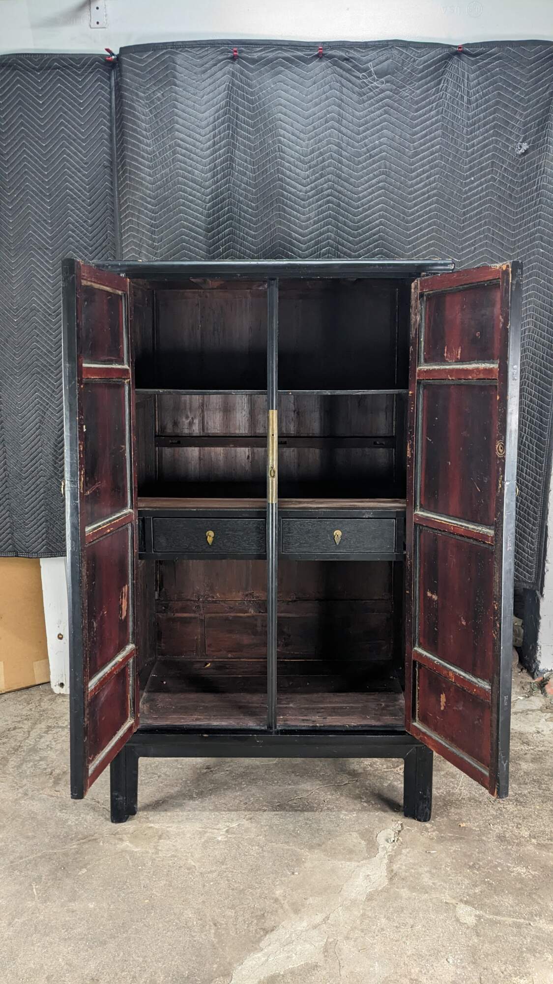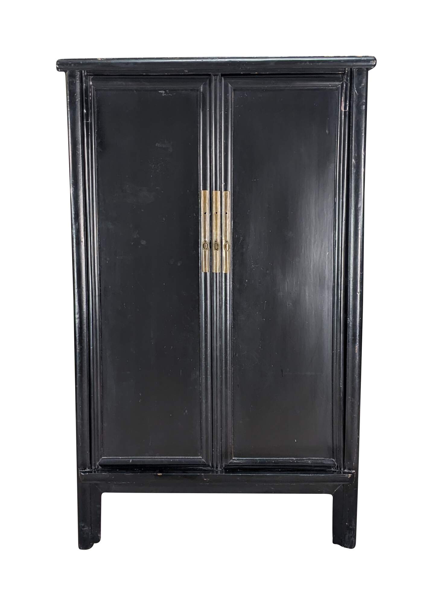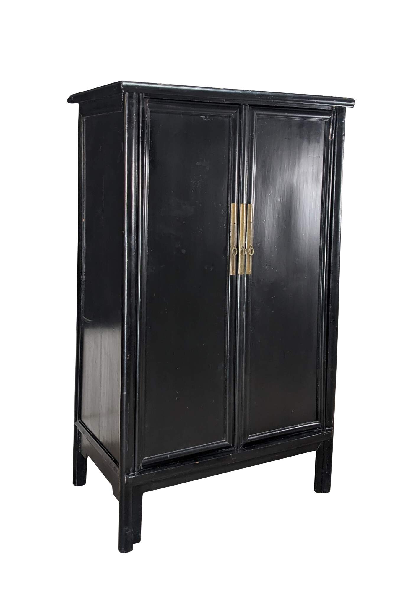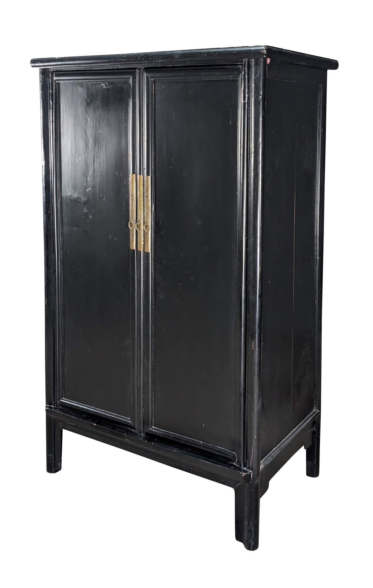 An Antique Chinese Qing Dynasty Wedding Cabinet. Features an elm frame with mortise and tenon construction and a black lacquer finish with brass hardware. Opens to two interior shelves and two dovetailed drawers. Traditional Ming styling with peg legged base.