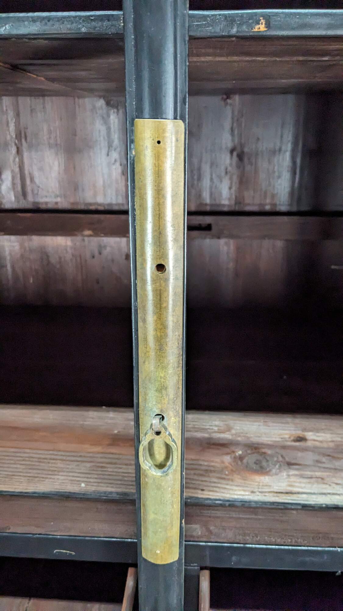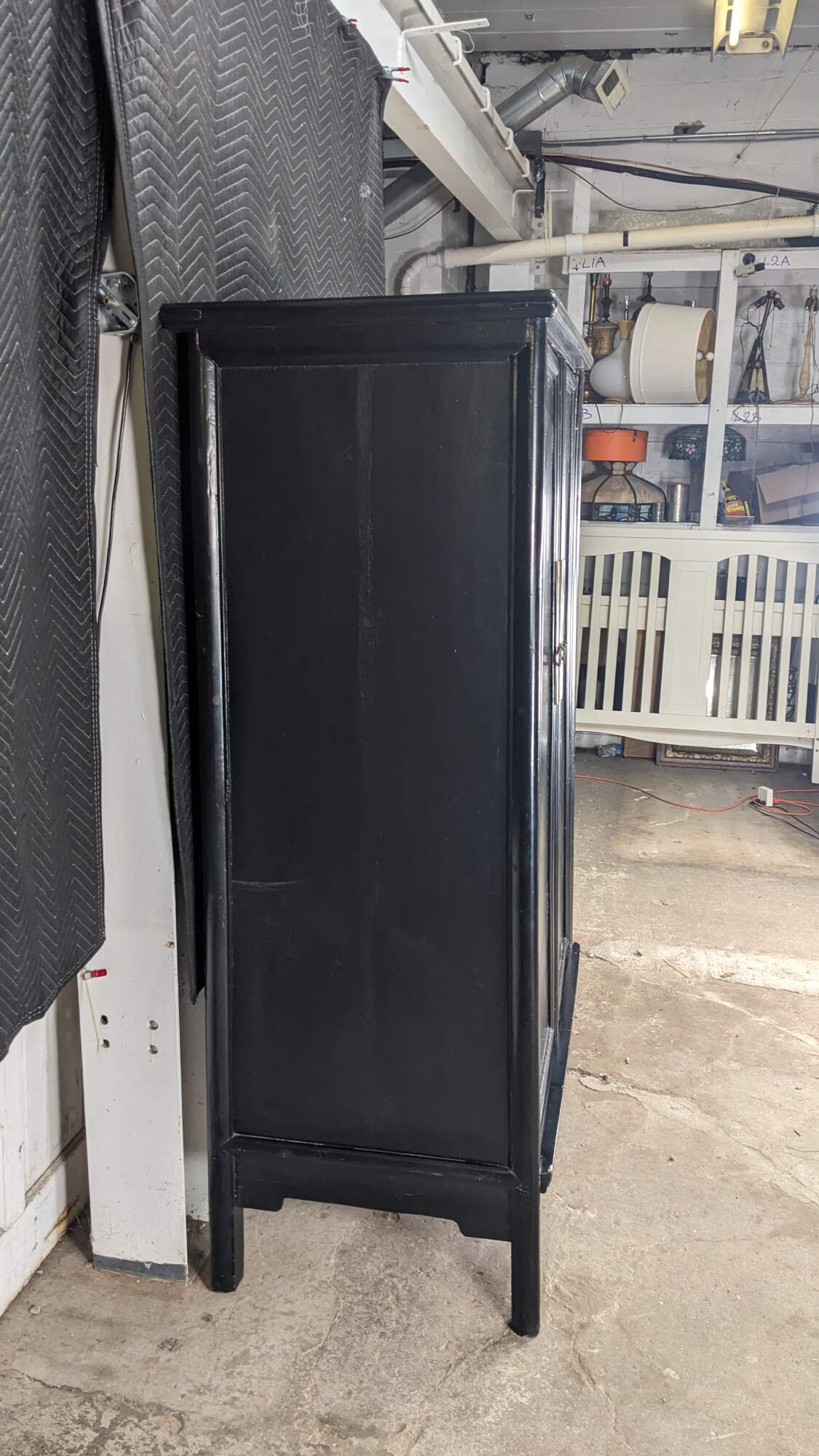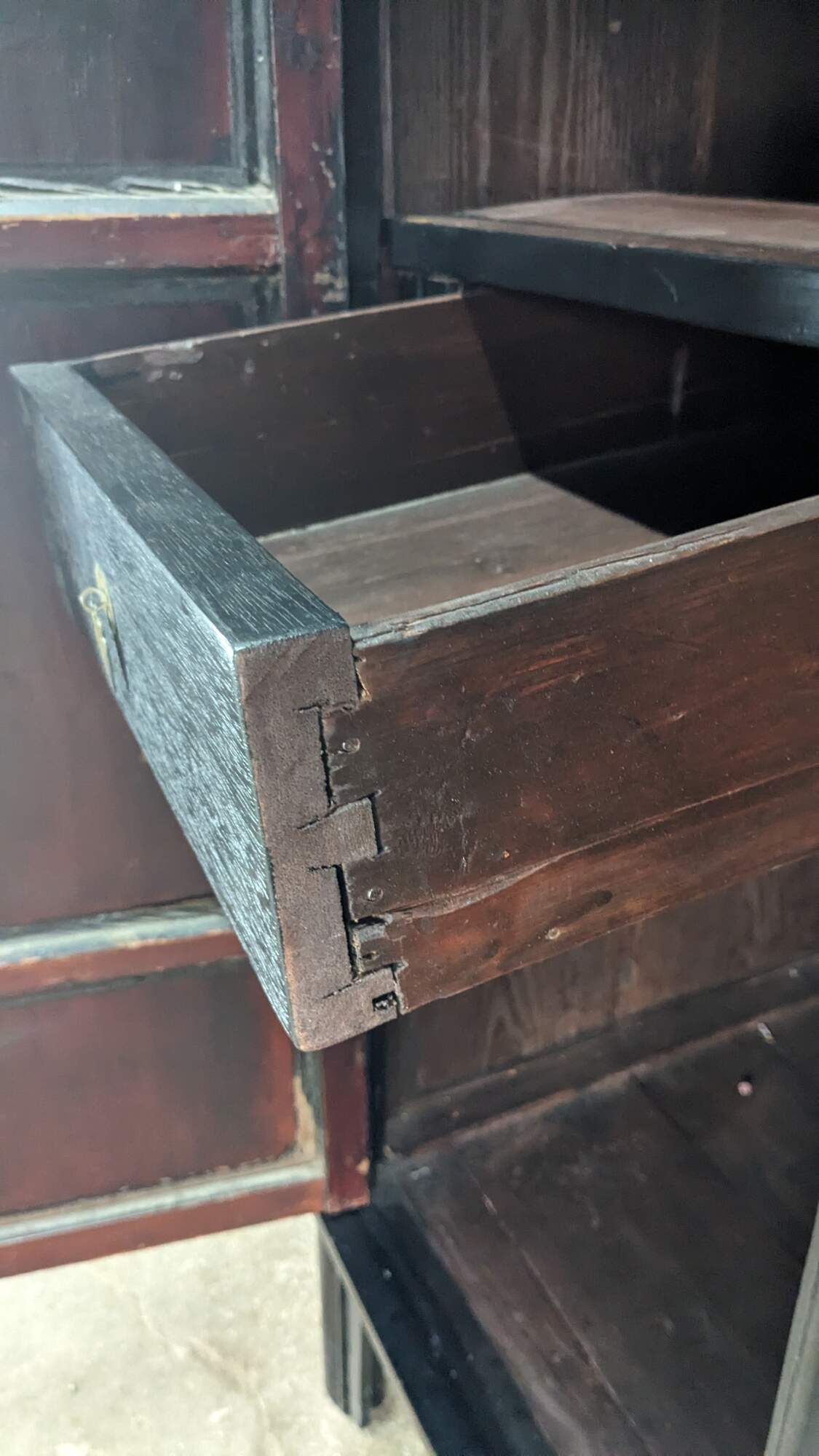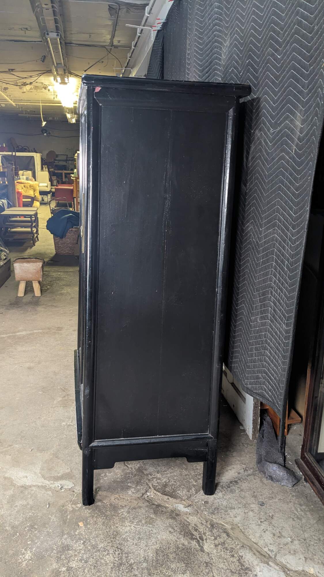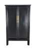An Antique Chinese Qing Dynasty Wedding Cabinet. Features an elm frame with mortise and tenon construction and a black lacquer finish with brass hardware. Opens to two interior shelves and two dovetailed drawers. Traditional Ming styling with peg legged base.