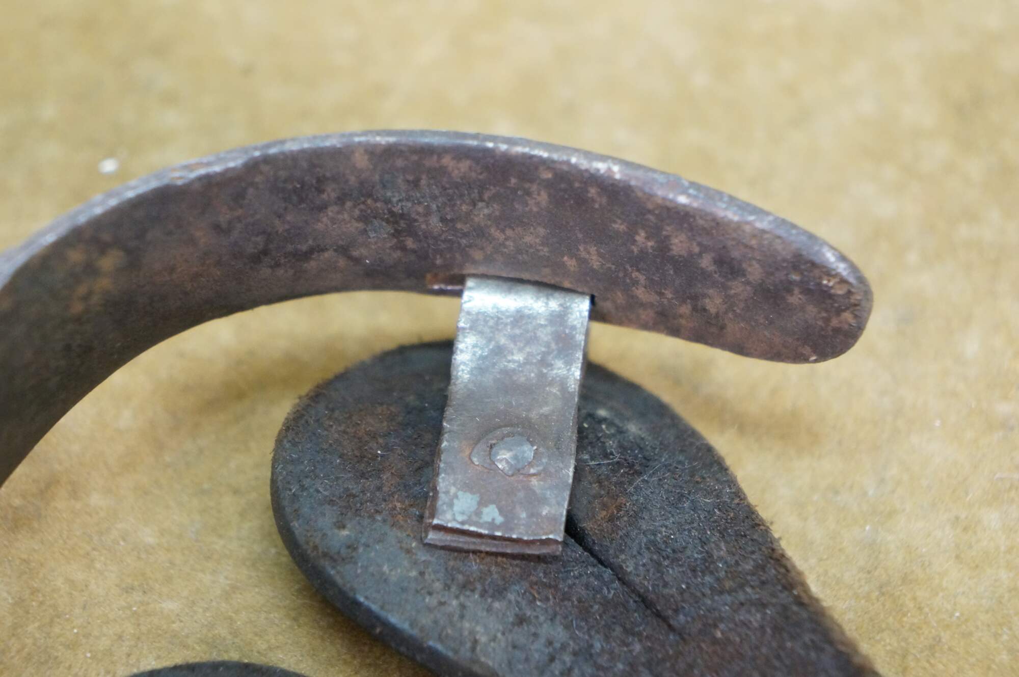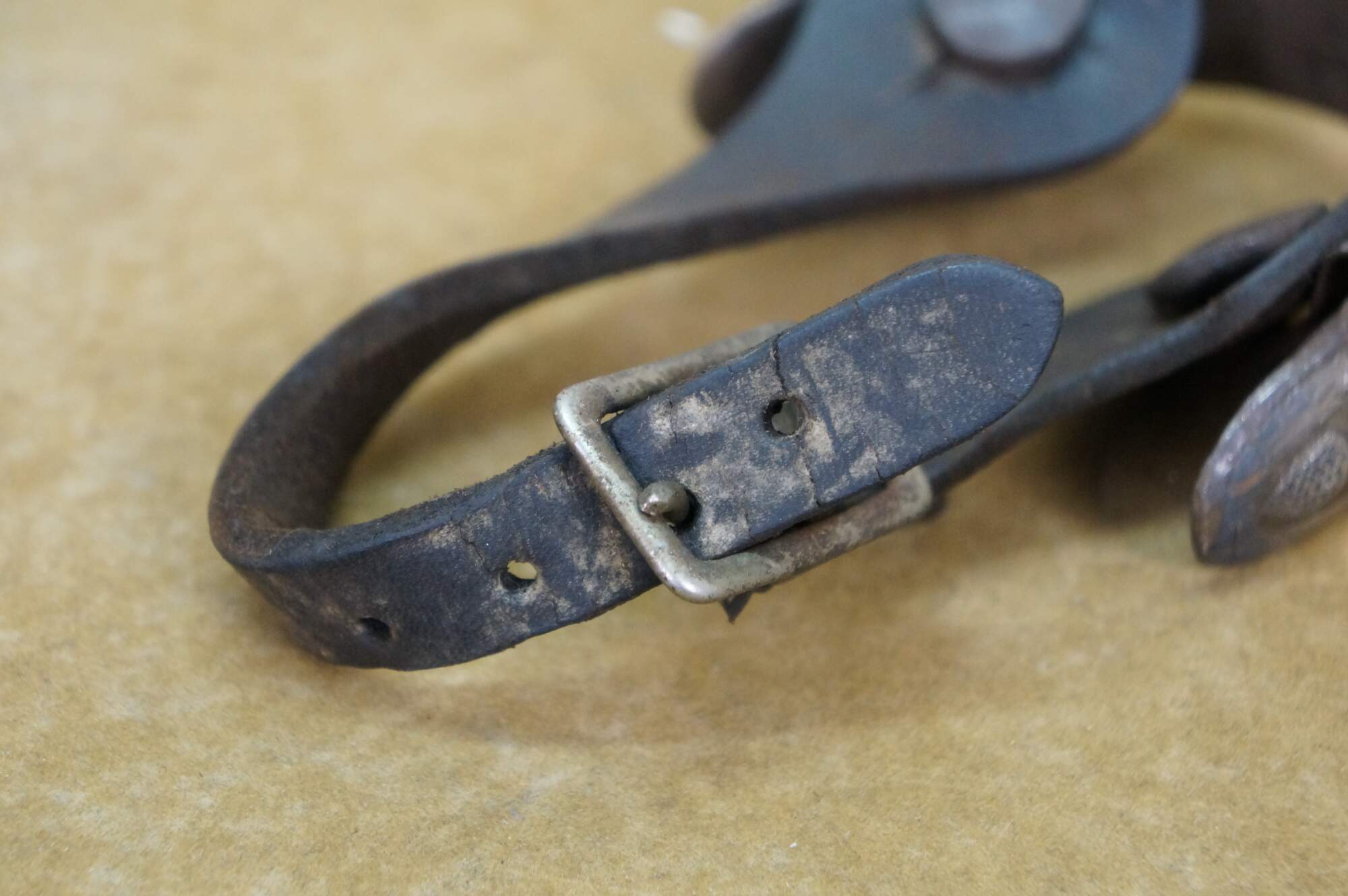 Antique Western / Southwestern Mexican Spanish Cowboy equestrian / horseshoe Charro spurs made of wrought iron with copper inlay and leather straps.