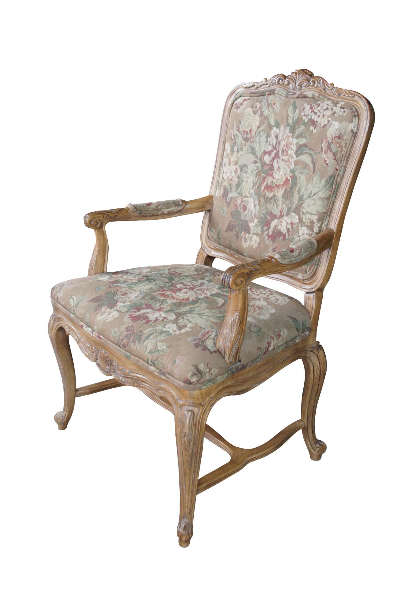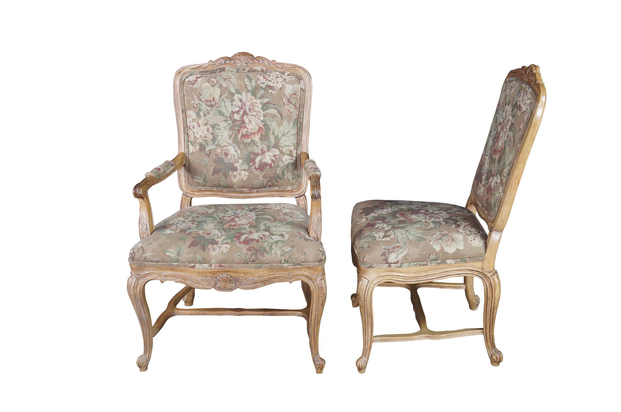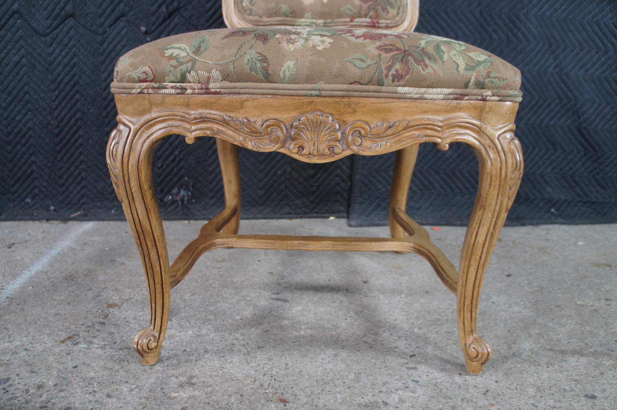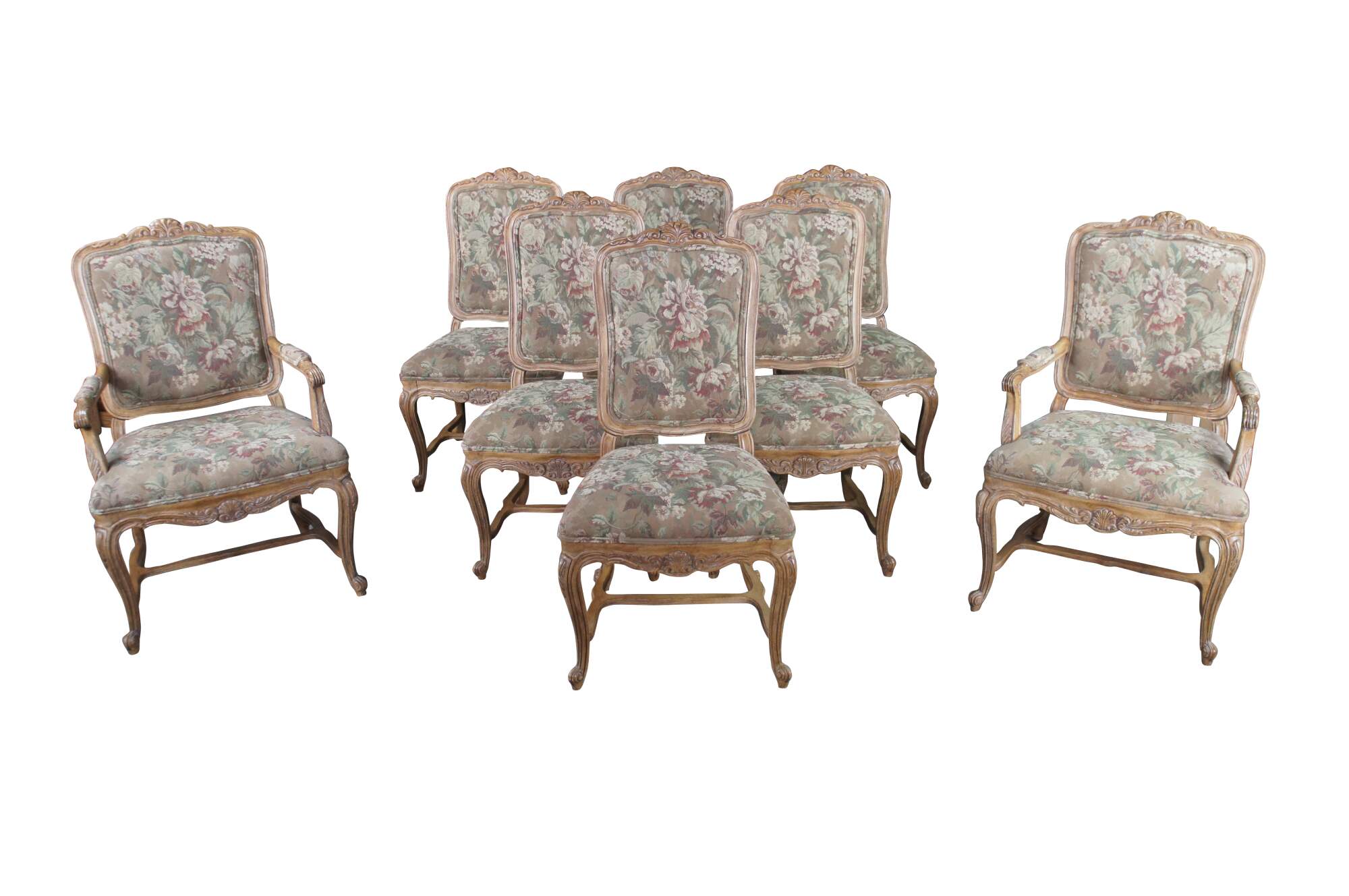 8 Vintage Drexel Heritage #372-960 Dining Chairs, Circa 1991. Features a carved walnut finish in Louis XVI styling with Aubusson style fabric and double cording. The chairs showcase an elegant finish with acanthus carved crest rail, Fauteuil arms, carved lower aprons and cabriole legs leading to scrolled feet.