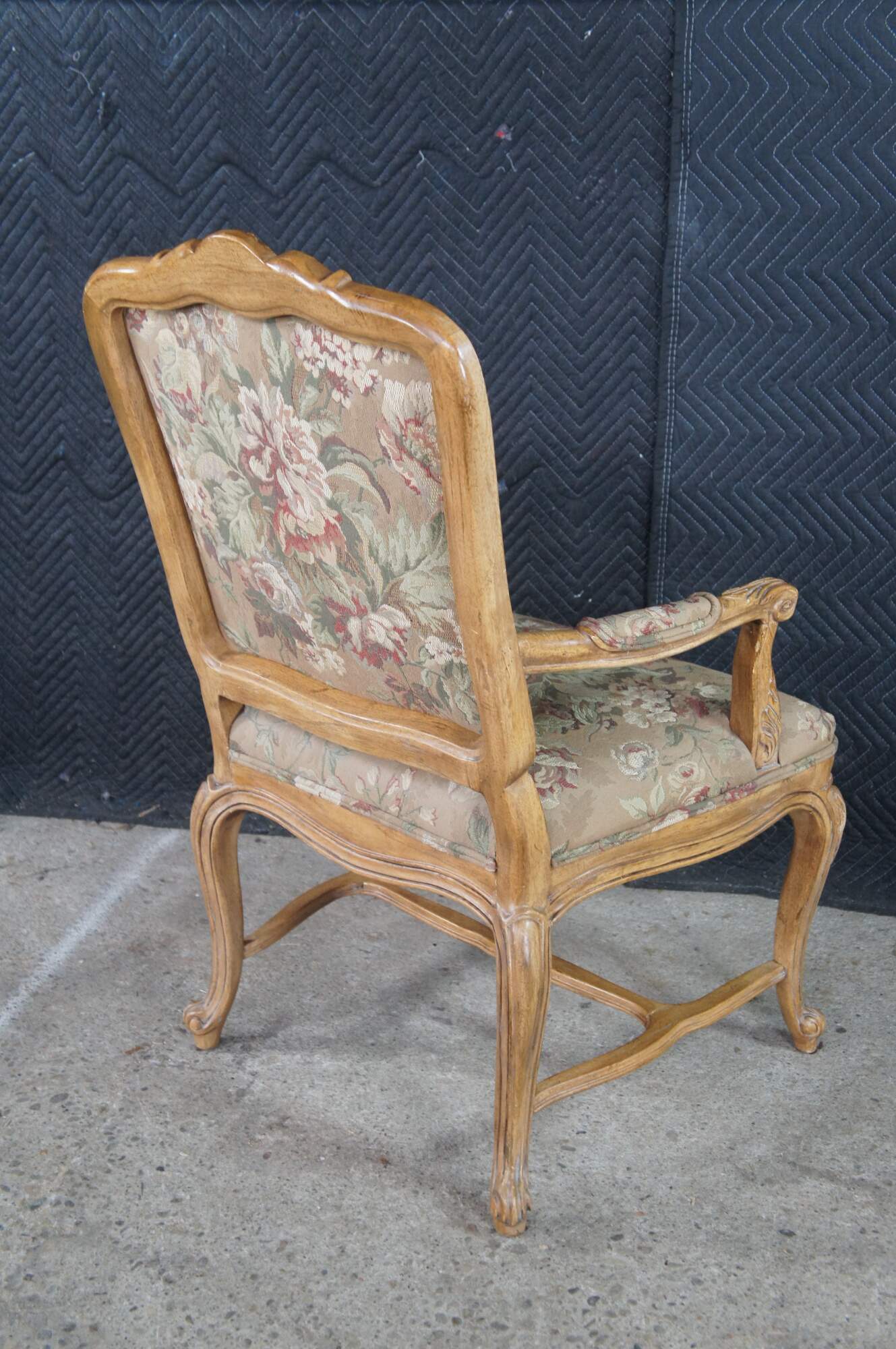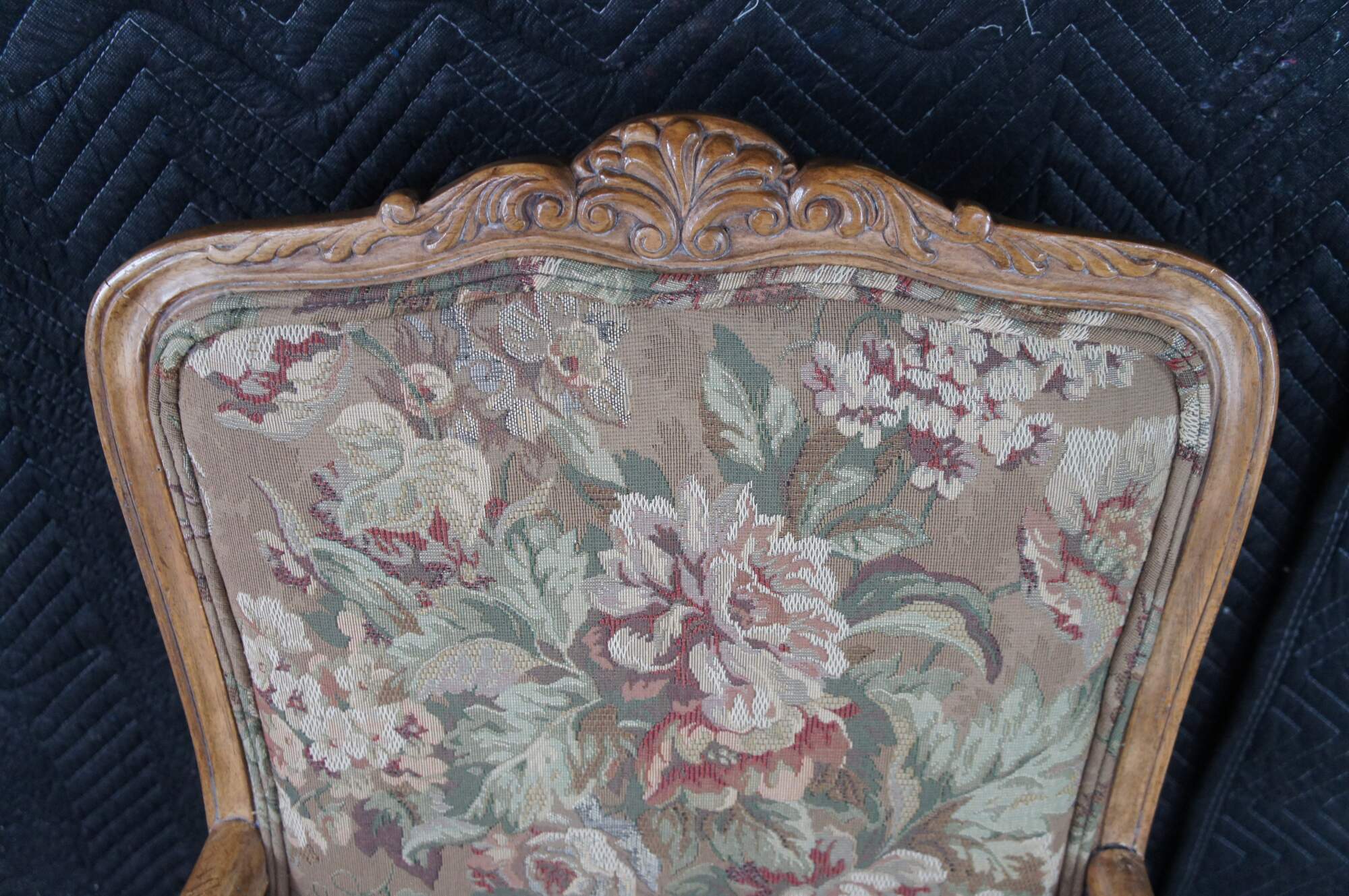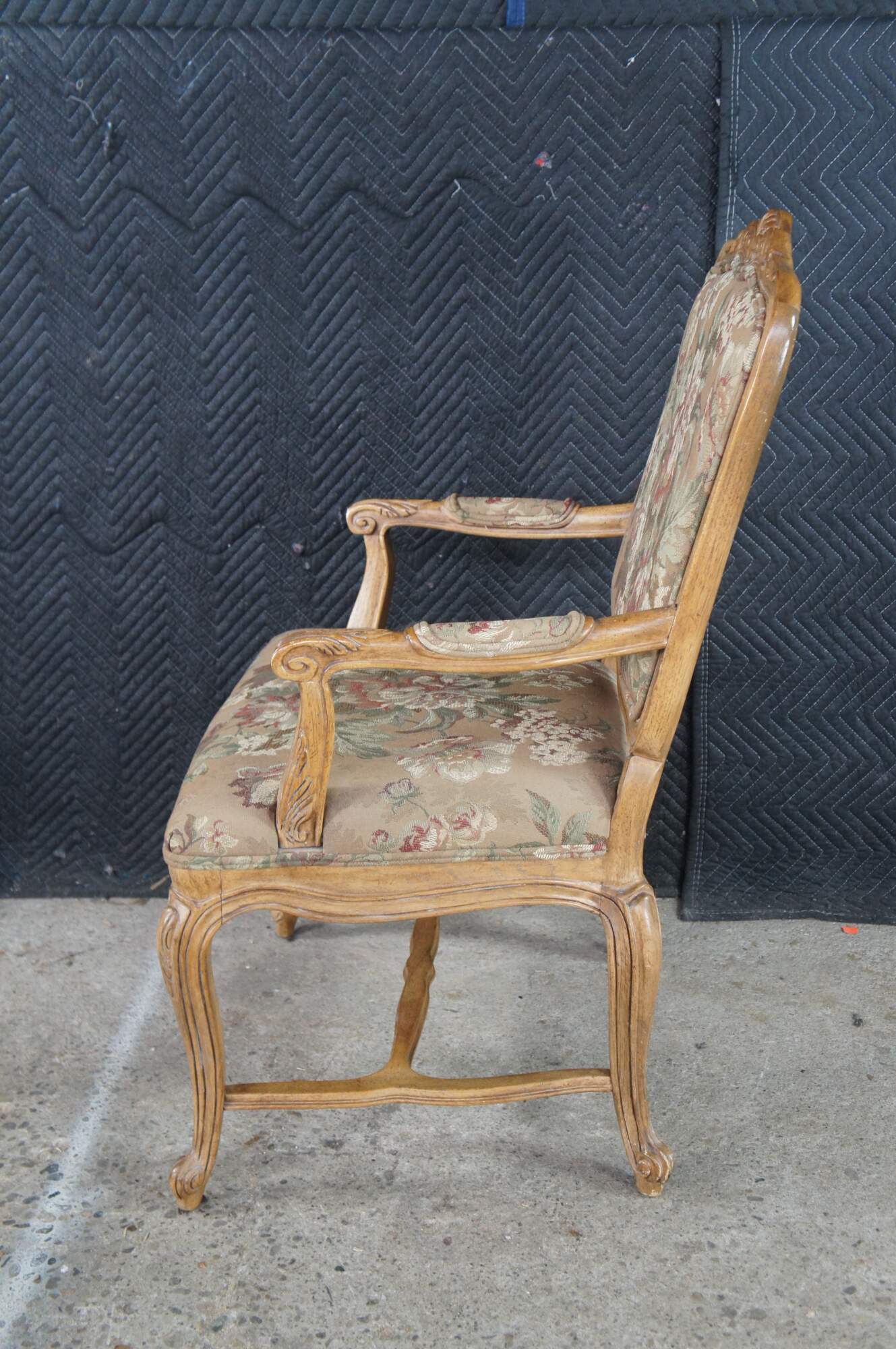 8 Vintage Drexel Heritage #372-960 Dining Chairs, Circa 1991. Features a carved walnut finish in Louis XVI styling with Aubusson style fabric and double cording. The chairs showcase an elegant finish with acanthus carved crest rail, Fauteuil arms, carved lower aprons and cabriole legs leading to scrolled feet.