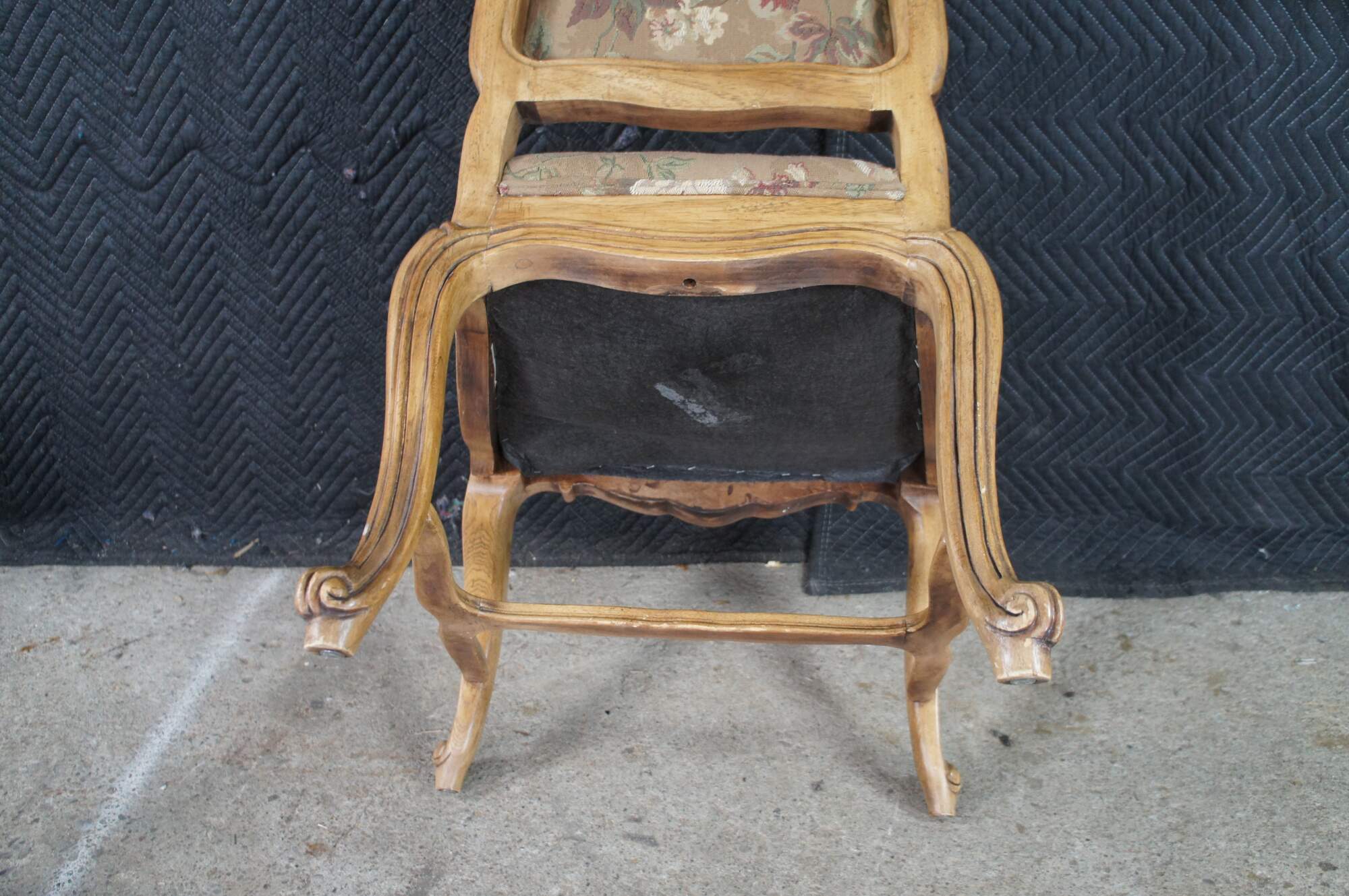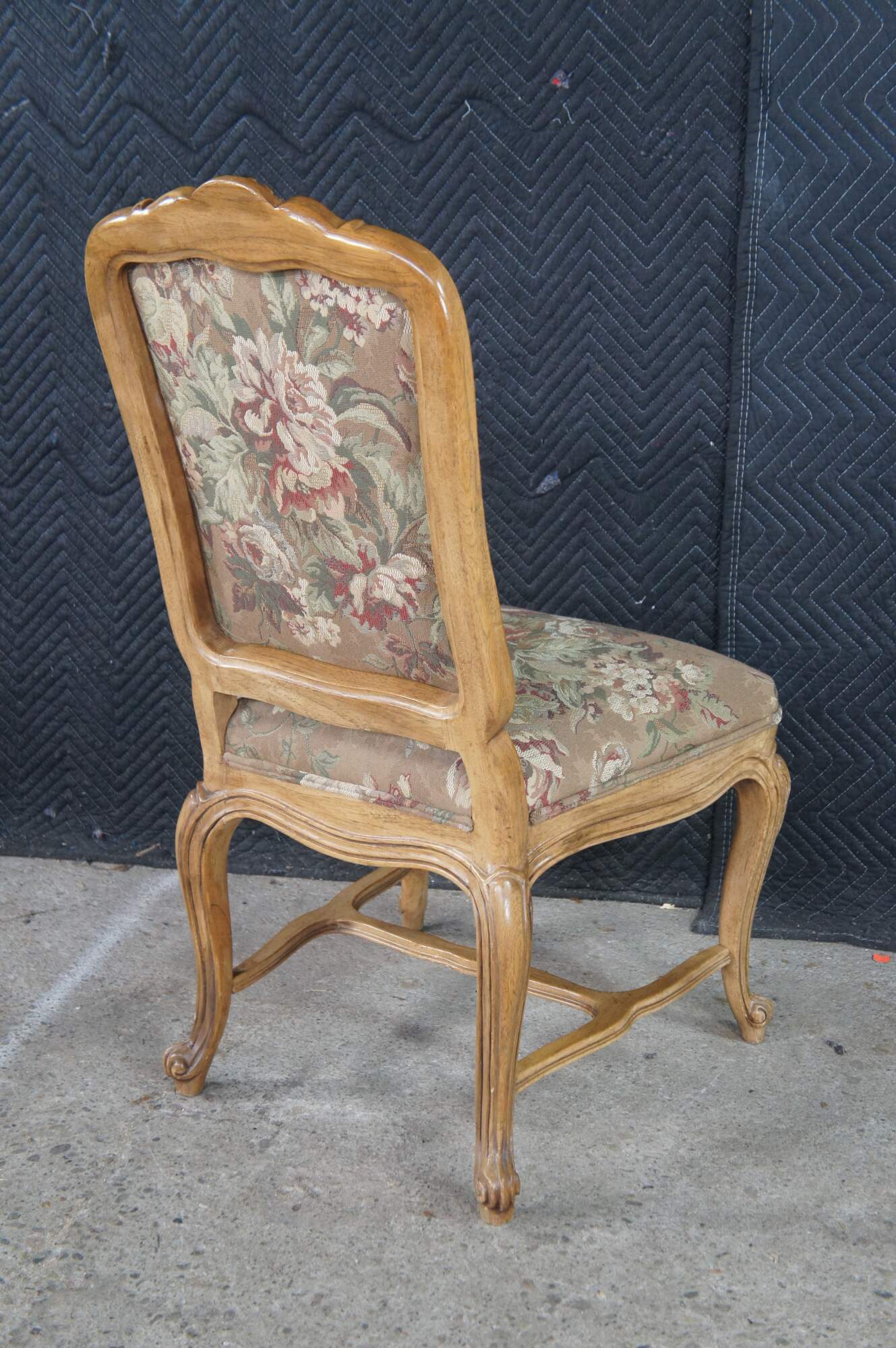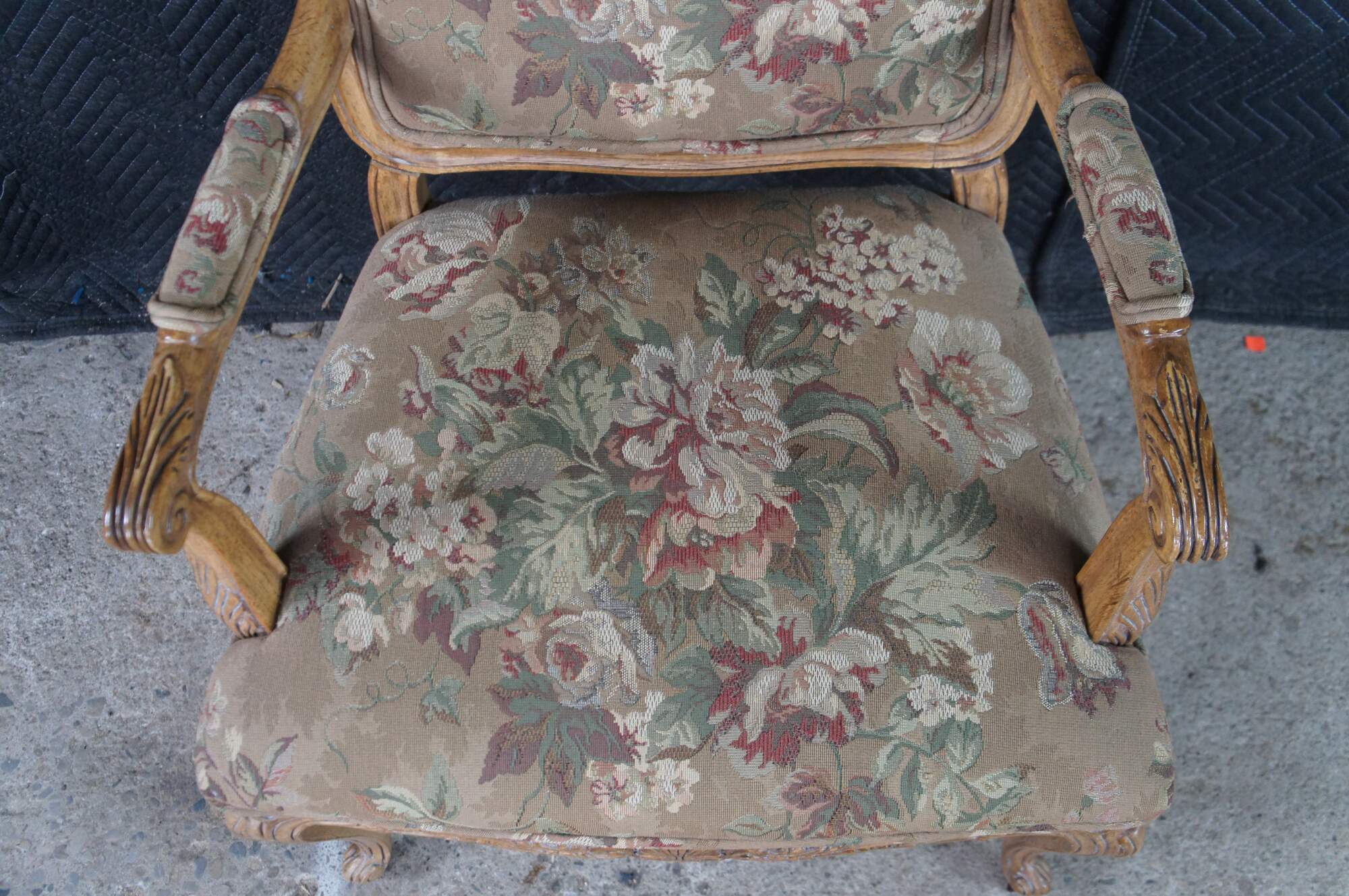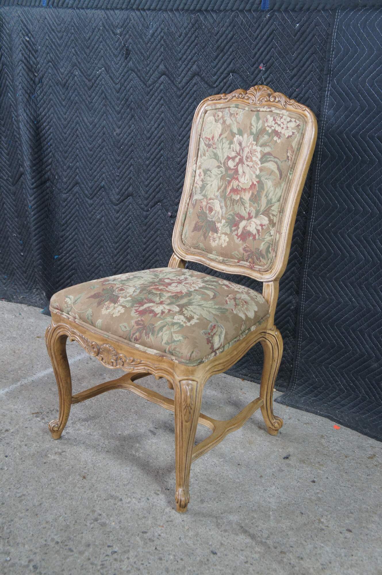 8 Vintage Drexel Heritage #372-960 Dining Chairs, Circa 1991. Features a carved walnut finish in Louis XVI styling with Aubusson style fabric and double cording. The chairs showcase an elegant finish with acanthus carved crest rail, Fauteuil arms, carved lower aprons and cabriole legs leading to scrolled feet.