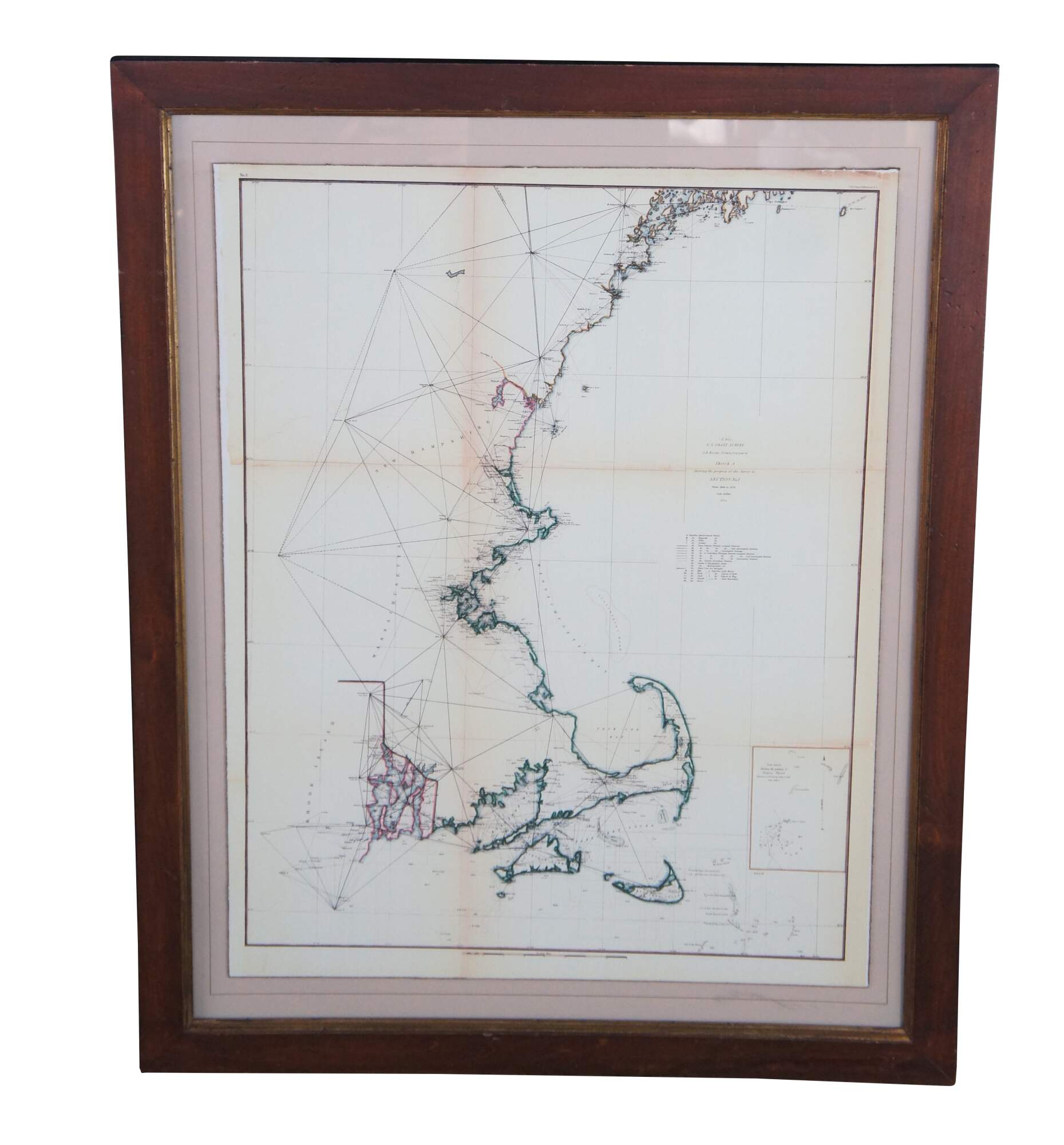 Vintage Soicher Marin navigational survey reproduction map of the eastern coast of the united states circa 1844-1854. It features Rhode Island, Massachusetts, New Hampshire, Buzzards Bay, Cape Cod, Nantucket Sound, Martha's Vineyard, etc.