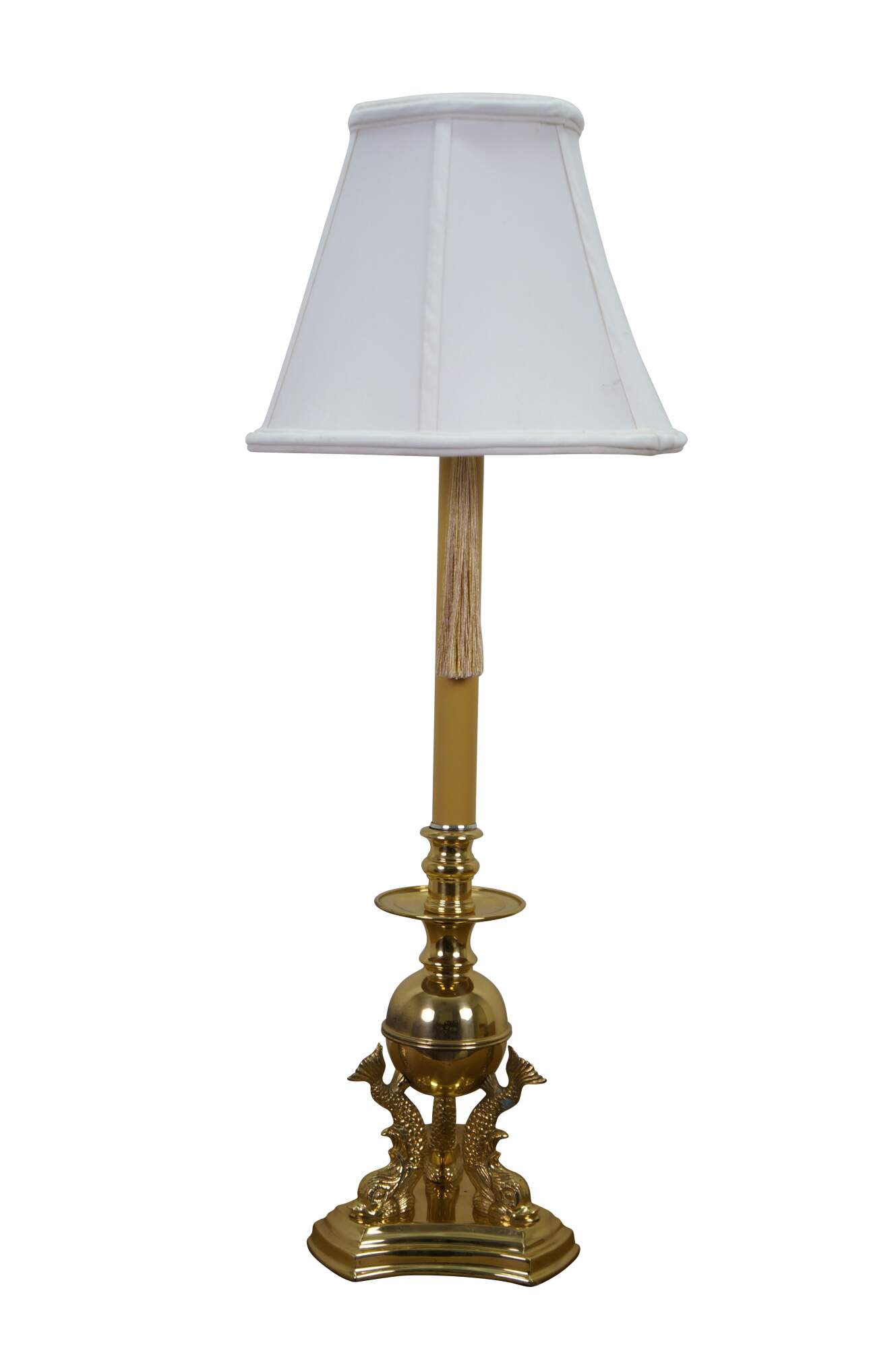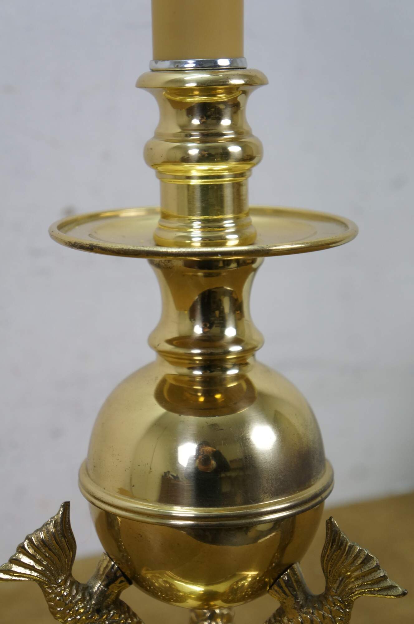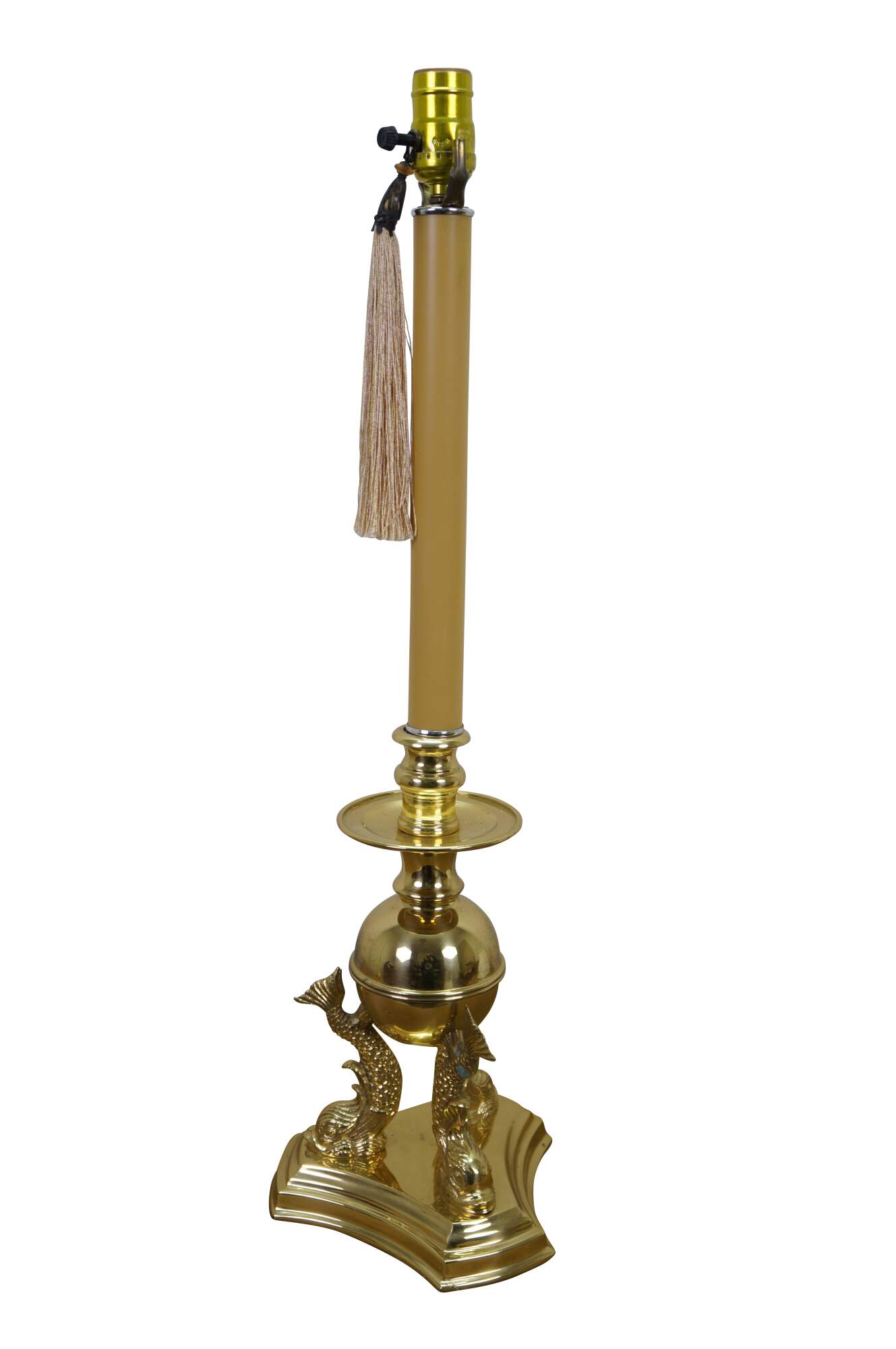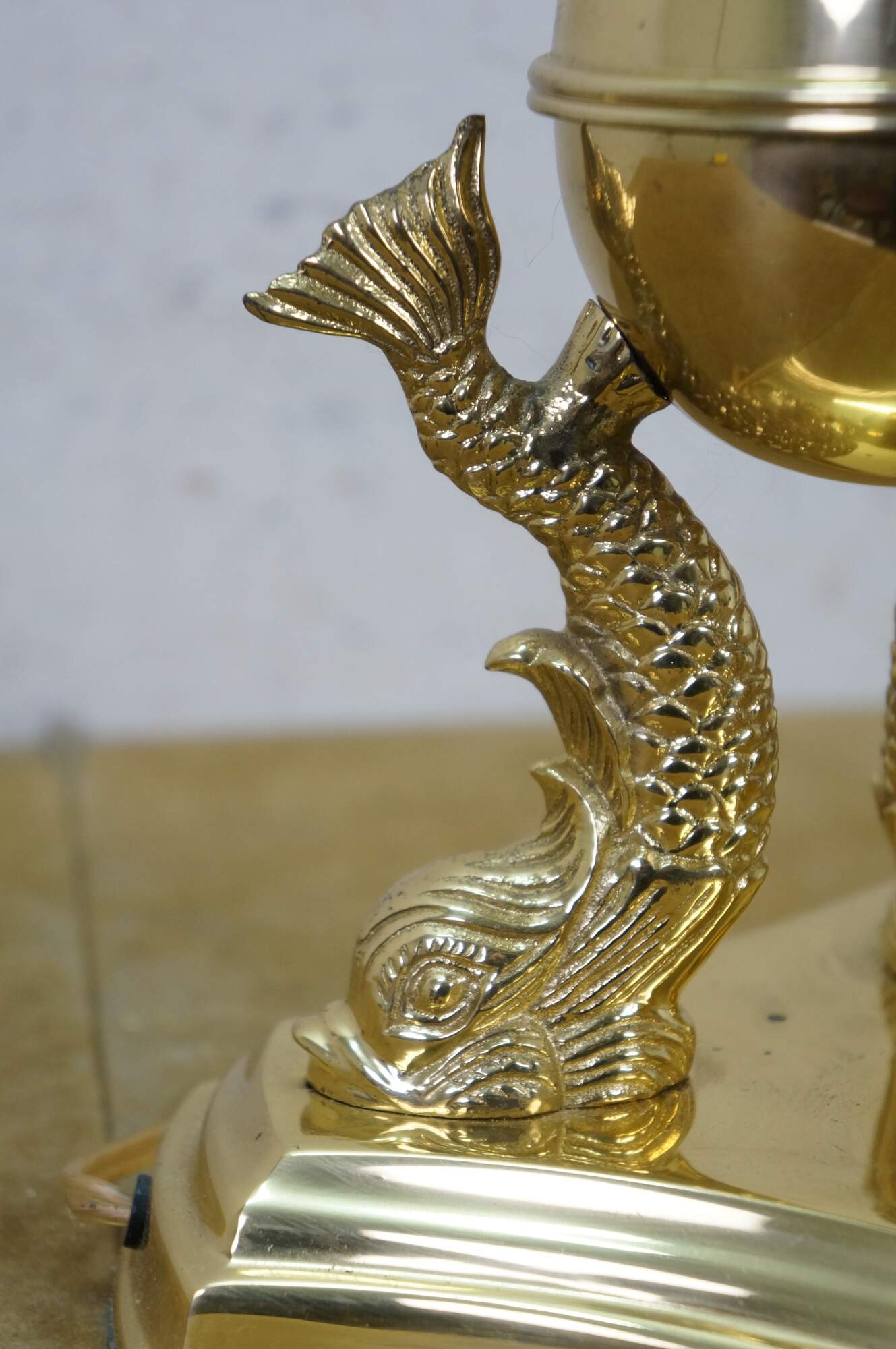 Vintage brass table lamp featuring a trio of delphins / dolphins / Koi fish supporting an orb and candlestick light.